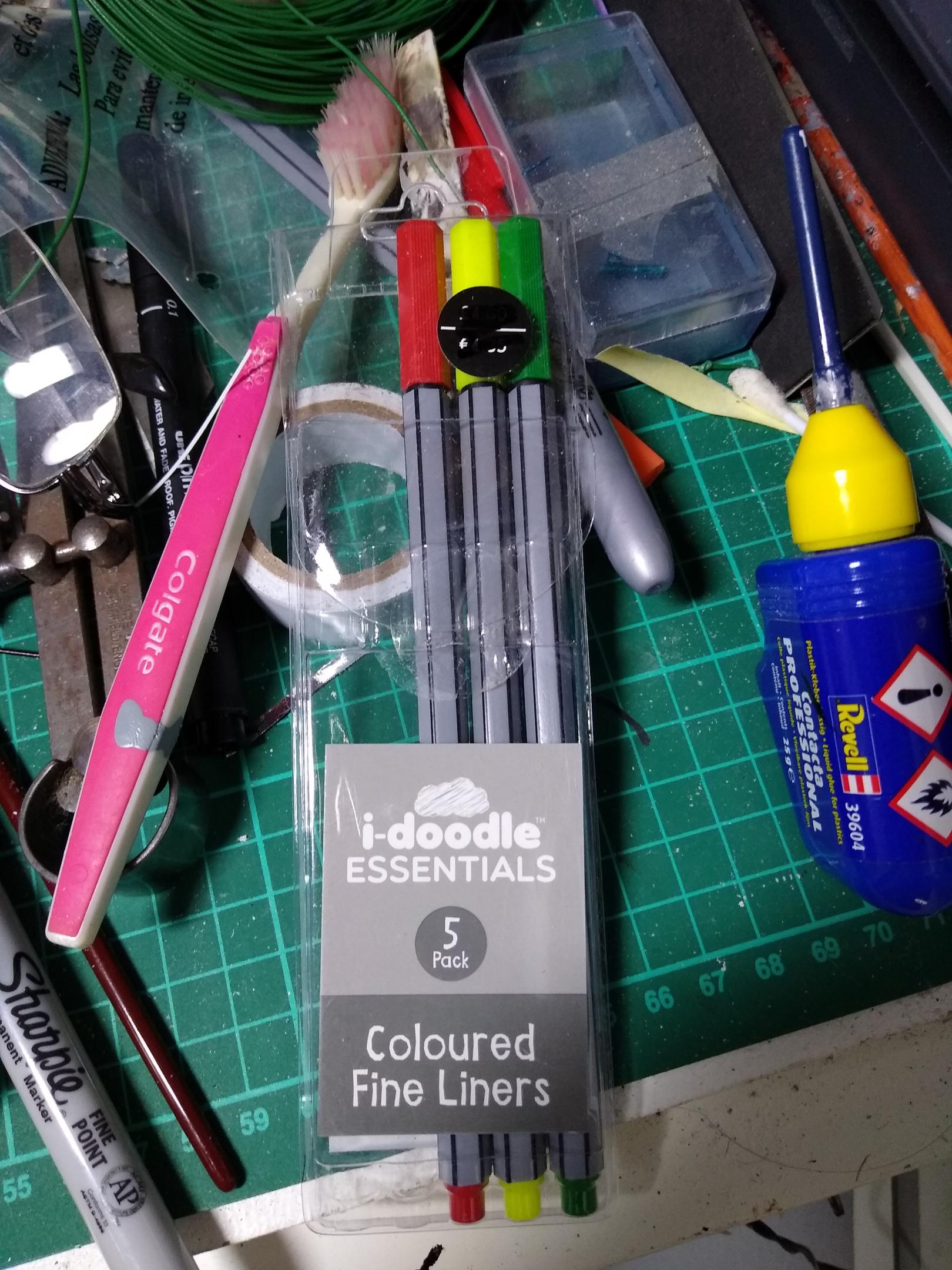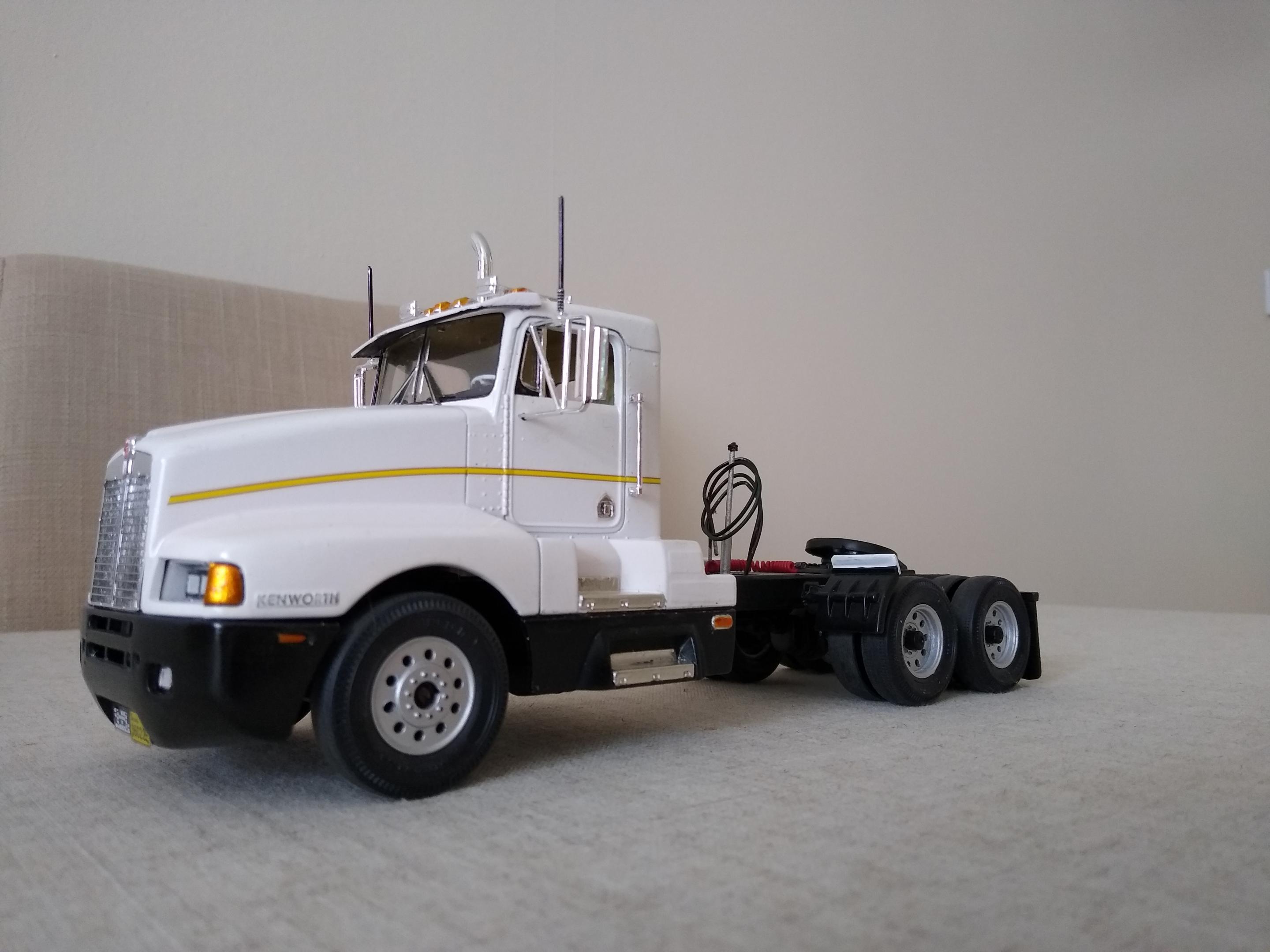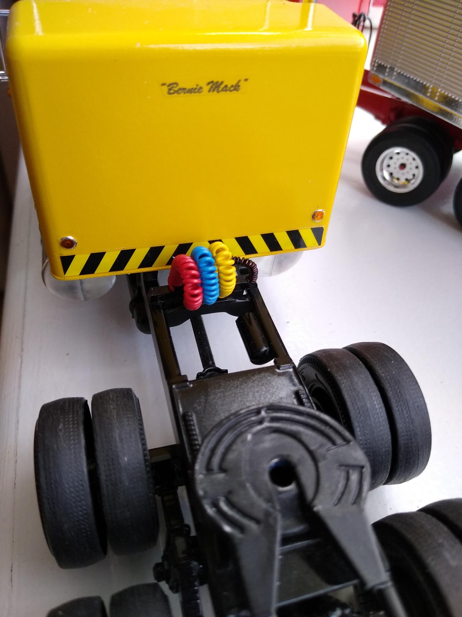 I'll add this to the WIP too, I'm trying to add the little things that make these snappers more realistic to the eye. Something I've wanted to do is the airlines for the trailer. Using garden tie-wire coloured black with a Sharpie I have formed the air and electrical lines, then either draped them over a convenient crossbar or made myself a pogo stick out of stock plastic tube of different diameters. I still can't replicate gladhands but they all look better. The yellow Mack has the livery of a Liverpool UK company on it so I used the old English three line system for that, all neatly stowed. Red for supply, blue for emergency and yellow for service with a narrower electric suzie on the right. English trailers of the era didn't use spring brake chambers, so the emergency line supplied reservoir air from the tractor to the trailer chambers and the tractor front axle only, using a lever called the Dead Man. So called because if you had to use it you were... I've also managed to deal with another issue on these kits, the lack of hubs on the drive axles. I found some cheap pens that have end caps the right size. I just cut them down, paint them and glue them on. Done the KW T600 so far but instantly looks better (righter?) to the eye. Before, it was like looking at a left hand threaded bolt! Just didn't look right for some reason. Now I've just got to buy another 24 pens! -