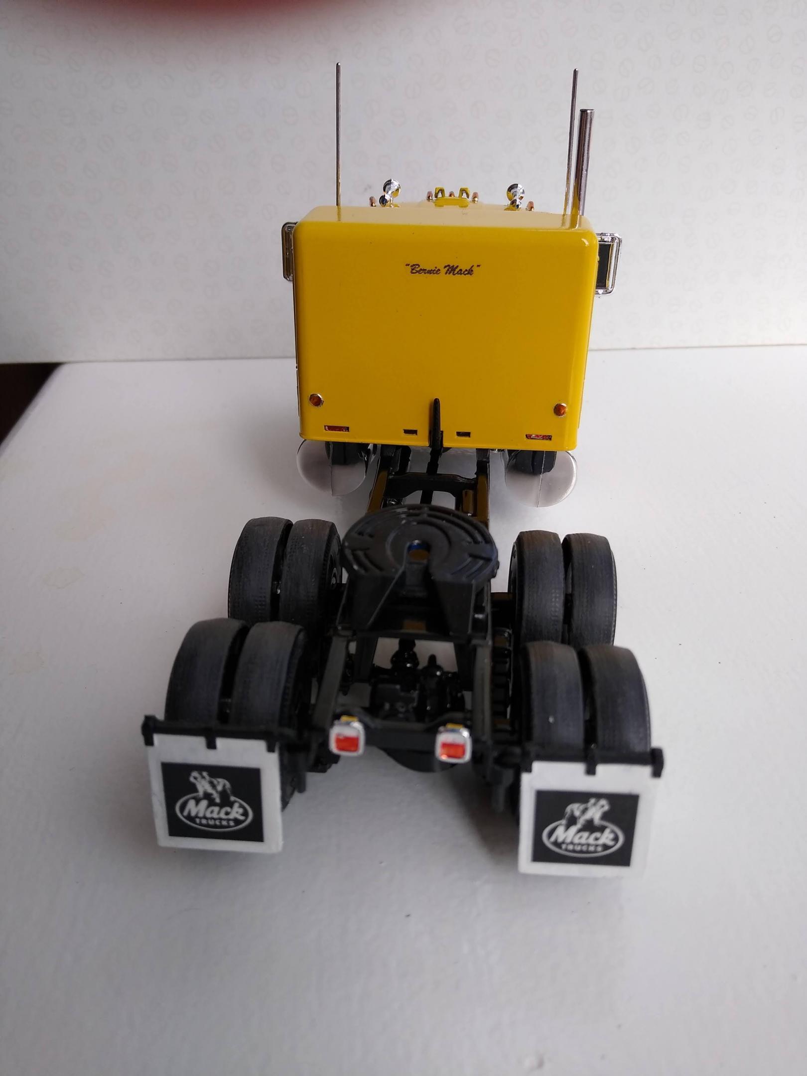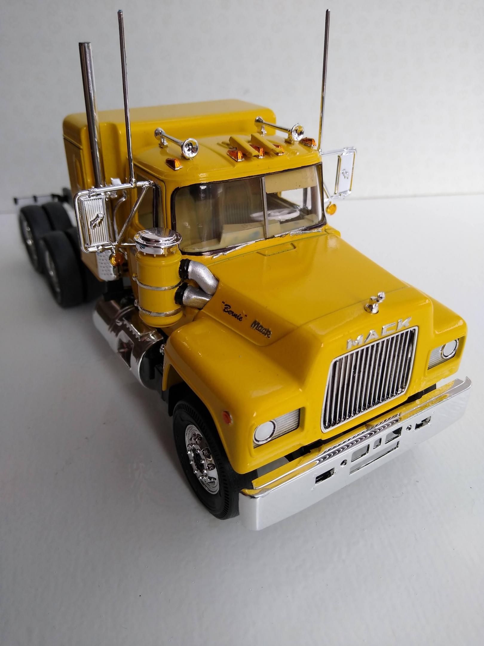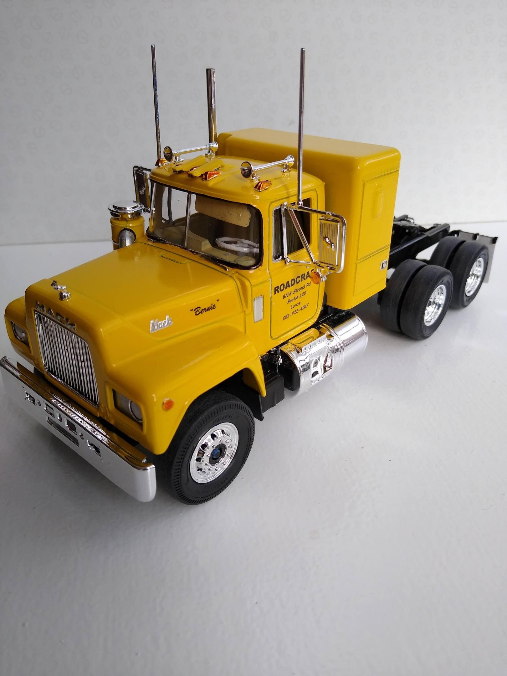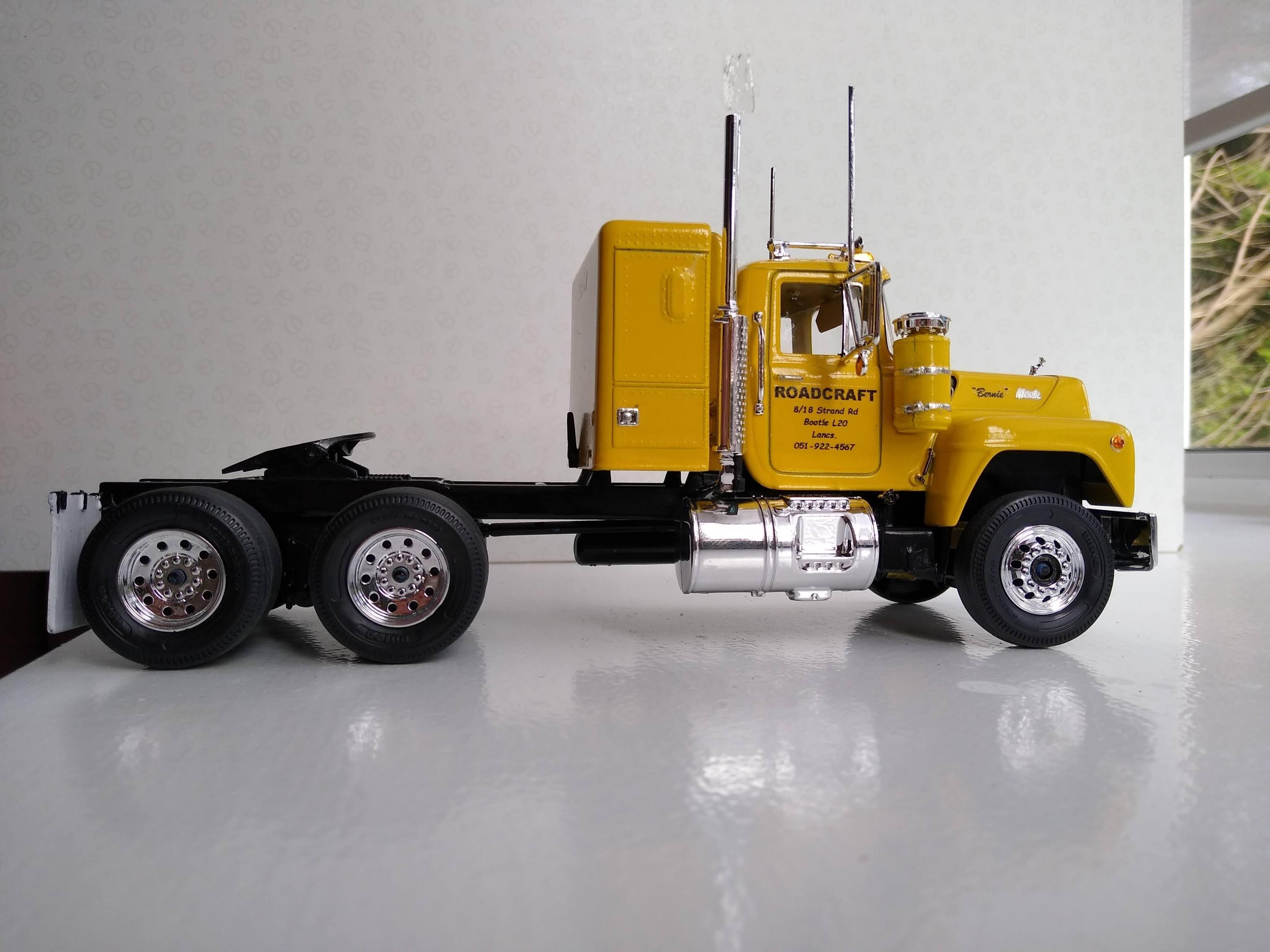 This truck is a tribute to my dad Bernie McNally, who loved Macks. [I was always a West Coast thoroughbred man myself, KW, Peterbilts and Freighliners]. It's based on the Revell 1/32 R Series that comes with the Fruehauf tank trailer. I modified the mudflaps to look less intrusive and more realistic, foiled a few parts and added a driver's sunvisor out of painted paper, so easy but really adds a bit of realism I think. The main thing was painting it in the colours of their vehicles, yellow and black, and printing a set of decals on clear decal paper with the company my dad drove cranes for for so long, Roadcraft in Bootle, Liverpool. Put his name on the hood and the back of the sleeper. I'll have to stop there because I could tell stories about my dad all day, even though he fell asleep in death about 28 years ago.