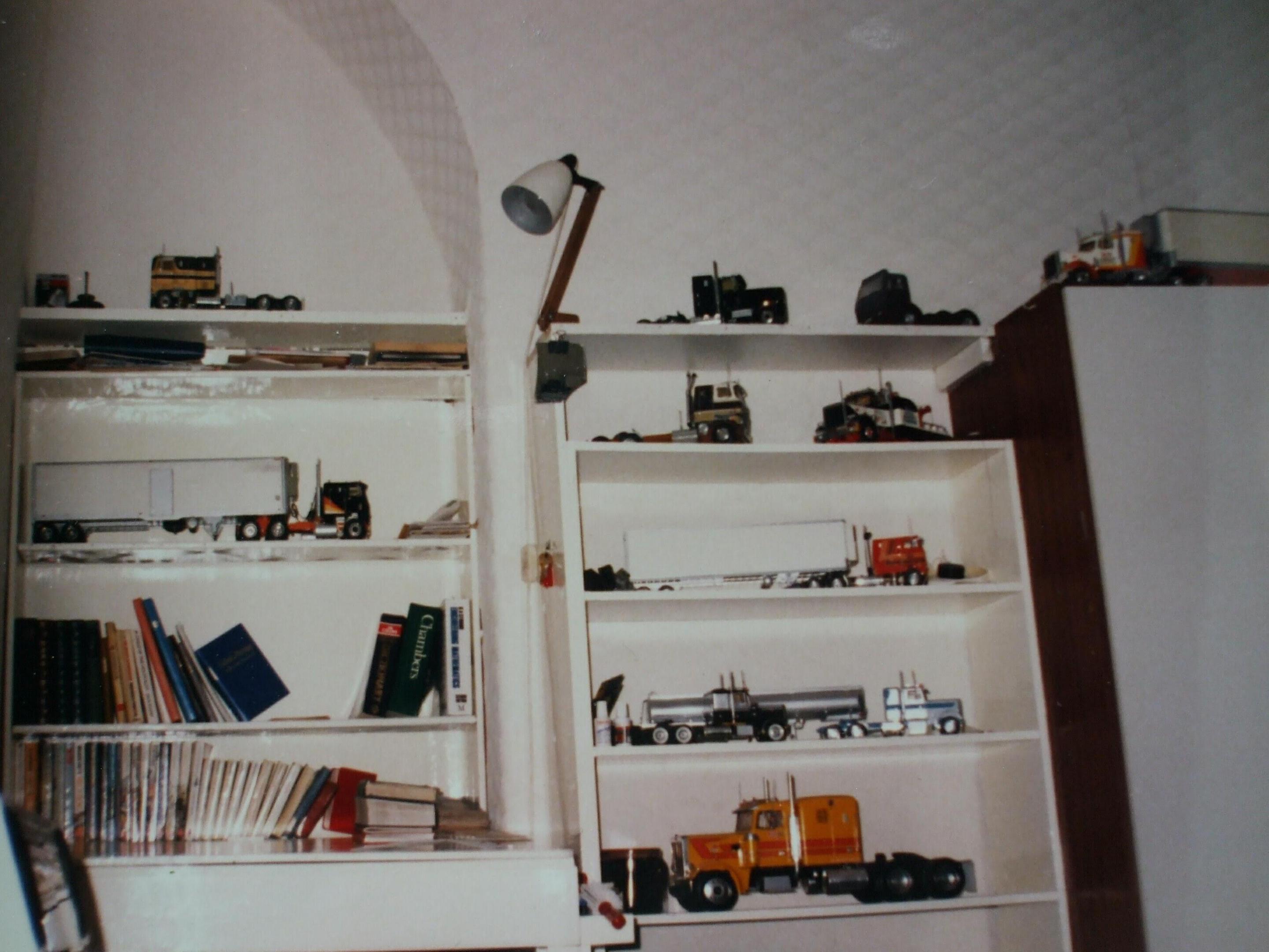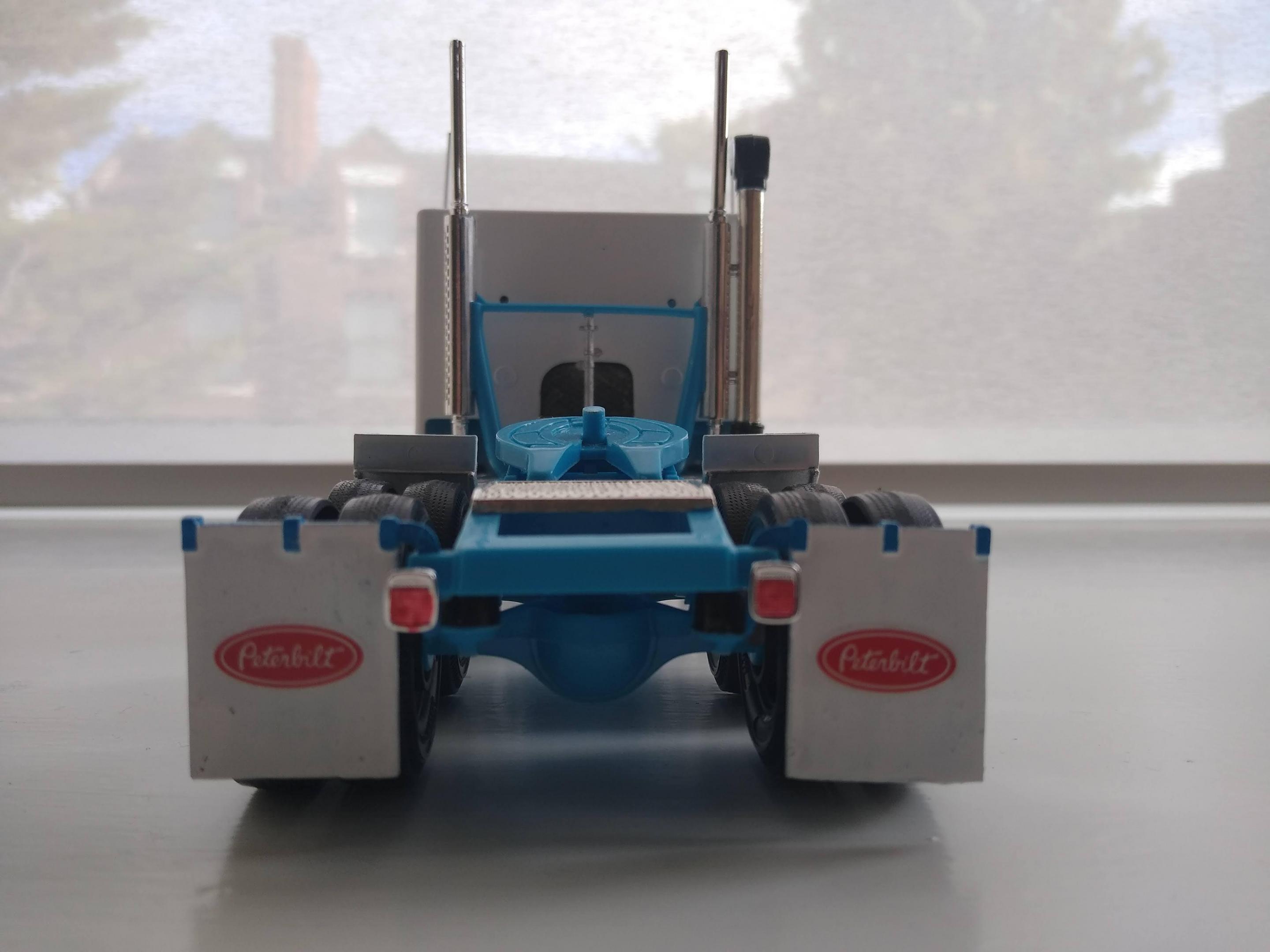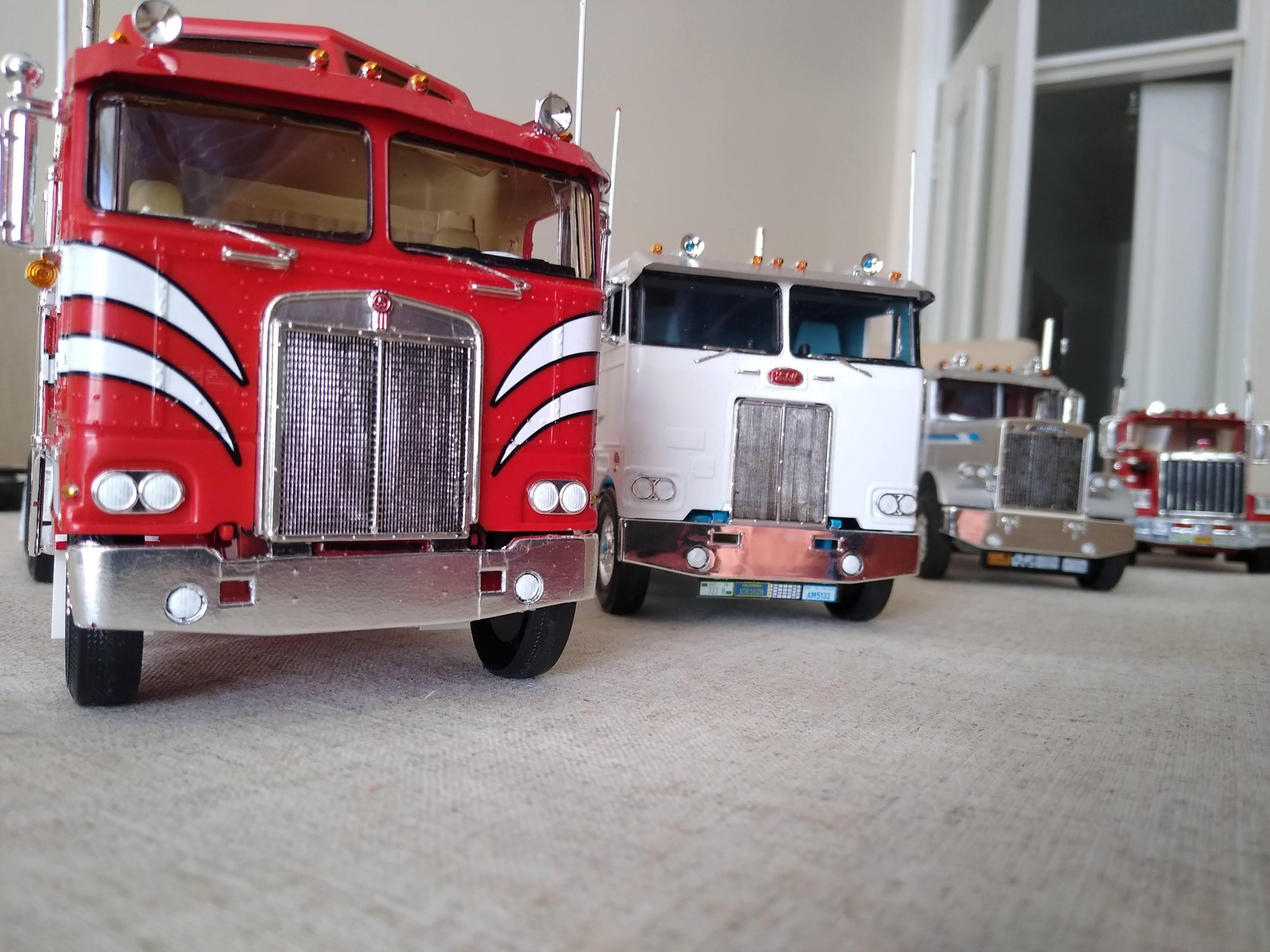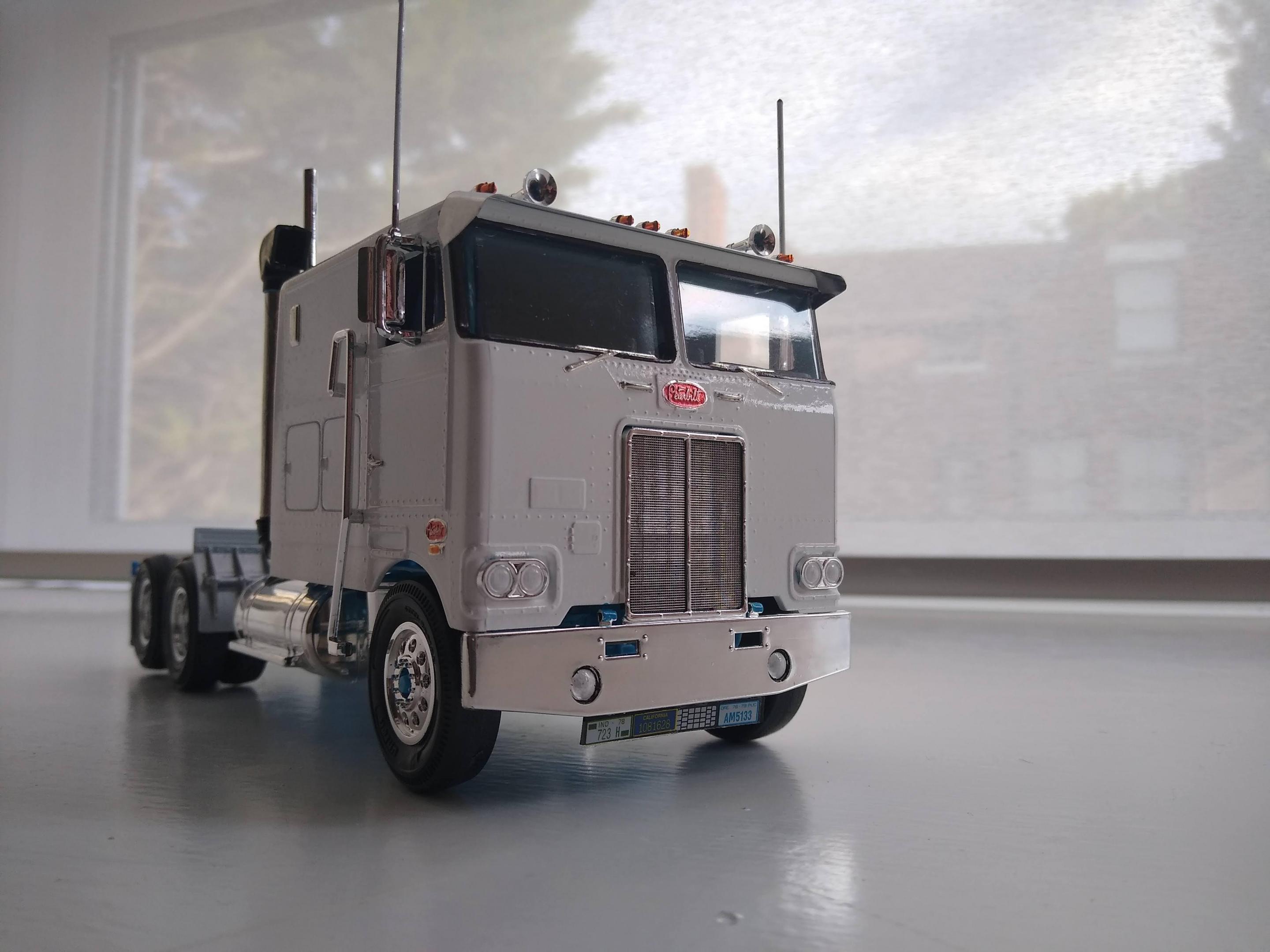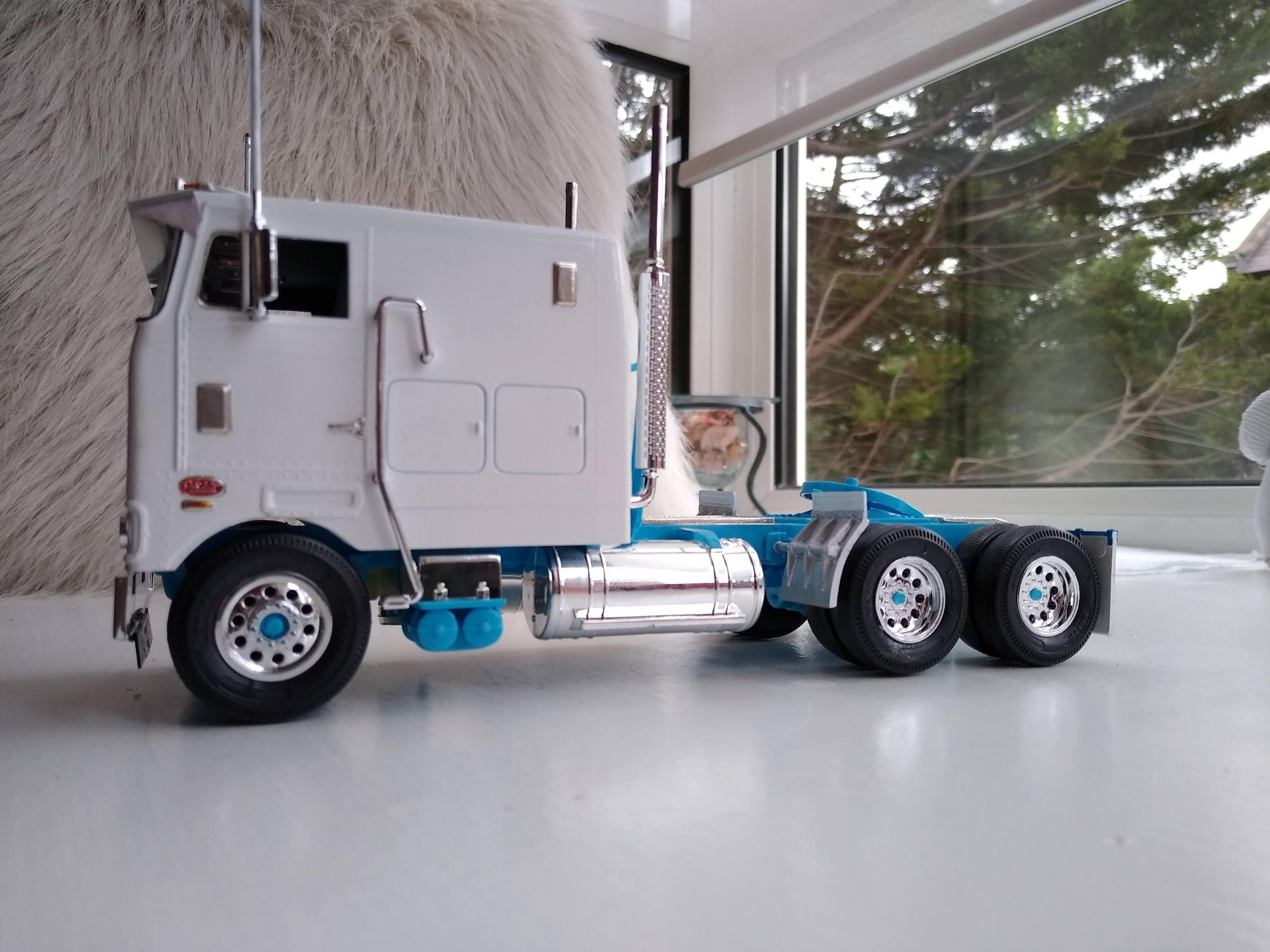 This truck is a tribute to my dad Bernie McNally, who loved Macks. [I was always a West Coast thoroughbred man myself, KW, Peterbilts and Freighliners]. It's based on the Revell 1/32 R Series that comes with the Fruehauf tank trailer. I modified the mudflaps to look less intrusive and more realistic, foiled a few parts and added a driver's sunvisor out of painted paper, so easy but really adds a bit of realism I think. The main thing was painting it in the colours of their vehicles, yellow and black, and printing a set of decals on clear decal paper with the company my dad drove cranes for for so long, Roadcraft in Bootle, Liverpool. Put his name on the hood and the back of the sleeper. I'll have to stop there because I could tell stories about my dad all day, even though he fell asleep in death about 28 years ago.