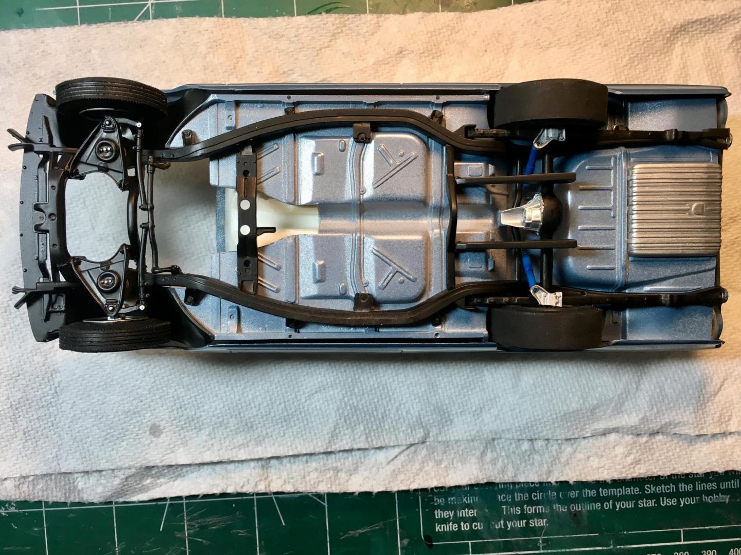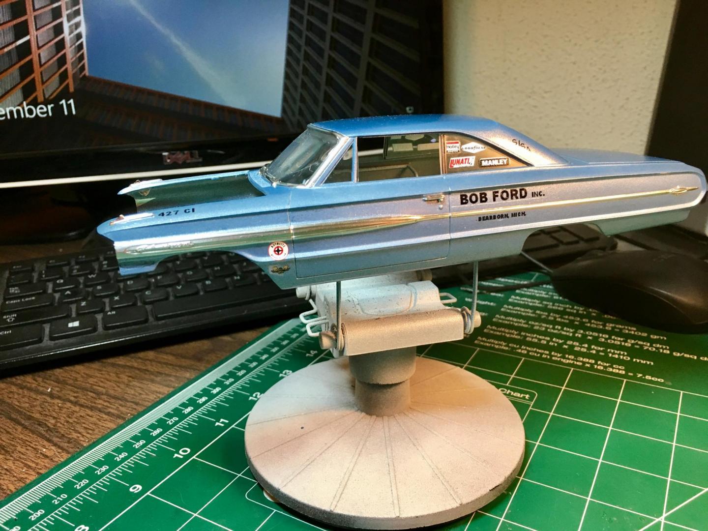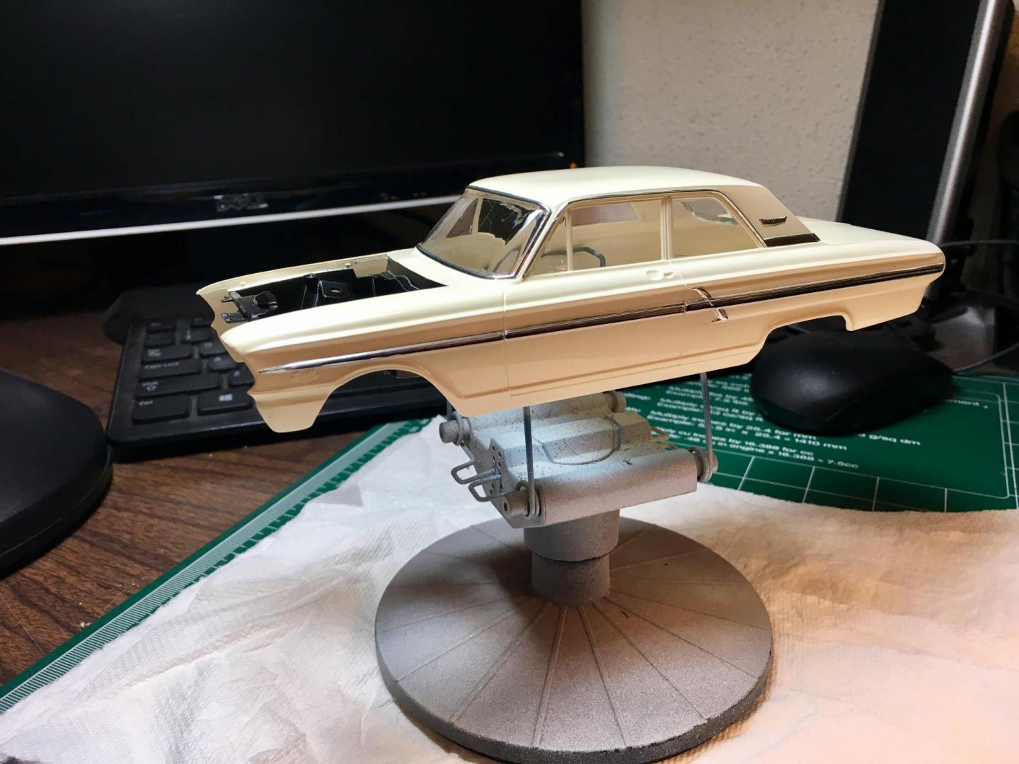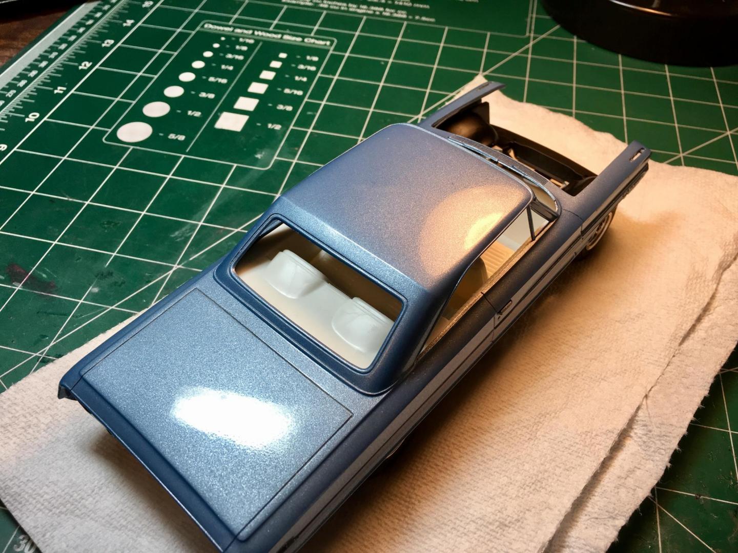 Worked on the big Ford, along with the TBolt. I really got to get an airbrush. Kind of at the mercy of available spray cans. Painted a Duplicolor GM color . It was the closest color I could find. Too much metallic IMO. The clear laid really smooth on the sides of the car, but I had to micro mesh the roof and trunk as it had a slight orange peel. Polished it with Novus 3 step. Just a little mock up. The front will sit lower on final assembly. Maybe I'll do the foiling tomorrow.