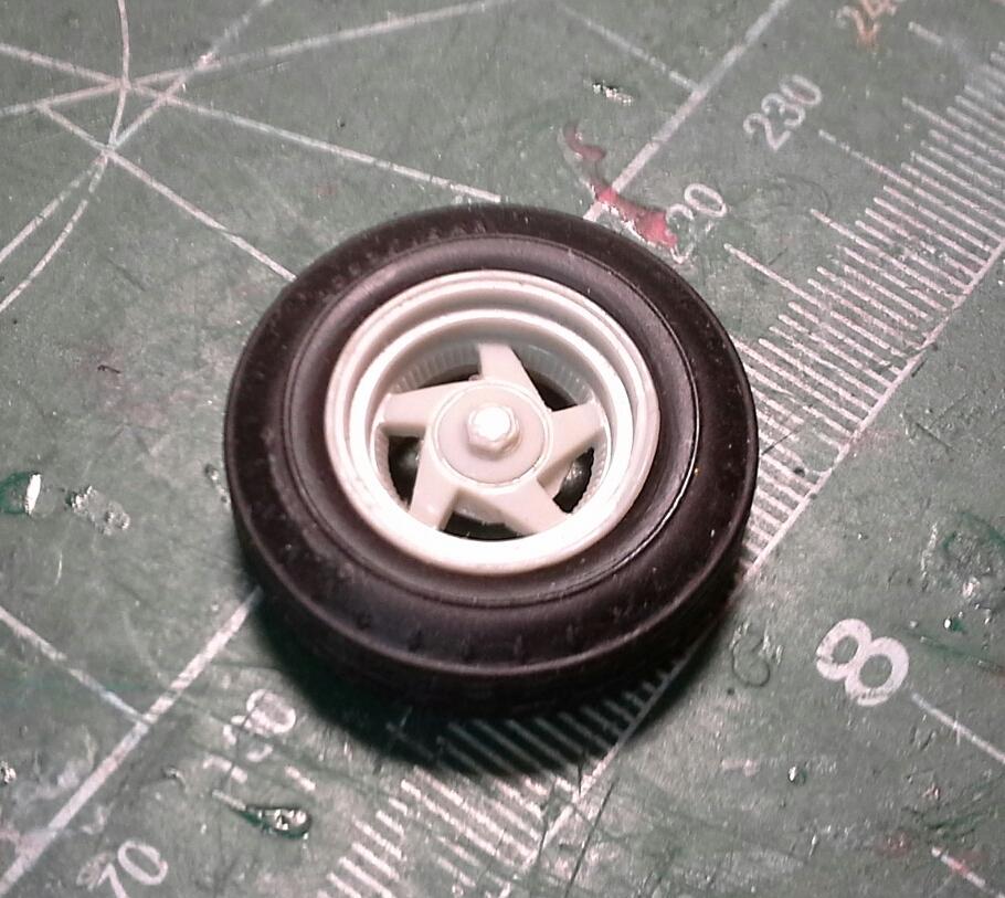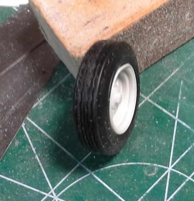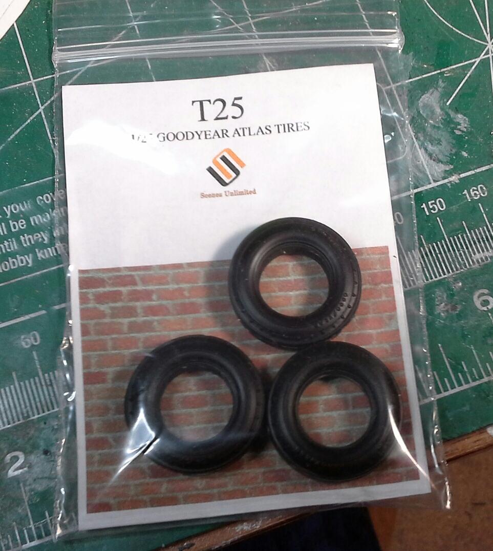 Ok,the trailers tires have gotten here today.I ordered three different sets and picked the Scale Unlimited T25 Goodyear Atlas set.they fit the rims..perfectly. the right width, height and fit the rim not to tite but tite enouch.most of all look right for the lowered fenders..for me.the hitch and receiver, battery came as well. the pictures are of my crude mock up with the before cut back fender and the after back cut I removed about 1/8 of a inch from the height ,..I like it better.I made a styrene plastic jig to back cut the fenders.it was easier to me..the other pictures of the tires I'm going with and the rims.this project is going again.its amazing how looking for the right tires and life problems get in your way. Daniel at Scale Unlimited is and has amazing product lines.I highly recommend taking a look..smokin parts. -