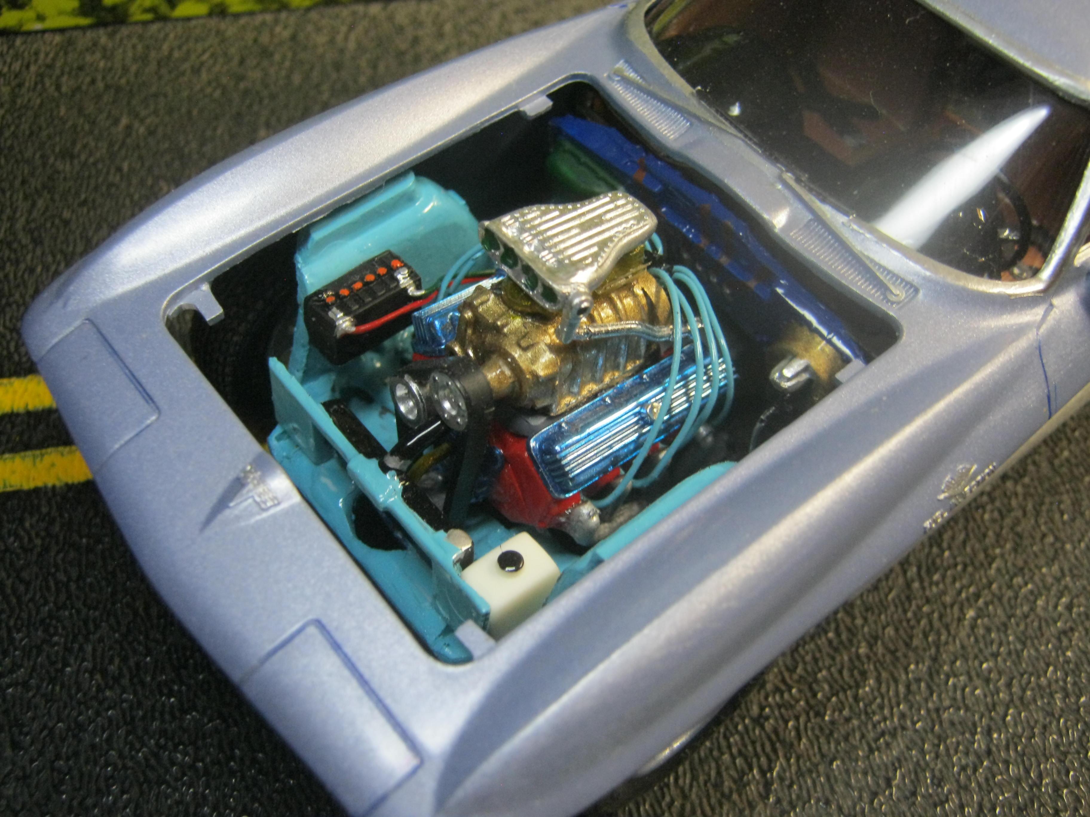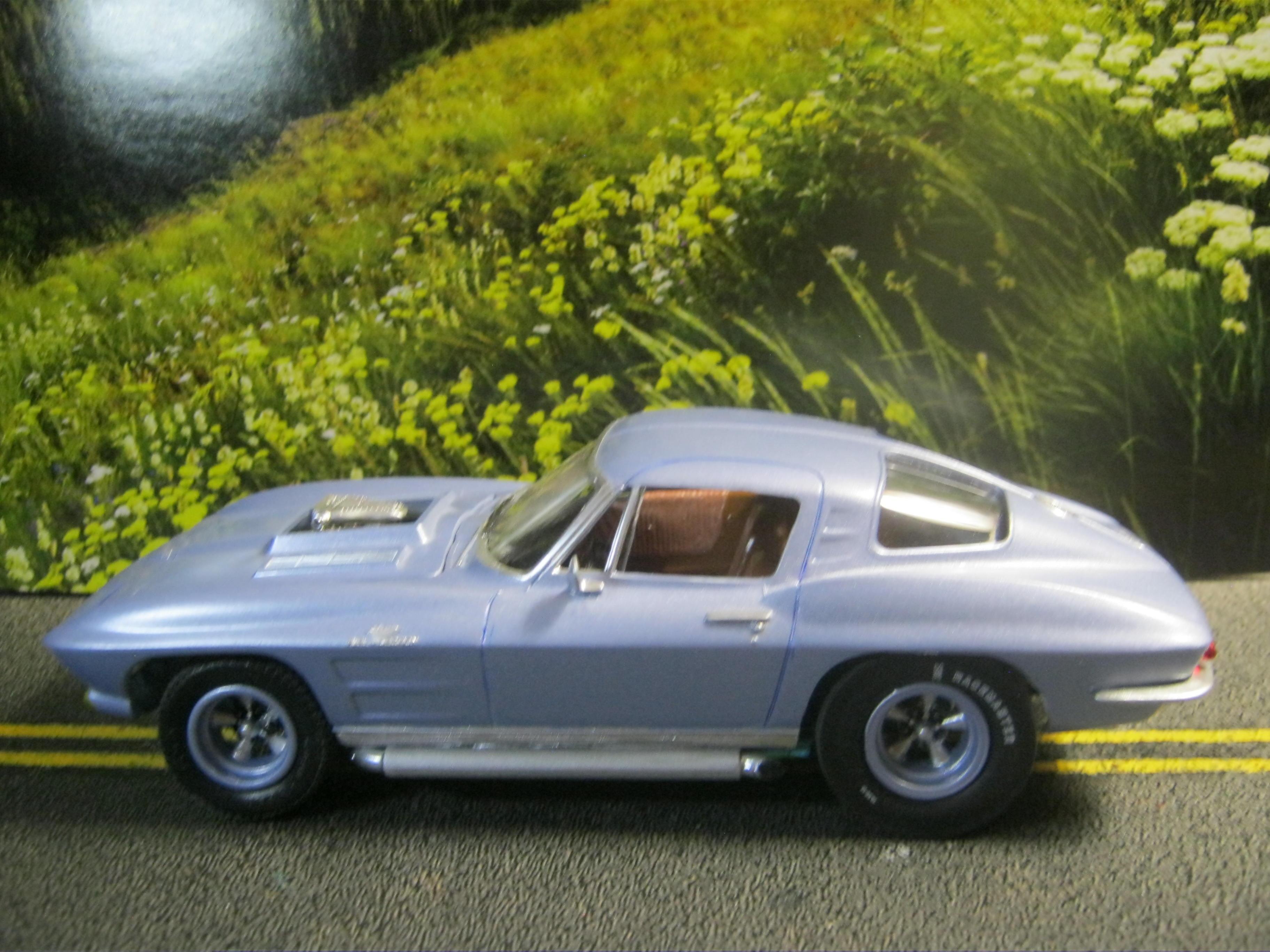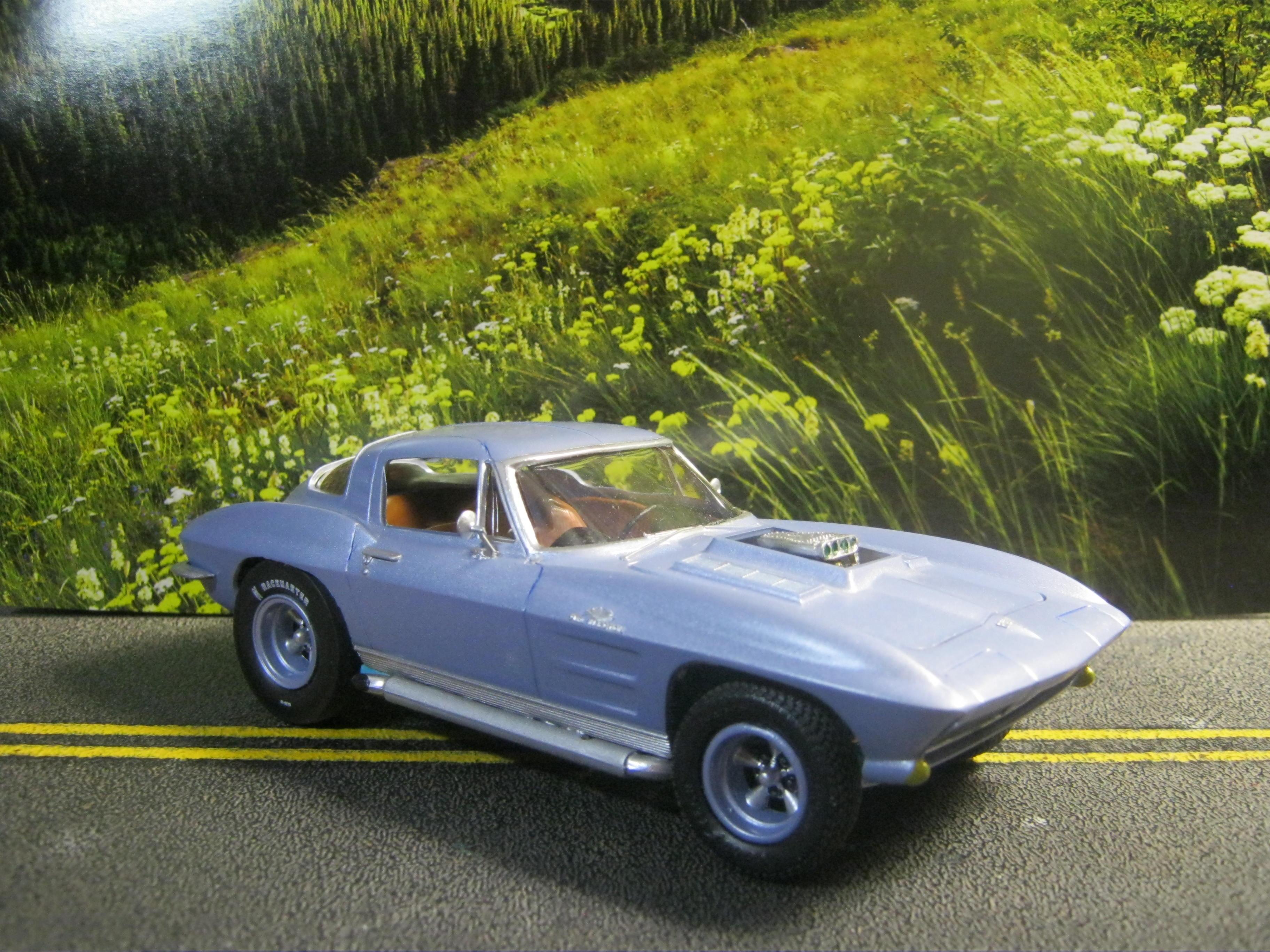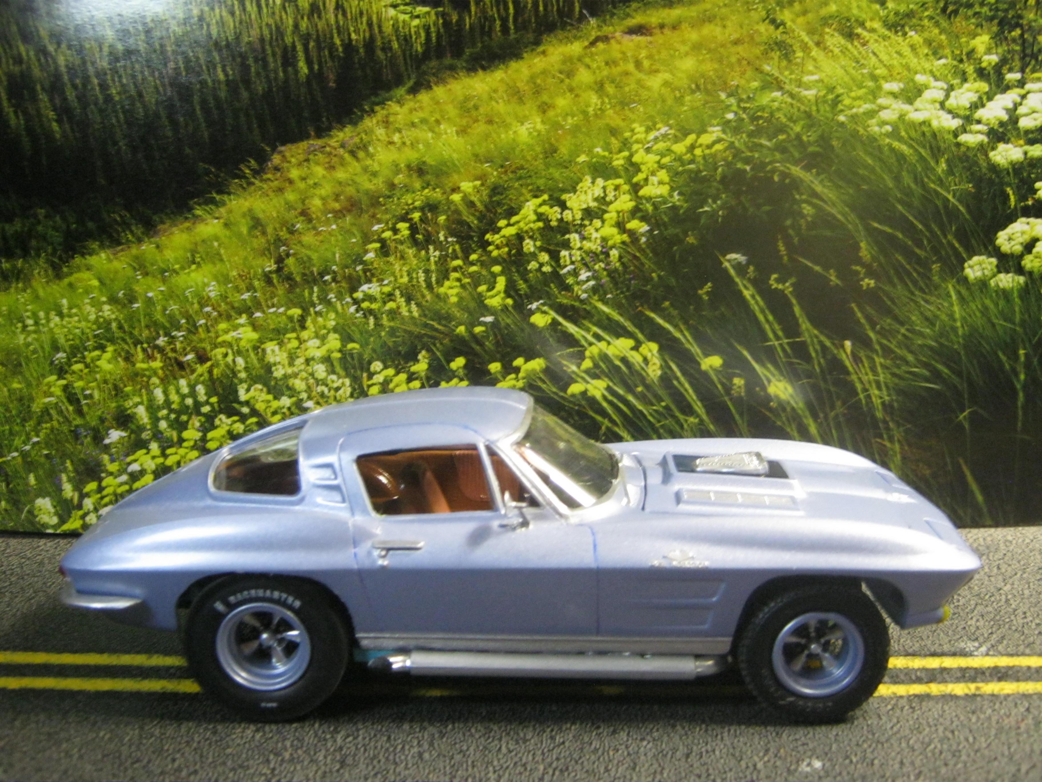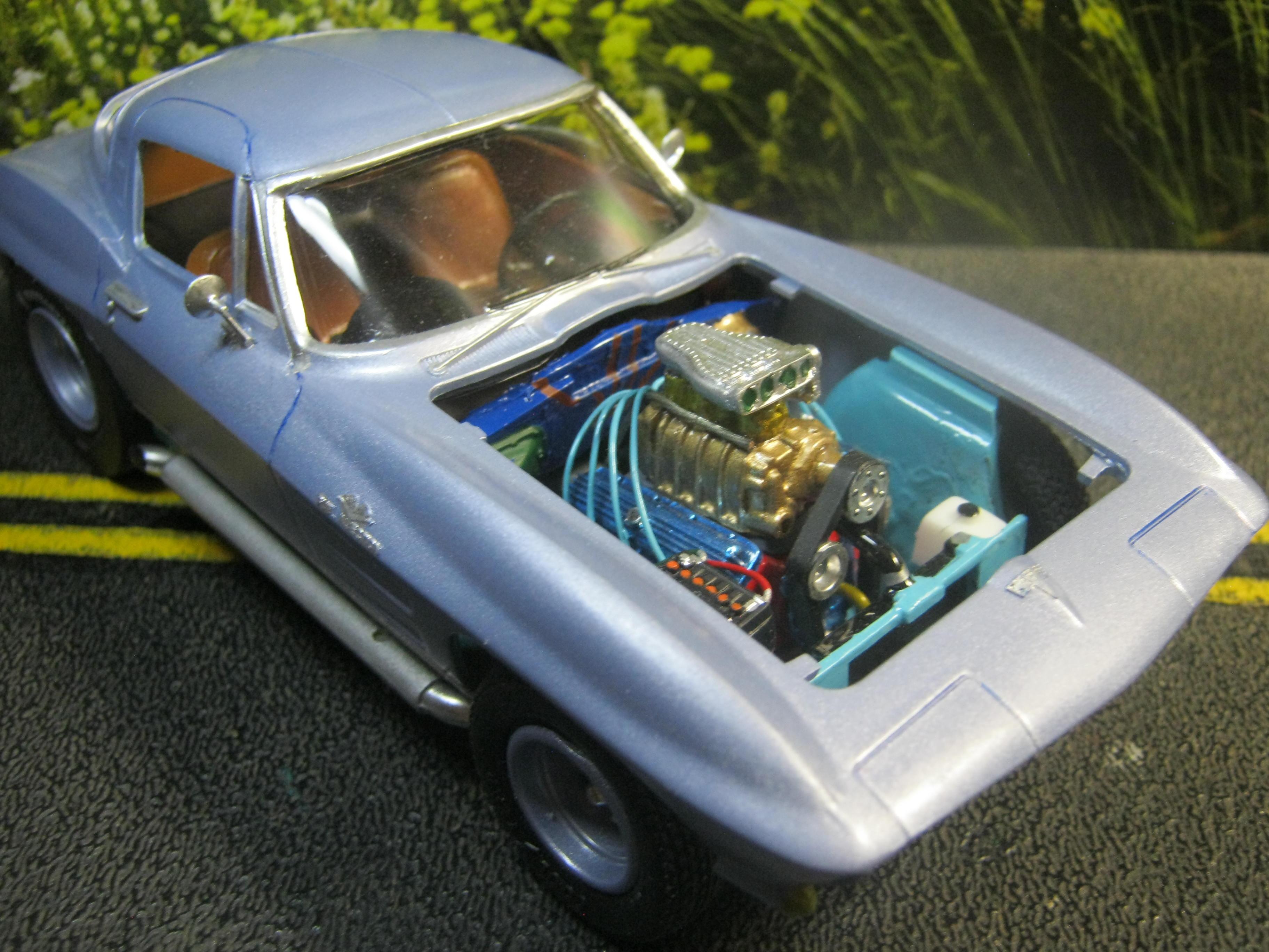 Greetings one and all. Just getting a few kits off the workbench as fall is getting closer. Heres the AMT 63 splitwindow Vette,,fun kit for the age of the tooling. I dig the mags that came in the kit,,I didnt do too much crazy on this,,simple wiring ect. Sprayed with tamiya ice blue rattle can. And ace hardware store tan rallecan on interior. A fun kit for sure. Awsome car ,,I think these 1:1 cars go for 6 digit figures at Barret Jackson these days. This is the only one I can afford ,,lol! But hey,,its still cool to have this one,,,,,Build on !