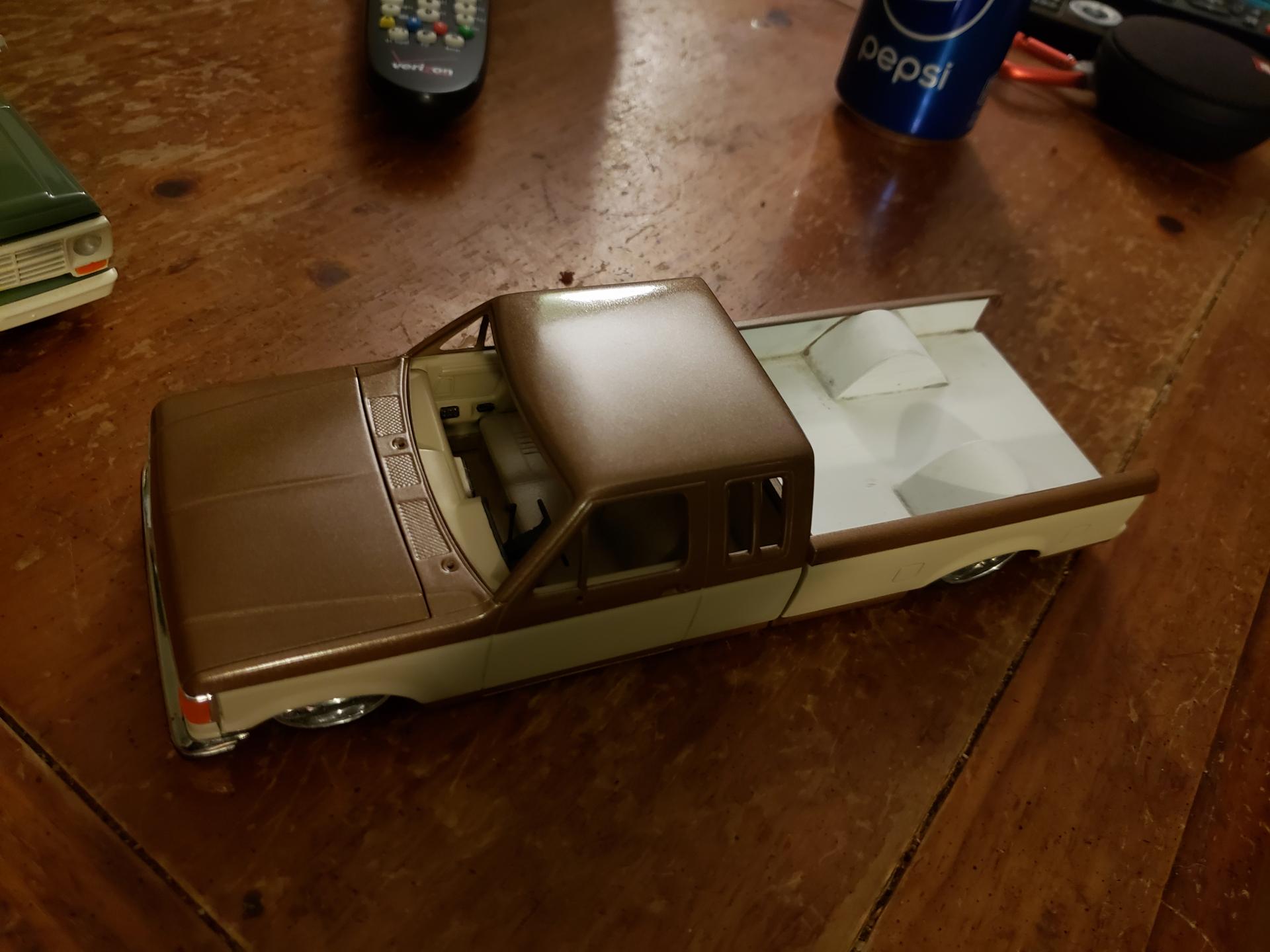 Hey everyone. I haven't posted anything in a while, because I haven't finished anything in a while lol. But I was fooling around with this kit one evening and thought it would look pretty neat like this. I know its not everyone's cup of tea, but thats what modeling is about. Building things your way. So, this is how i did it. Paint is PPG factory Ford Desert Tan and Light Desert Tan. A scratch built bed floor covers the imaginary suspension and large diameter wheels from a Maisto Pro Rods diecast car. Its just a curbside, but i still had a blast building it. All comments welcome!