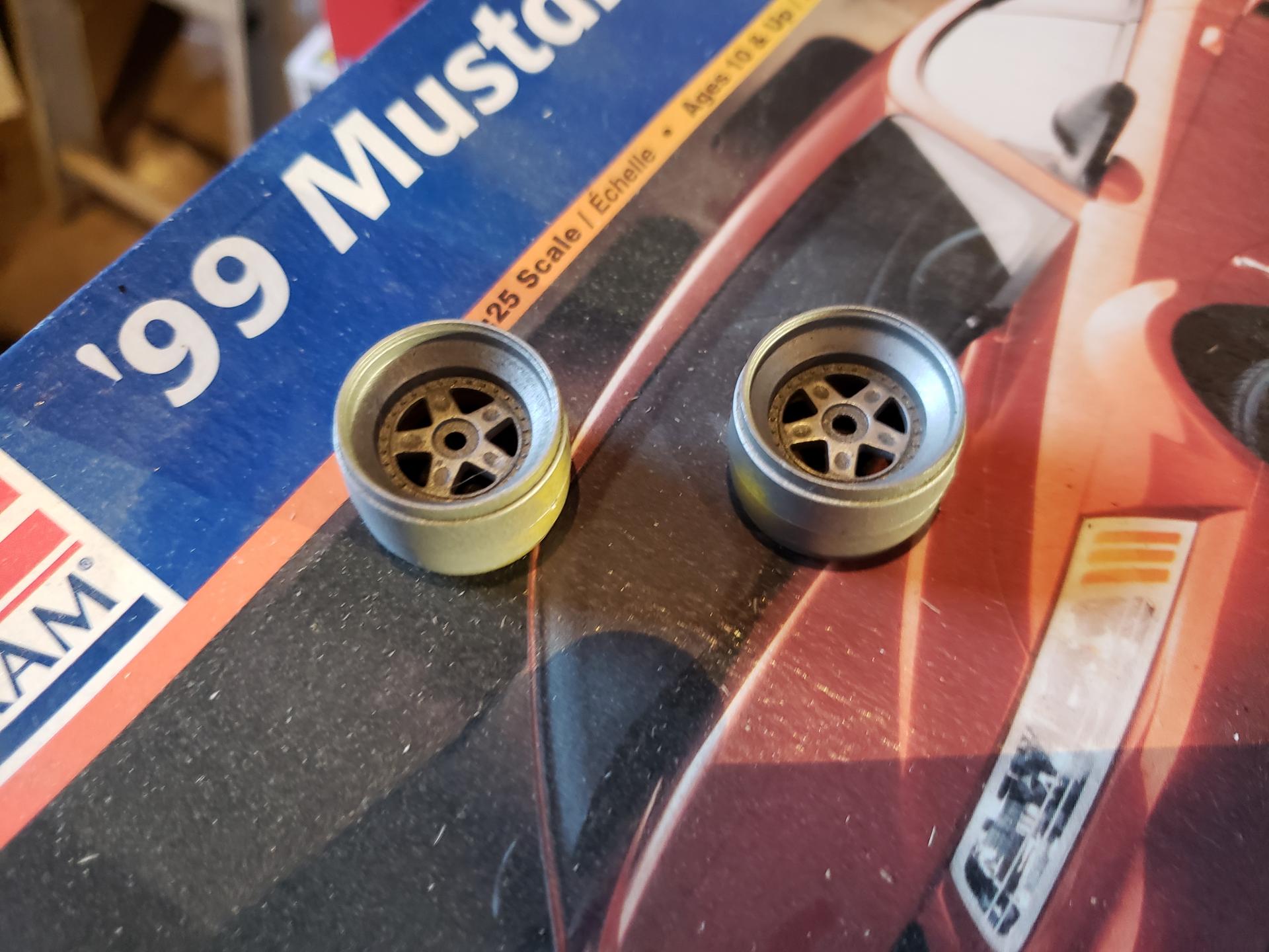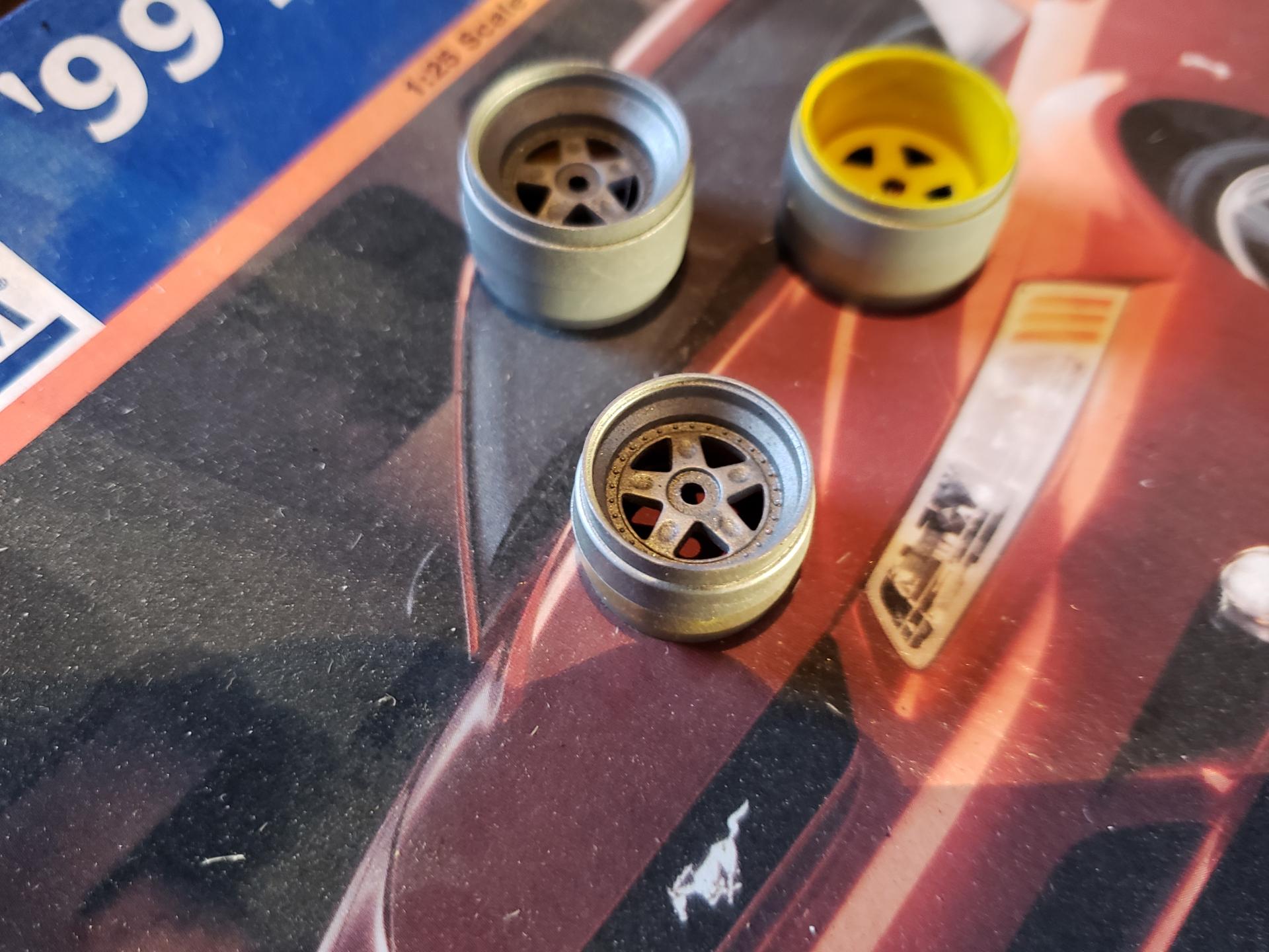 Inwas looking through some parts boxes today, and came across 3 out of 4 wheels. I have no idea what they are from. They are molded in yellow. The rears are wider than the fronts.They have been painted what looks like Testors Steel. Id like to get a complete set, but have no clue where to start. Thanks for looking!