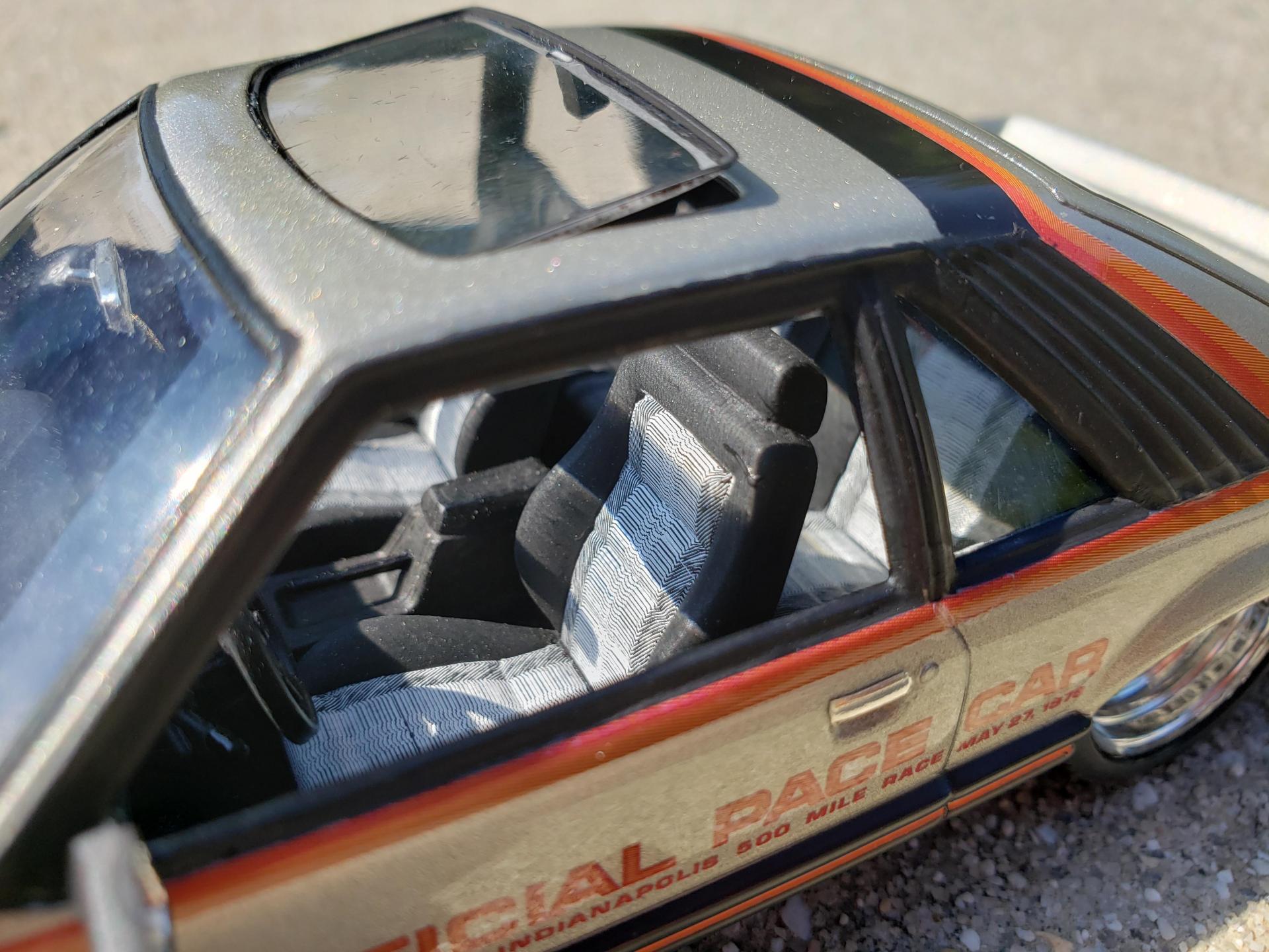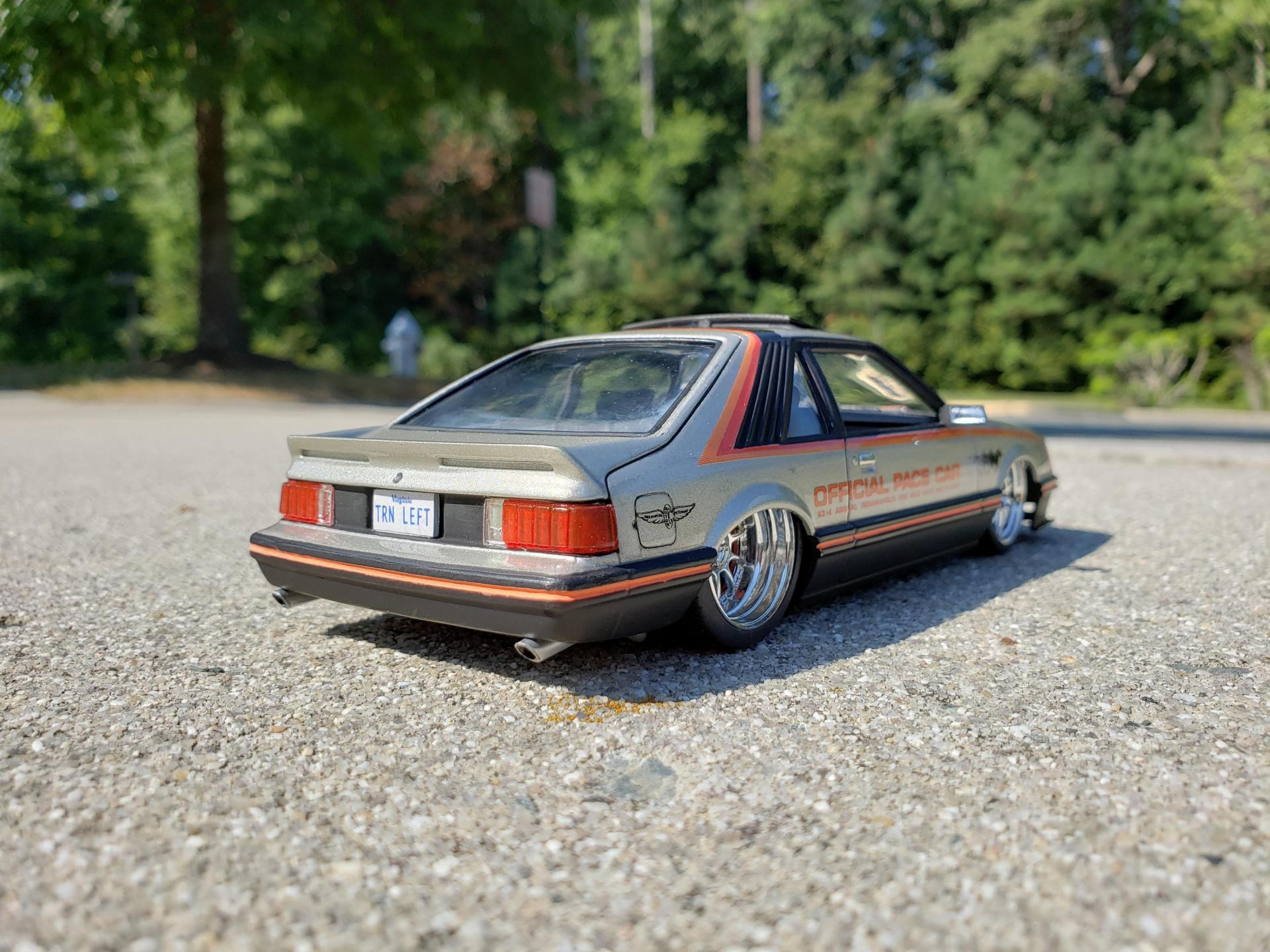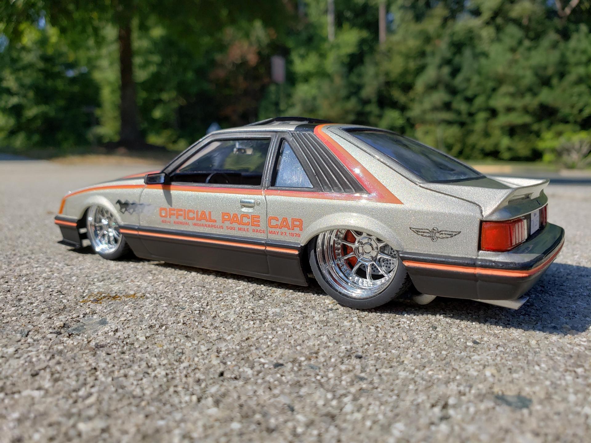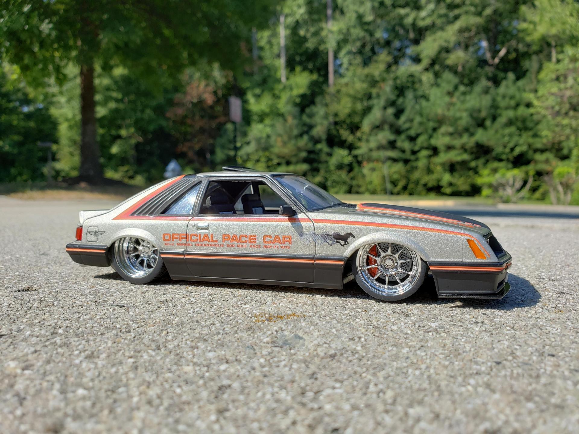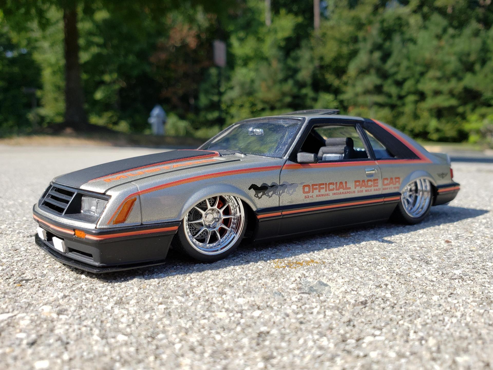 Hello folks! It's been a while since I've posted, but here's my Mustang Pace Car I completed back last month. I've wanted to do a pace car for sometime, and finally had time to do it. Paint is factory Ford Pewter poly and flat black with remastered pace car decals from Speedway Decals. He also made the seat patterns for me as well. Power is from a Revell GT500 and a 6 speed. Full airbag suspension gets the car nice and low over Aoshima BBS SS3 wheels, which have been widened in the rear. It's not perfect, but I'm happy with it. Thanks for looking! ?