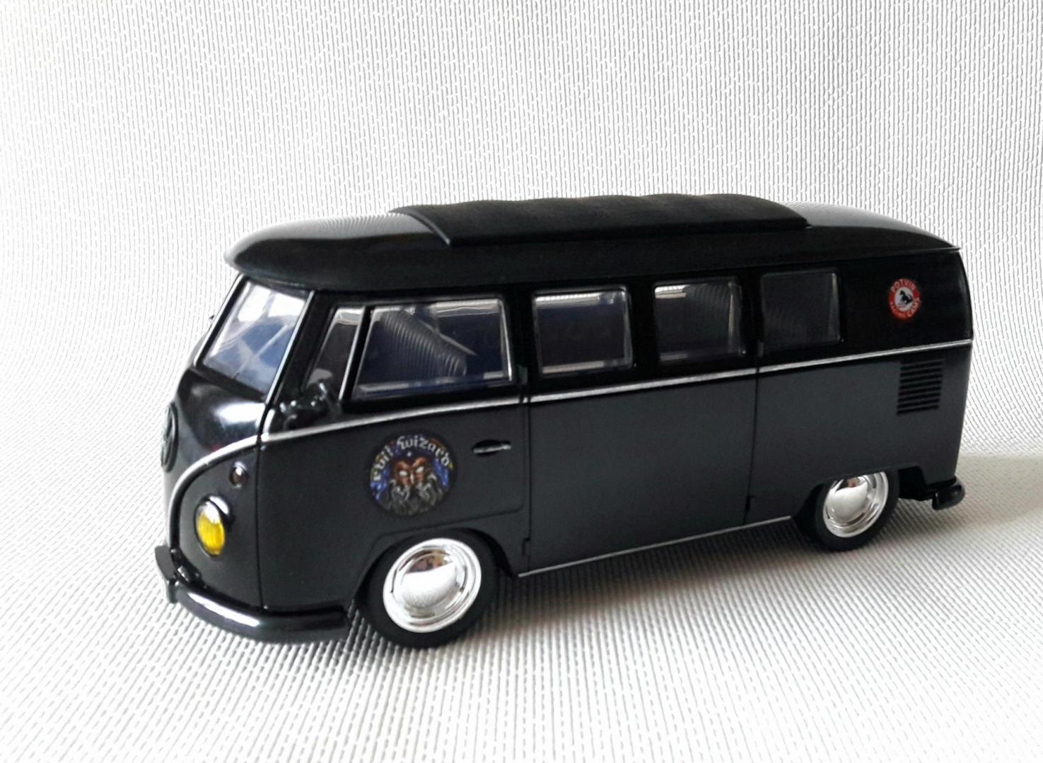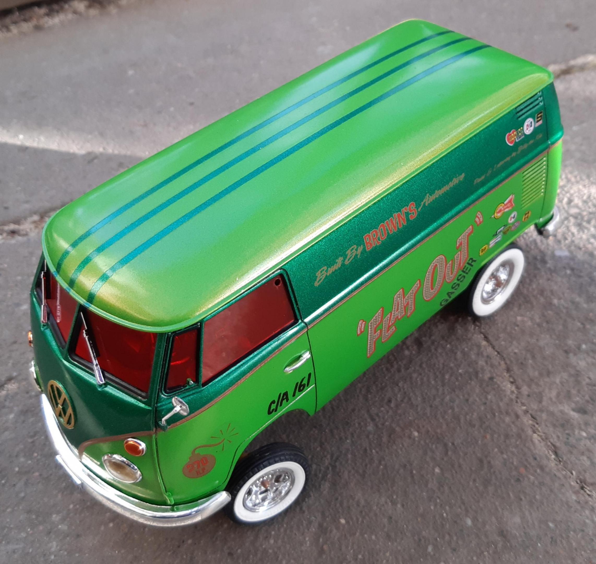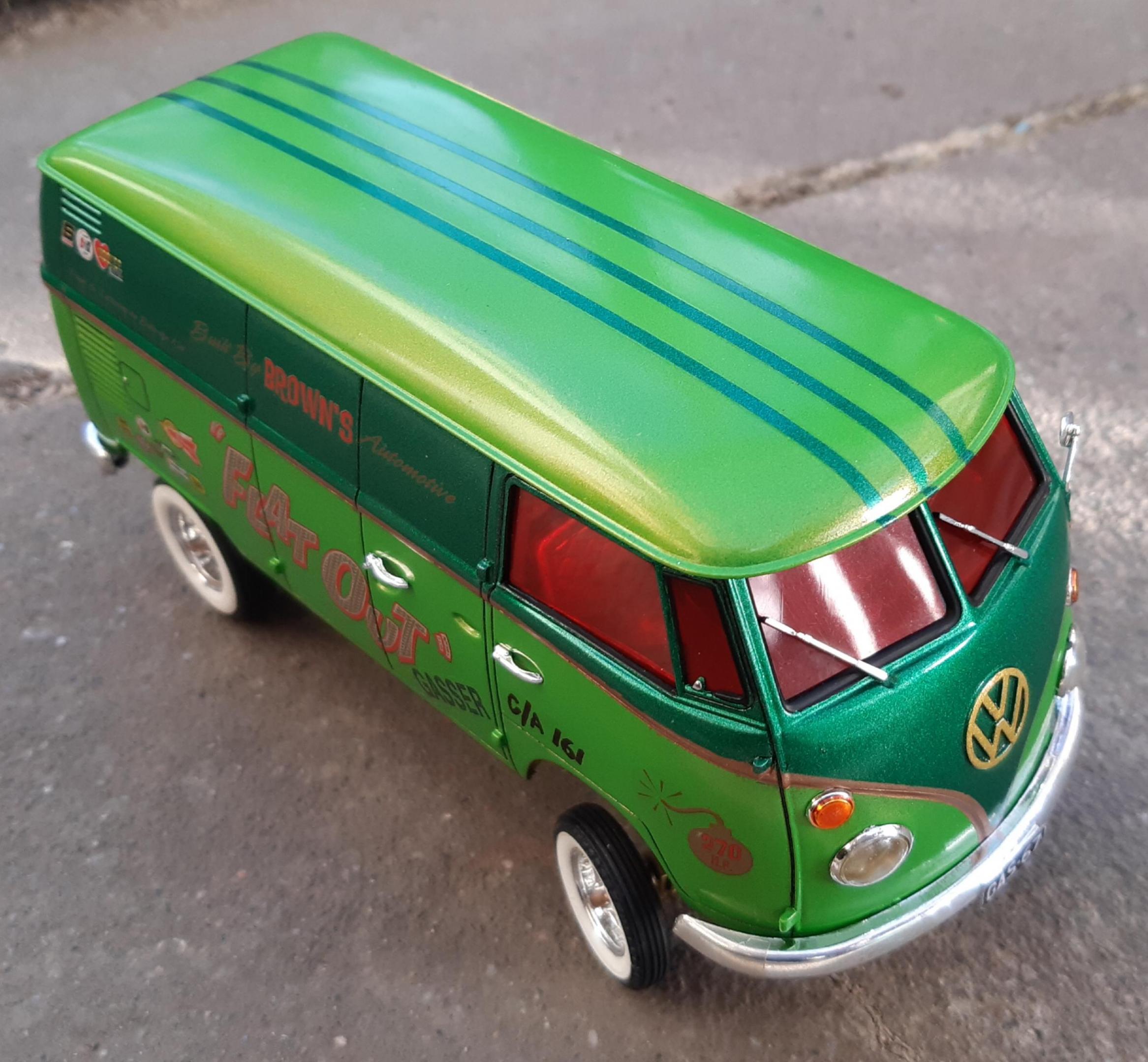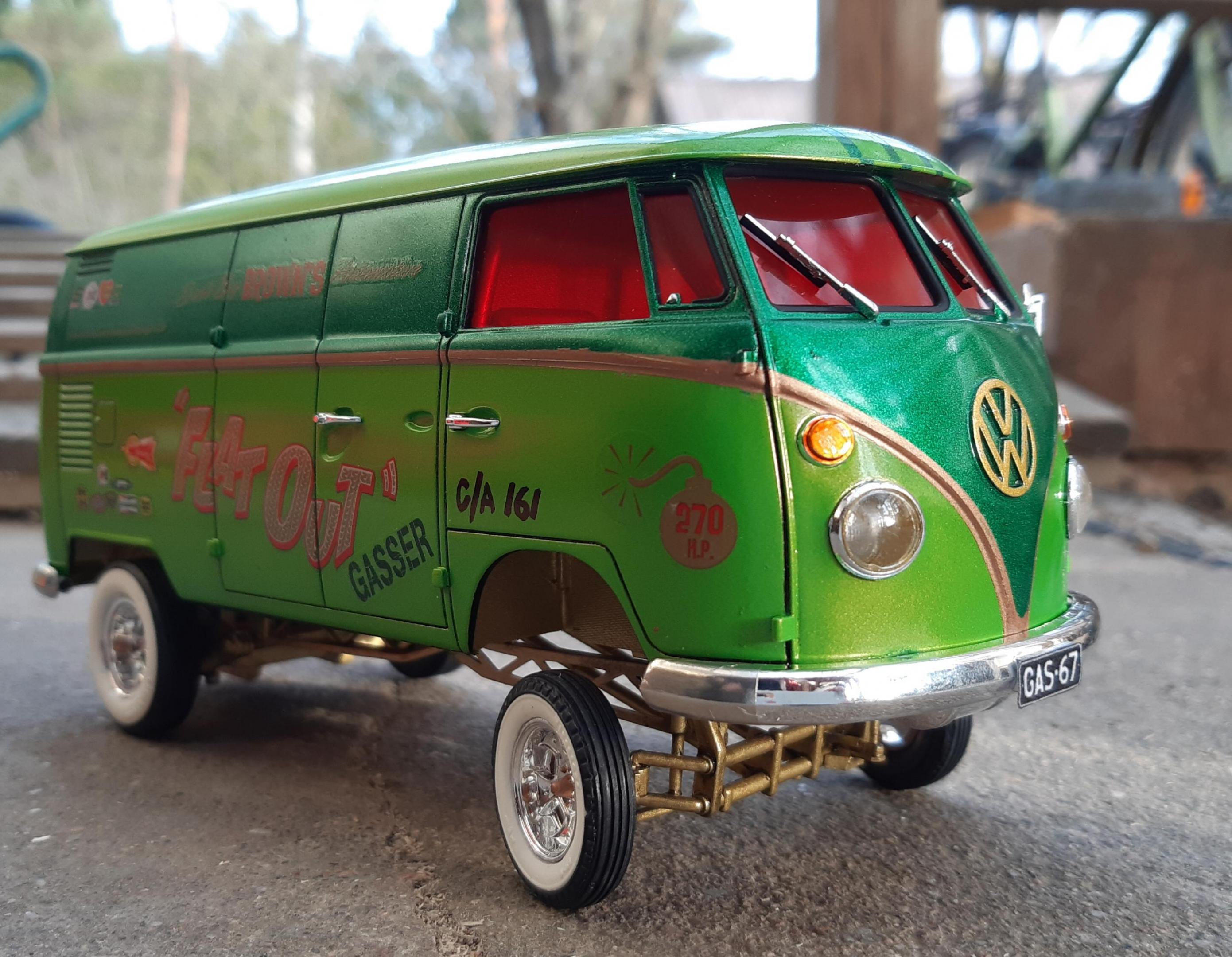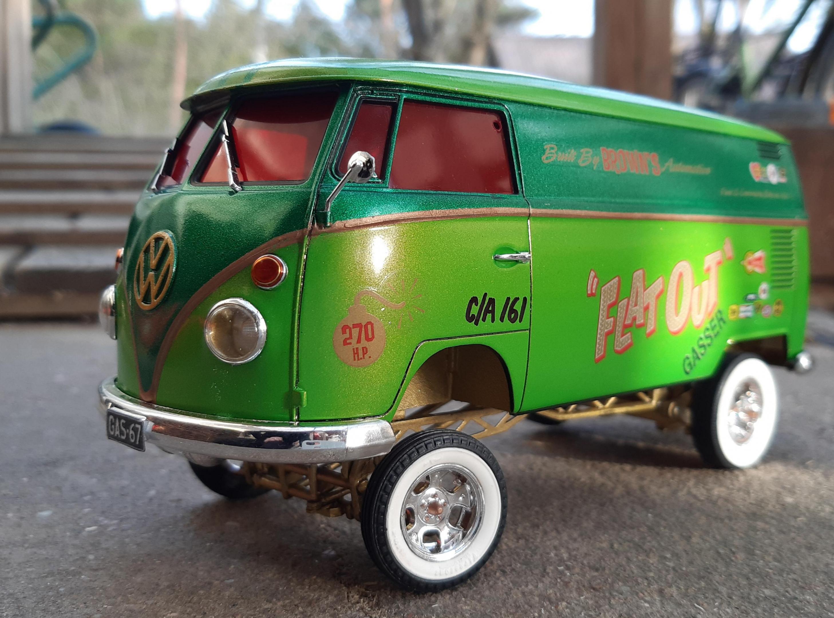 HI. This is my latest version of 1967 VW Kastenwagen ( = Van ). Built as a sixties- style gasser it has a modified Corvair engine from AMT parts pak. Paint is from Tamiya, decals are from various Revell kits. I modified interior with revell seats and console. Axles are VW original but raised with schratchbuilt and revell parts. Comments are always welcomed!