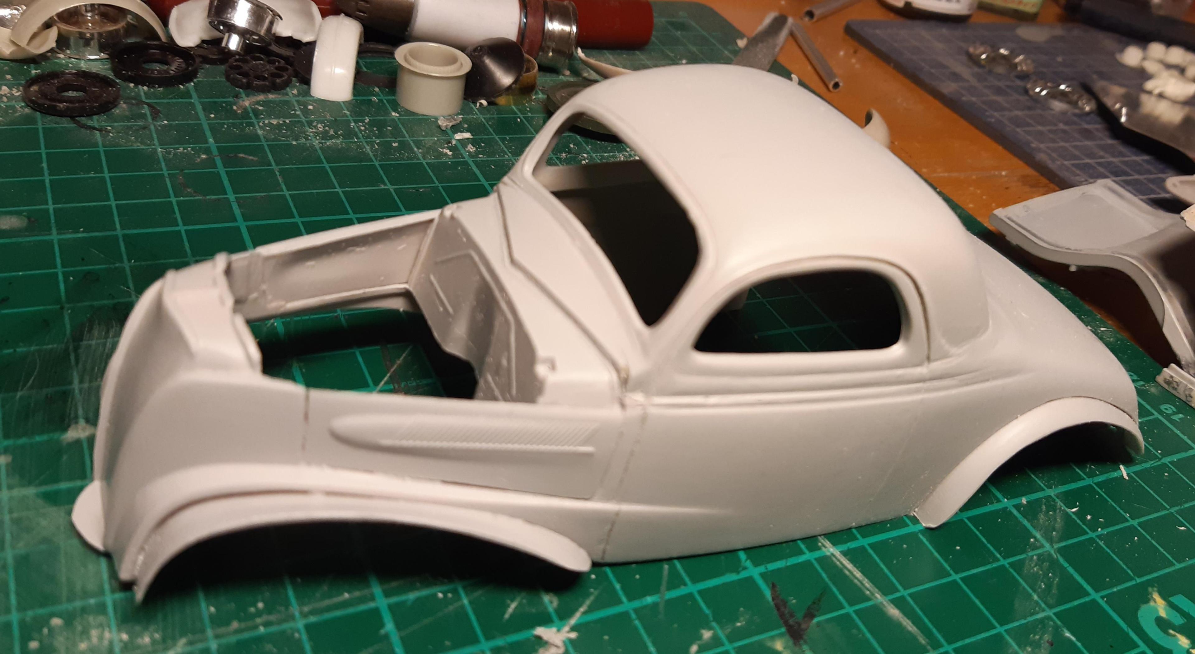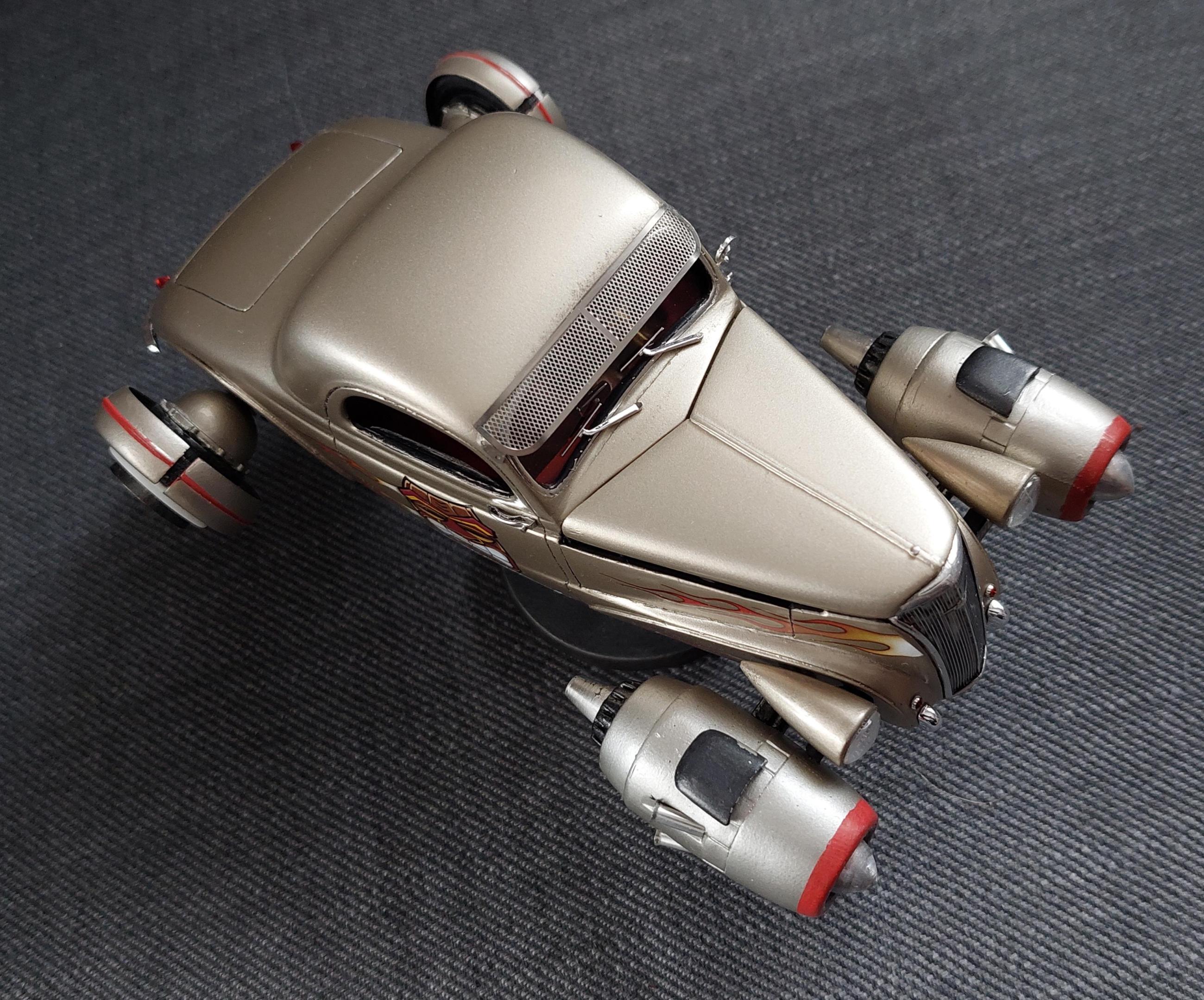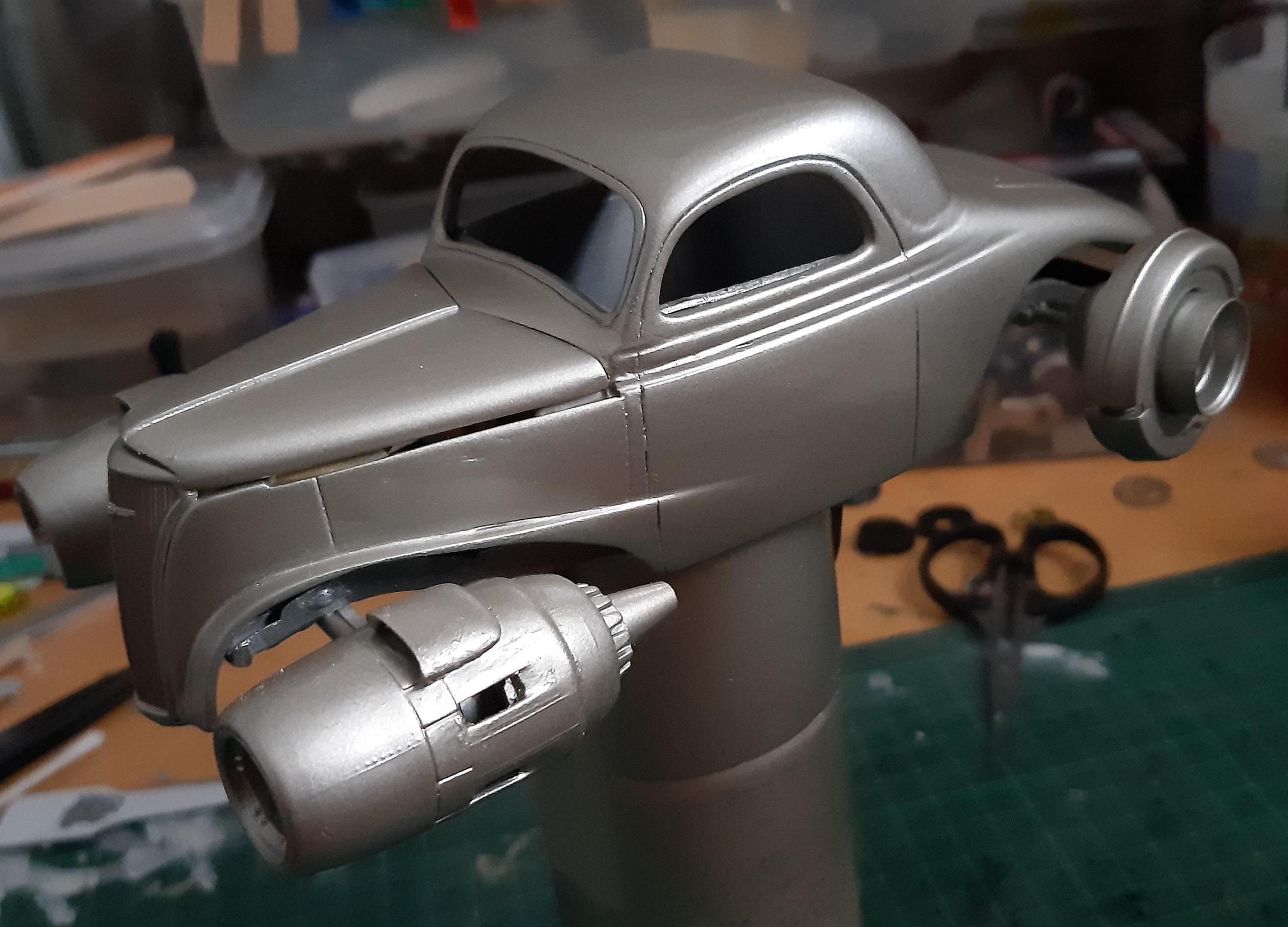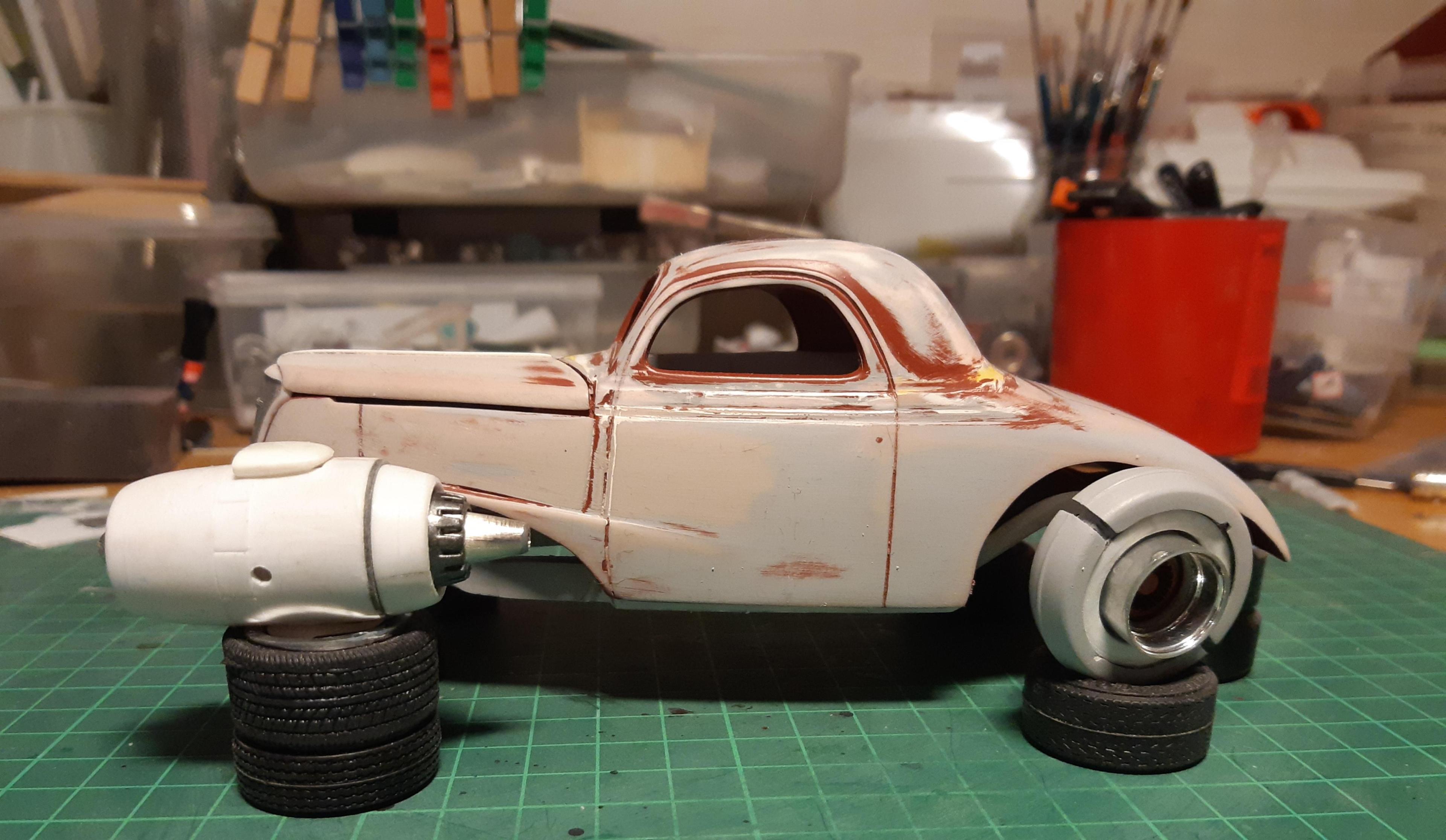I'm back with this build! Shortened those previously schratchbuild engines so now they are not too big for this car. Also deleted the convertible bodystyle by adding a top unit from 36 Ford.