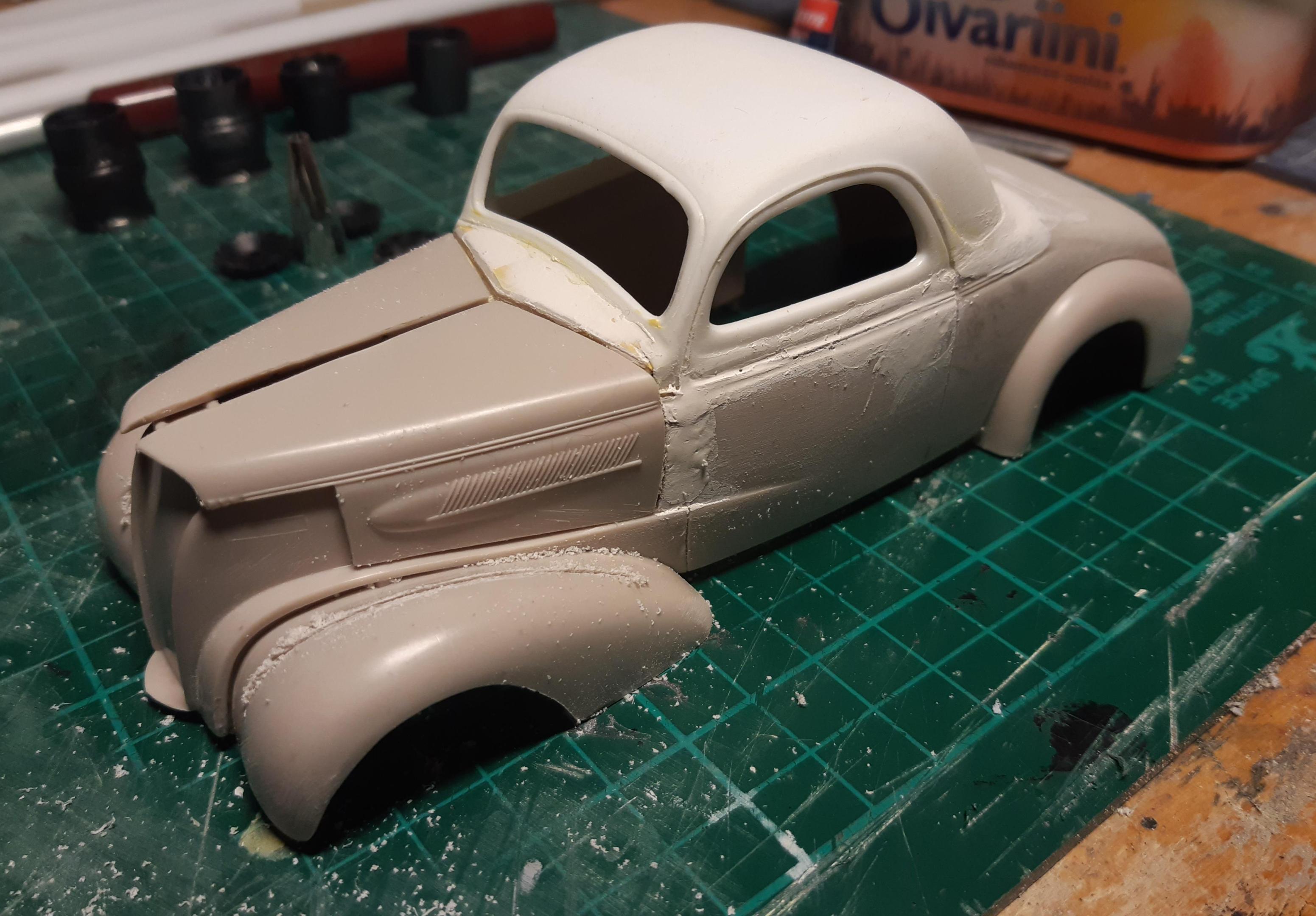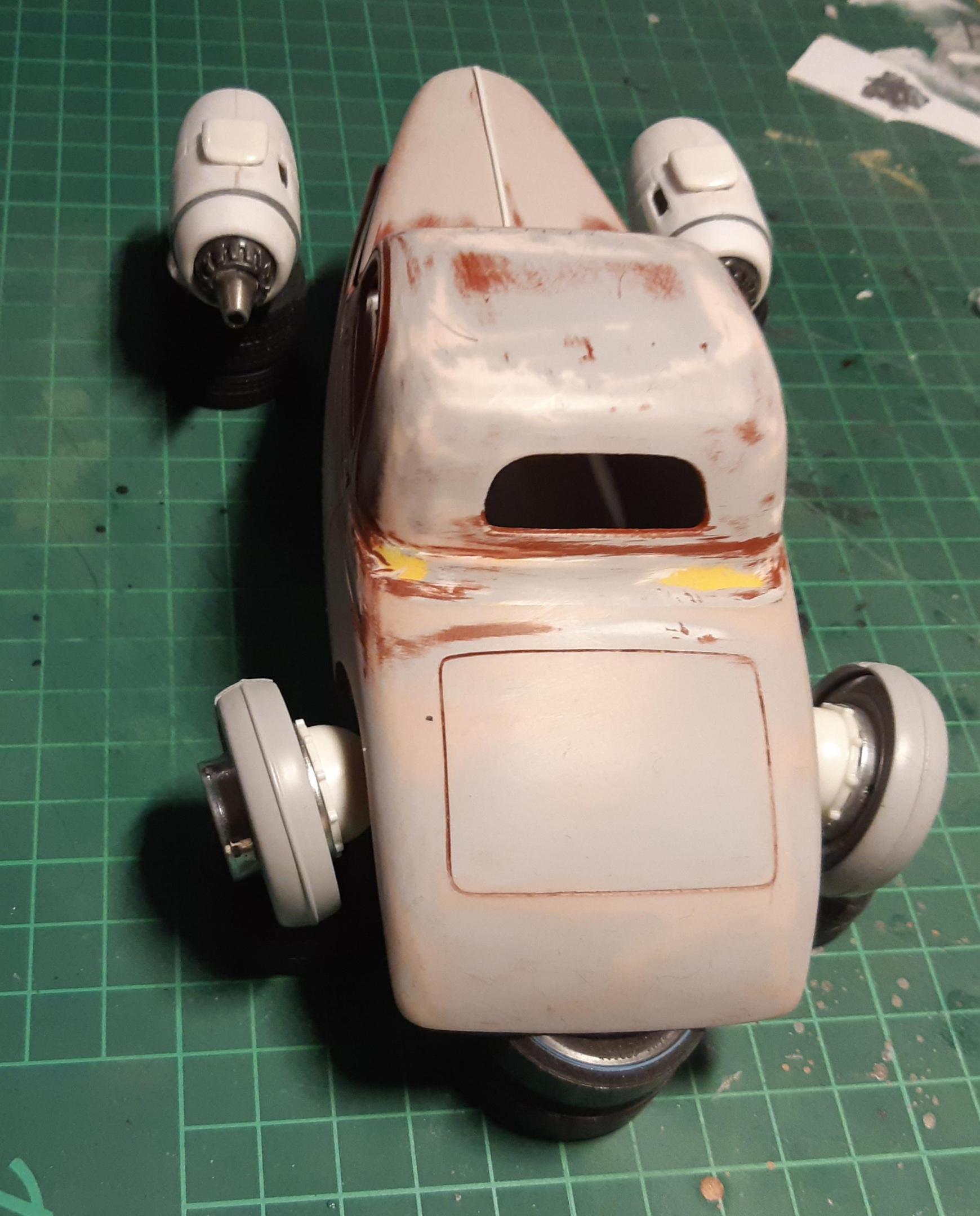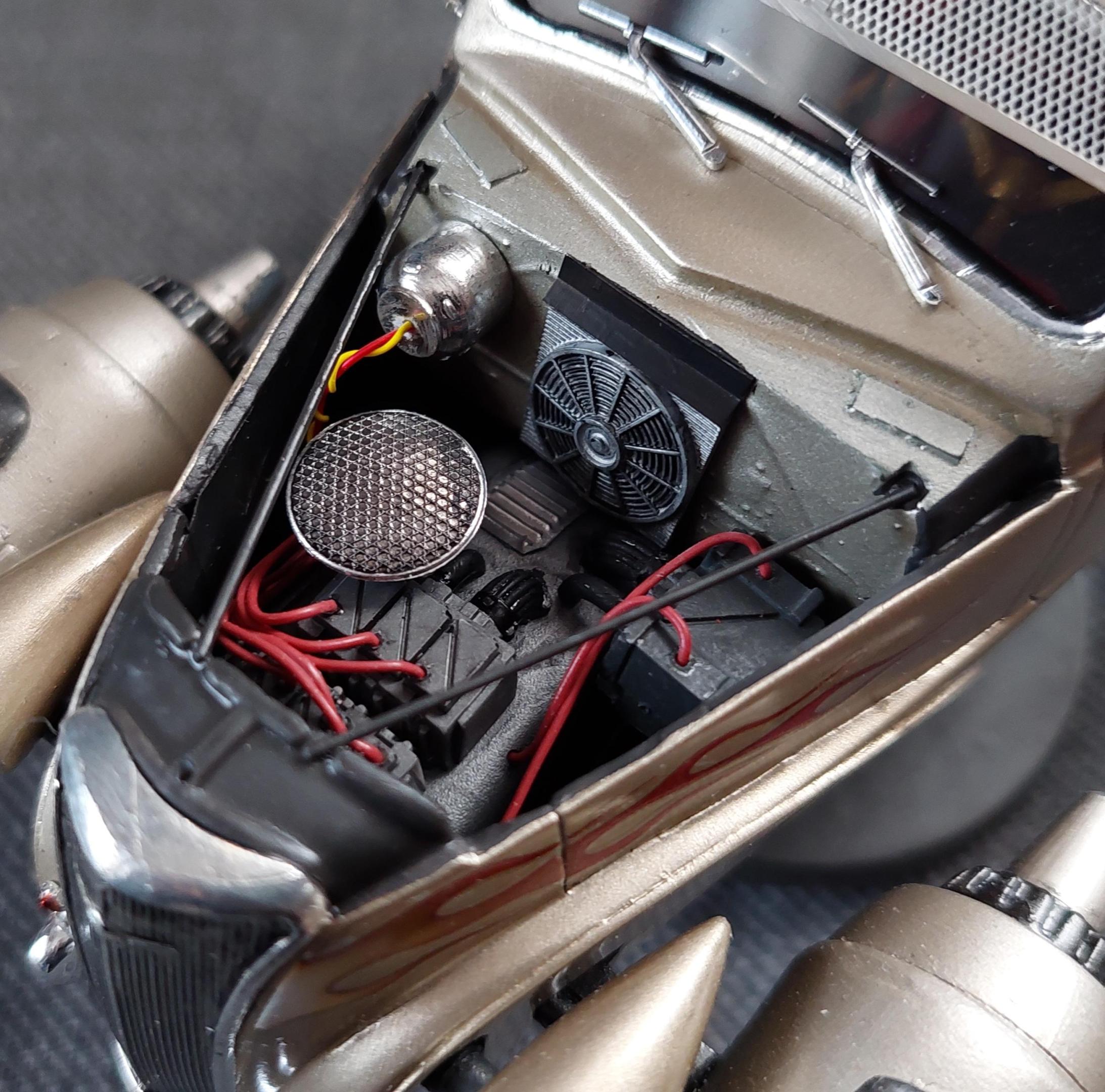 I'm back with this build! Shortened those previously schratchbuild engines so now they are not too big for this car. Also deleted the convertible bodystyle by adding a top unit from 36 Ford.