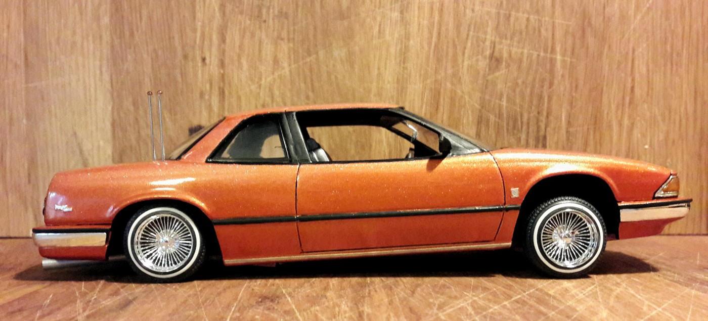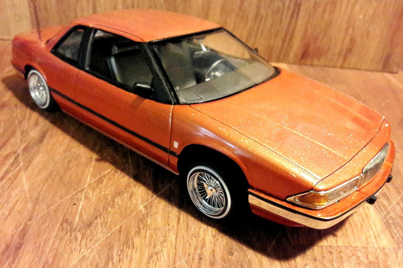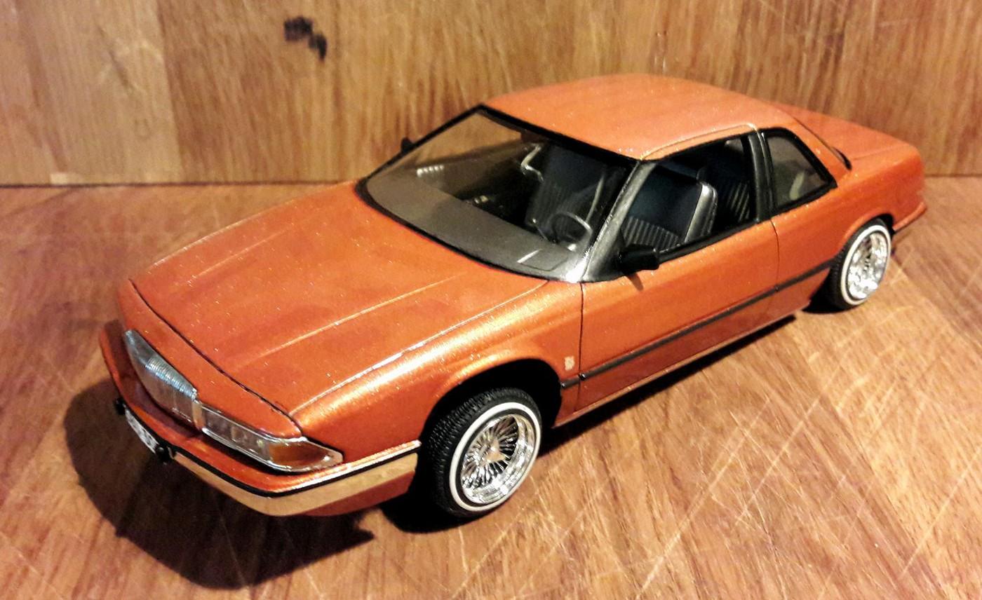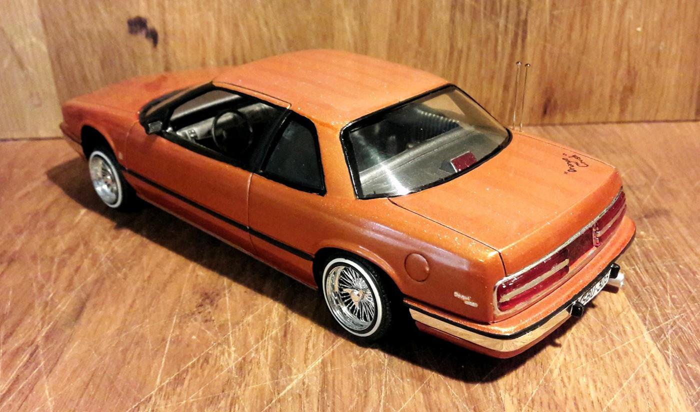 HI! This lowrider model is based on a 1/25 promo which had no information of model company that has made it. Promo was packed in white cardboard box with color prints of drawn pics of red Regal and large Buick- logos. Maybe it´s made by Brooklin or MPC or AMT... I don´t know. Same company has obviously made the Buick Reatta promo bcause it it so similar to this Regal. But on to model: I Disassembled the promo and painted it with tamiya paints. Body has: Surfacer white + Light pearl red + lame flake ( PS) + clear + metallic orange ( thin mist layers ) + clear Some modifications to rear subrame was done also and finally I added Pegasus wheels. Pics: