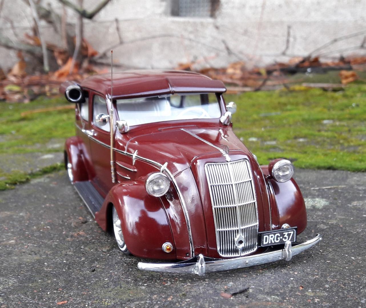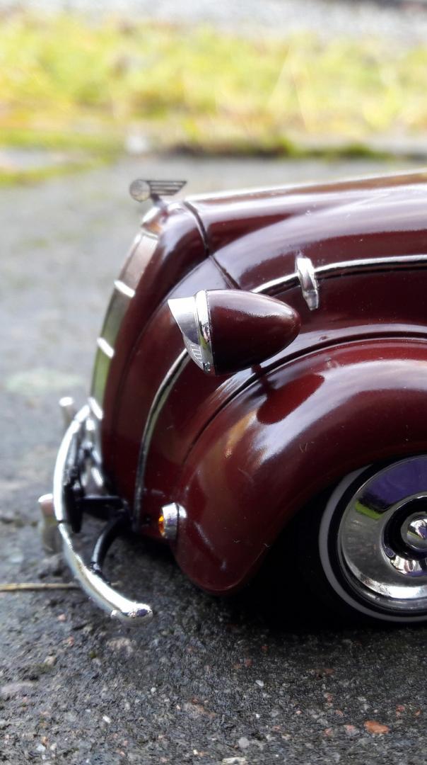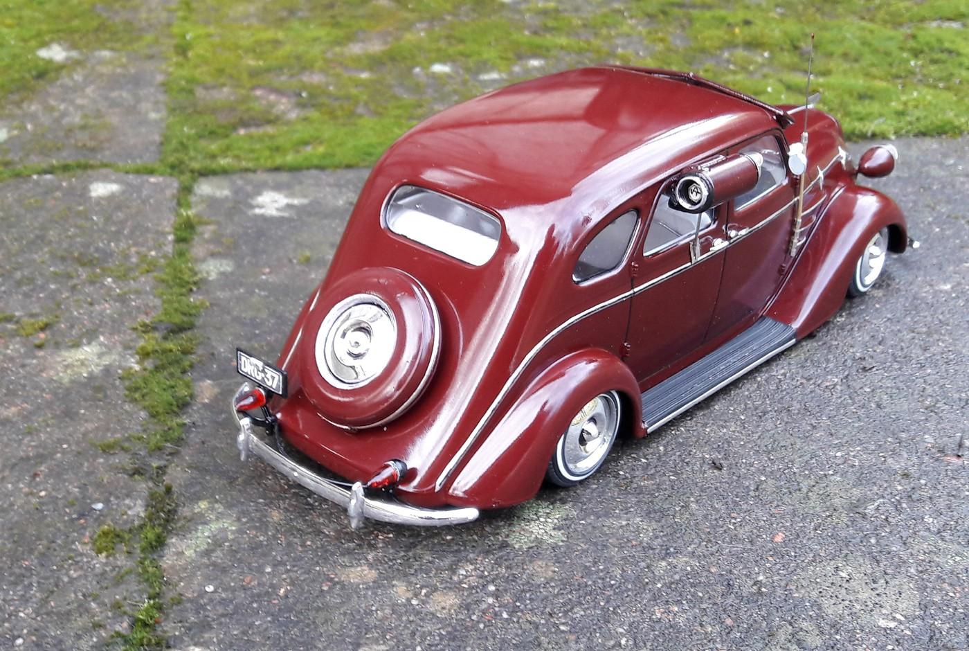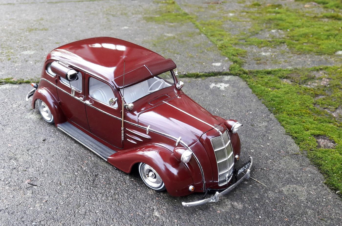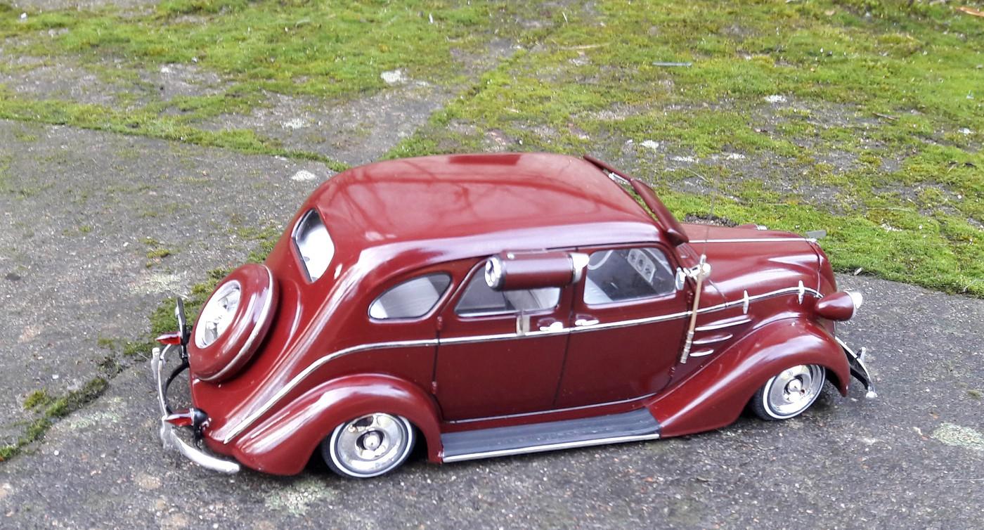 So this is my attempt to build Tamiya´s ´36 Toyoda AA as a ´37 Bagged lowrider bomb. Paint tamiya TS-11 Maroon, scratchbuild visor and many other small details, Modelhaus swamp cooler, AMT hubcaps with Pegasus wheels and tyres. I installed air bags front and rear and had to modify front section of the frame and oil pan to clear lowered and narrowed front axle. The air suspension is now supposed to be in its maximum lowlow posotion. Oh, I also decided to convert this to leht hand steering version. Pics: