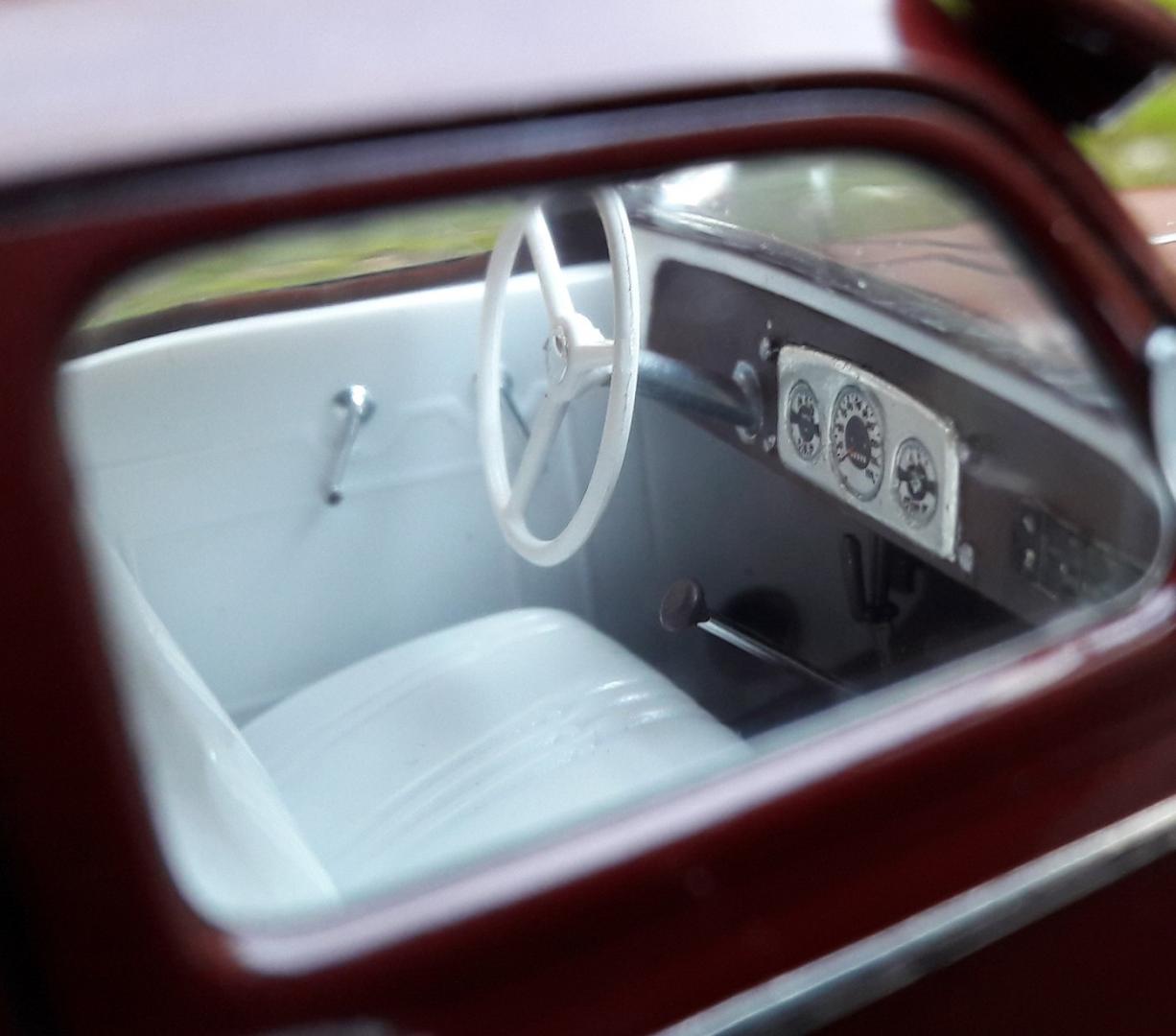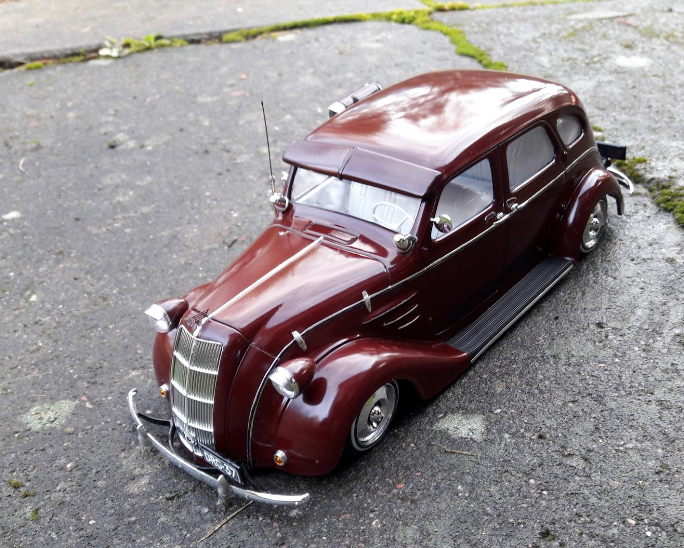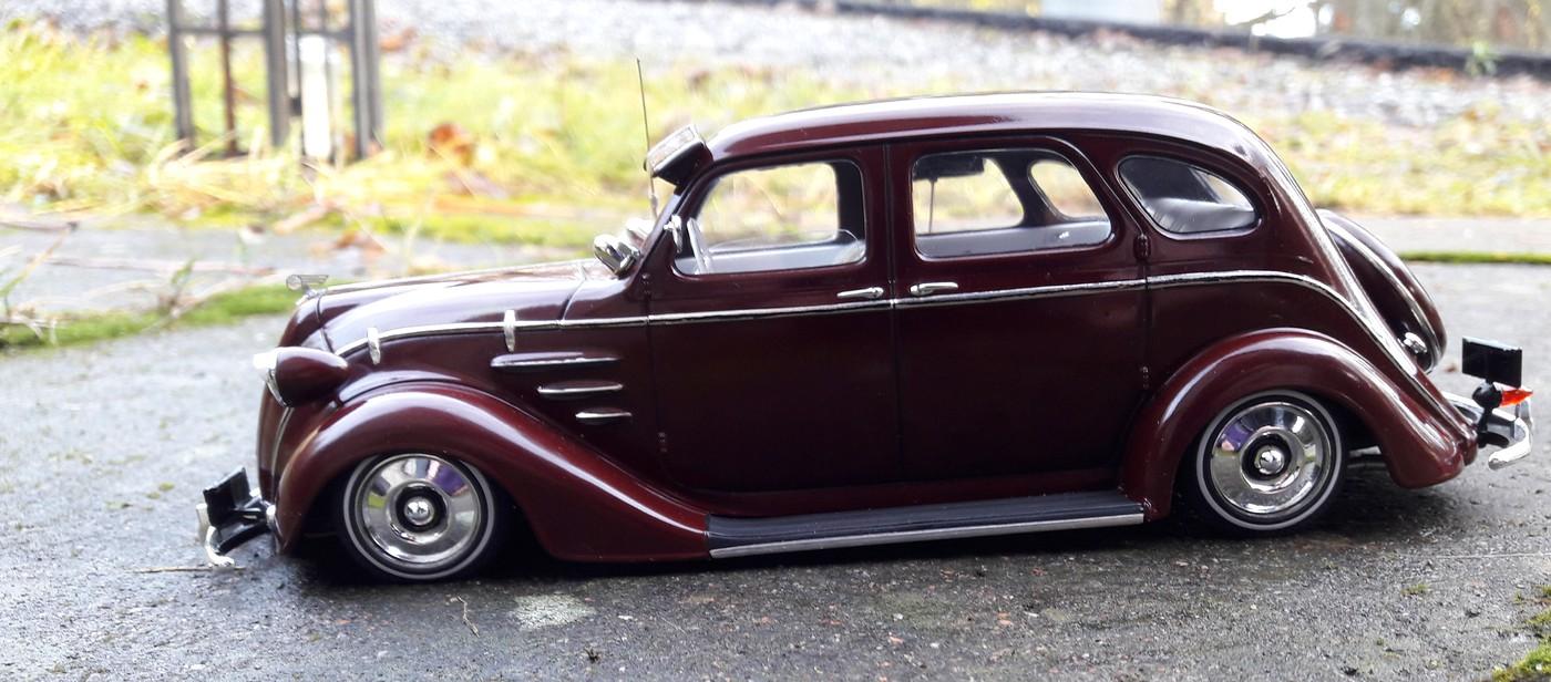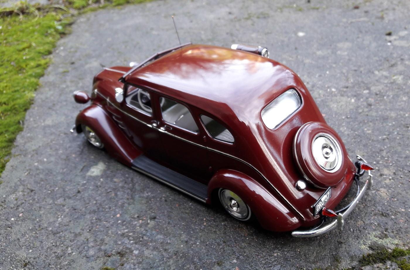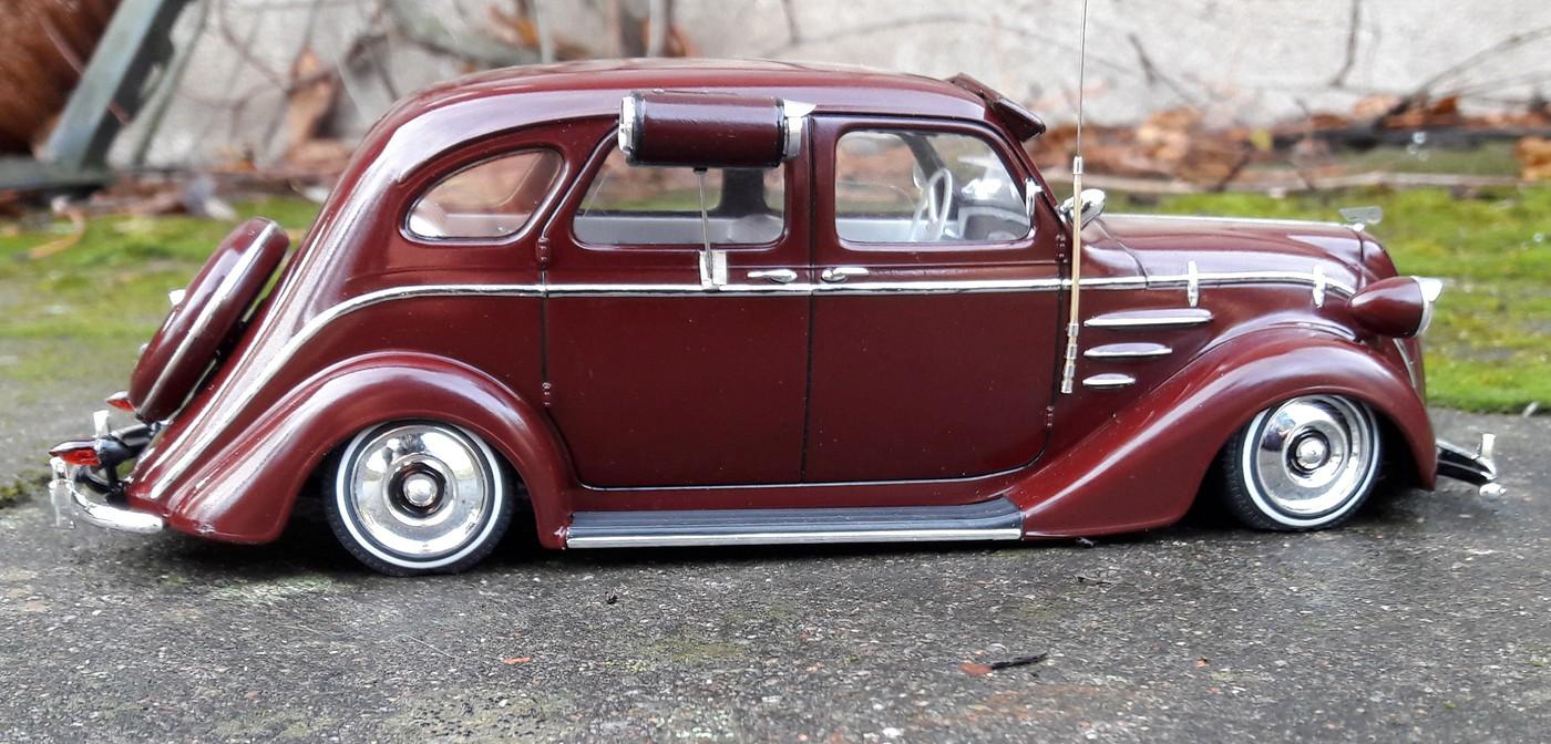 So this is my attempt to build Tamiya´s ´36 Toyoda AA as a ´37 Bagged lowrider bomb. Paint tamiya TS-11 Maroon, scratchbuild visor and many other small details, Modelhaus swamp cooler, AMT hubcaps with Pegasus wheels and tyres. I installed air bags front and rear and had to modify front section of the frame and oil pan to clear lowered and narrowed front axle. The air suspension is now supposed to be in its maximum lowlow posotion. Oh, I also decided to convert this to leht hand steering version. Pics: