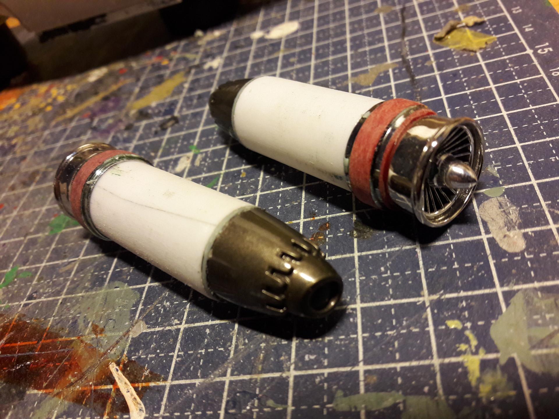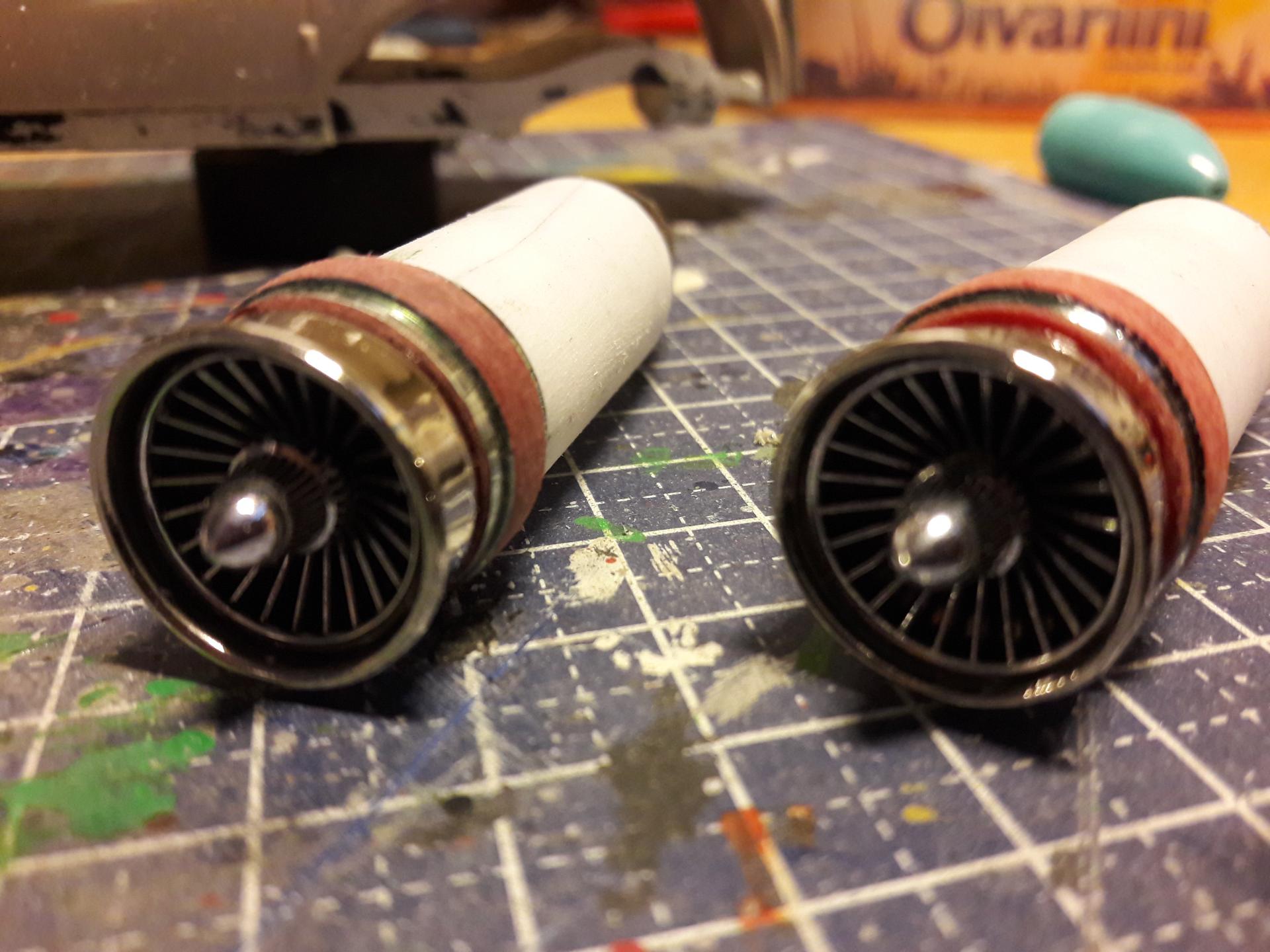 I started schratching turbines for my '37: I used amt dagmars, amt 63 Corvette wheels, thimbles, some promo wheels with drilled out centers, white plastic tubing from childrens pen and star wars battle droid thing afterburner units. Lots of protective metal plating to be added but the basic stucture of engines is now there.