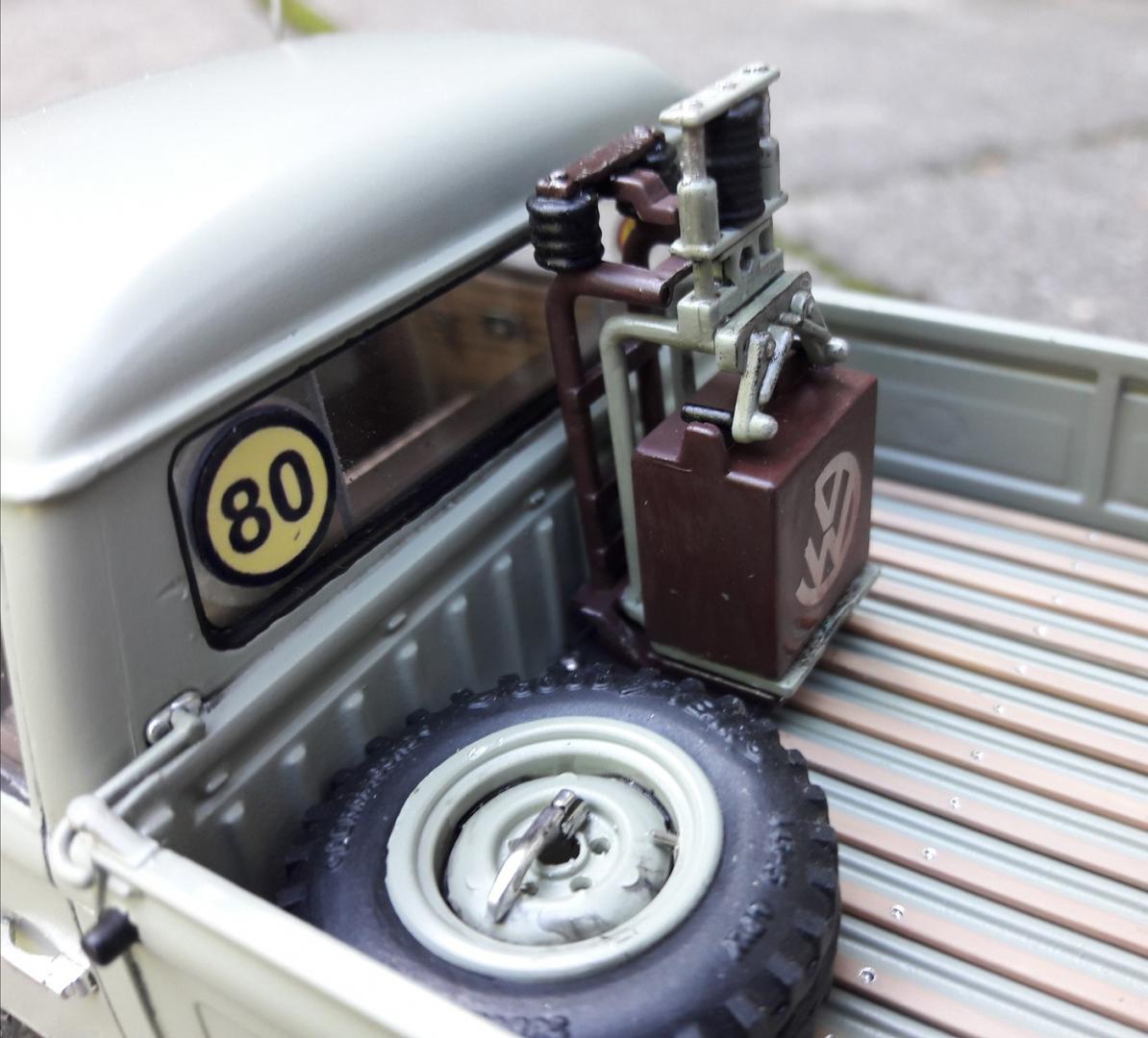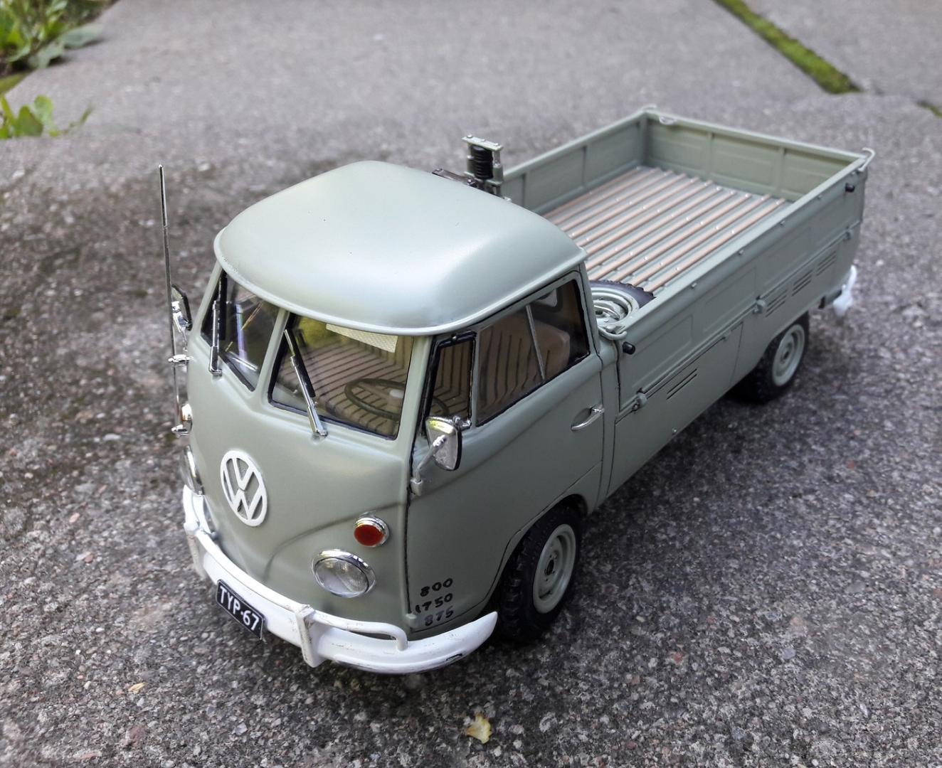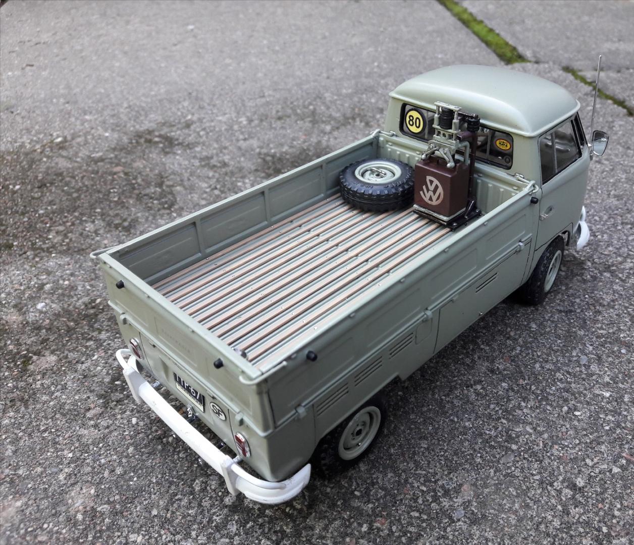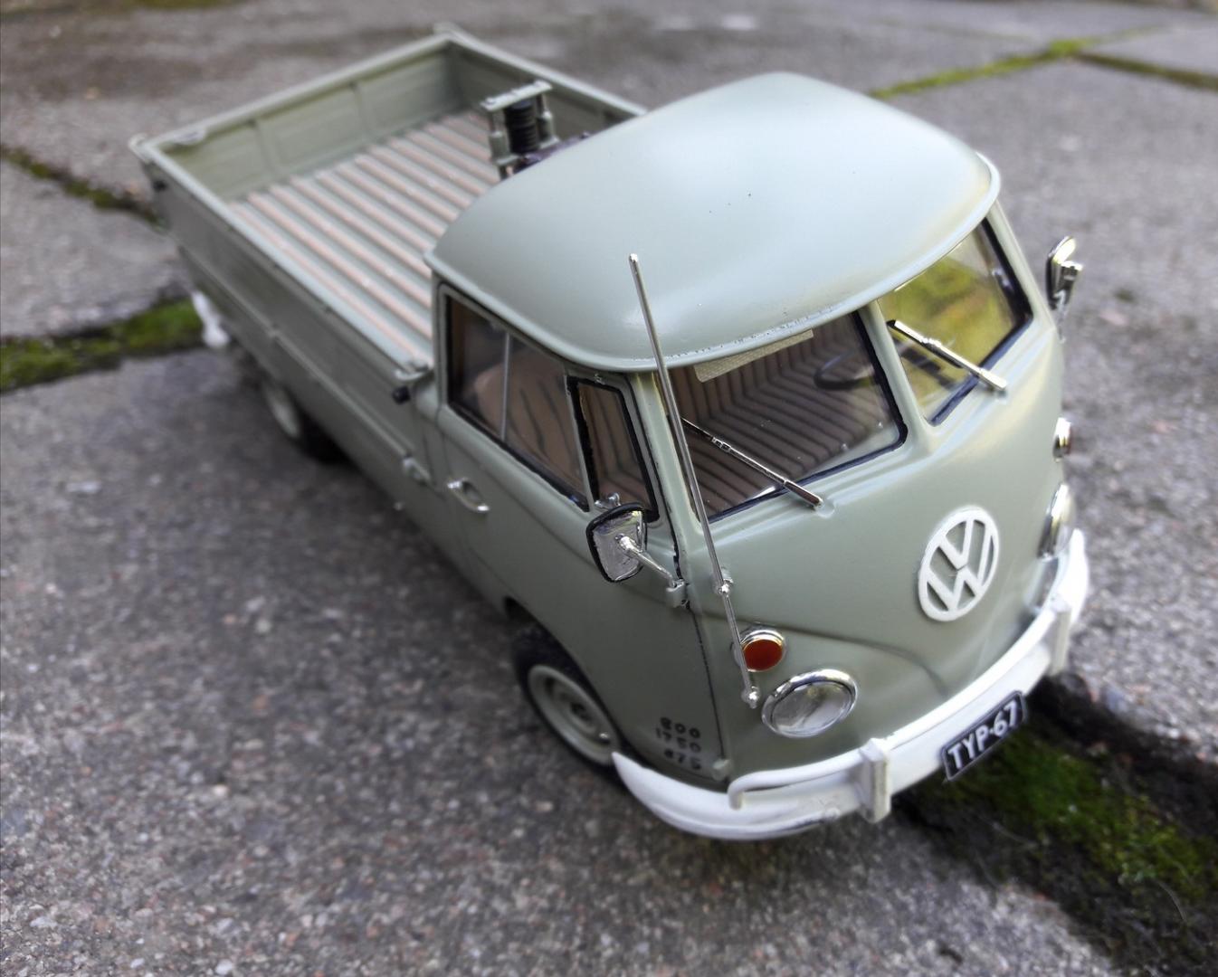 This one is a Hasegawa VW pritchenwagen ( pick - up ) from 1967. It was built almost box stock. Wheels are from AMT 51 Chevy with AMT winter tyres. I also lifted suspension a bit. I do not know what that gadget on the bed is, I found it from my parts box and it looks cool. On doors there are local weight numbers that were mandatory ( by law ) on pick ups here in Finland back then. Model has finnish licence plates and on the rear window you can see a 80- sticker that tells you that back then vehicle maximum speed was resticted to 80 km/h on pick ups.