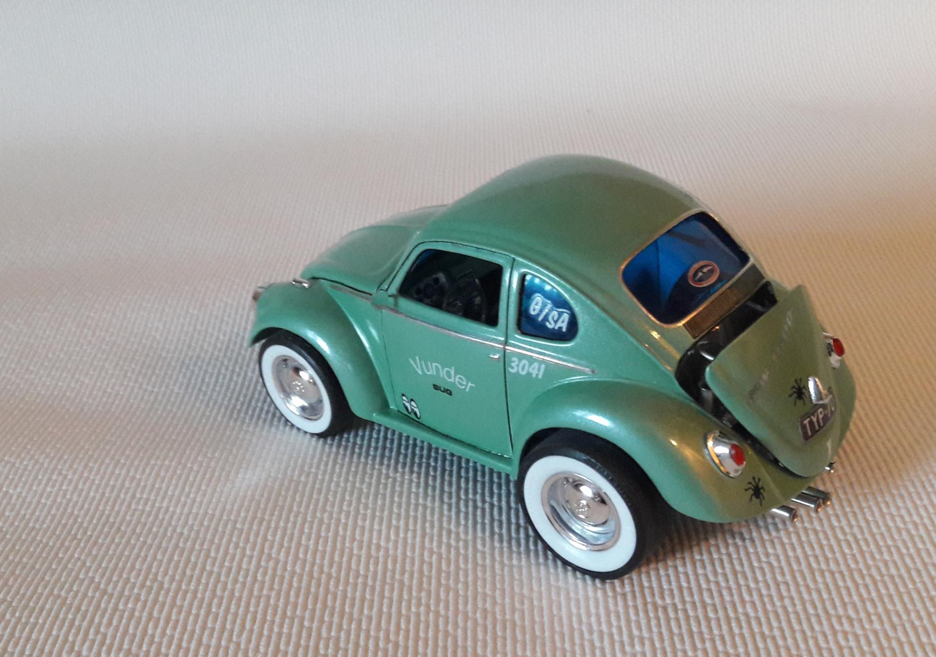 This one is an AMT Superbug gasser kit that I detailed a bit. Color is Tamiya pearl light green, wheels are Revell `49 Merc steelies with Polar Lights VW hubcaps and tyres came from modelhaus. Windows are made from acetate and the exhaus system from aluminium as well as hood support. And here are those pics: