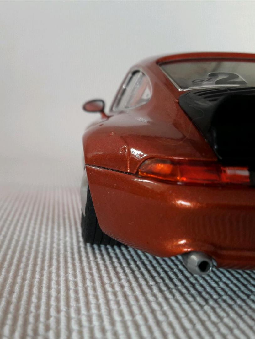This one is slightly modified Tamiya 911 GT2 with spun aluminium hubcaps. Color is metallic orange, also by Tamiya.