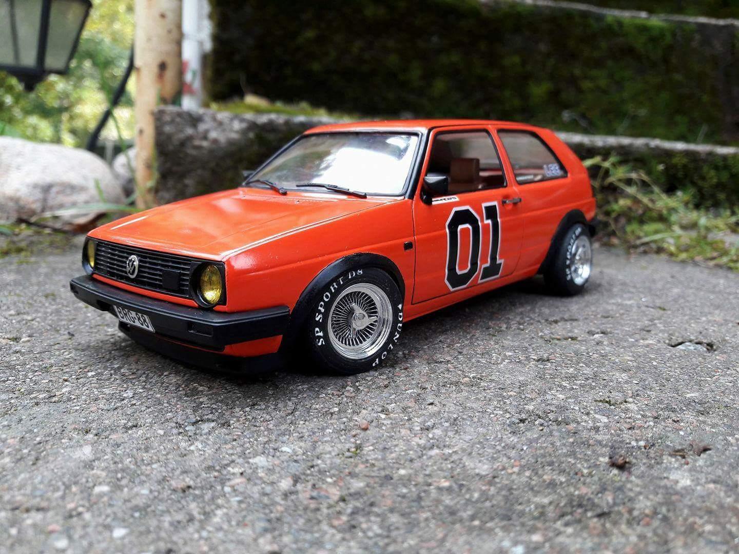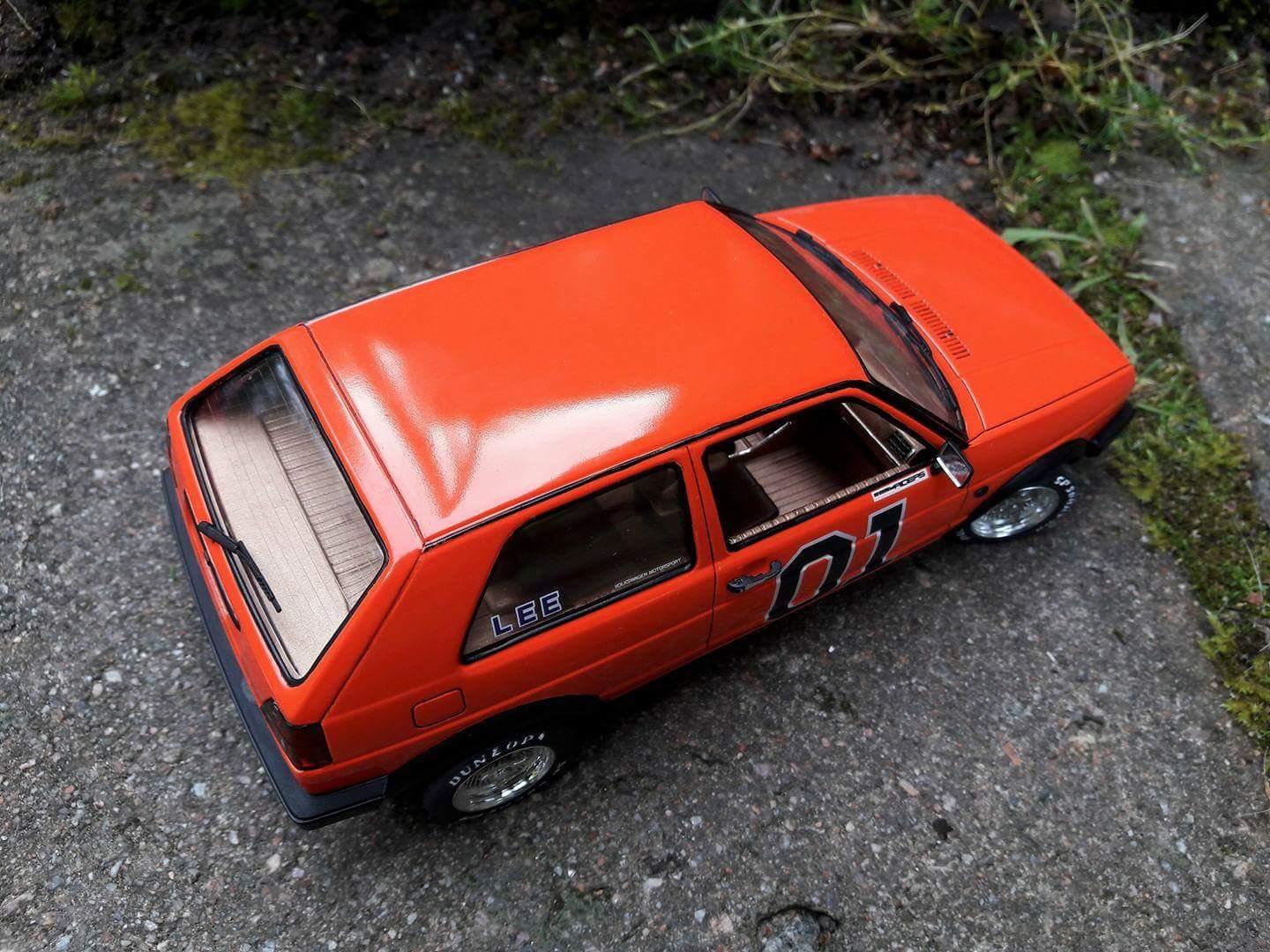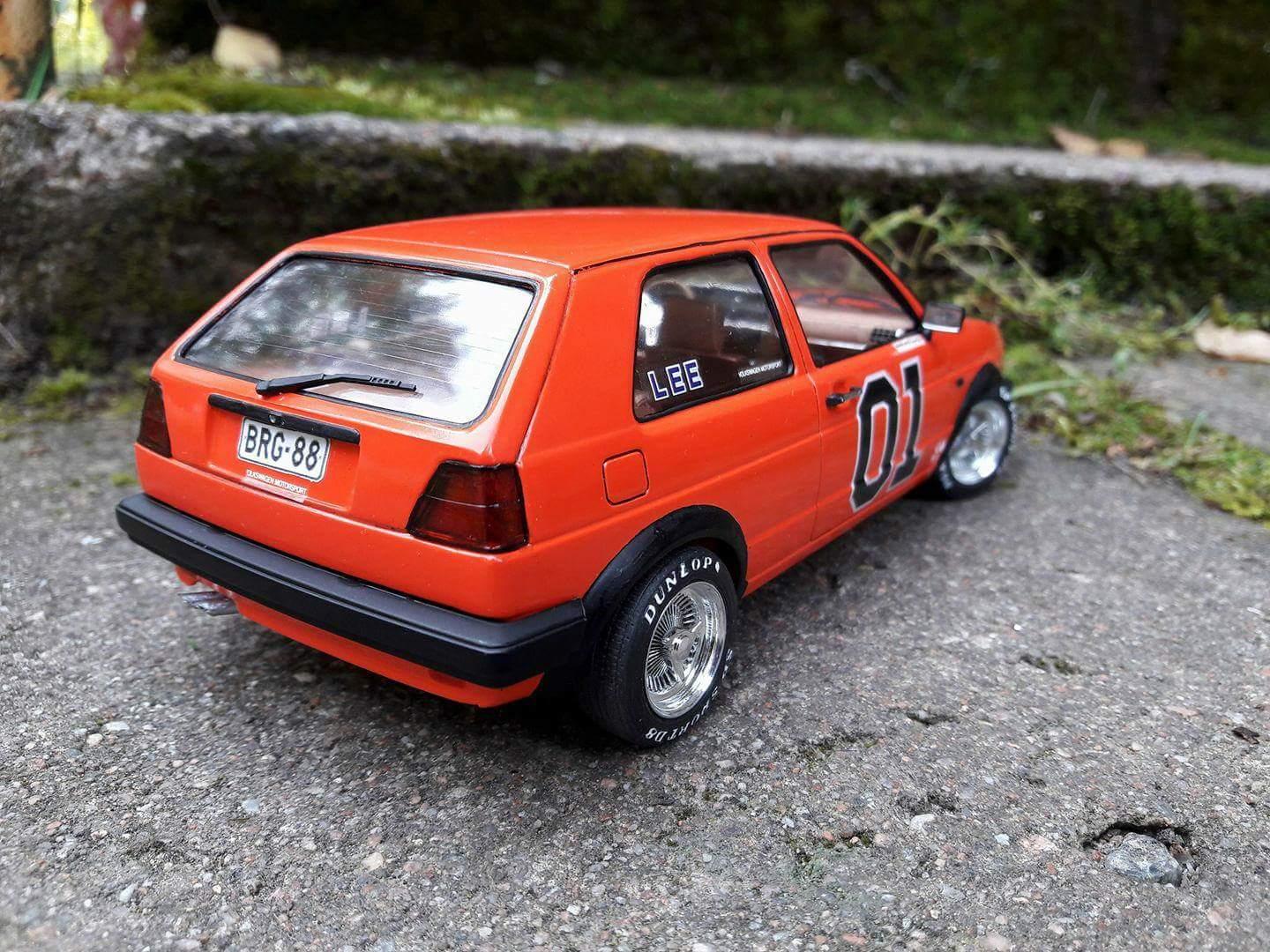 So this is 1988 VW Golf. It's called VW Golf here in Europe and VW Rabbit in U.S. if I'm right. Actually this kit represents a chopped 1986 model but I left fixed " went " windows off to make it look like '88 model with older side mirrors and grille. Fujimi has done a great job by molding a chopped Mk2 Golf body so it wasn't possible to build this this one as a stock version. Using tamiya bright orange spray led to other things in decal placement.