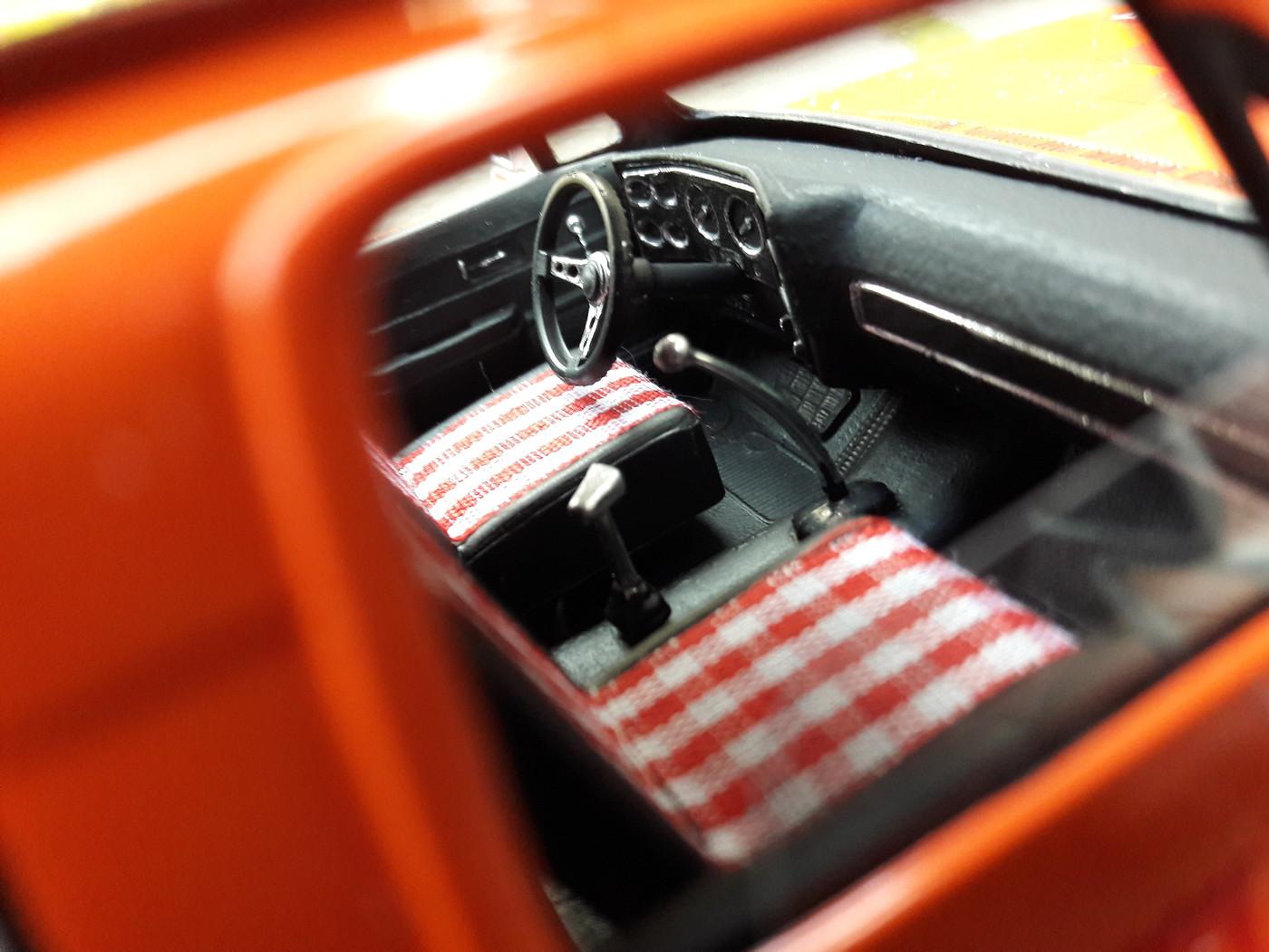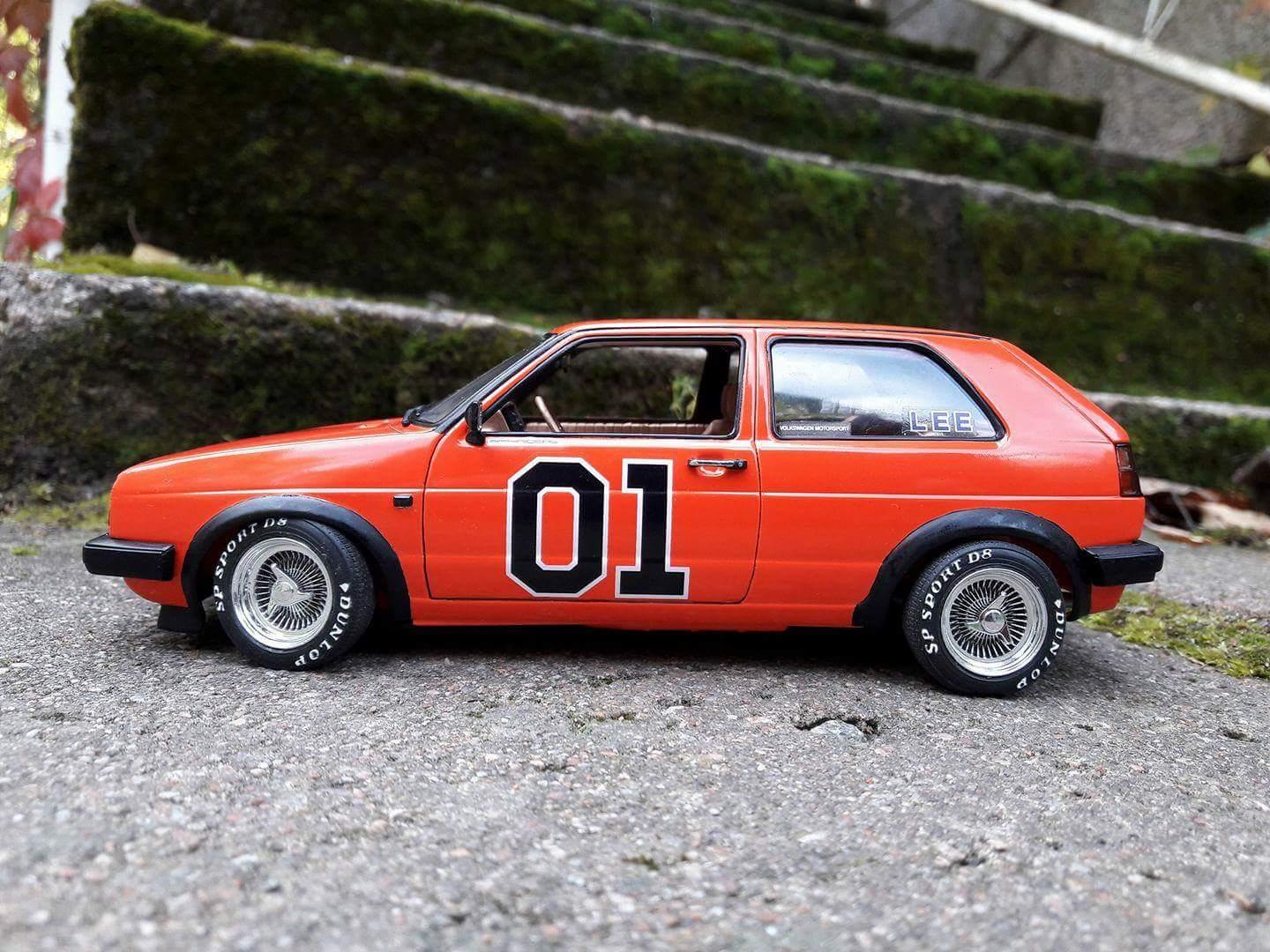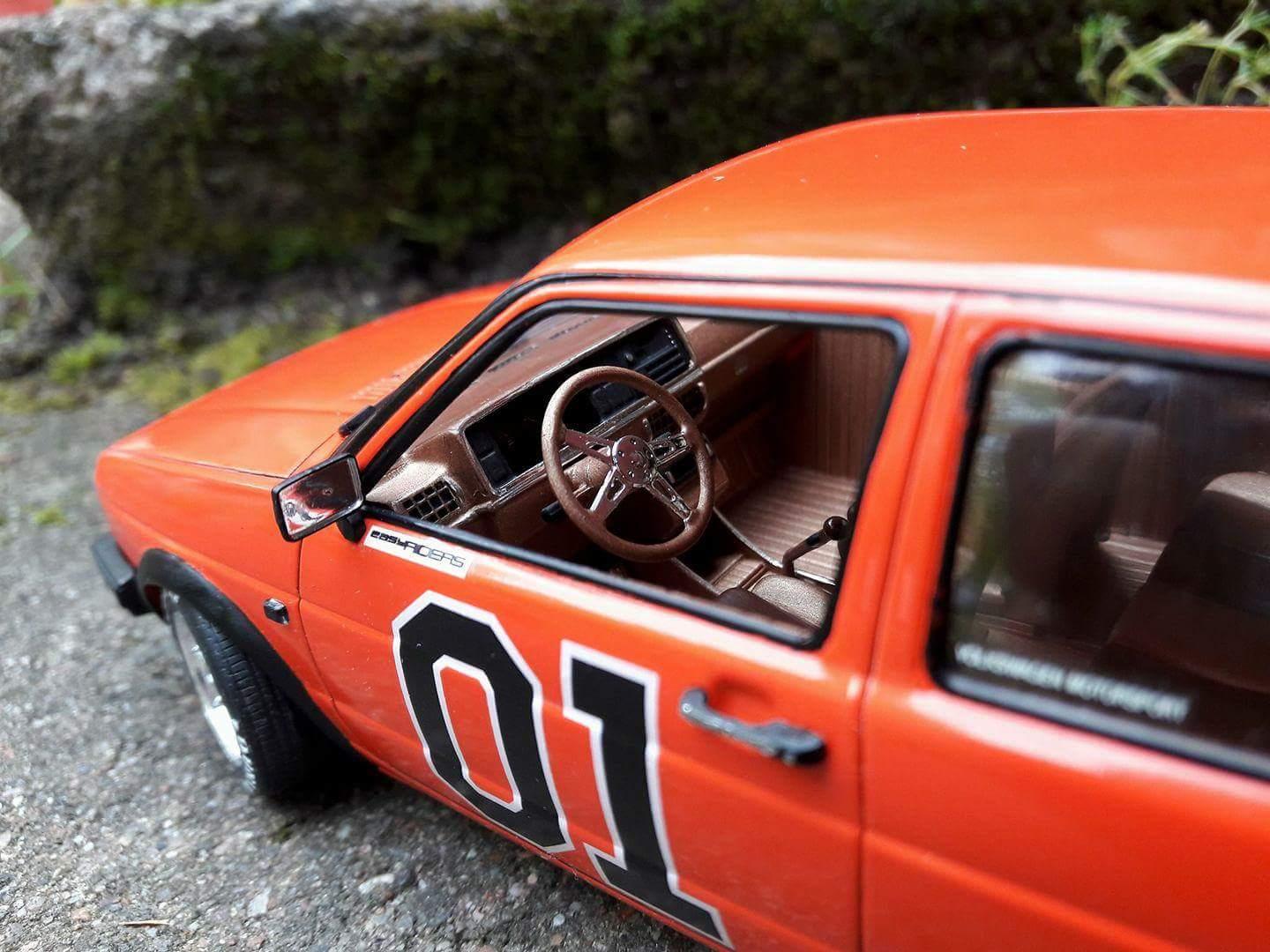 So this is 1988 VW Golf. It's called VW Golf here in Europe and VW Rabbit in U.S. if I'm right. Actually this kit represents a chopped 1986 model but I left fixed " went " windows off to make it look like '88 model with older side mirrors and grille. Fujimi has done a great job by molding a chopped Mk2 Golf body so it wasn't possible to build this this one as a stock version. Using tamiya bright orange spray led to other things in decal placement.