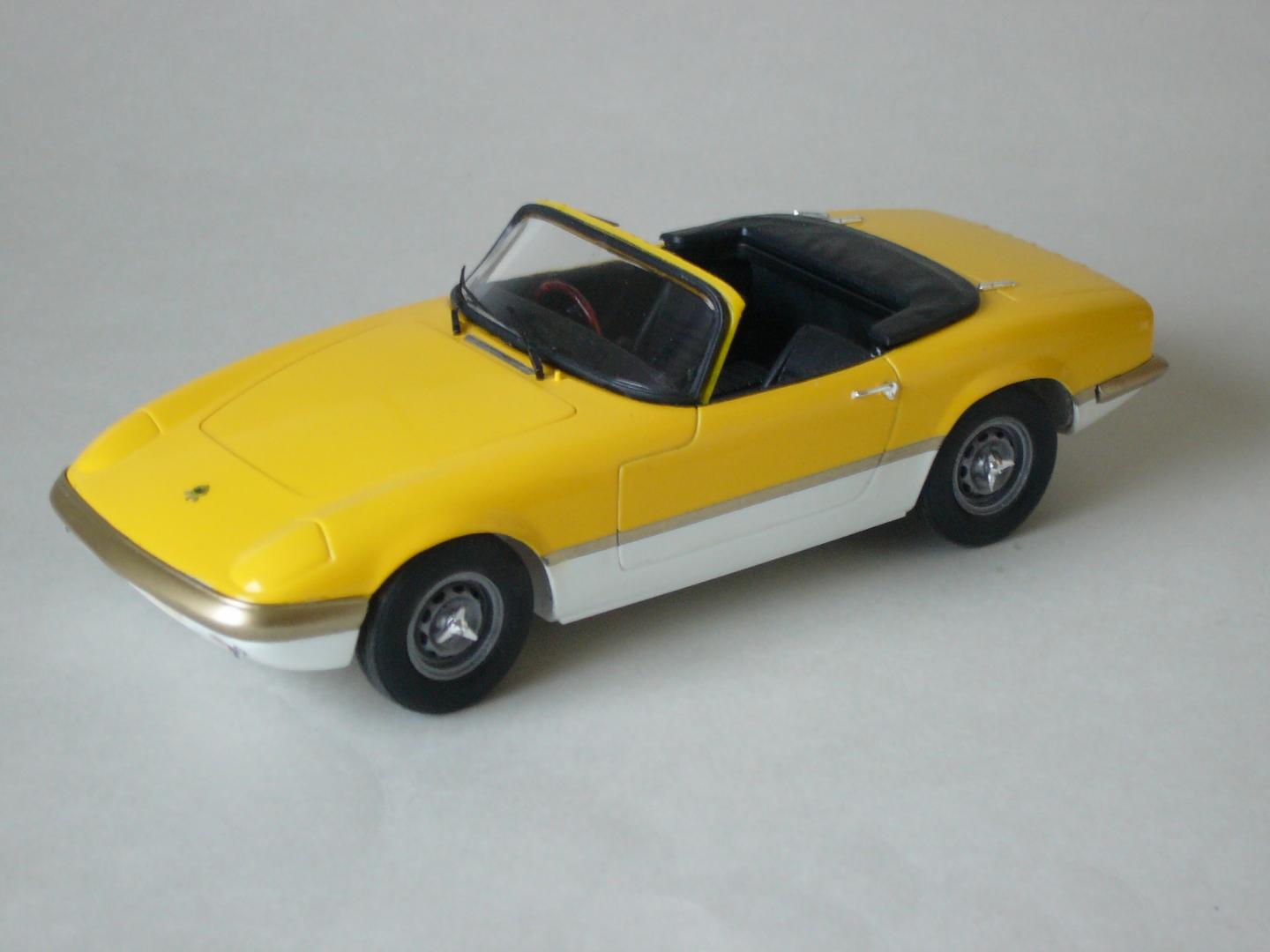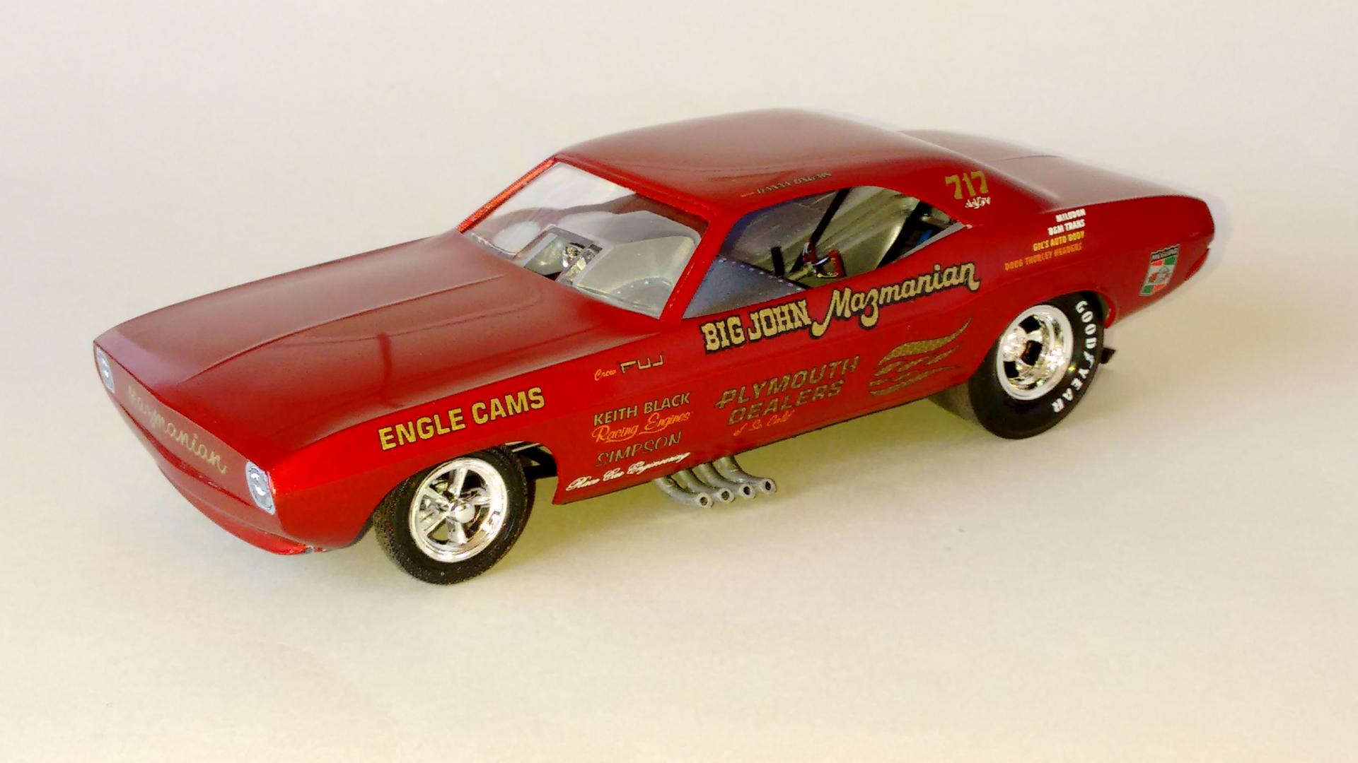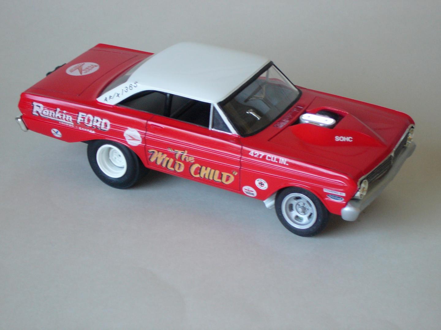 AMT Sunbeam Tiger built box stock except for narrowed front wheels. I used the kit's lowered rear axle, but had to scratchbuild the mounts to fit the rear shocks as only stock length shocks were included. I also added new sidetrim made from plastic strip. Paint is Tamiya Italian Red over a pink basecoat.