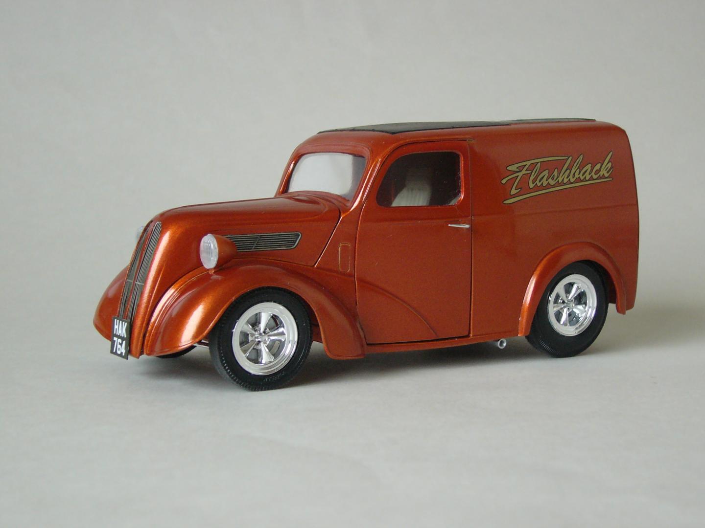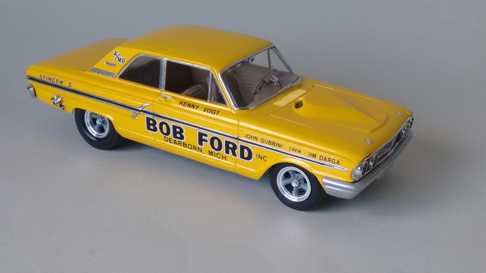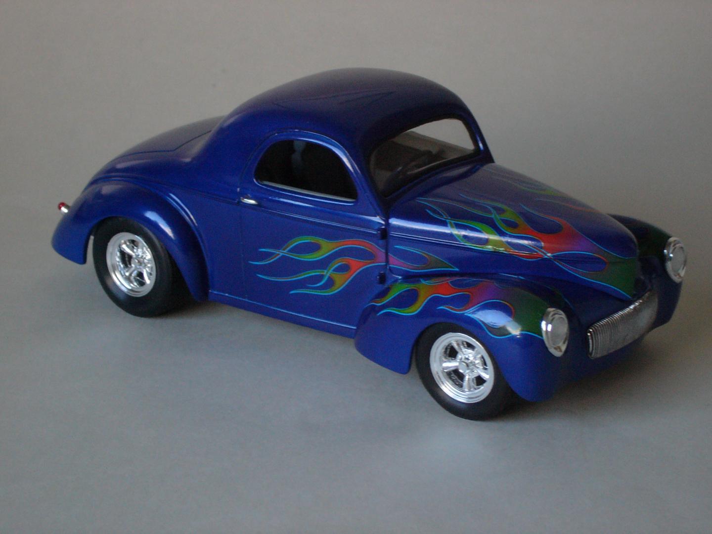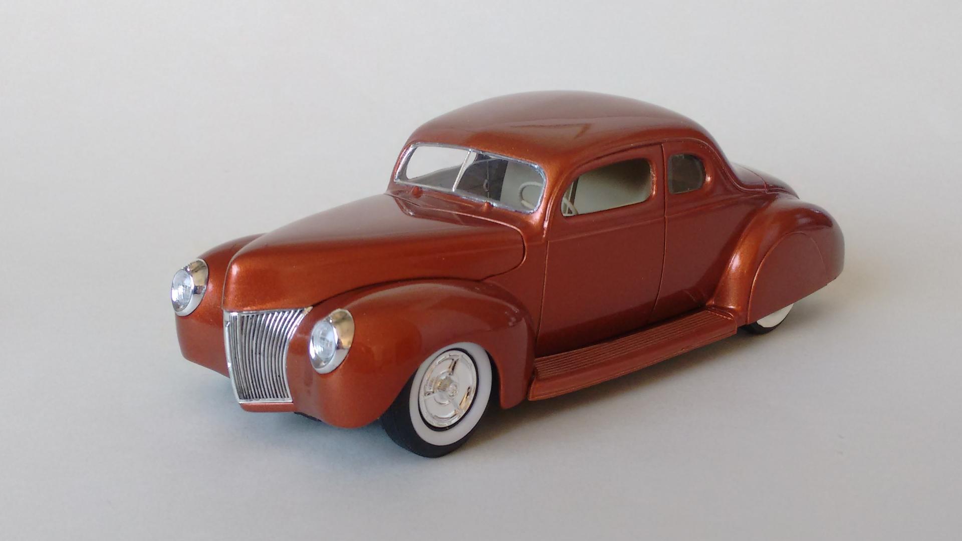 AMT Sunbeam Tiger built box stock except for narrowed front wheels. I used the kit's lowered rear axle, but had to scratchbuild the mounts to fit the rear shocks as only stock length shocks were included. I also added new sidetrim made from plastic strip. Paint is Tamiya Italian Red over a pink basecoat.