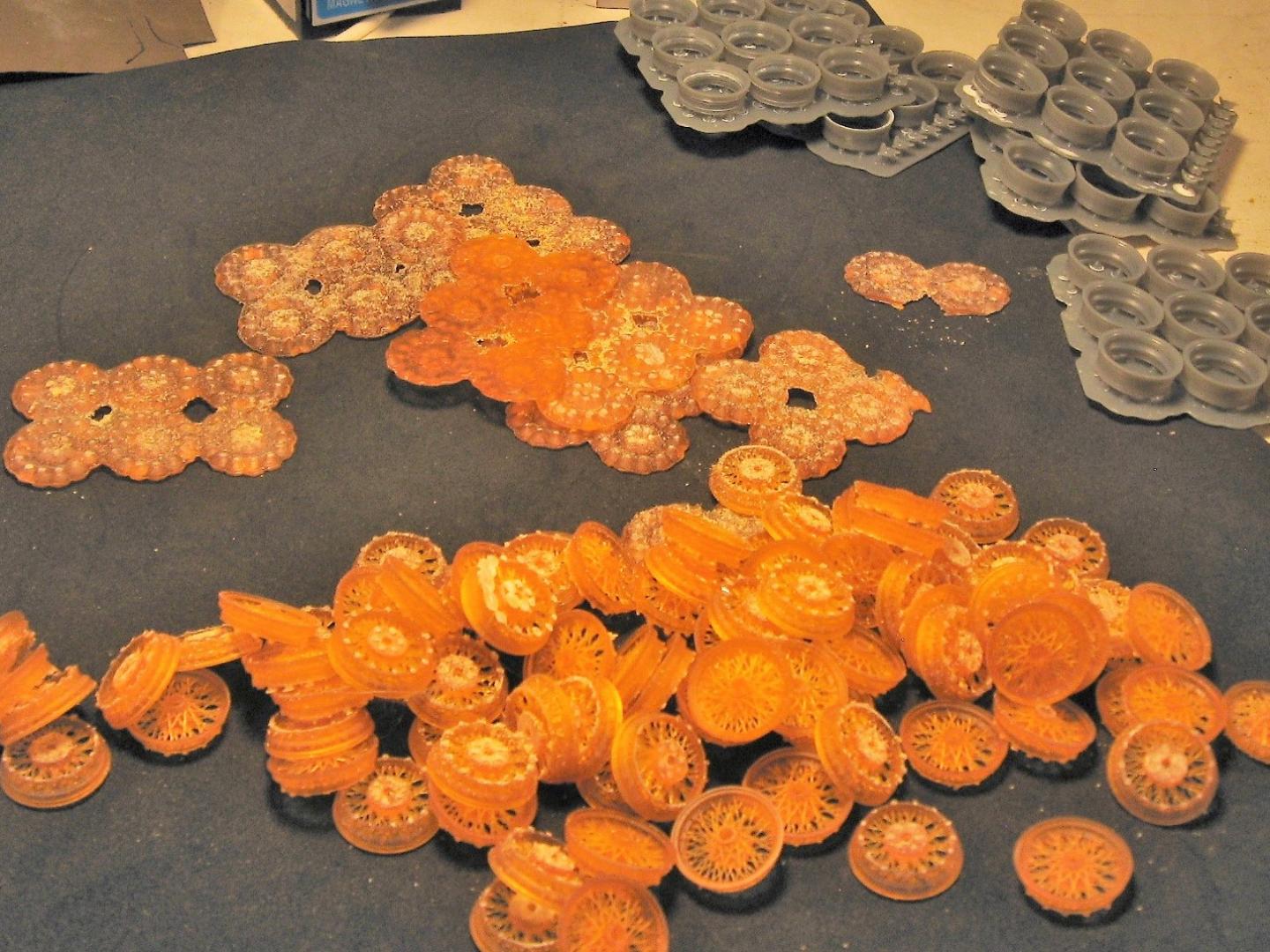 Casey, Apologies for not seeing your questions earlier. Those smooth grey rims were printed with a Wanhao Duplicator 7. 20 micron layers using 3DSR's ' ENG Tough ' resin. The D7 is actually the lowest cost machine of all our printers but works great for some parts. The following is an attempt to show what the 'finish' looks like on the Borrani wire wheels. I will start with the two machines used. The Wanhao D7 printed the larger backs and the knockoffs. For the fine detail needed on the front portion of the rims we used the Titan DLP printer using the orange resin.