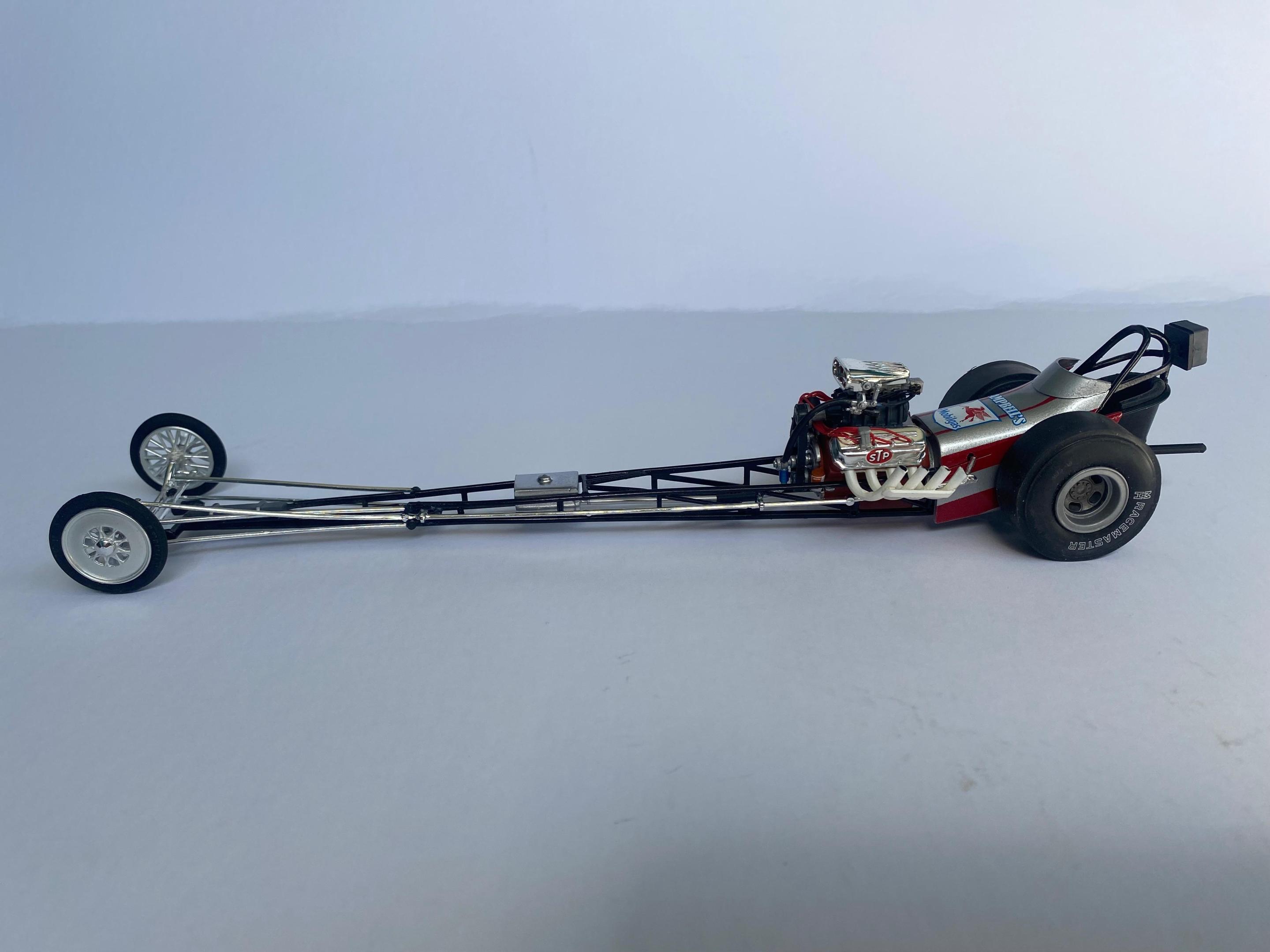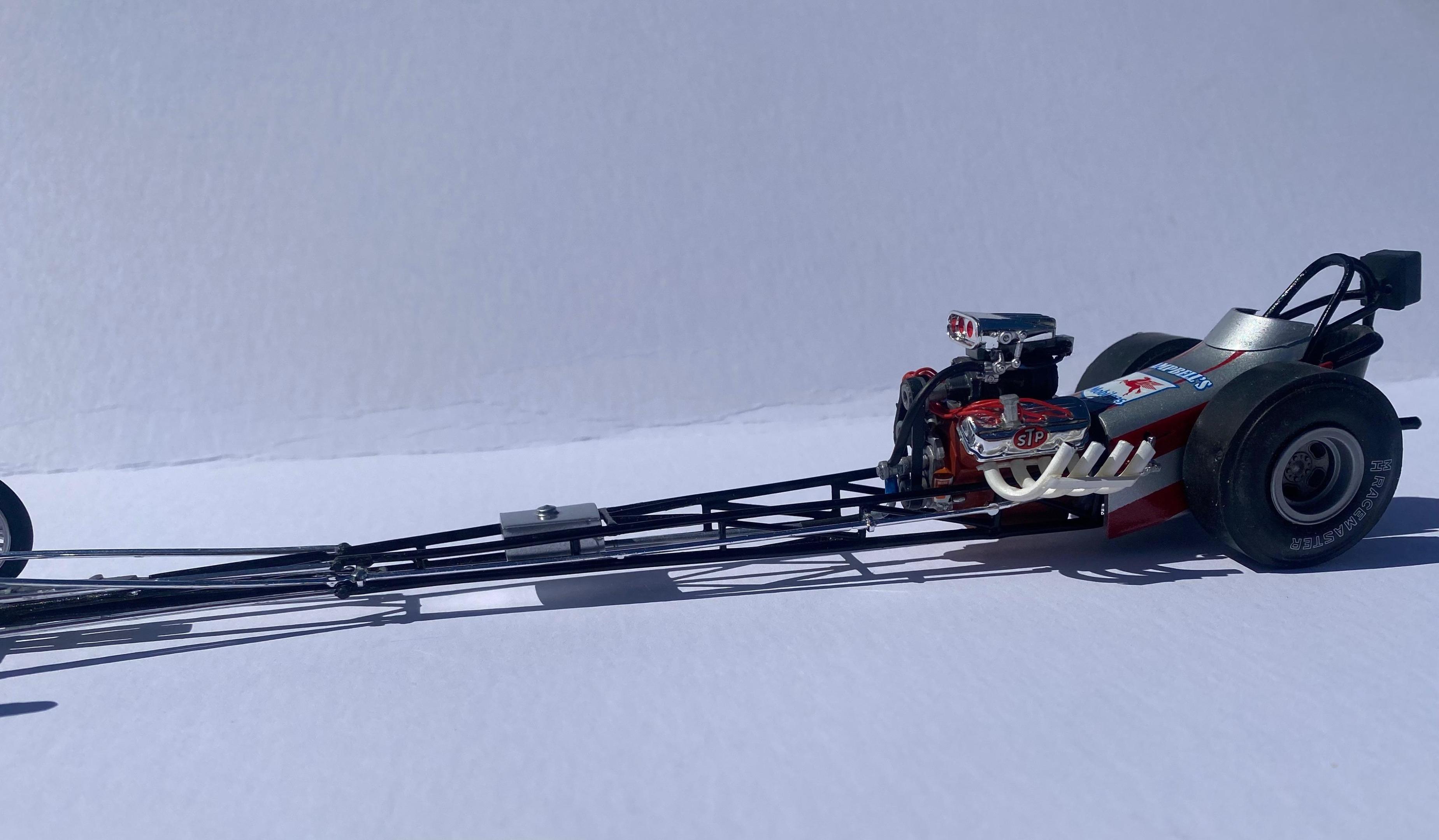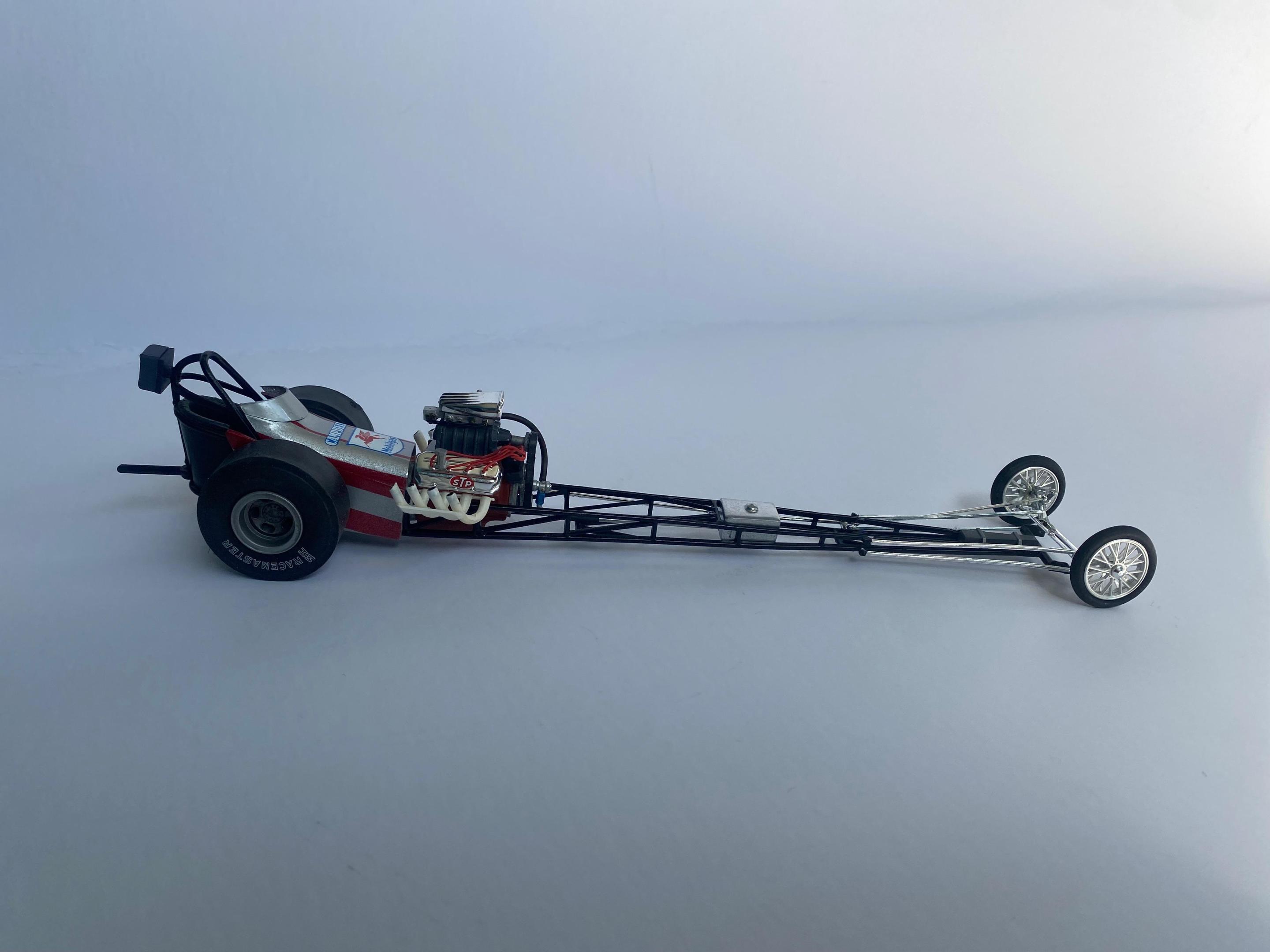 This another one of those projects that I started a loooong time ago that I was determined to finish. Not a big name car but a reminder of the good old days when you could get a few guys together and actually build a competitive race car. One guy with money, another with a gas station to work on the car, and a little guy brave enough to drive the thing! It was built with left over parts from MPC Don Garlits and Young American kits.