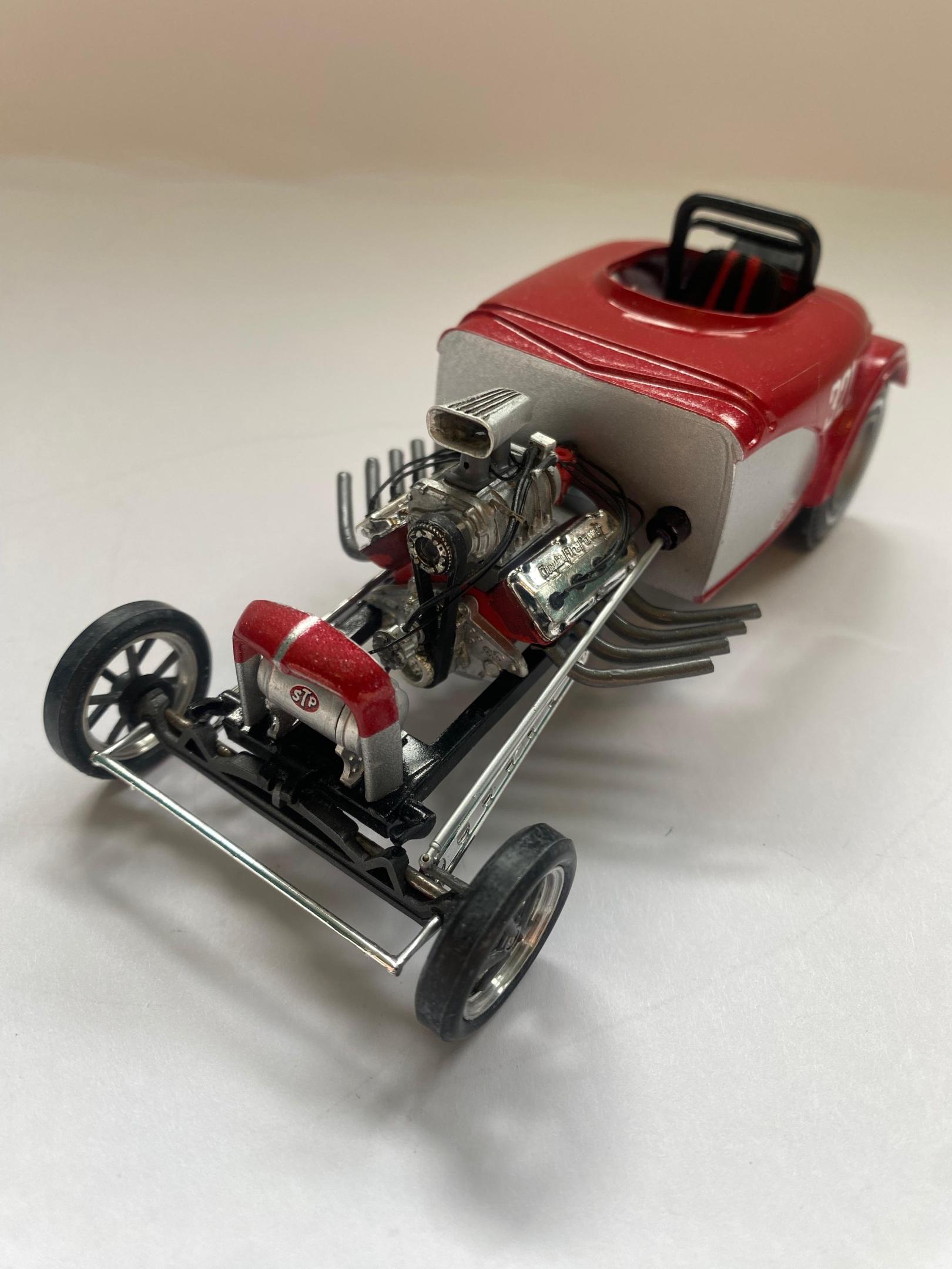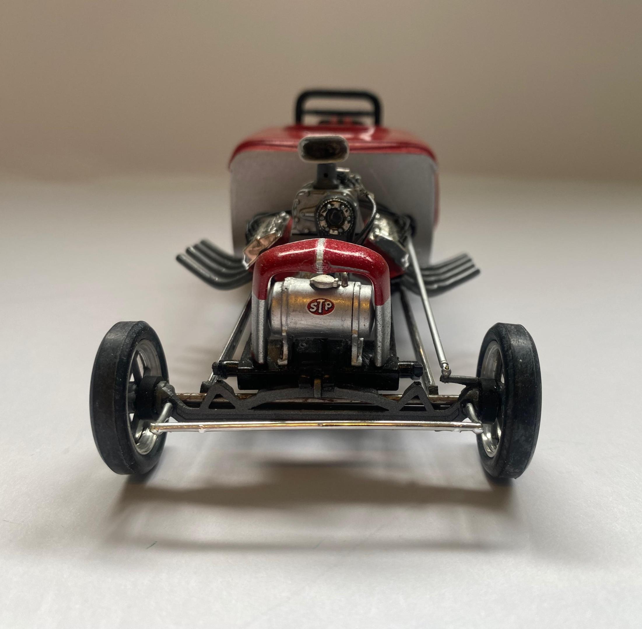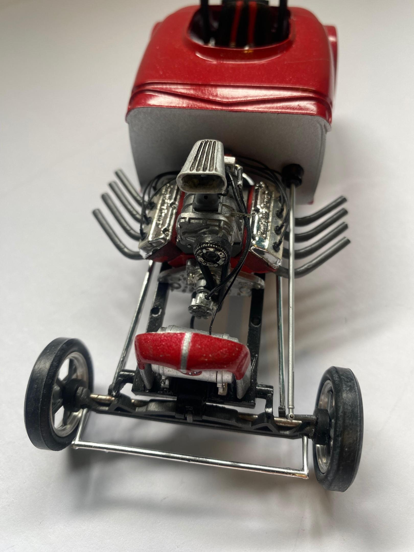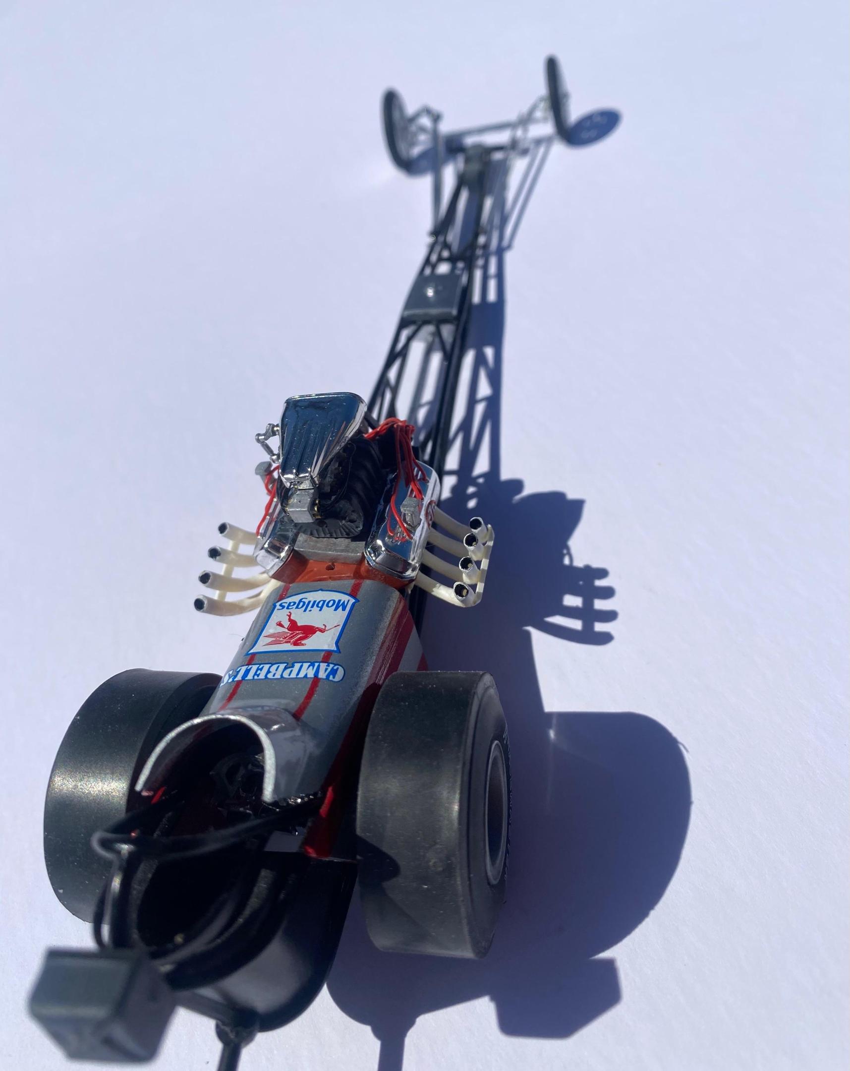 This another one of those projects that I started a loooong time ago that I was determined to finish. Not a big name car but a reminder of the good old days when you could get a few guys together and actually build a competitive race car. One guy with money, another with a gas station to work on the car, and a little guy brave enough to drive the thing! It was built with left over parts from MPC Don Garlits and Young American kits.