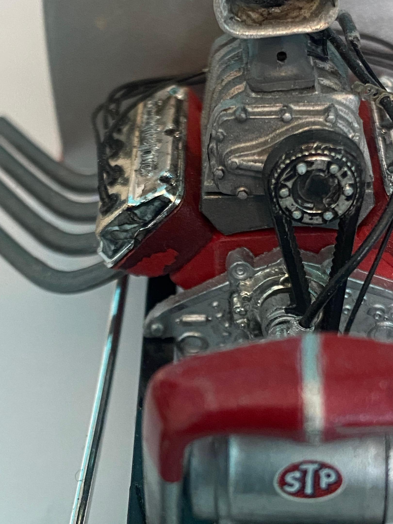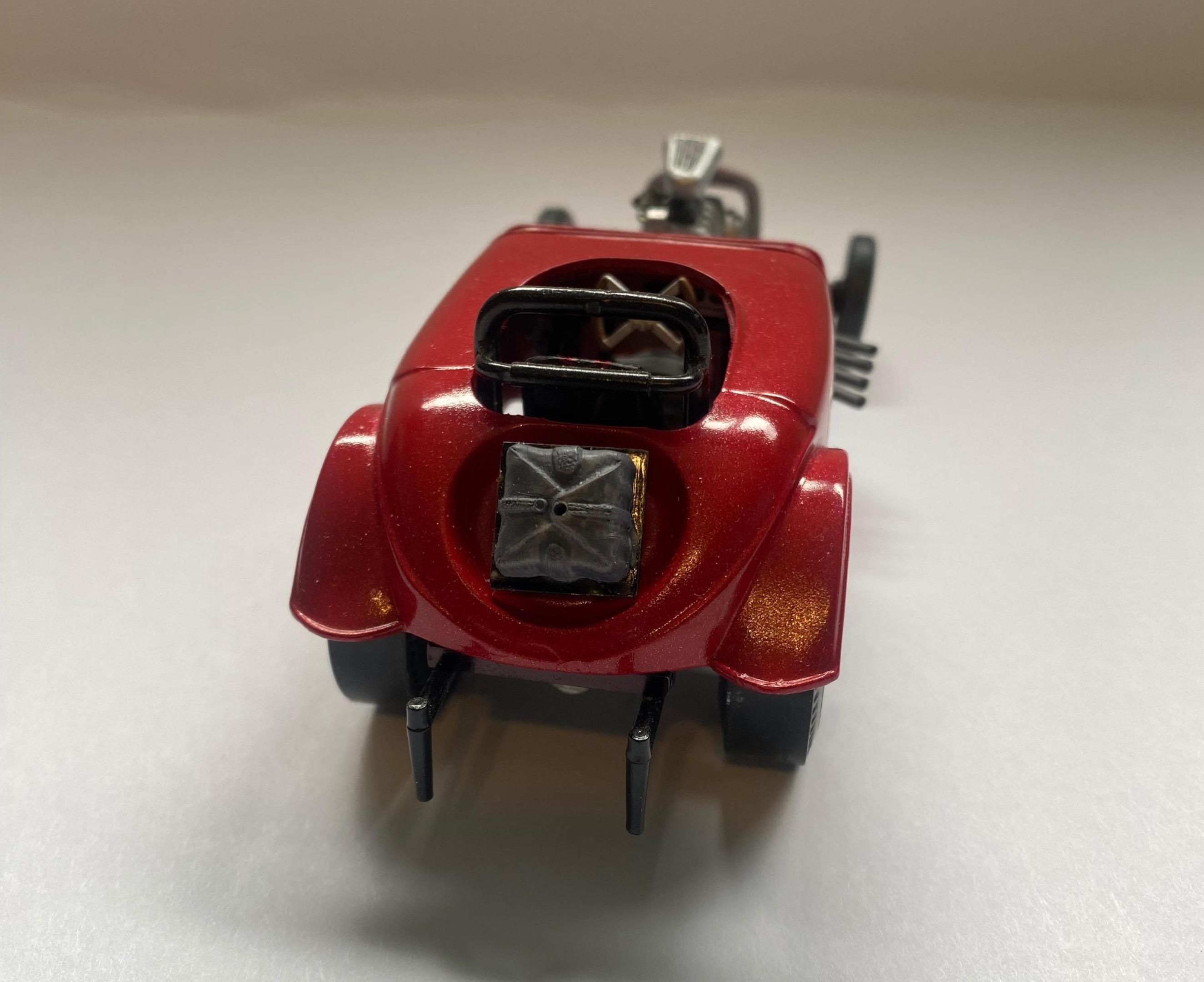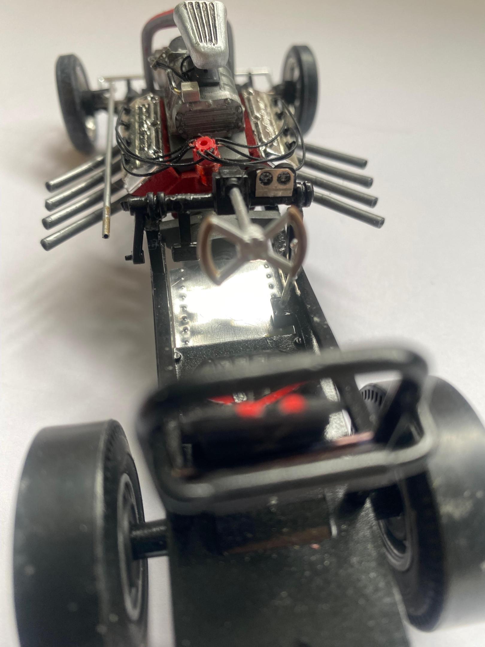 Another orphan that I found in the bowels of my storage trailer. It was mostly complete but needed some TLC and repair to finish it. I may install a parachute cable and it could use a sponsor decal. Mostly left over parts from a AMT Double Dragster kit ( one of my favorites!) I had some fun making the floor pan from sheet aluminum and using a pounce wheel to add rivet detail. I bought some HO scale stanchions a while back. They make perfect rod ends for the steering linkage. This was one of the most relaxing and fun builds in a long time!
