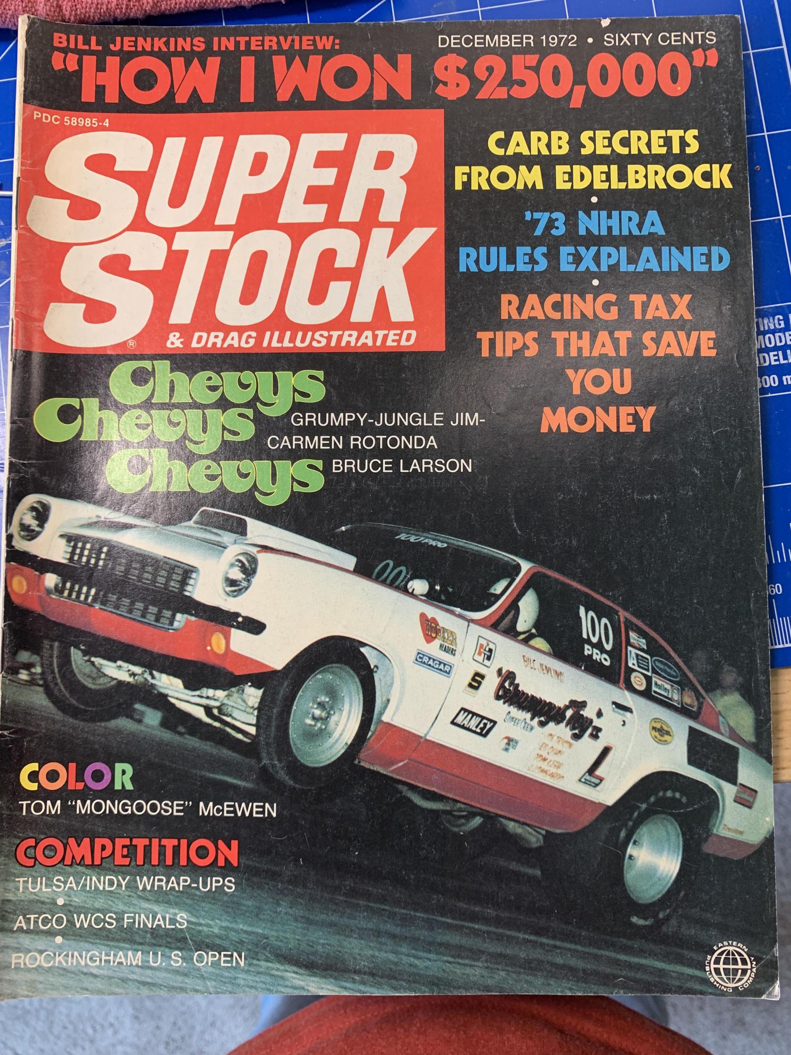 So as your all probably aware I recently moved back to Georgia, I’m still unpacking and while unpacking a box of old magazines I started fanning through some and I came across this article from the December 1972 issue of Super Stock. It answers most of the questions I had on this build and I have some things just plan wrong. At this point I’m just going forward with what I’ve started. Interesting enough is this has to be one of the first four link rear suspension setups. They don’t even call it a four link, it’s referred to as Adjustable Trailing Link Bars. Since I was not happy with the white paint on the chassis I now know the real car chassis was black. It also states the front retained the torsion bars. I did have the rack and pinion steering correct though.