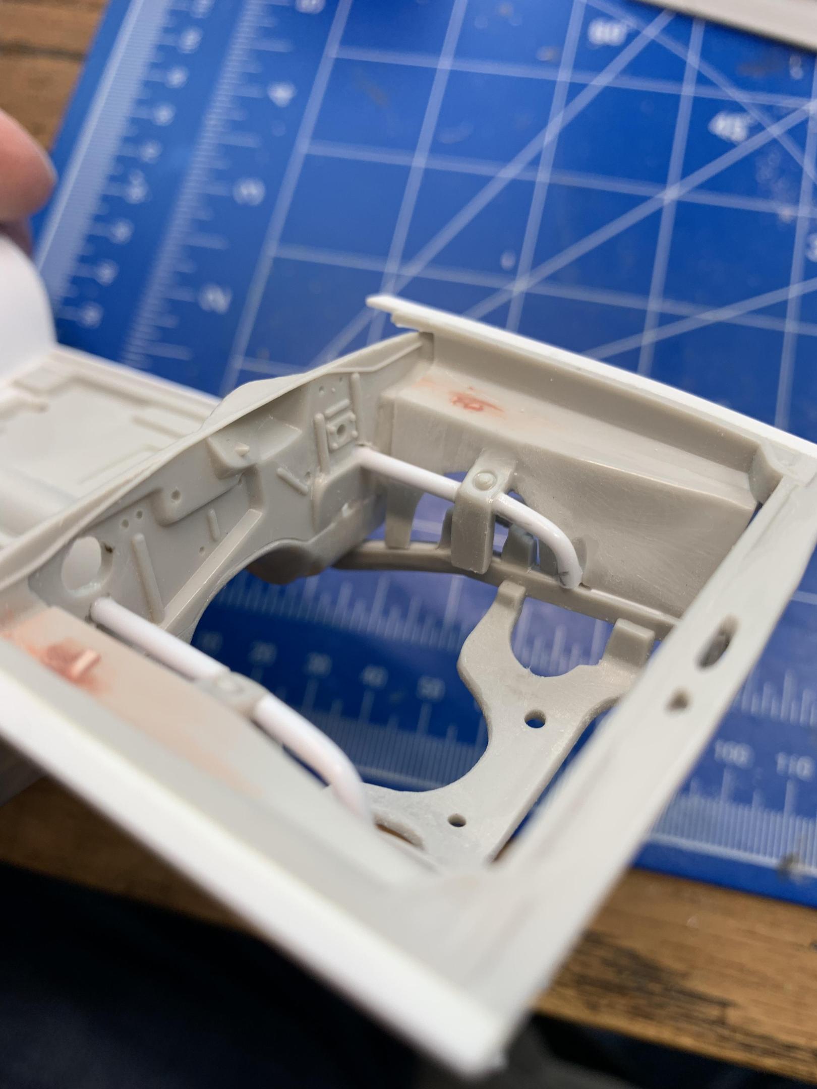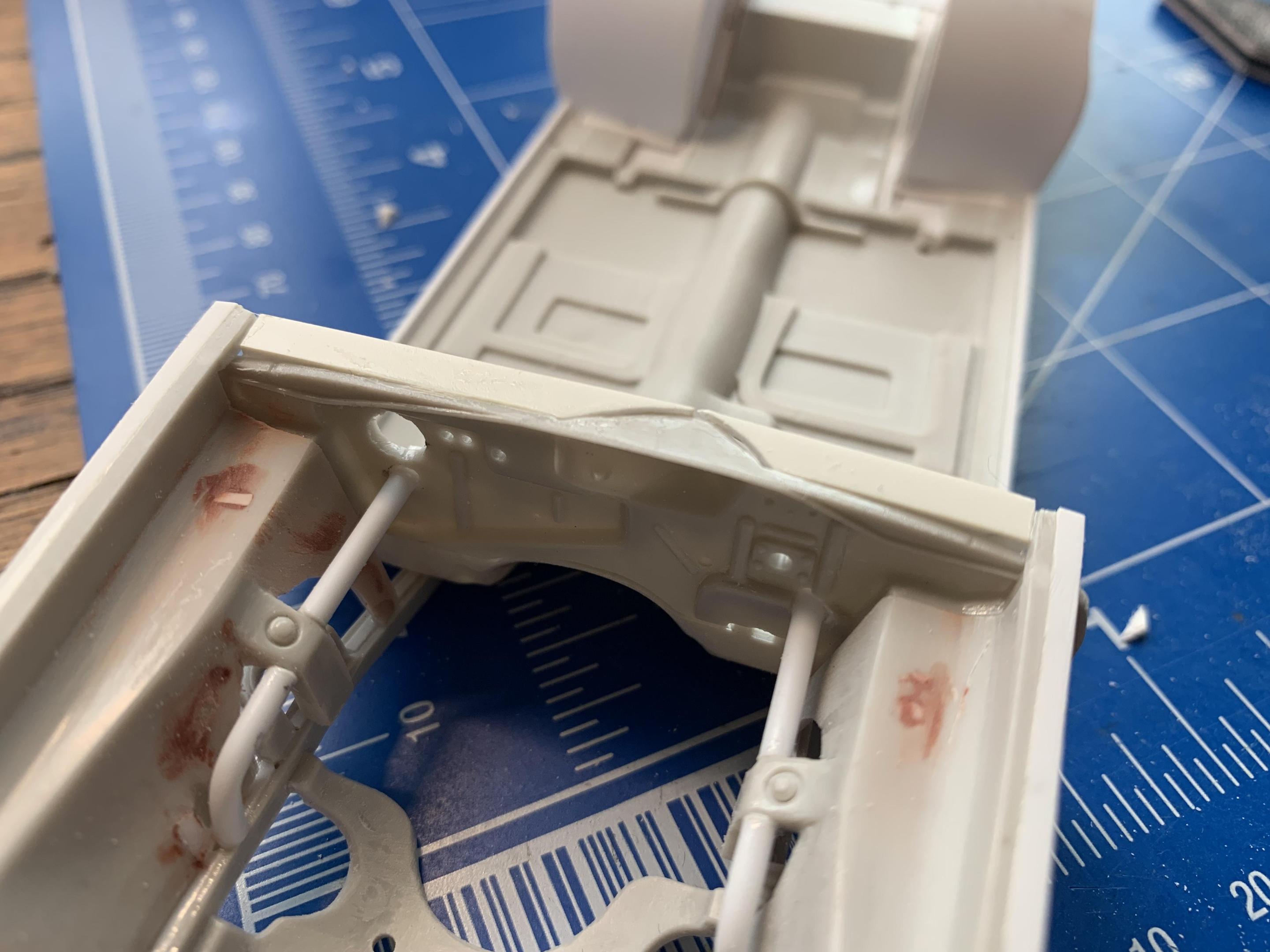 17. I finally got some bench time and was able to get the engine compartment together. Lots of cutting and trimming, I tried to replicate what was common in 1972, the rule book states stock front suspension, but torsion bars were swapped out for coil over shocks with the upper shock mount braced by the front roll cage supports. I’m going to use the coil over shocks from the Johan Hornet funny car. I need to trim the K member for the dry sump oil system.