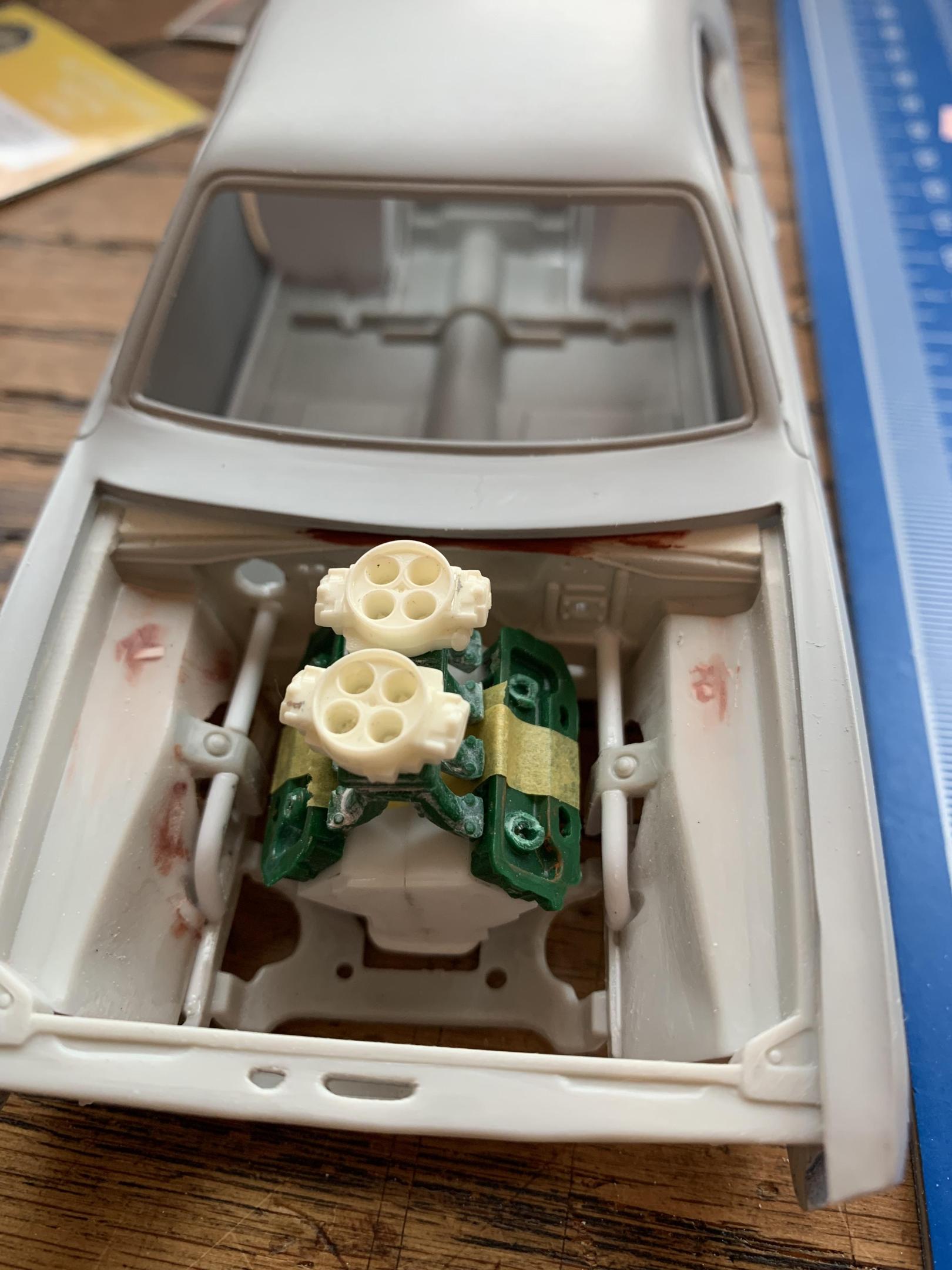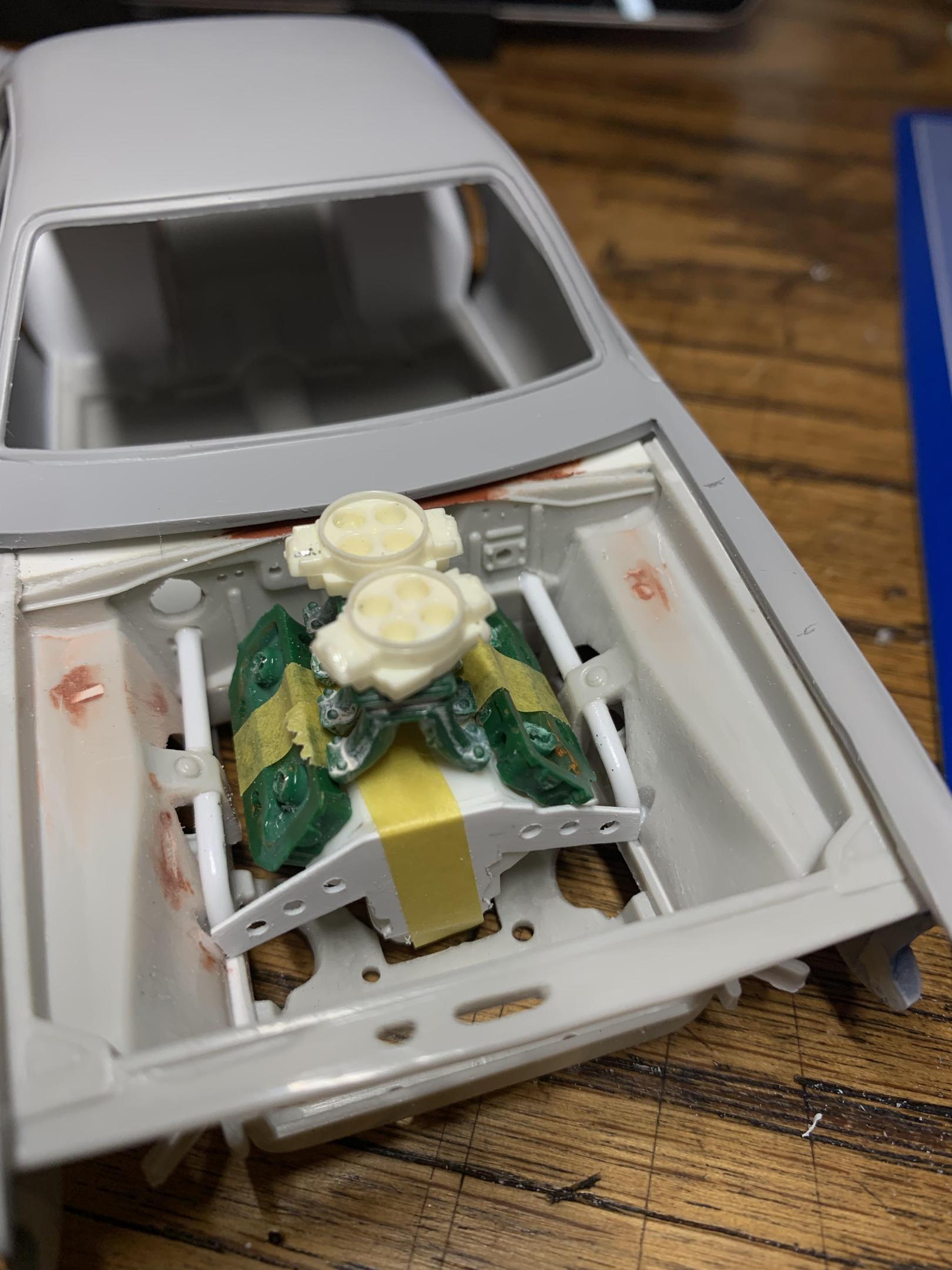 2. Made some progress today, I added strip styrene to the firewall to fill the gap at the cowl. I notched the K member for the dry sump oil system. I was going to use the Hemi from the Dart Sport kit, but it really lacked detail, I then found an old Johan Sox & Martin Hemi, but there was a hole in the block for the front axle that I started to fill. Then I came across the optional Hemi from the AMT 70 Coronet kit, and decided to combine it with the S&M heads and intake. I then fabricated the front engine plate, Elephant Ears as they were called at times.
