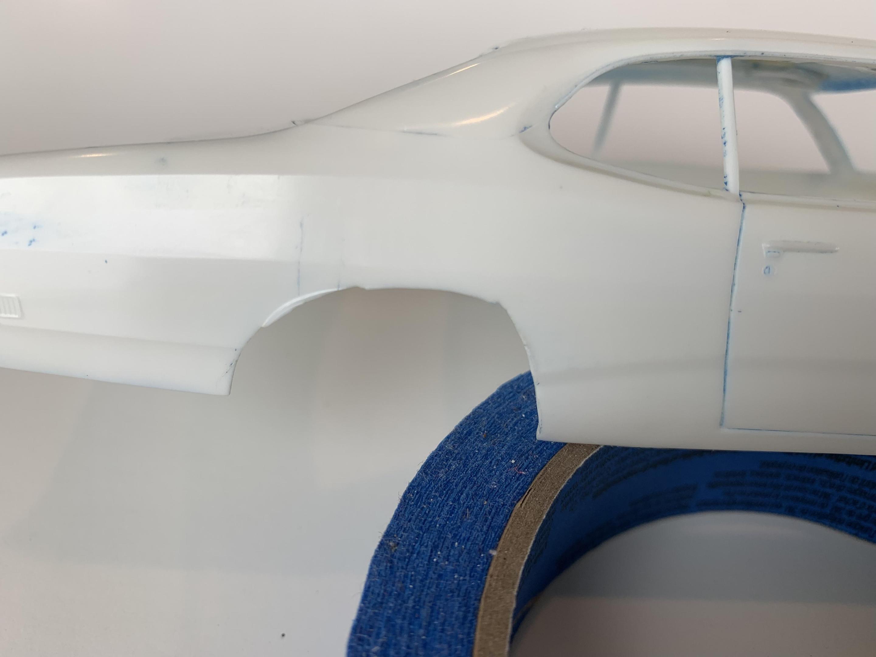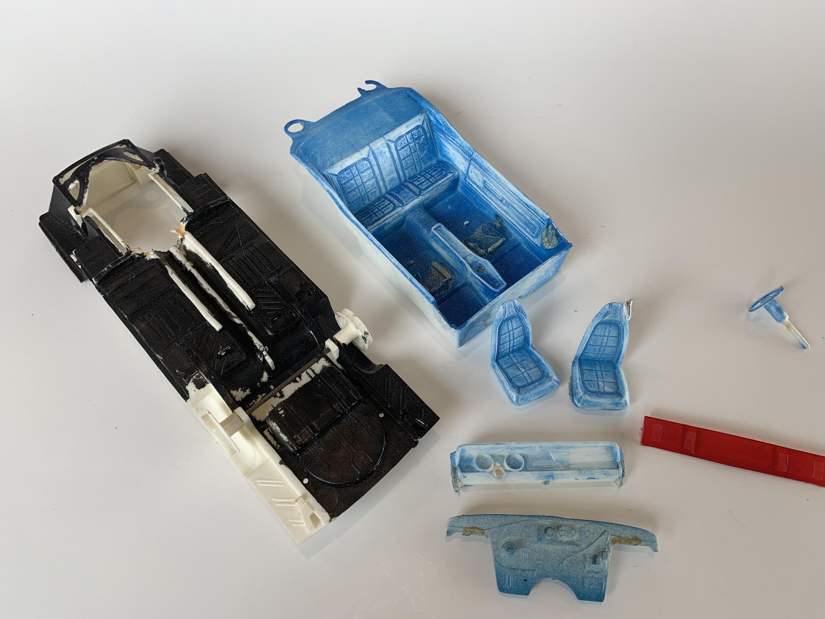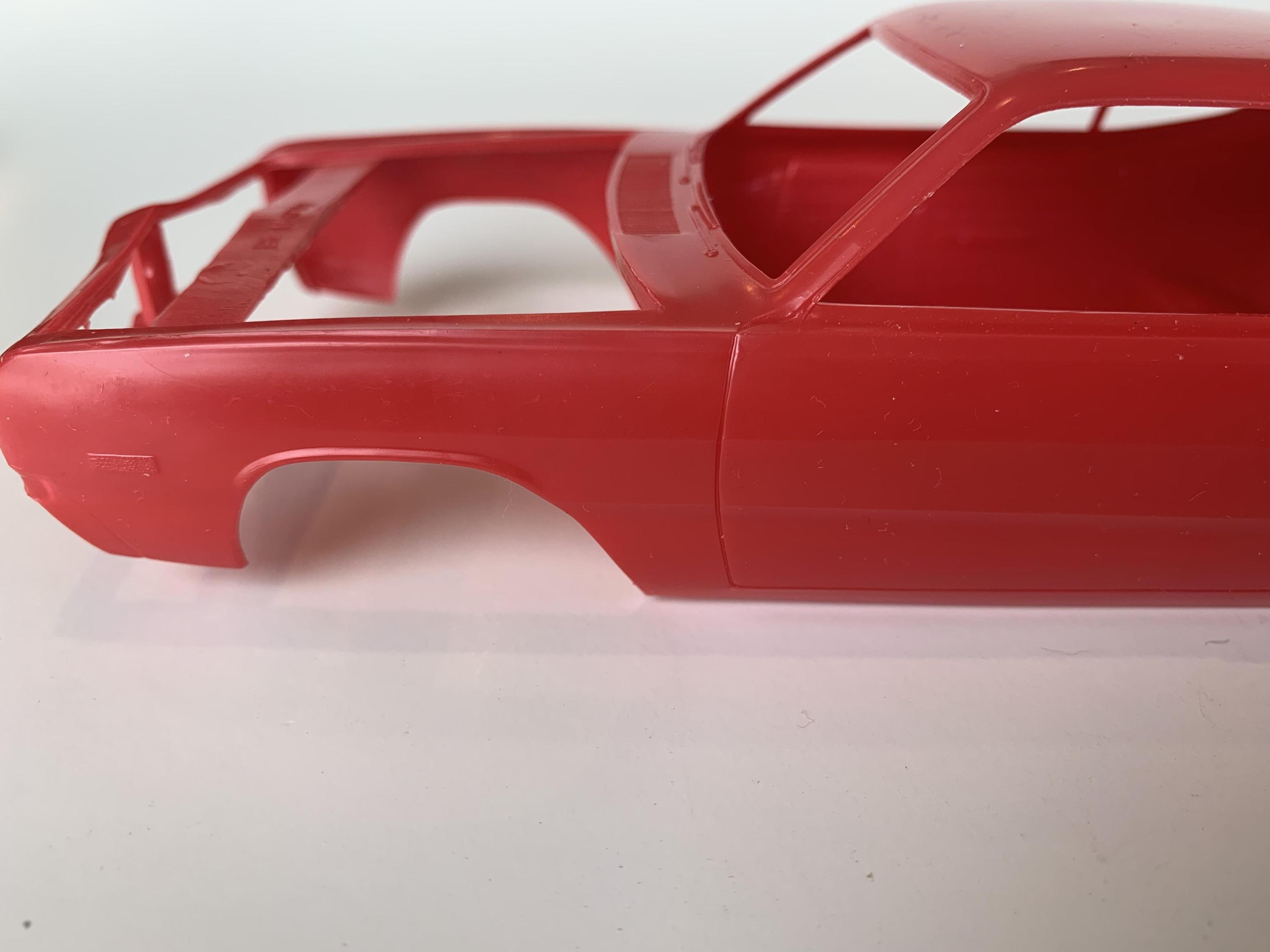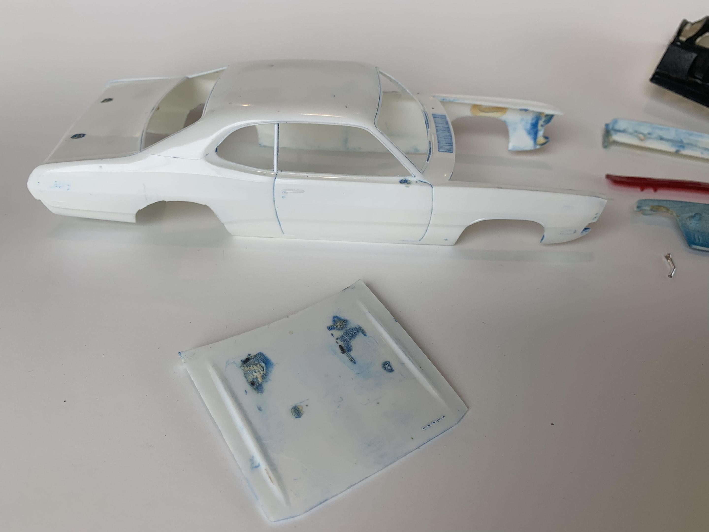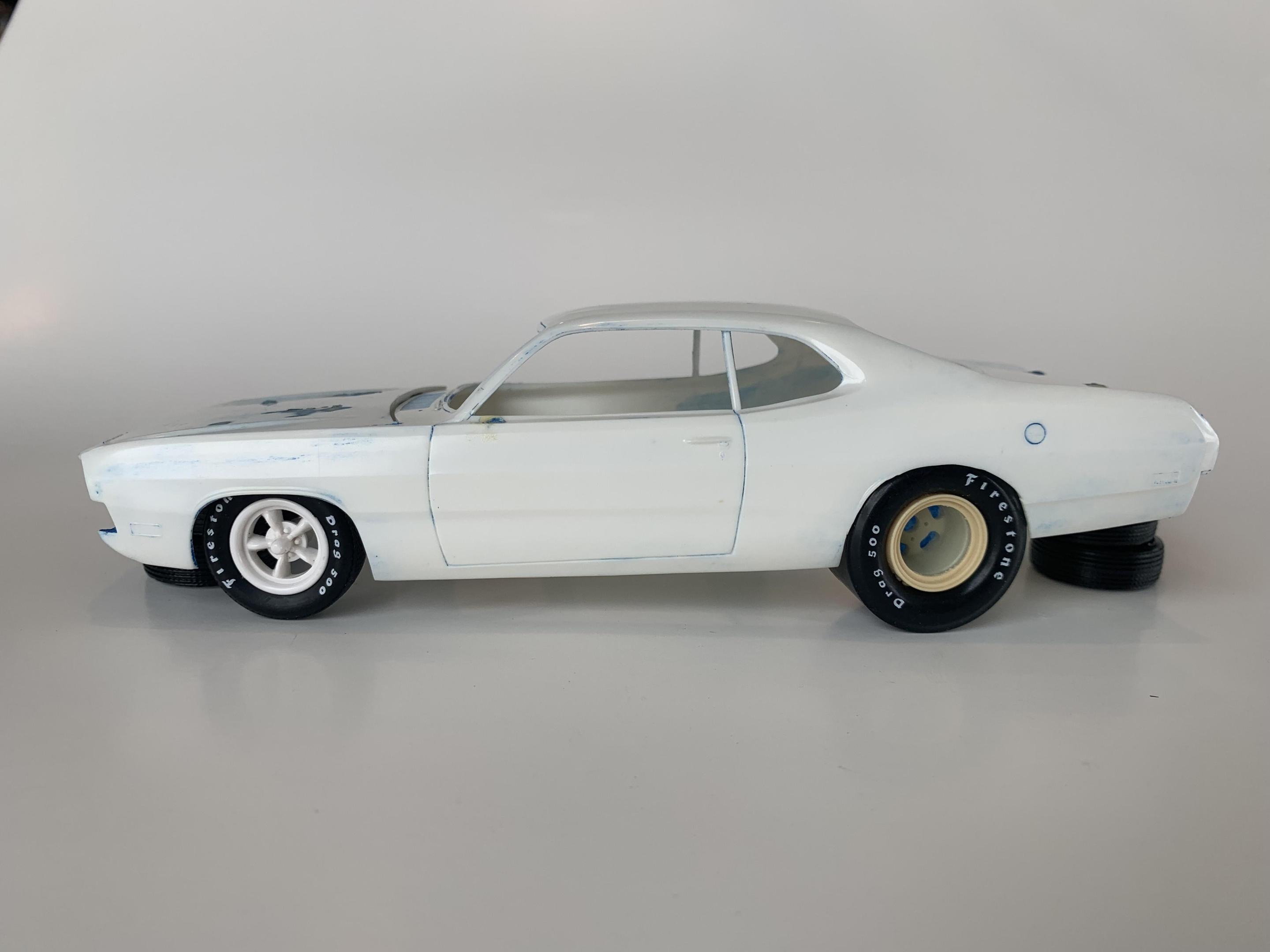 2. Back in February of 2006 I purchased a built up MPC 71 Dodge Demon. They were super rare, hard to come buy and I sure couldn’t afford to pay for an unbuilt kit. It was painted blue and had the rear wheel openings hogged out. I paid $51.00 for it. My intention was to build the Rod Shop Pro Stock using the Fred Cady decals. Needless to say with work and family it’s never been started. Fast-forward to today and the reissued MPC Demon should hit the shelves any day now. Some time ago Slixx Decals printed the Billy the Kid Demon Pro Stock decals, and my intention for this build changed. Now that the reissue is coming I’ll probably buy a couple and maybe one day do the Rod Shop Demon also. Not one to waist plastic I decided to do my built up, correcting the flaws, glue spots, repairing the rear wheel openings and reshaping the front. Now the disclaimer, this will in no way be close to what Francis is doing to his Demon else where on the forum. I’m no where in his league of builder. I hope to produce a reasonable replica of Bill’s Race Car. The body and interior has been stripped of its prior paint. I’m looking to use the AMT Duster for the chassis and I have an MPC Dart Sport kit for the Hemi and rear wheel openings. I’m hoping the reissue will correct some of the original kits issues. Other than the body this is the MPC Duster kit, the interior is incorrect as are the front wheel openings, I think it’s interesting that they corrected the front wheel openings on the Dart Sport / Duster street Machine kit.