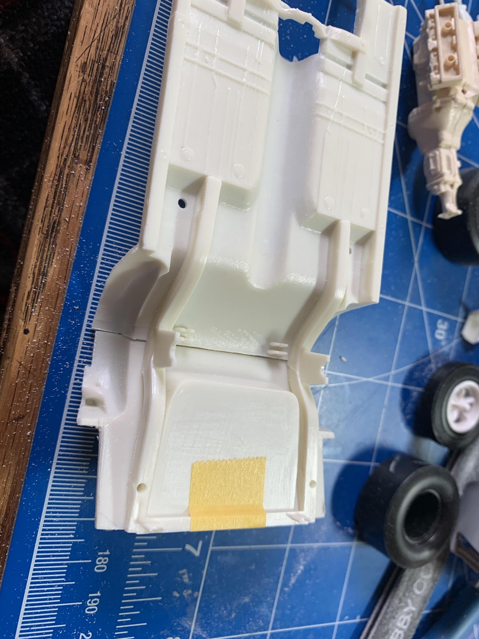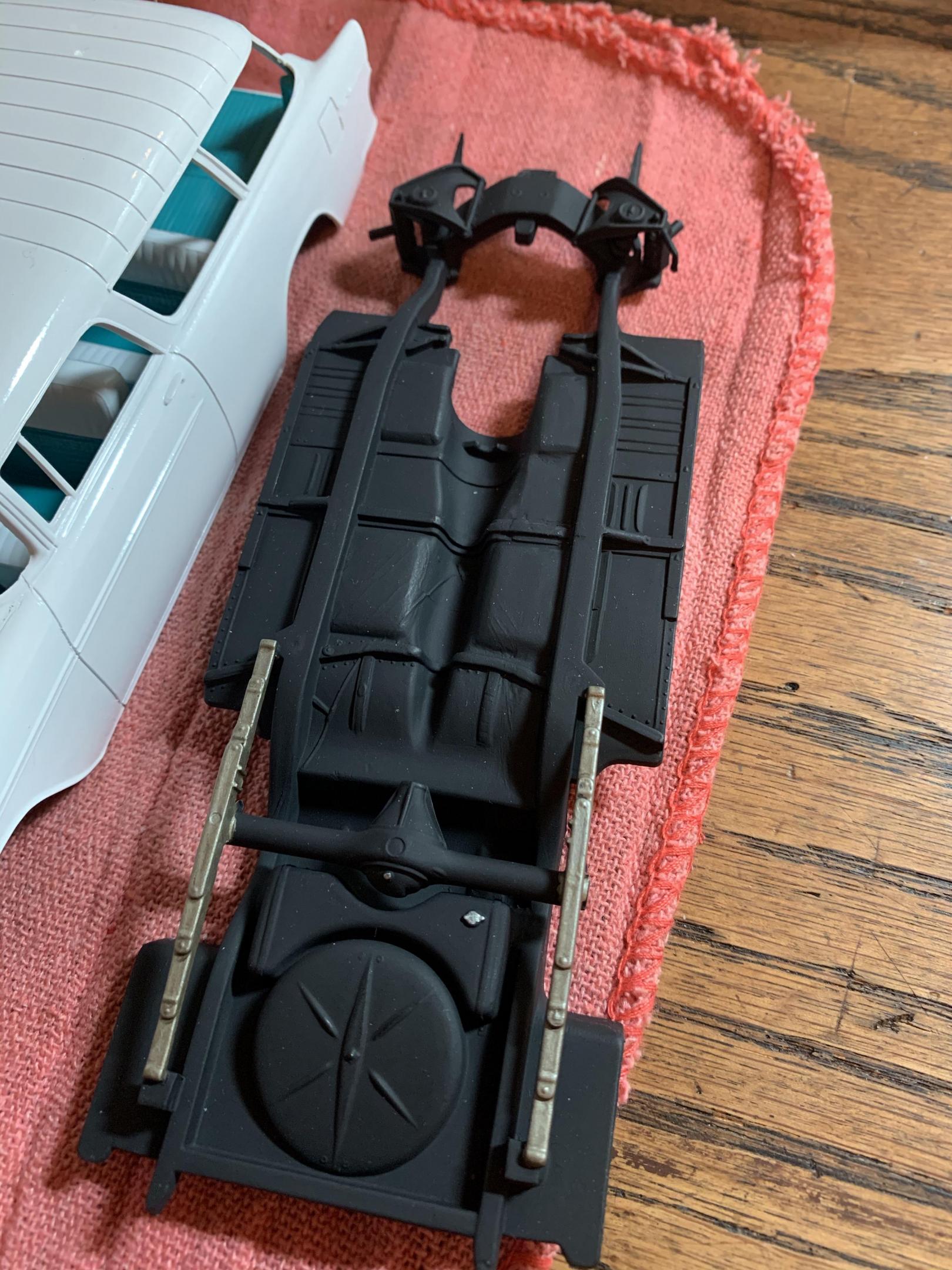 Final detail to the interior, I still need to add the two gages above the radio. I filled the gaps in the front frame rails, and painted the chassis flat black as the original car was.
