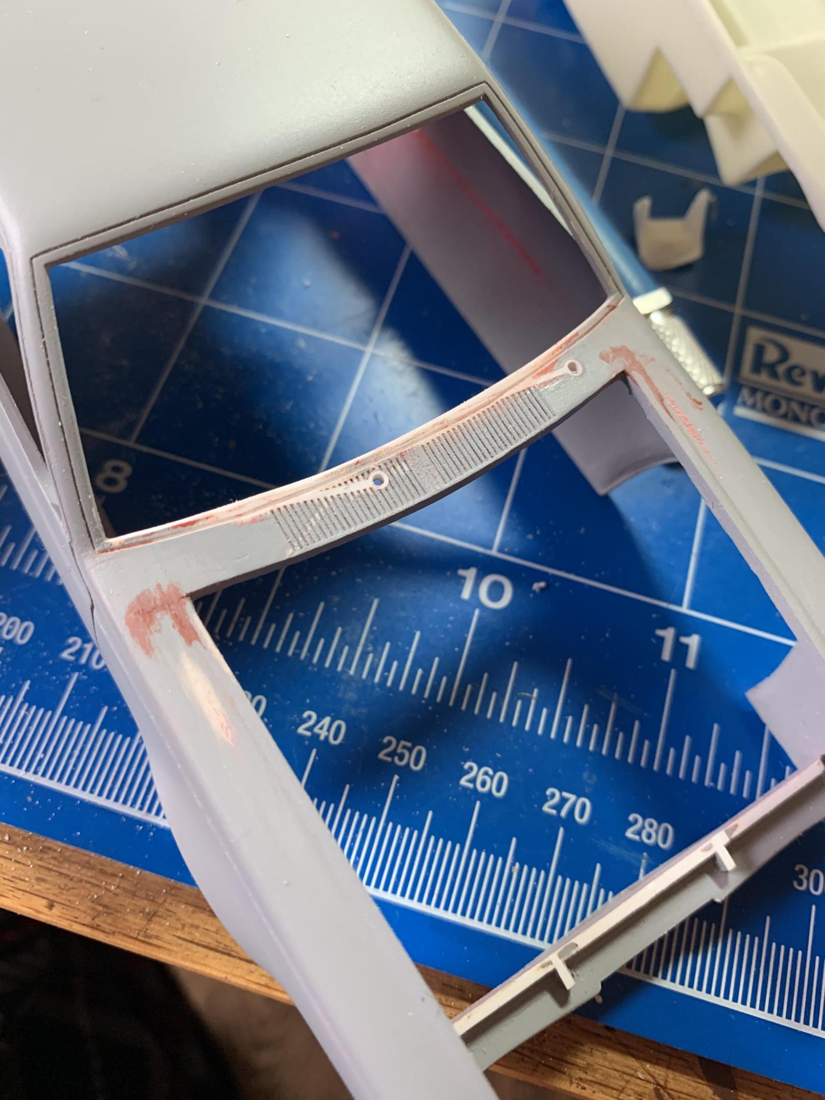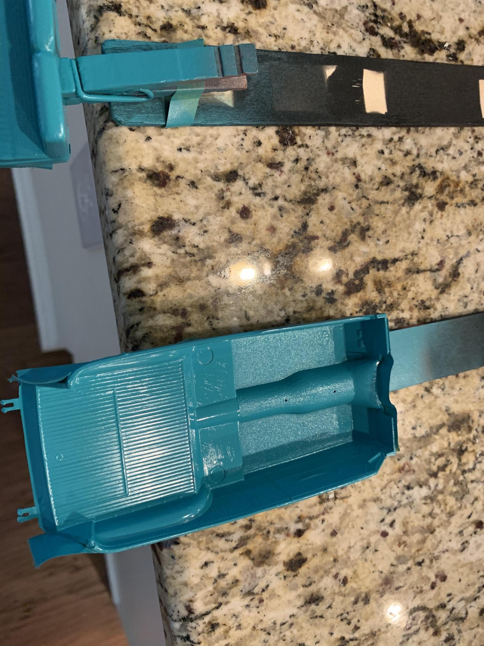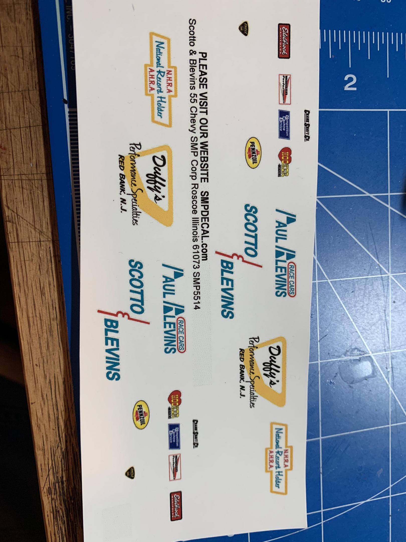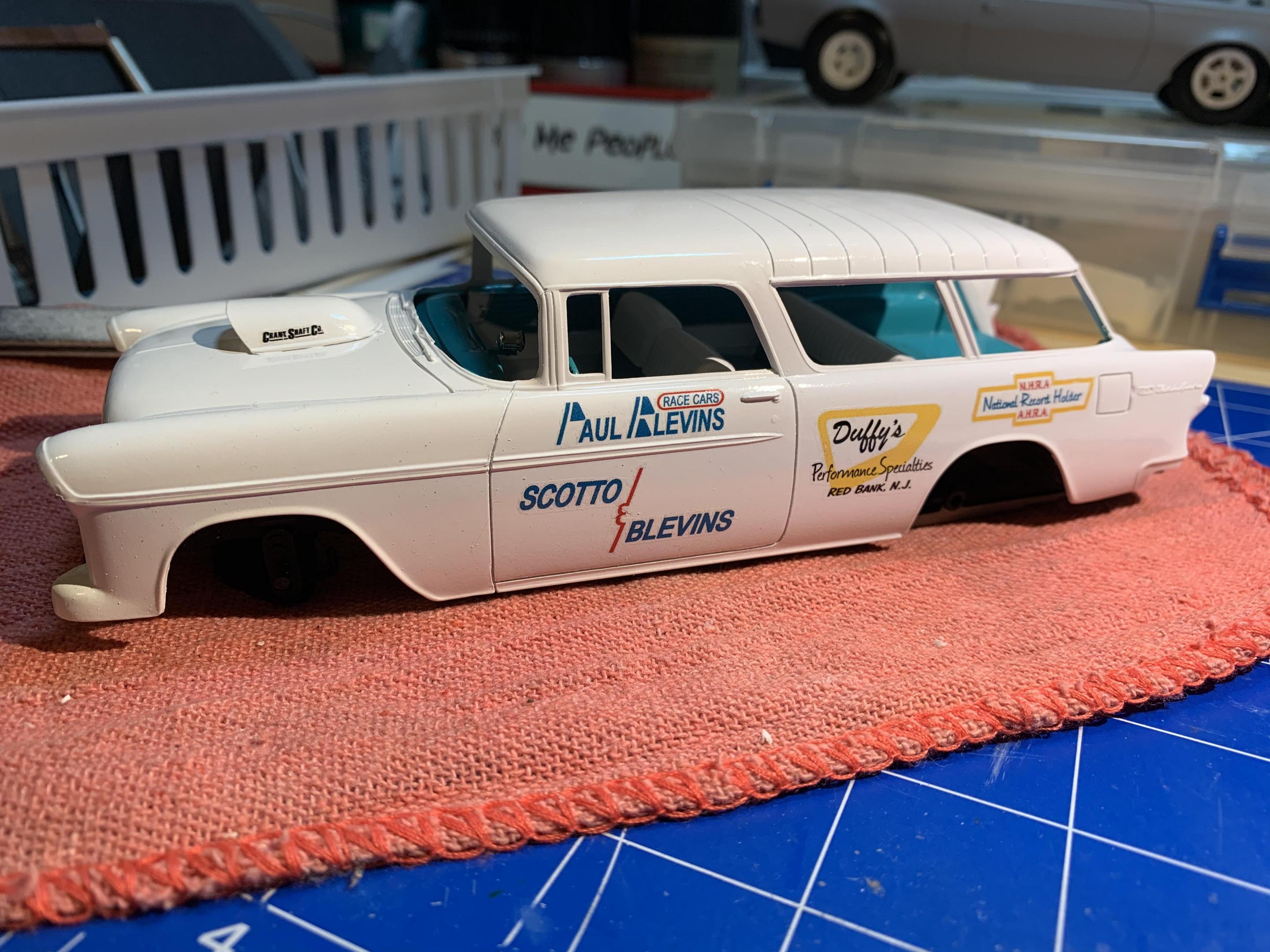 While trying to recover from my bout with Civid-19, with lots of time and limited energy and brain power I decided to do something much simpler than the Shahan’s Hornet. As your becoming aware I like old drag cars, and this one has been on my build list for some time! Years ago I purchased a set of decals off the internet to do both the 55 Nomad and the Corvette of Scotto & Blevins, so I started going through the AMT kit I realized this would be an easier build than I thought. Almost everything I needed is in the box. I robbed the AMT 65 El Camino kit for the Cragar wheels, and the AMT parts pack for slicks. I started doing research on the car and found some great reference photos on the internet. During that internet search I came across another set of decals for this car from SMP Products. They had the 55s decals as well as a set for the Corvette. I ordered a set of each. I was very pleased with the quick service and the quality of the decals. The color and size are so much better than the first set I purchased. Here’s where I am today.I removed the muffler and tailpipe, I deepened the oil pan, and painted the body Testors Classic White Enamel.