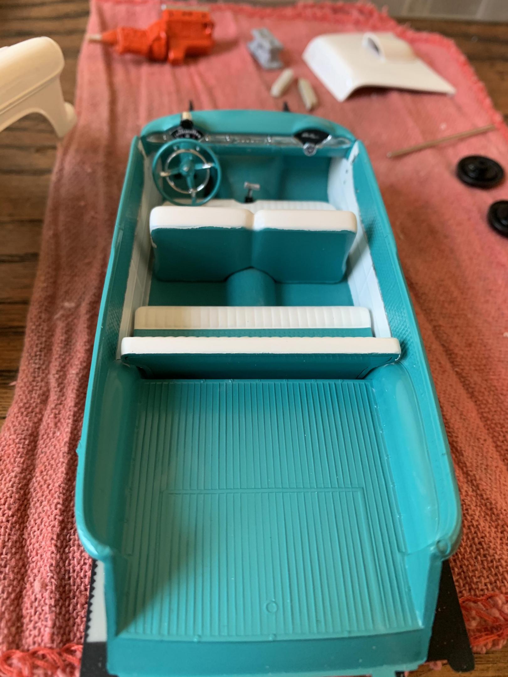My research showed the interior to be pretty stock, the front bench seat notched to clear the Hurst shifter, a turquoise and white Upholstry the tach mounted on the dash above the speedometer.