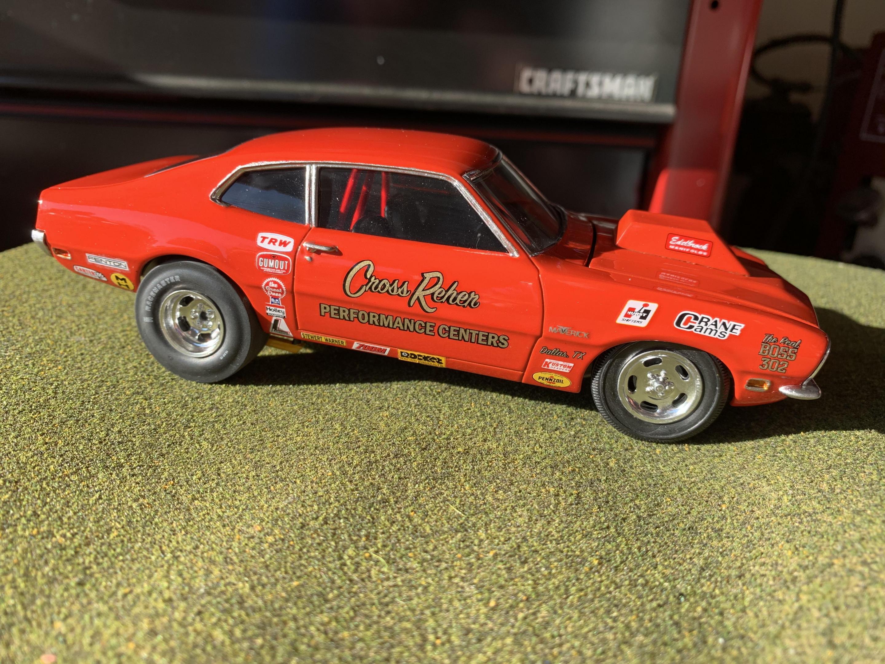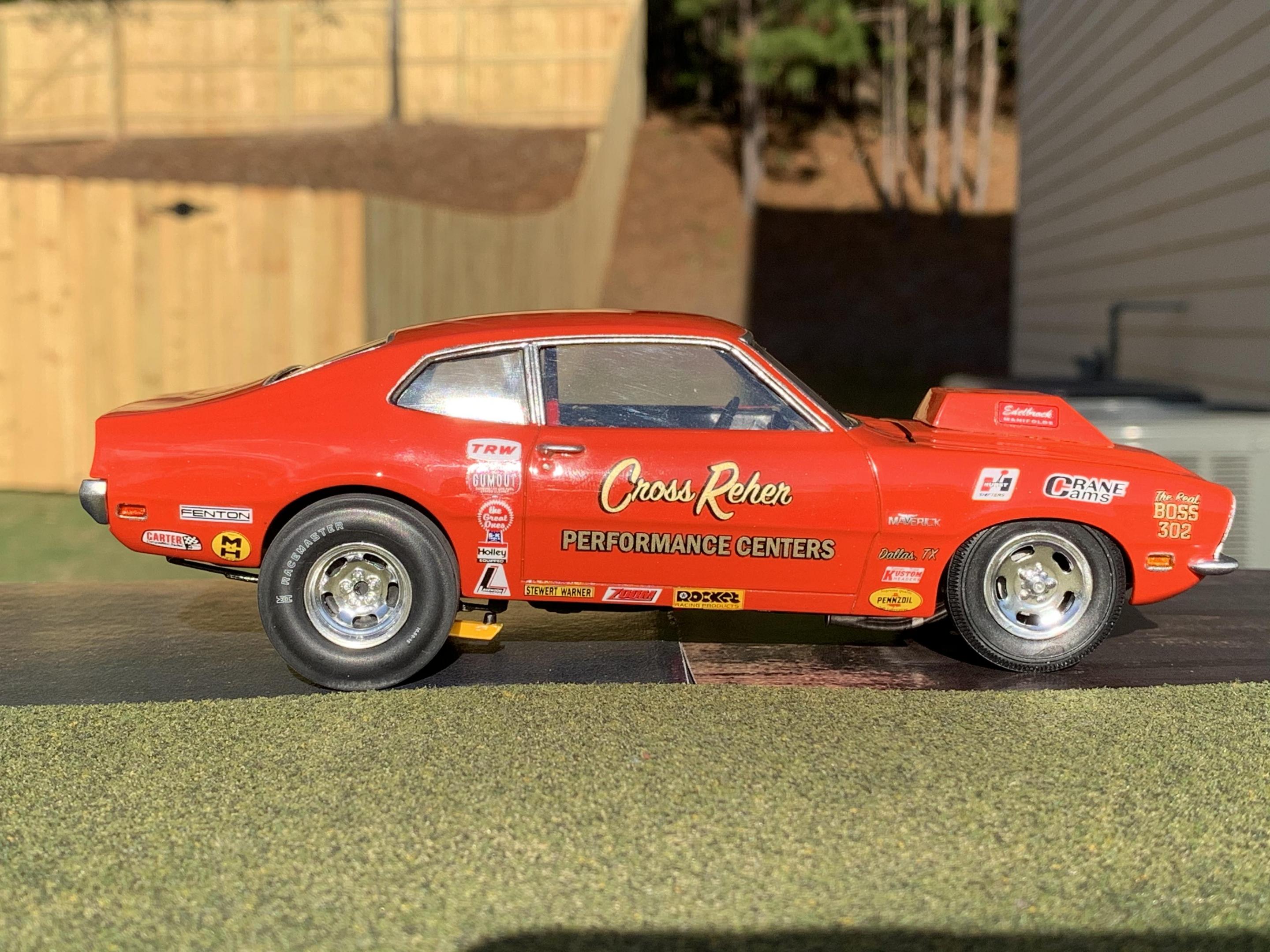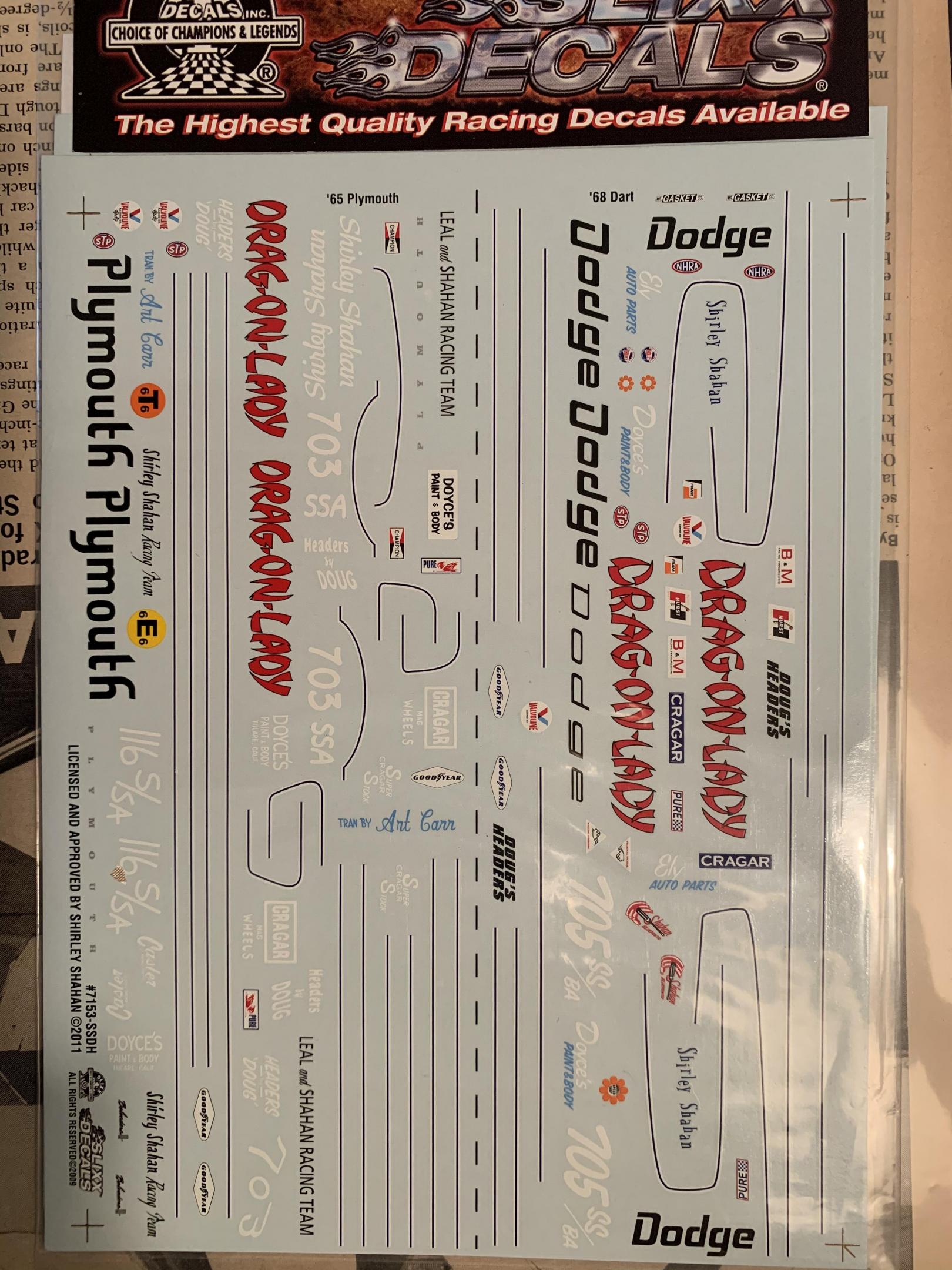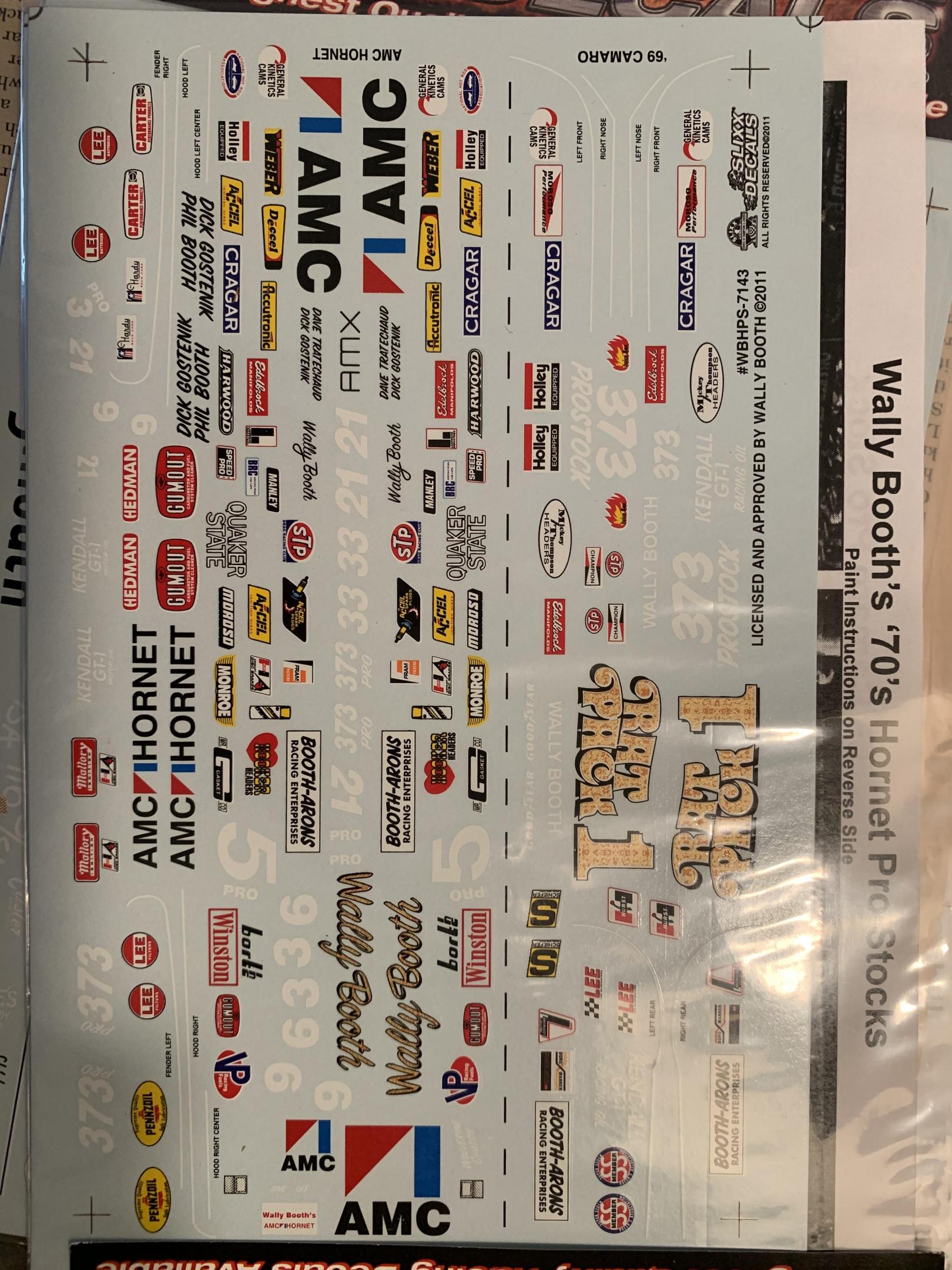 5. Small update as I’m still in the parts gathering mode. I searched through my stash of kits for a suitable donor kit. I tried the AMT 67 Mustang, too narrow. I tried AMTs 66 Fairlane, the Revell 64 T bolt kit, and the Revell Mustang Boss 302 kit, The mid size Fords rear over hang and fuel tanks needed too muck work. I looked at the Mobius Comet A/FX kit but the front suspension is too raised. I think I’m going to try The Revell 1/24 Shelby Mustang kit. The wheelbase is very close, it has a short rear overhang and the width is dead on. I took the Hornet hood and placed it on the Mustang and the fender aprons and firewall look like a good fit. I’ll be using Slixx decals, their Shahan’s Dodge Dart, and maybe some from the Wally Booth decal sheet.