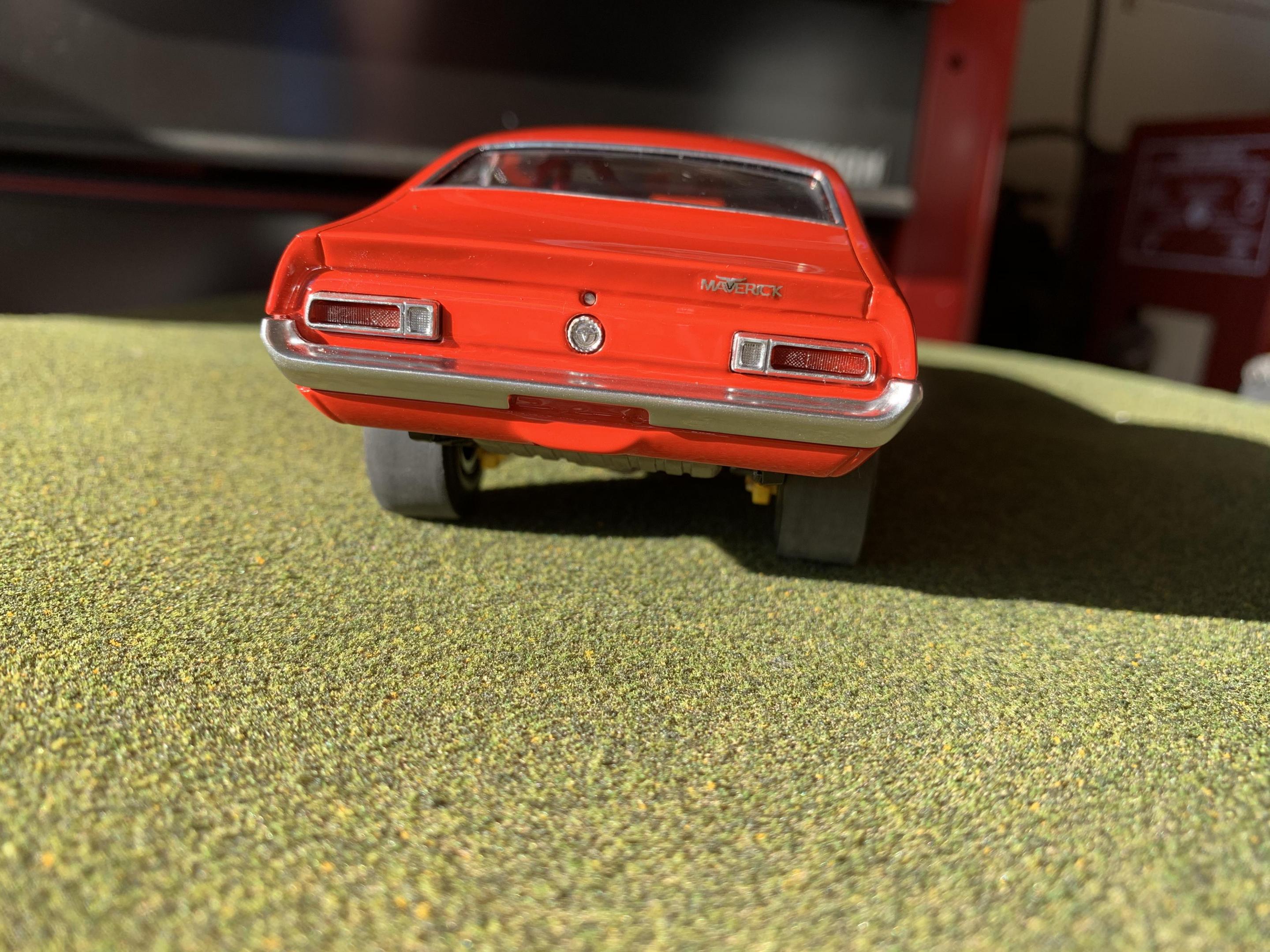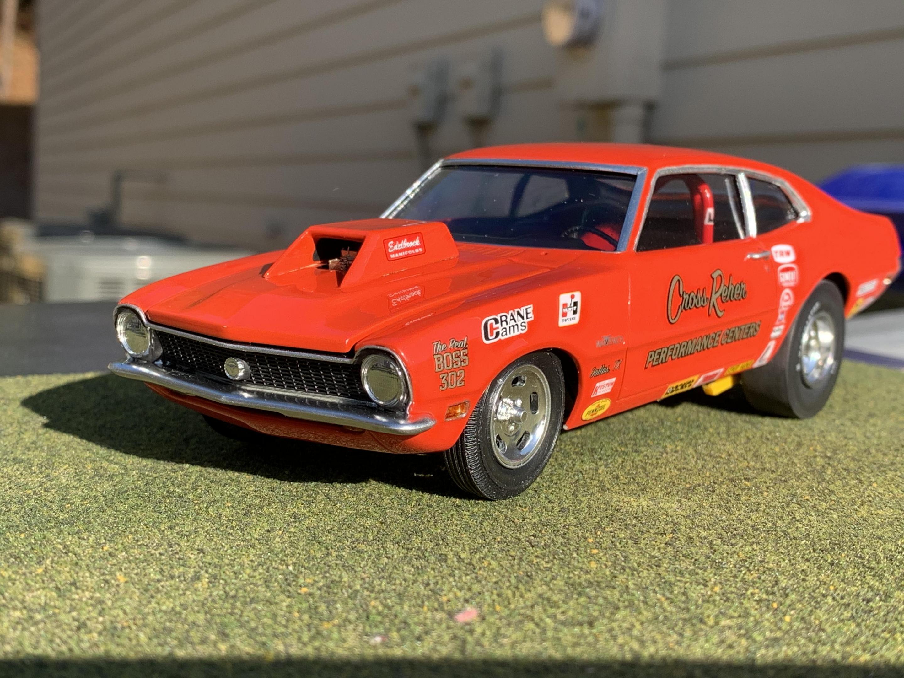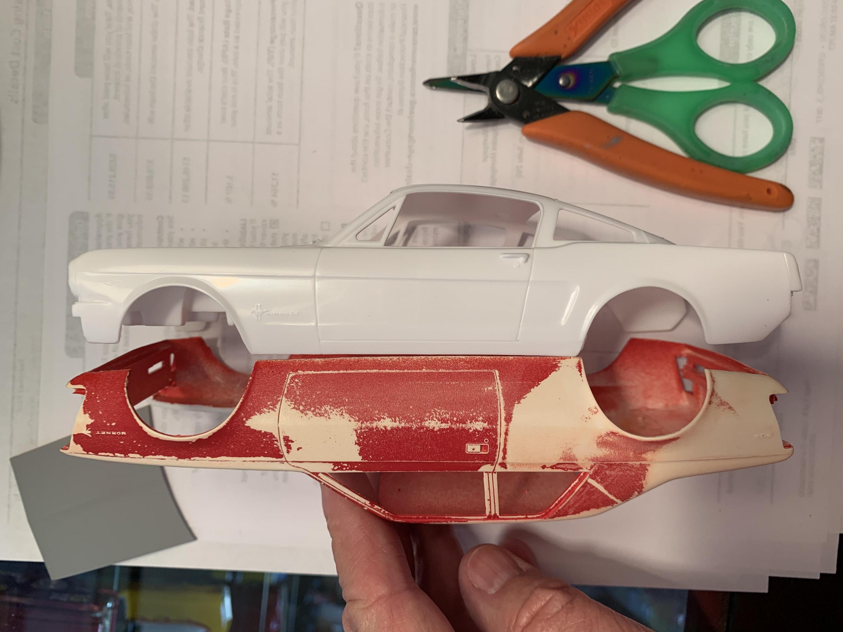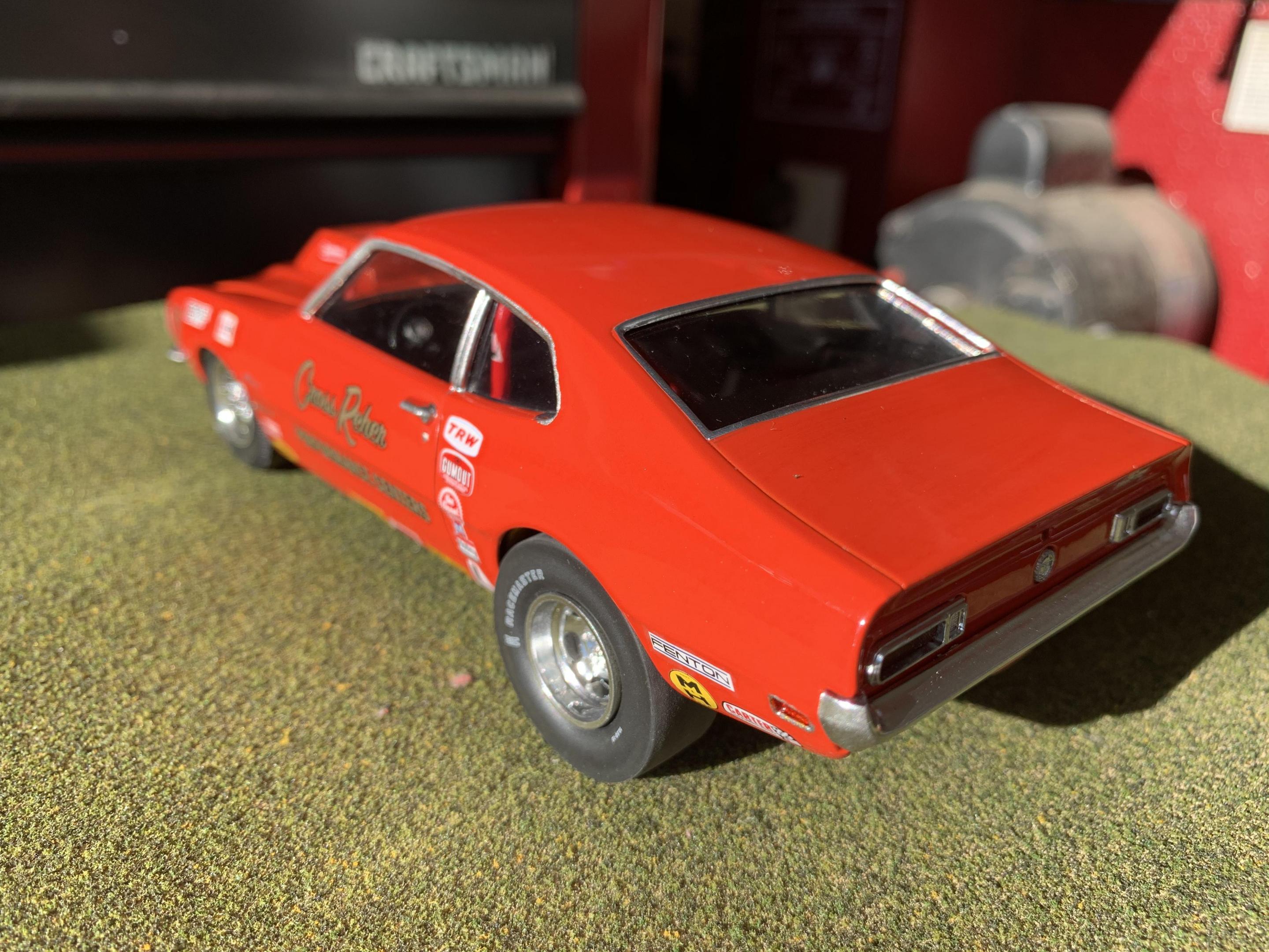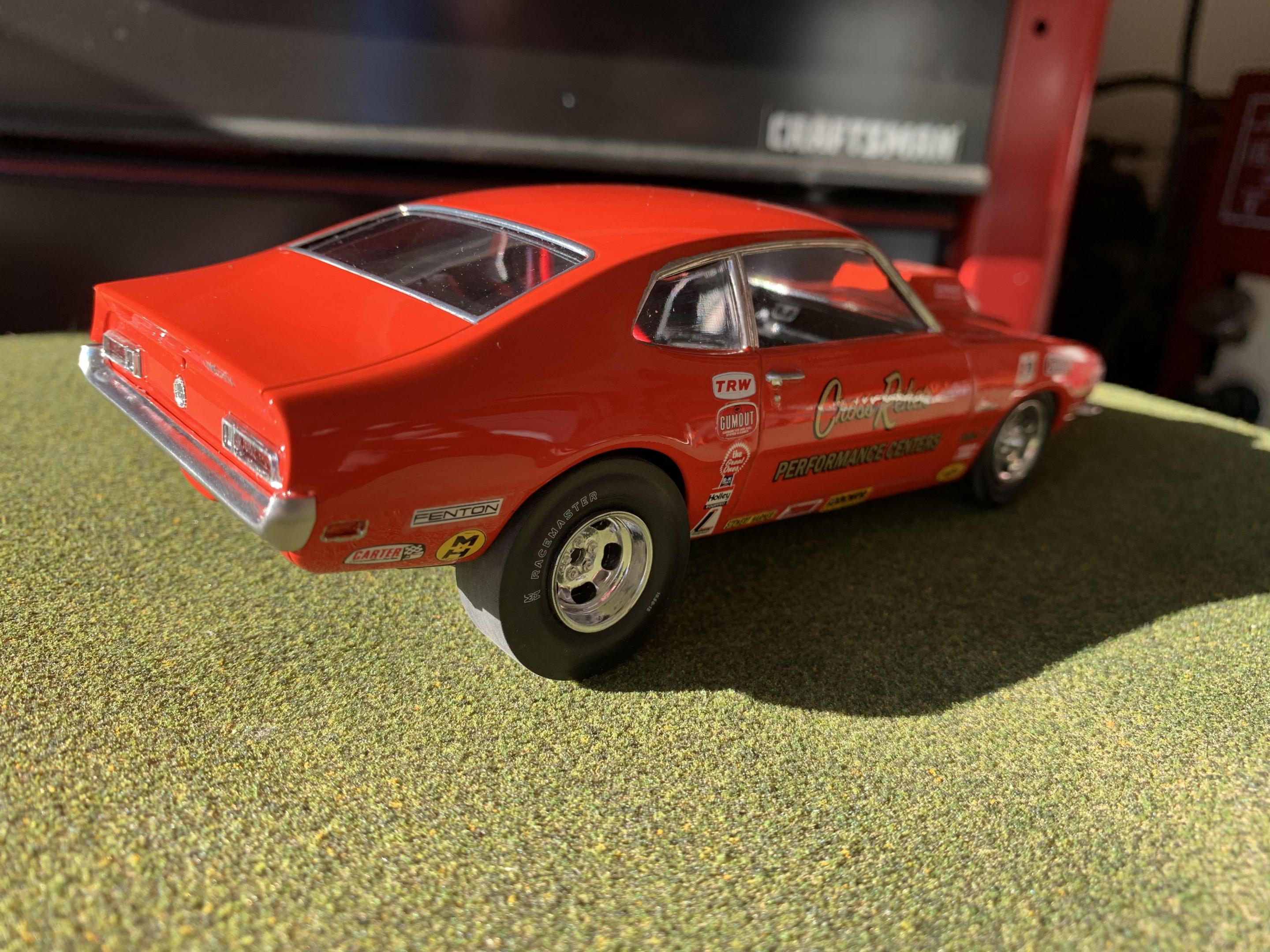 5. Small update as I’m still in the parts gathering mode. I searched through my stash of kits for a suitable donor kit. I tried the AMT 67 Mustang, too narrow. I tried AMTs 66 Fairlane, the Revell 64 T bolt kit, and the Revell Mustang Boss 302 kit, The mid size Fords rear over hang and fuel tanks needed too muck work. I looked at the Mobius Comet A/FX kit but the front suspension is too raised. I think I’m going to try The Revell 1/24 Shelby Mustang kit. The wheelbase is very close, it has a short rear overhang and the width is dead on. I took the Hornet hood and placed it on the Mustang and the fender aprons and firewall look like a good fit. I’ll be using Slixx decals, their Shahan’s Dodge Dart, and maybe some from the Wally Booth decal sheet.