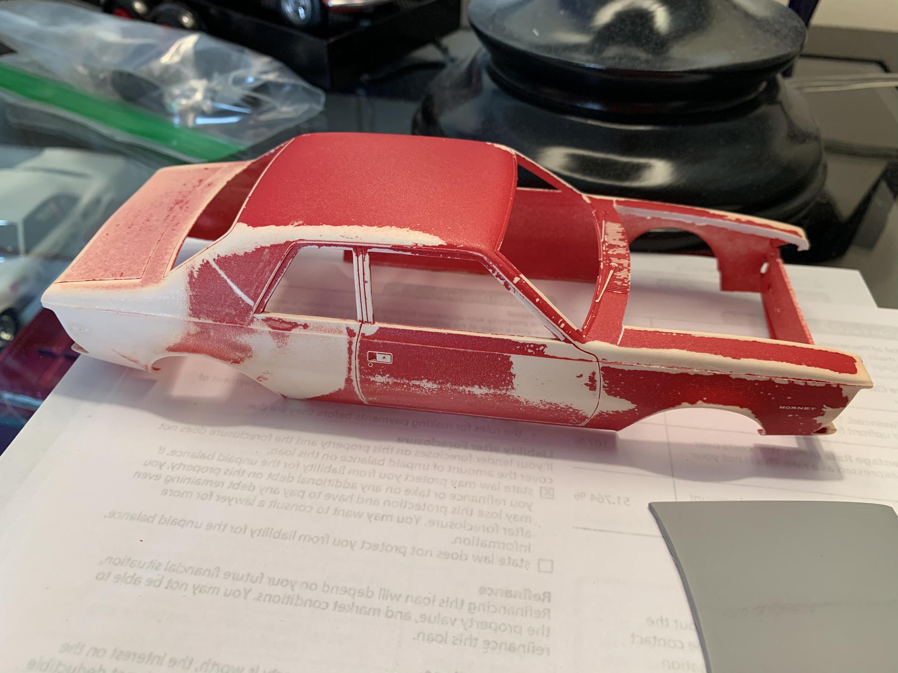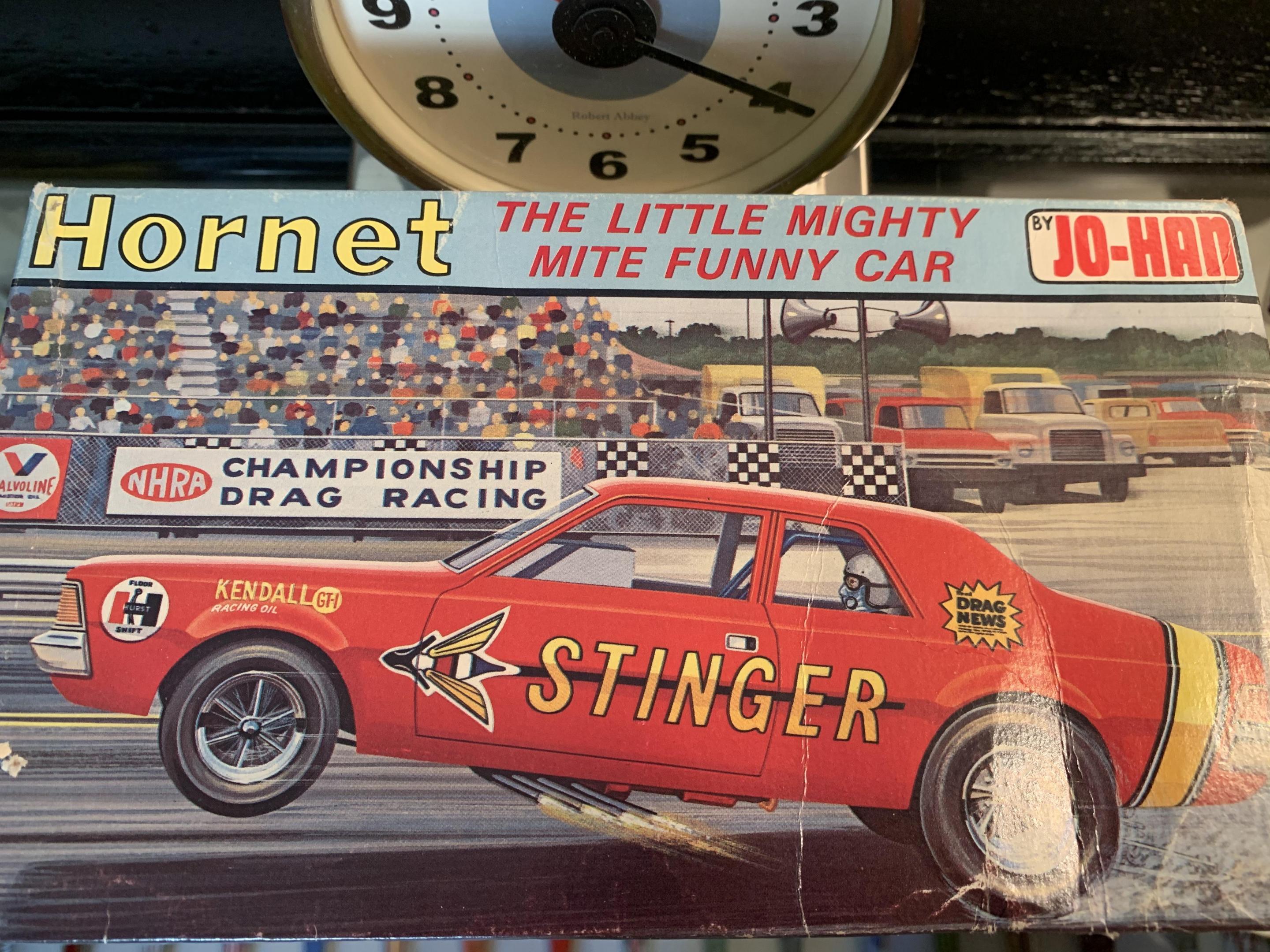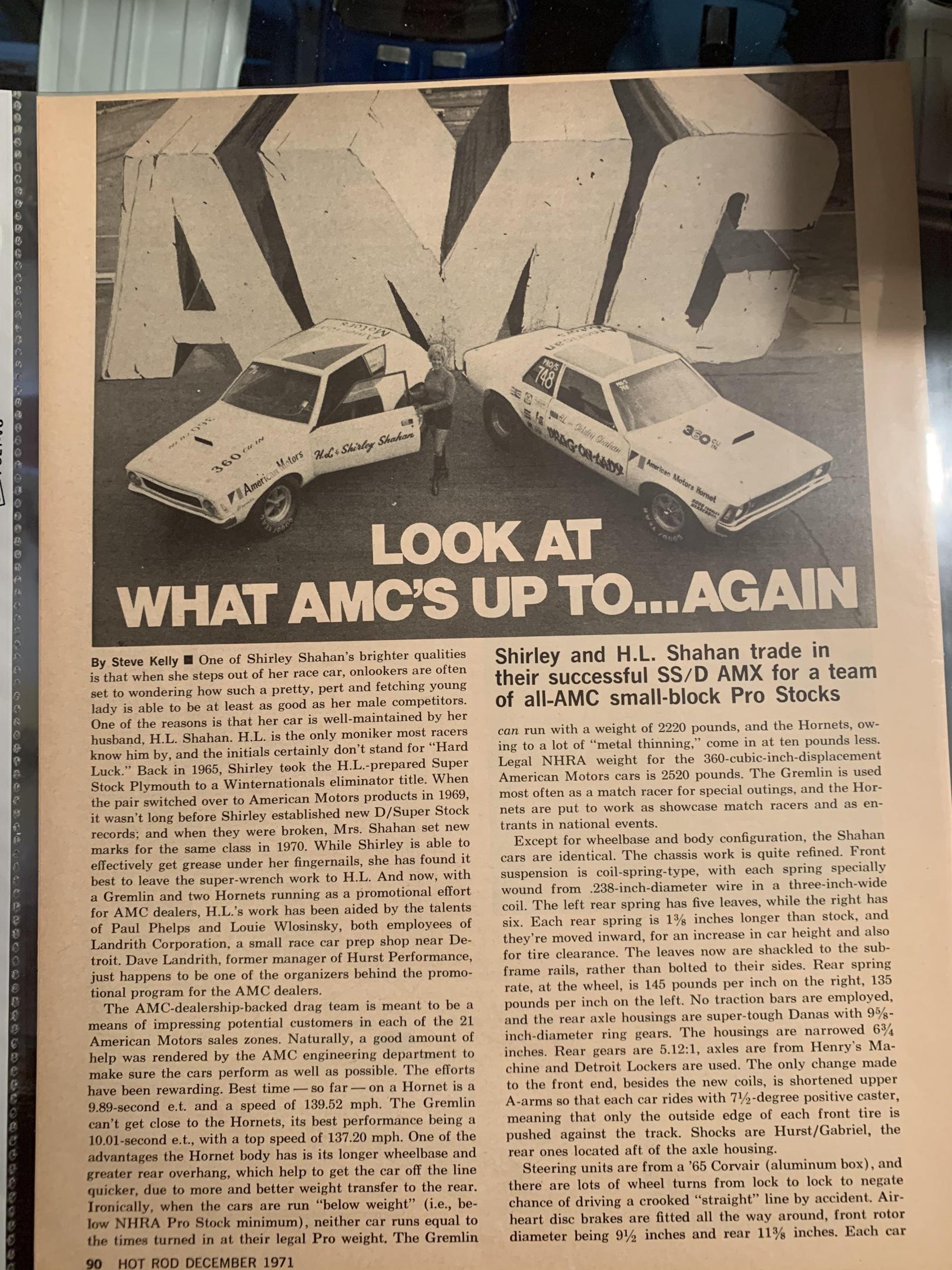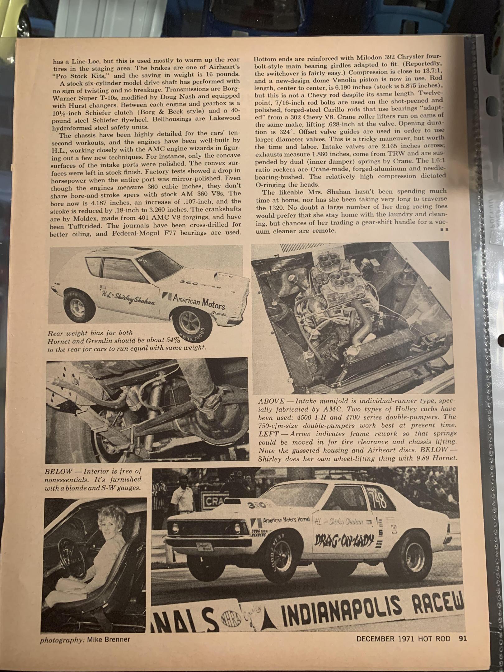 14. When I was a little kid growing up in south St. Louis, the city block we lived on boarderd, South Kingshighway. There were several new car dealers on this street, one of which was Ben Lindenbusch American Motors. I used to hang out at at the service entrance after hours as they had two Red White and Blue Super Stock AMX’s that they would work on and race on the weekends. This created a fondness for the AMC cars I still have to this day. One of my build list project’s is the Shirley Shahan’s Hornet Pro Stock. I acquired a Johan Hornet Funny Car that had been started many years ago. The kit can only be built as a Funny Car, the hood is molded shut, no stock interior or chassis pan. The body was painted with lacquer and its crazed the plastic. So armed with the body and an article from the December 1971 edition of Hot Rod magazine I’m going to attempt to build Shirley’s 71 Hornet