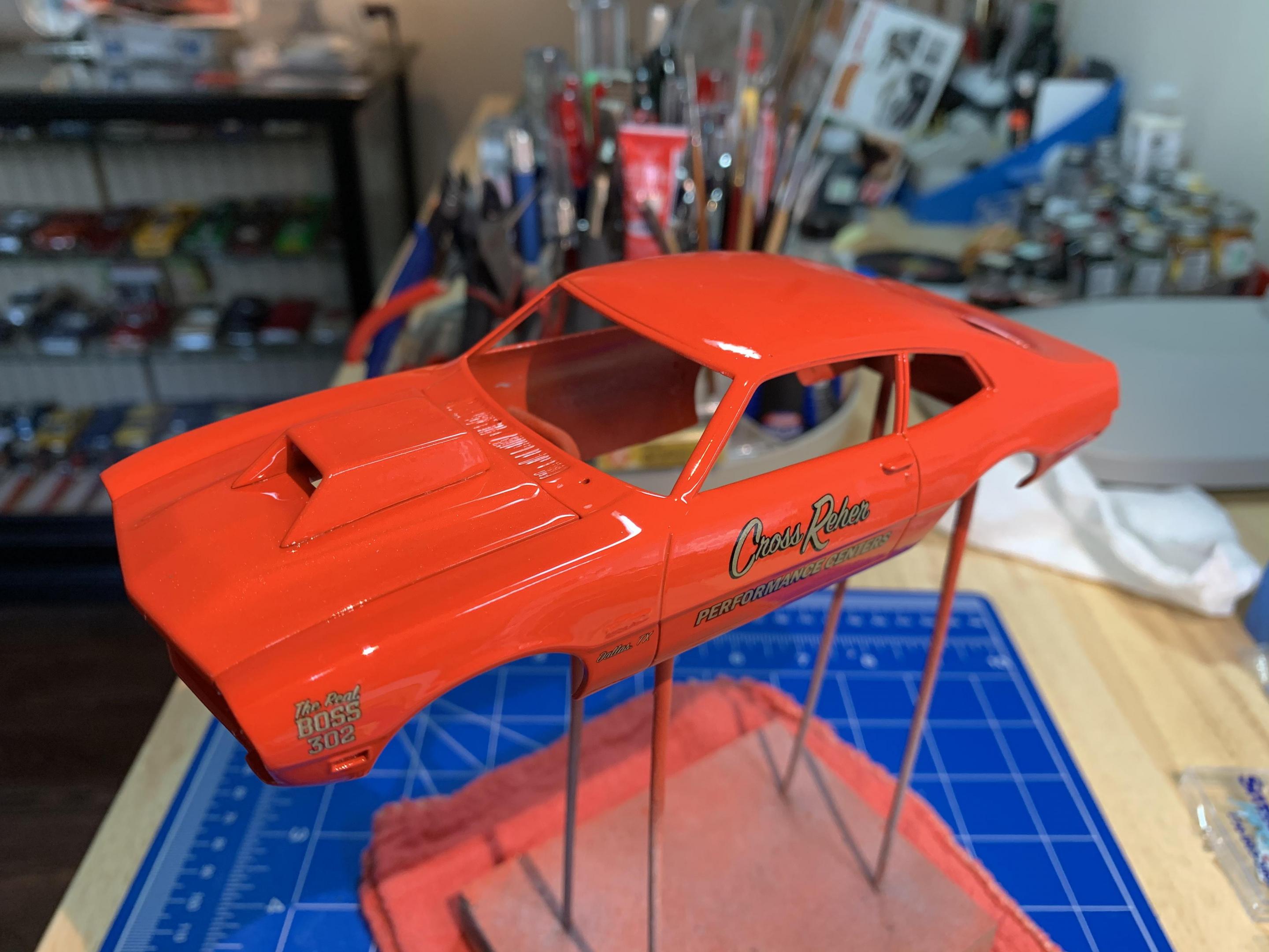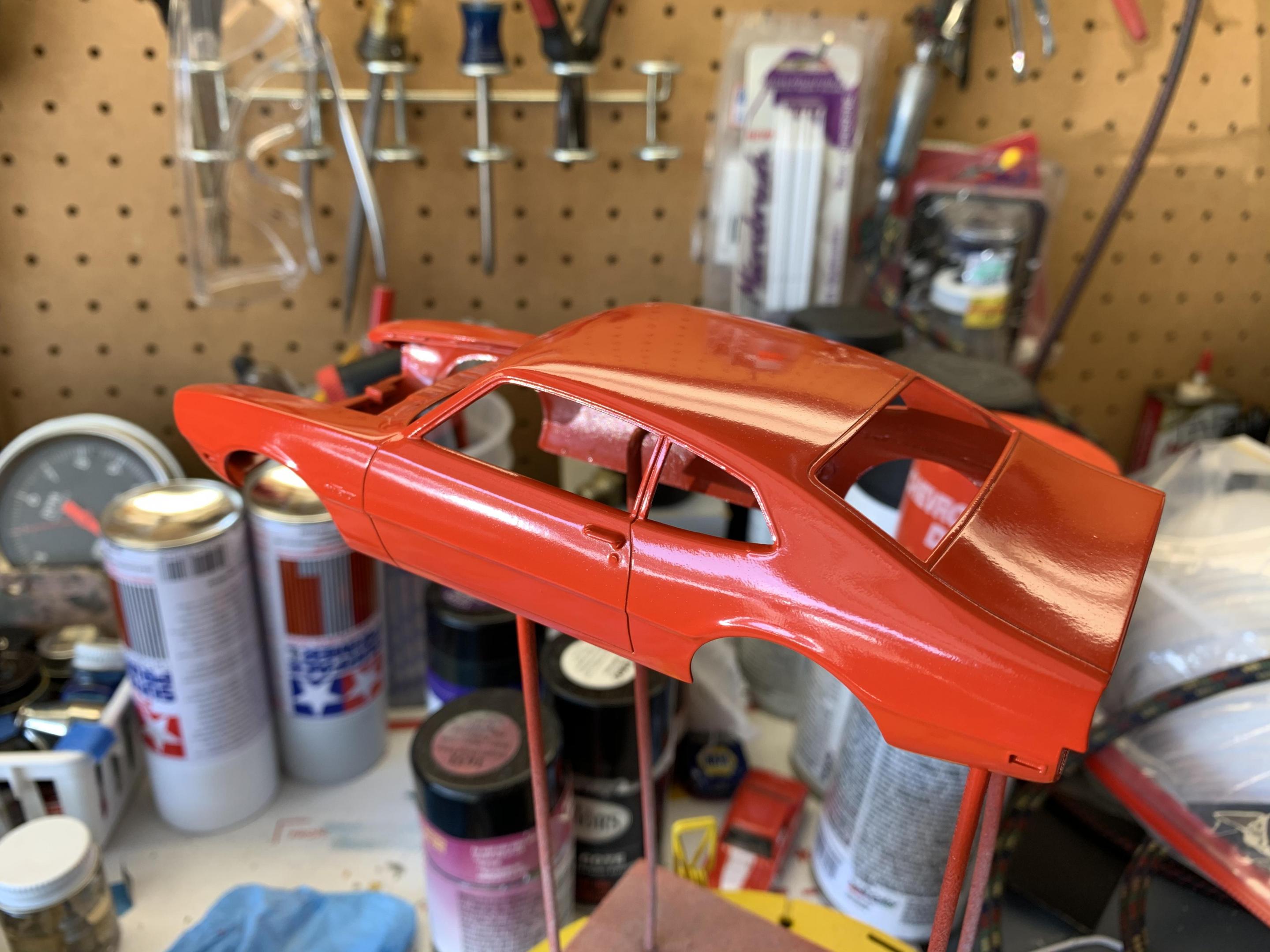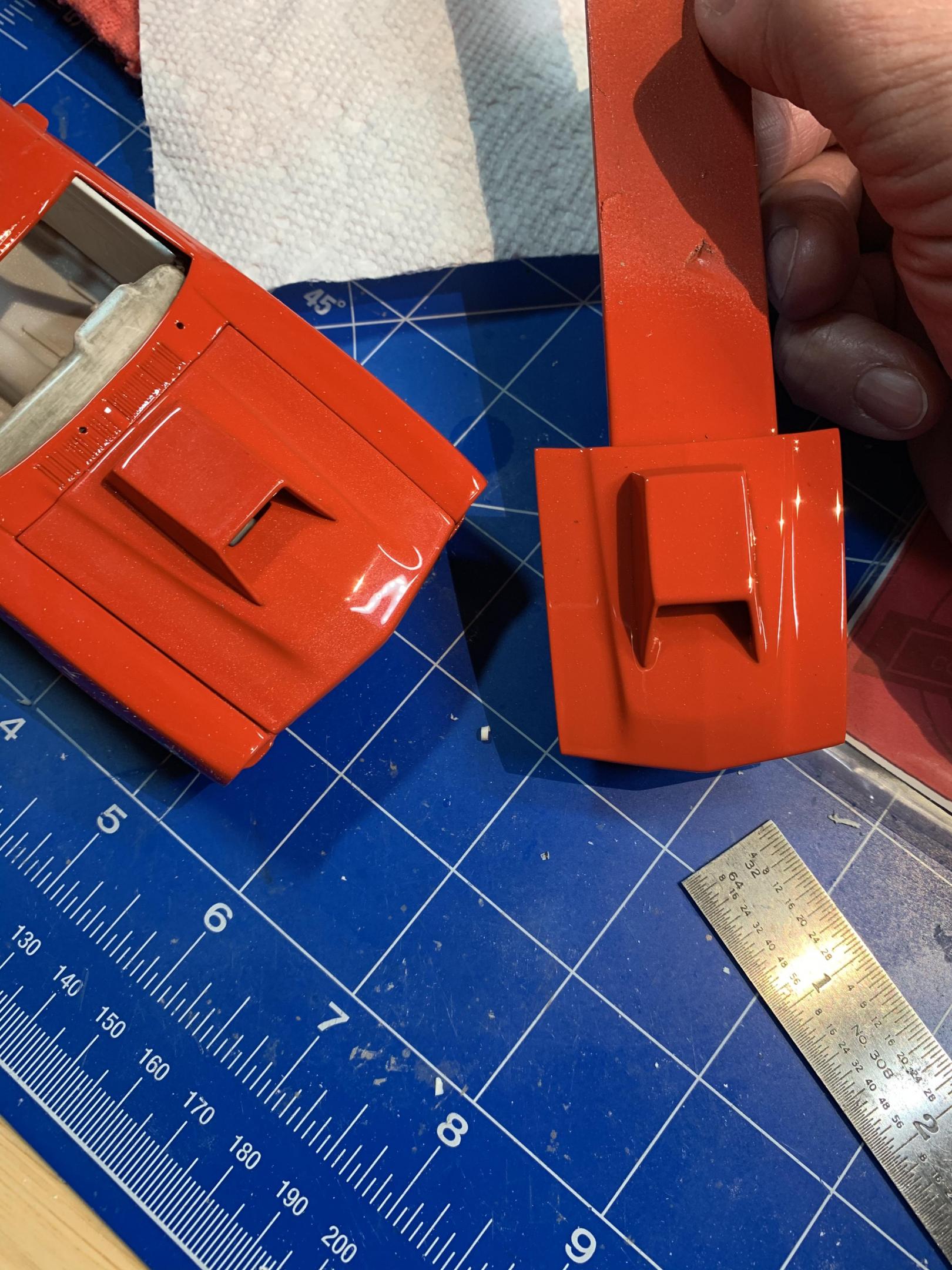 16. Finally getting to the fun stuff. I re-scribed the panel lines and door gaps, I added the fender lines at the rockers, removed the windshield wipers and added the missing cowl vents, I added the wiper holes as they we’re not filled on the original car. When I was filling the gaps under the rear bumper and realized I was missing a rear bumper. . I had recently scrapped a Revell 68 Mustang and was surprised at how close the rear bumper was to fitting. It would be very easy to make this bumper work, but I did locate a Johan Comet rear bumper that I will use. I cut the hole in the hood and added the hood scoop. i was off work yesterday and it was cool here in Georgia so I waited until he afternoon for the temperature to get warm. I shot the Poppy Red on the body and hood. The first coat looked like it was going to run off the body, so I let it set up and shot the second coat. It looked terrible and I almost threw it into the purple pond. I walked away from it for about an hour, came back and decided to go for broke and put the third coat on it, and it came out very decent, and doable. I’ll let it dry a couple days and do the decals.