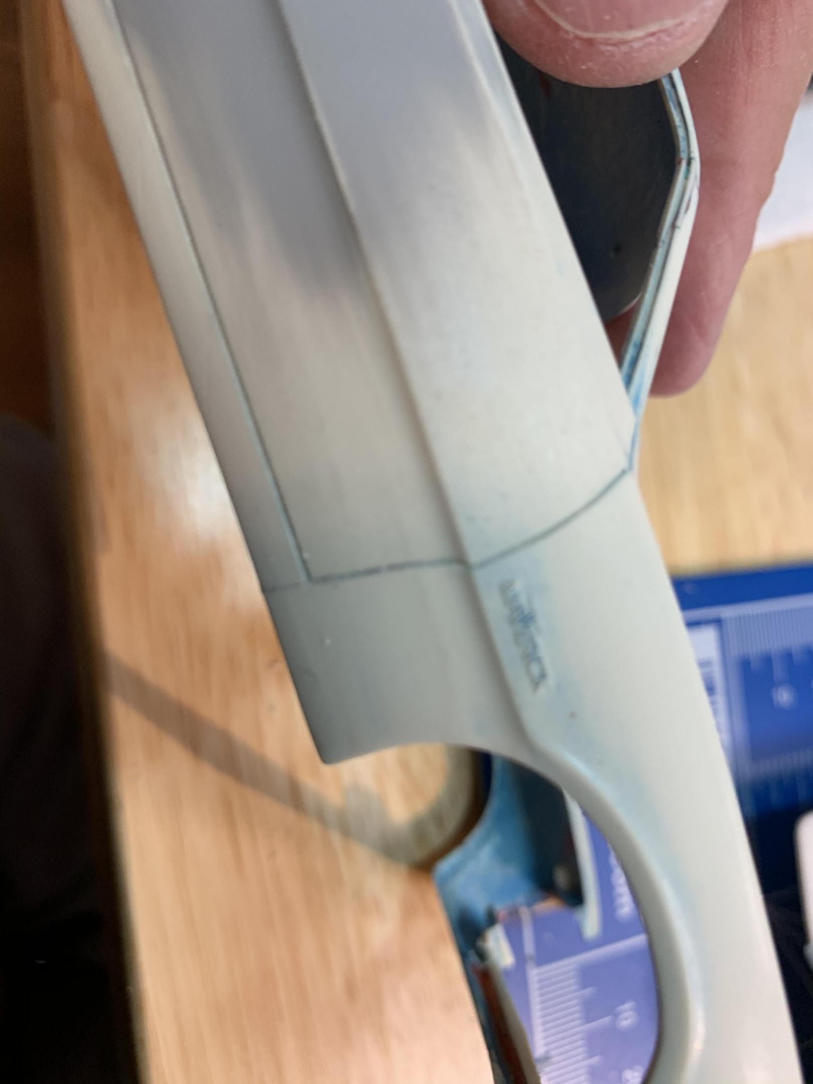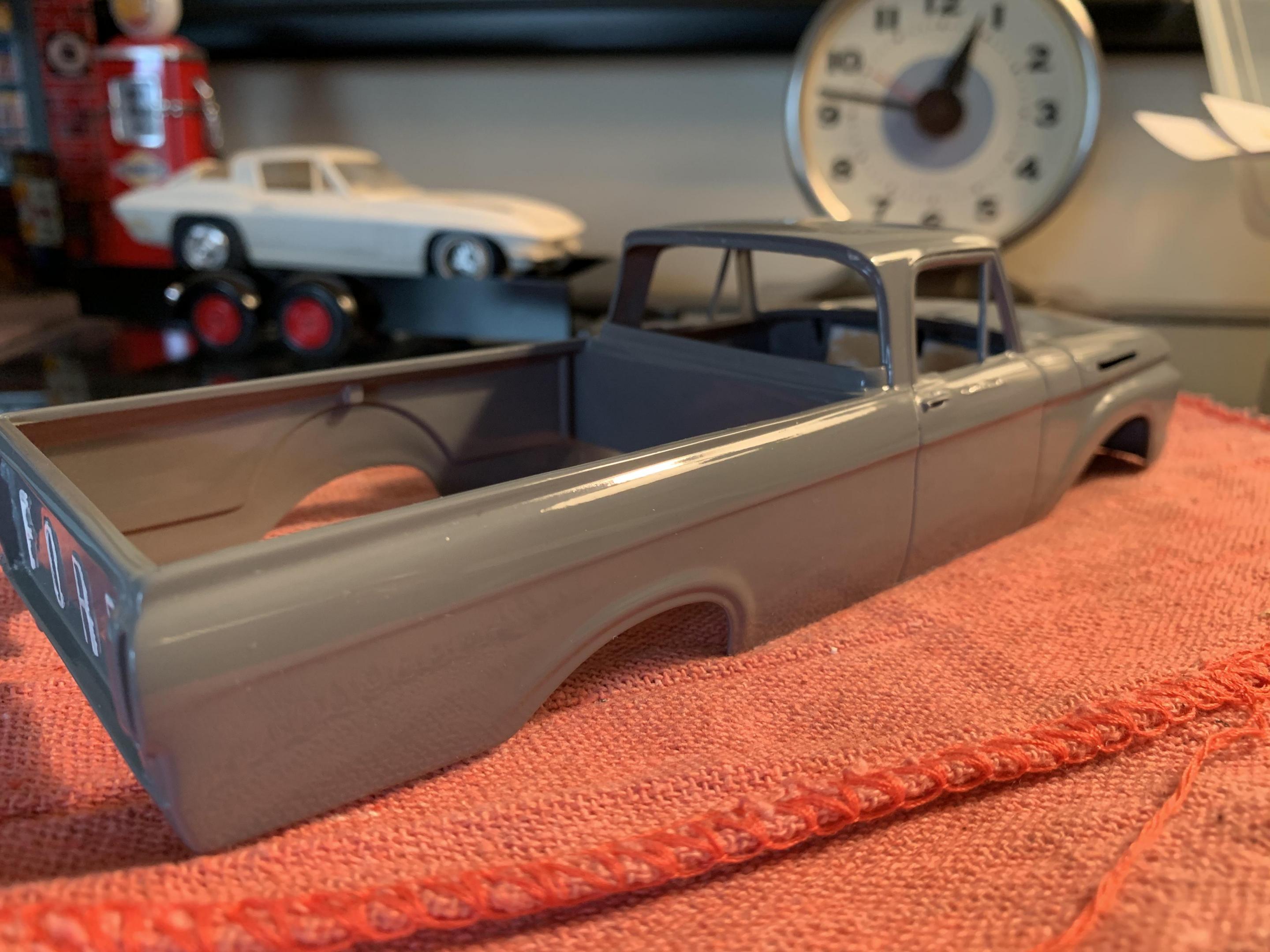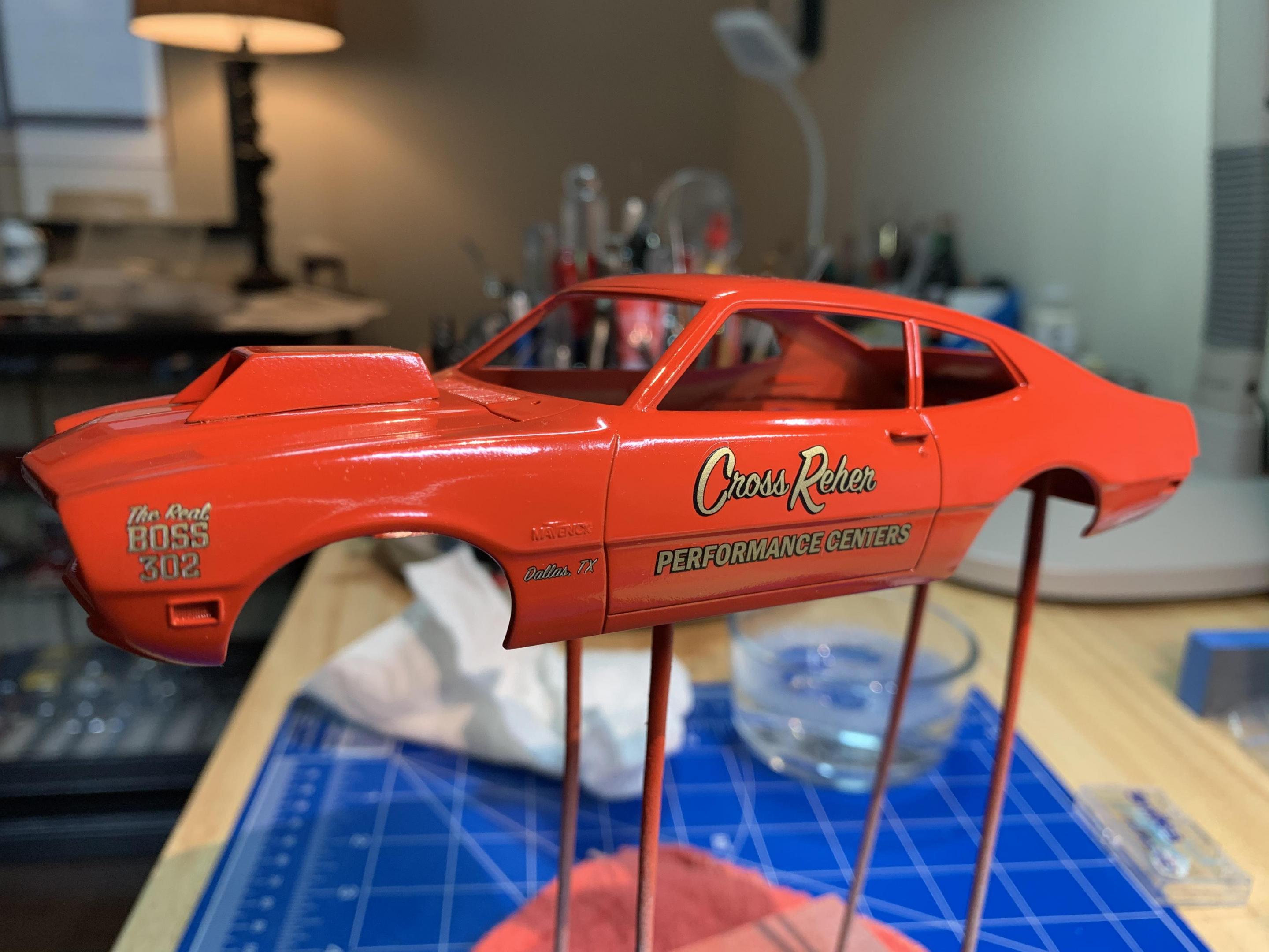 16. Finally getting to the fun stuff. I re-scribed the panel lines and door gaps, I added the fender lines at the rockers, removed the windshield wipers and added the missing cowl vents, I added the wiper holes as they we’re not filled on the original car. When I was filling the gaps under the rear bumper and realized I was missing a rear bumper. . I had recently scrapped a Revell 68 Mustang and was surprised at how close the rear bumper was to fitting. It would be very easy to make this bumper work, but I did locate a Johan Comet rear bumper that I will use. I cut the hole in the hood and added the hood scoop. i was off work yesterday and it was cool here in Georgia so I waited until he afternoon for the temperature to get warm. I shot the Poppy Red on the body and hood. The first coat looked like it was going to run off the body, so I let it set up and shot the second coat. It looked terrible and I almost threw it into the purple pond. I walked away from it for about an hour, came back and decided to go for broke and put the third coat on it, and it came out very decent, and doable. I’ll let it dry a couple days and do the decals.