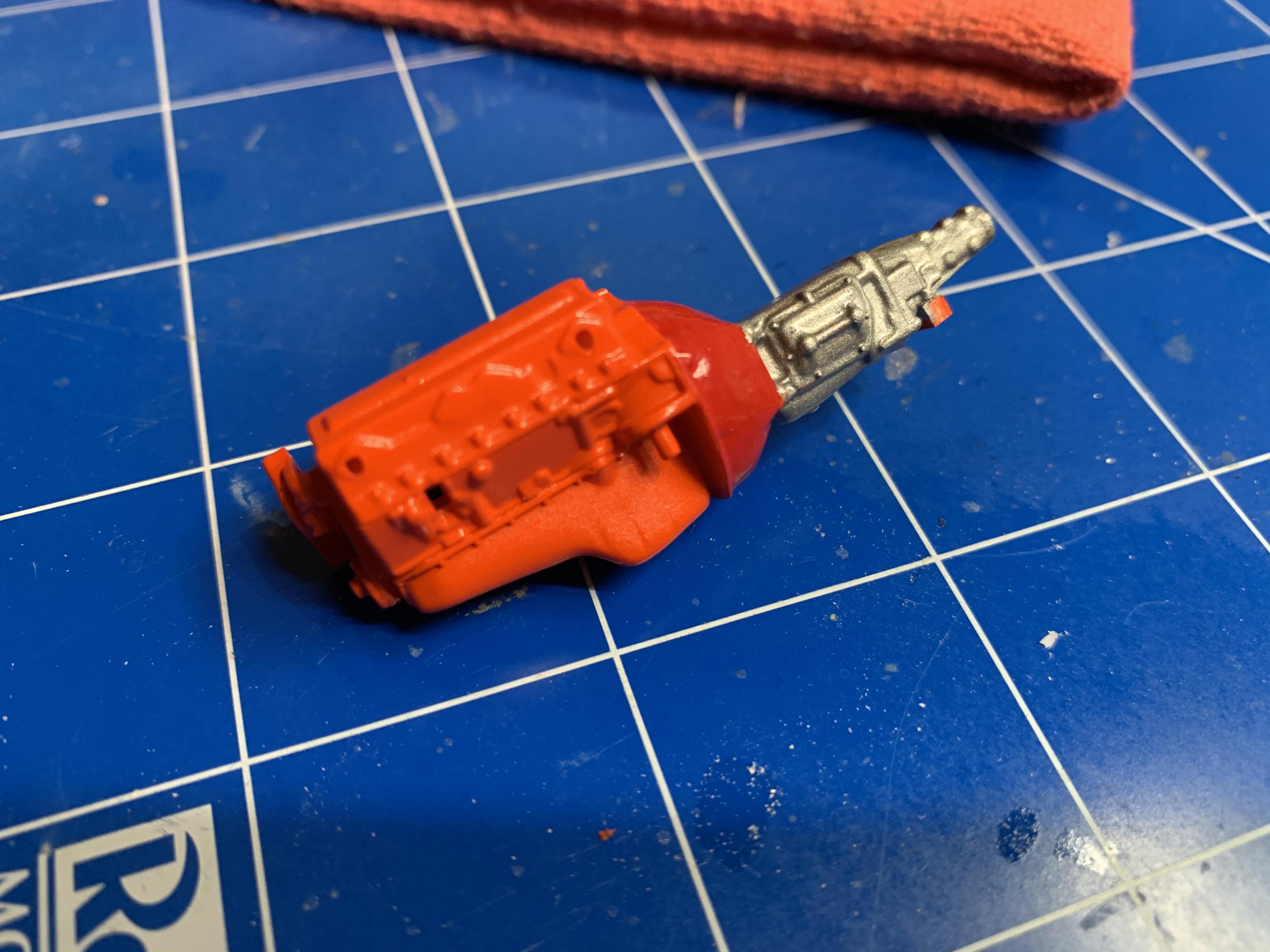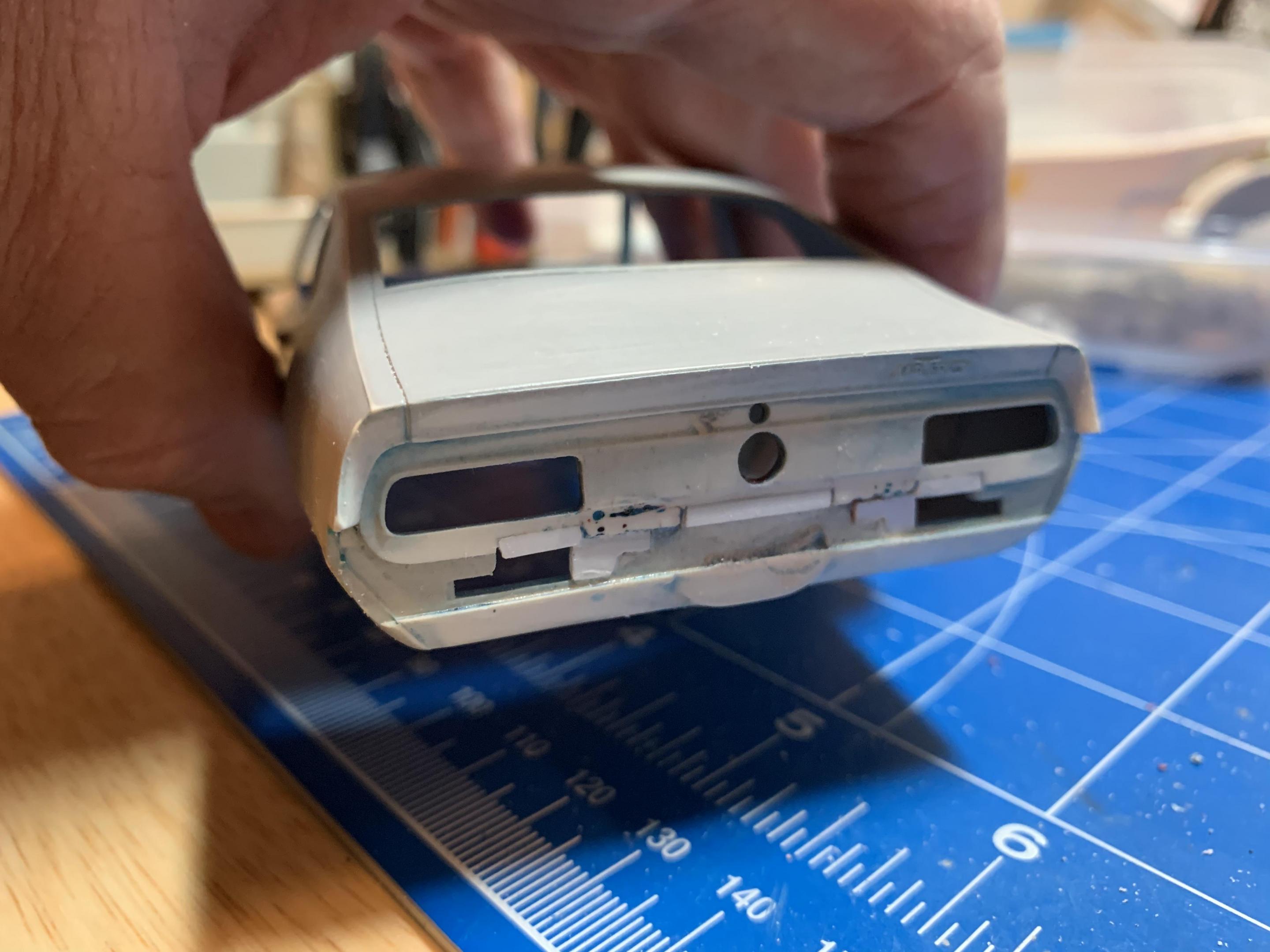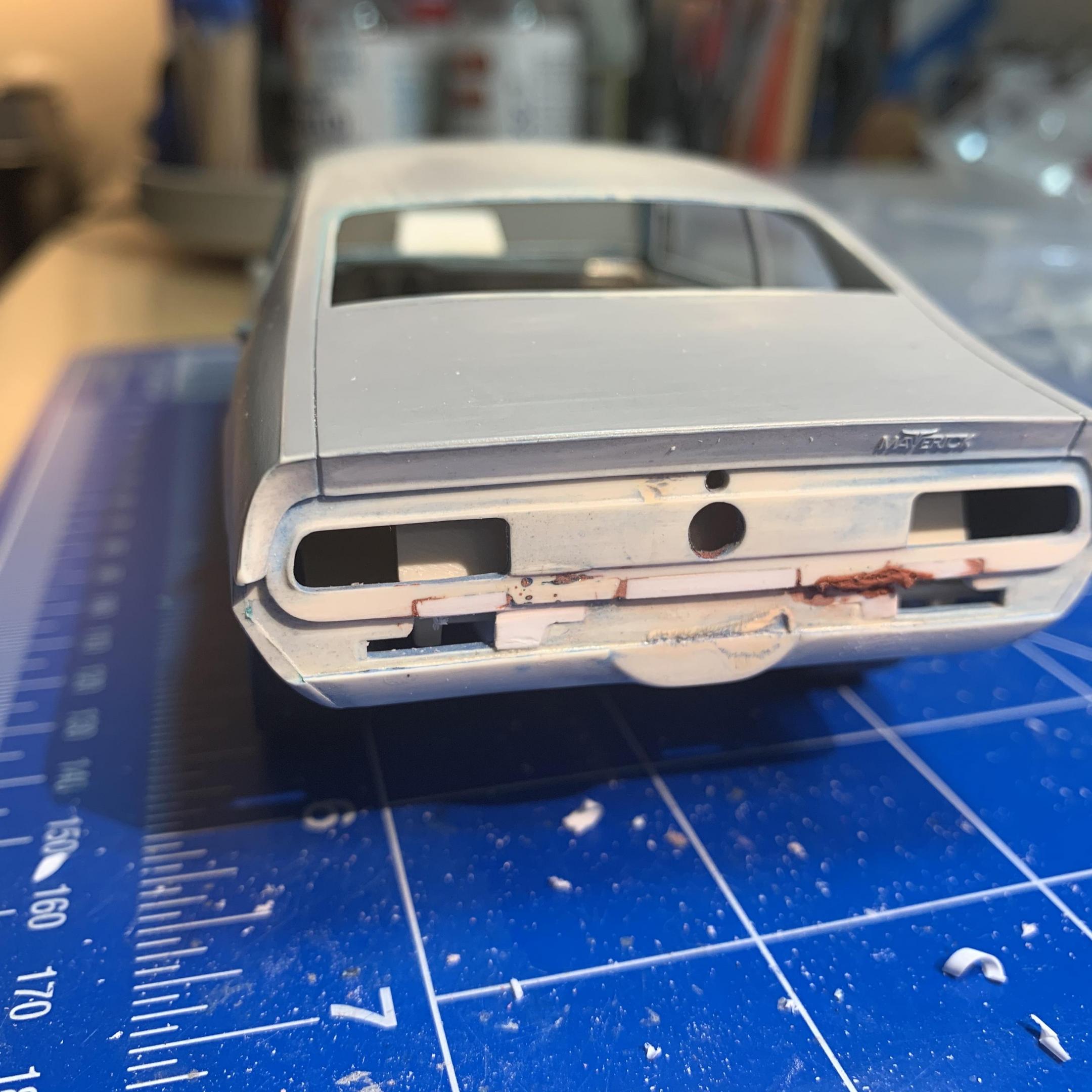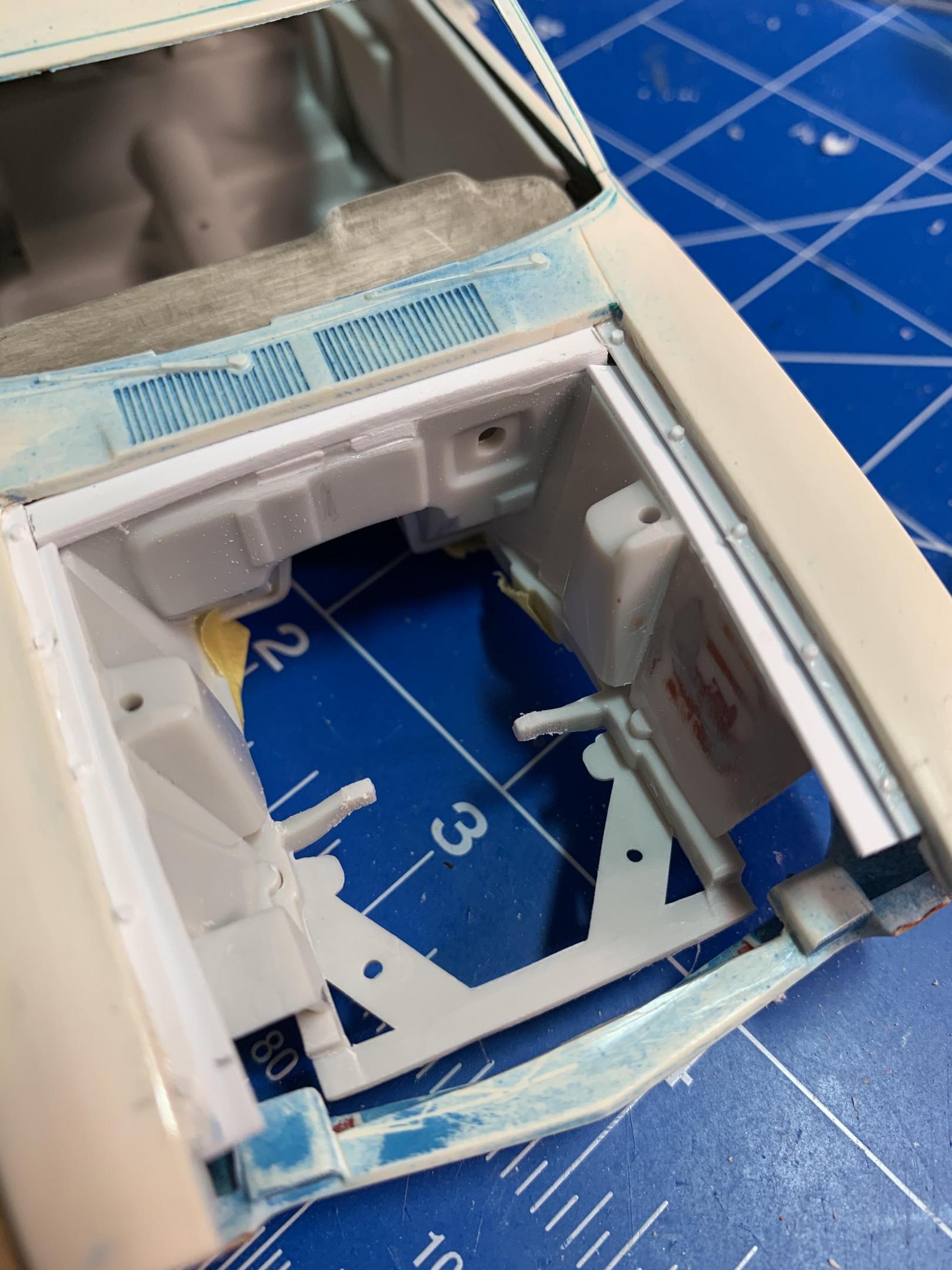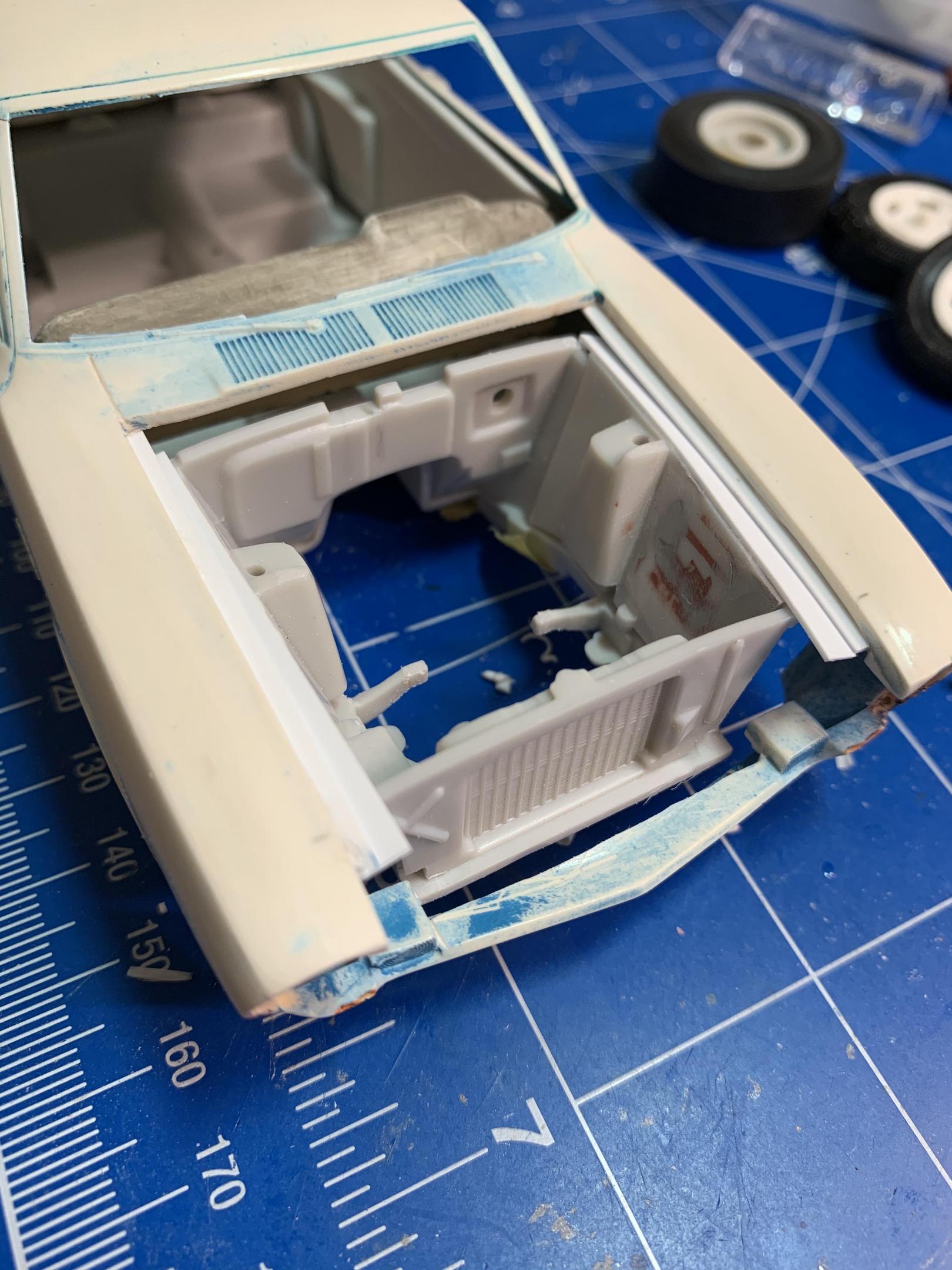 22. I thought I was on the right track with adding the fender flanges to make up the space difference in the Mustang engine bay and the opening between the fenders on the Maverick. But the flanges on the fenders looked to be about 5 inches wide in scale. I got on the internet and started looking at pictures of some Maverick’s engine bays and under hood detail. The wide flanges were not going to work so I cut them off and made new ones closer to scale. One of the issues is that with the front aprons glued the the chassis it’s impossible to get it to fit together. The fender aprons have to be installed after the chassis is installed. My thought was to make these look more accurate. There is still a gap, but not as large so I added a flange to the top of the aprons. These will sit under the fender edges when assembled, and be painted semi gloss black along with the aprons. The flanges on the fenders will be Poppy Red, and this should create an illusion that’s acceptable. I added bolt heads to the fender flanges using Plastruct styrene hex rod. I then started filling the cowl area. I try to do as much filling as I can with styrene. I‘m getting closer to paint and working on the final details.