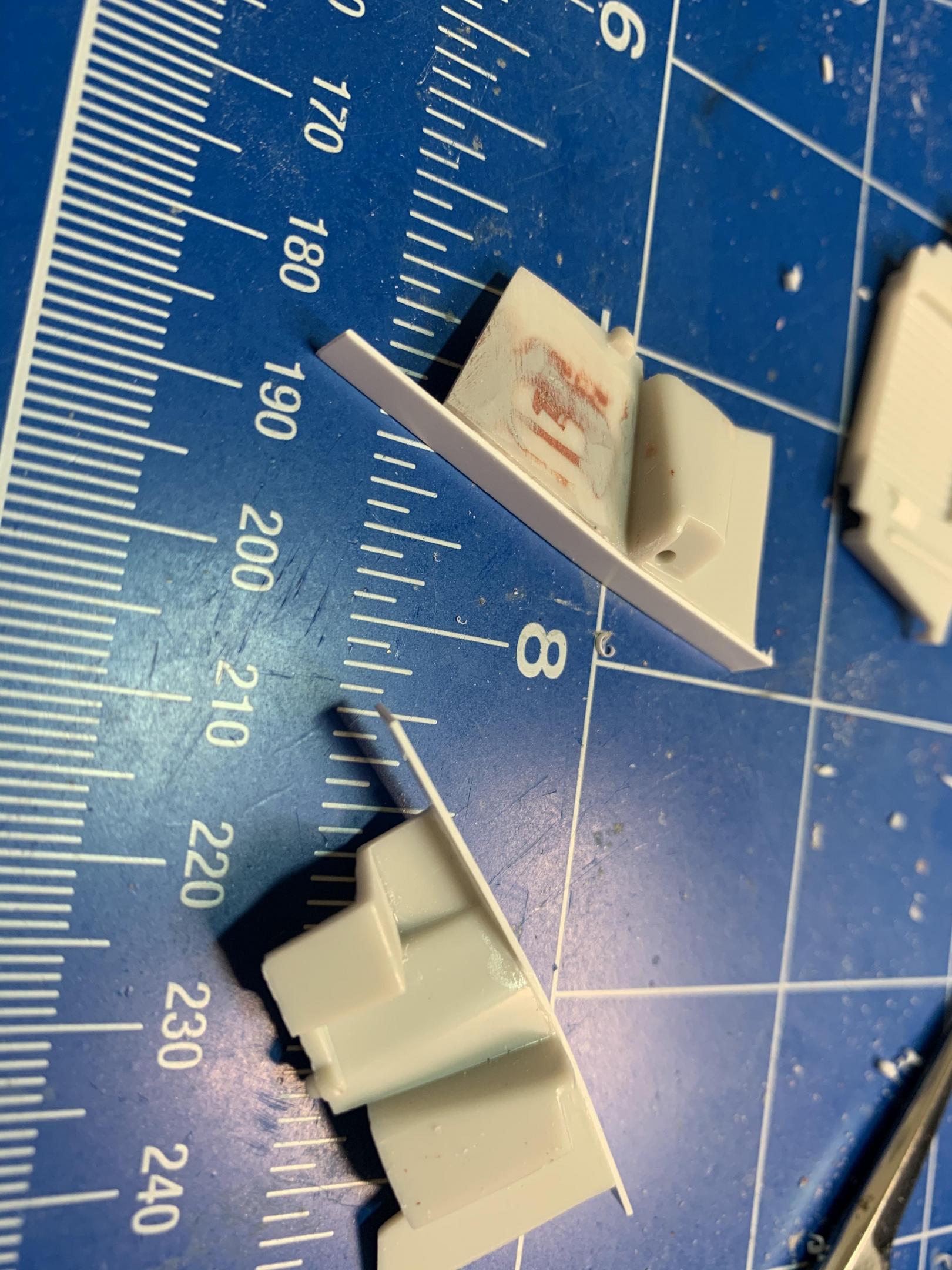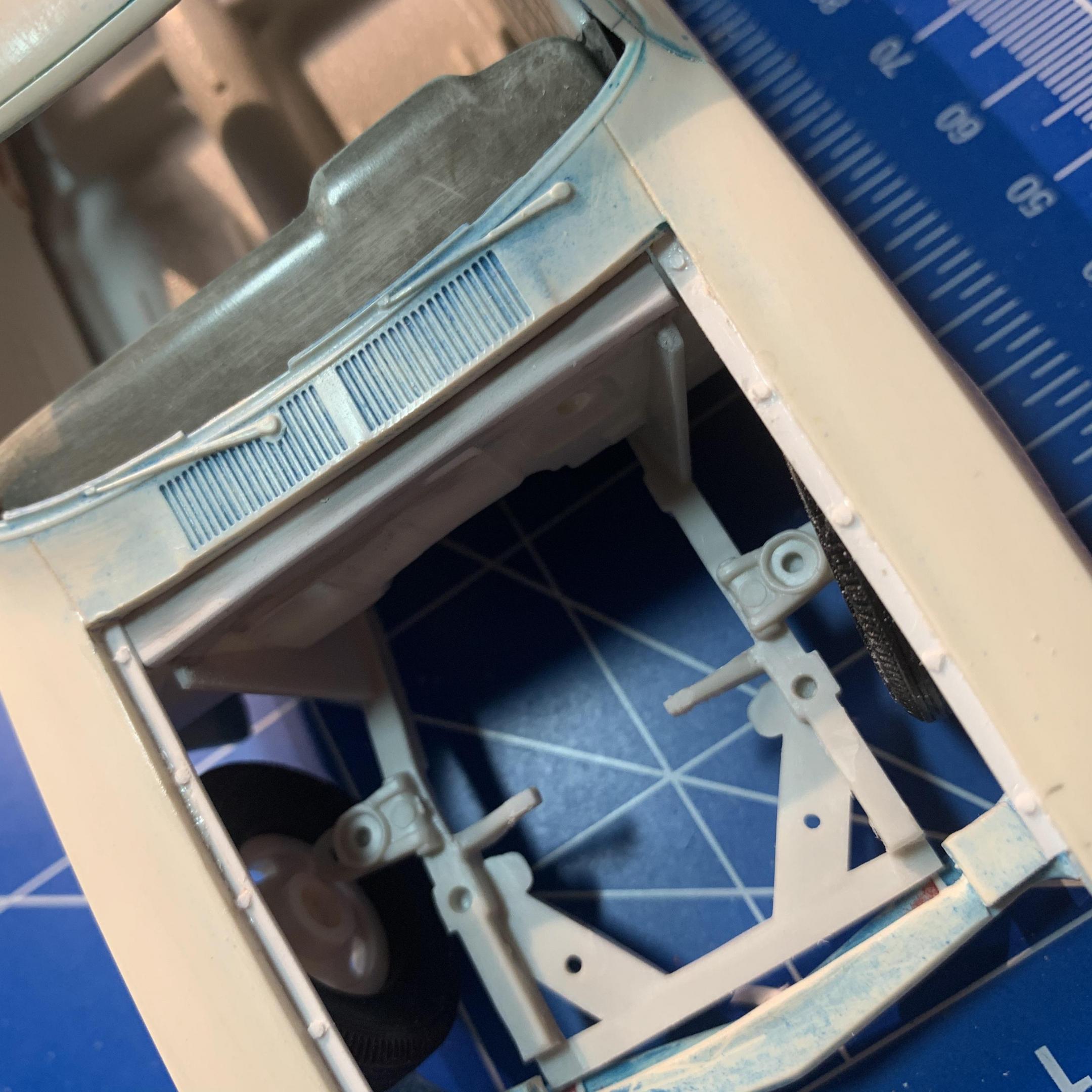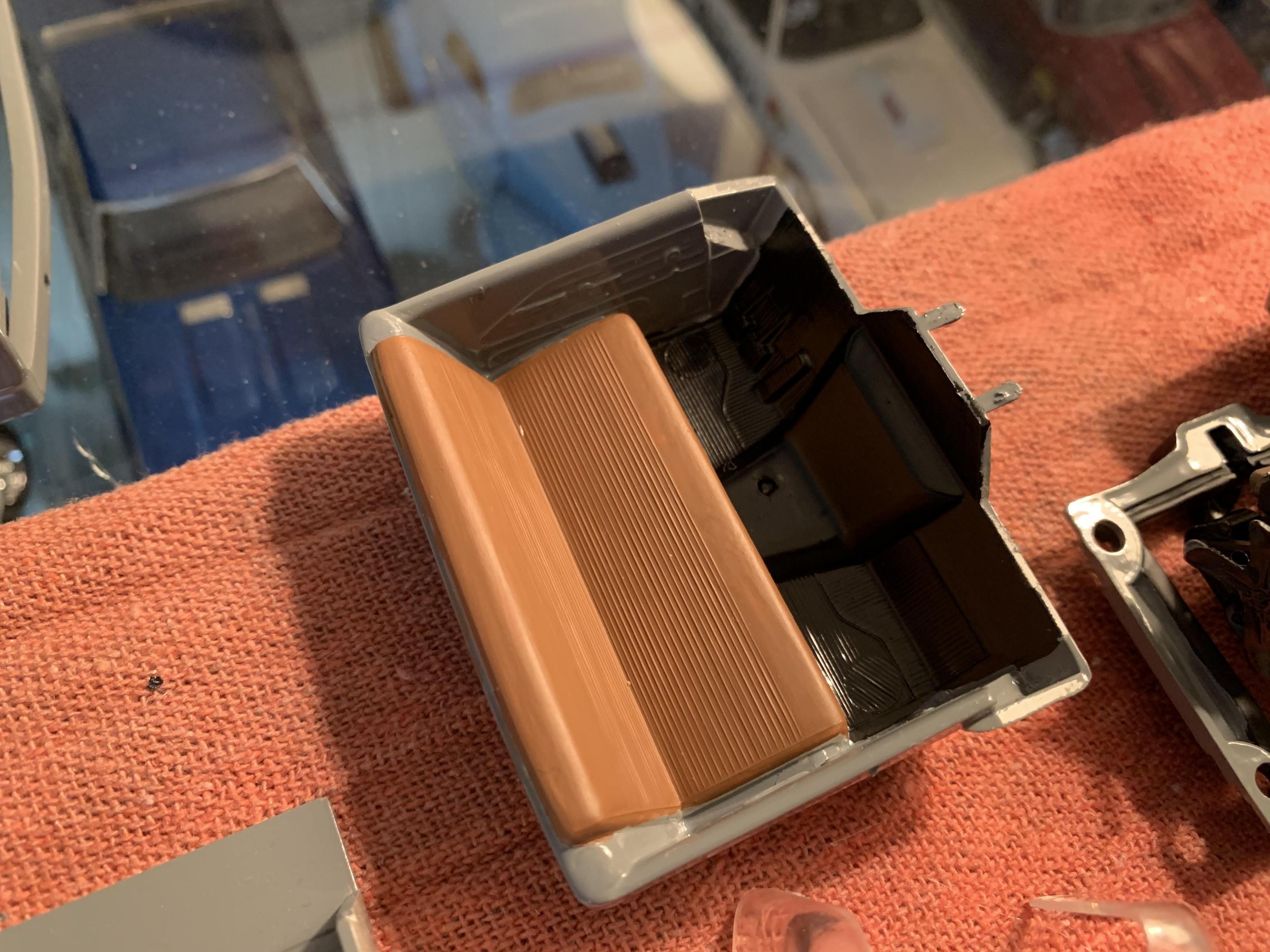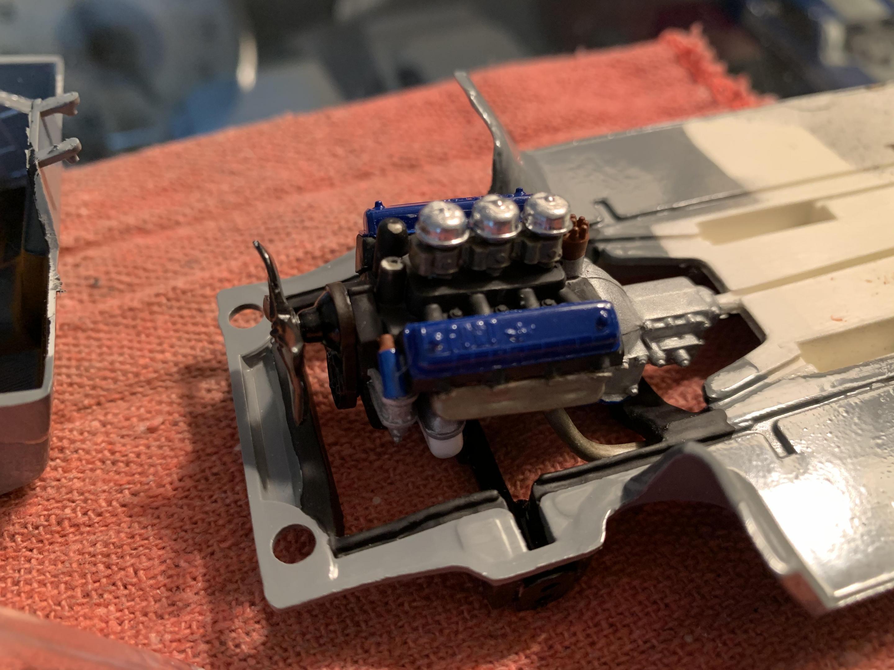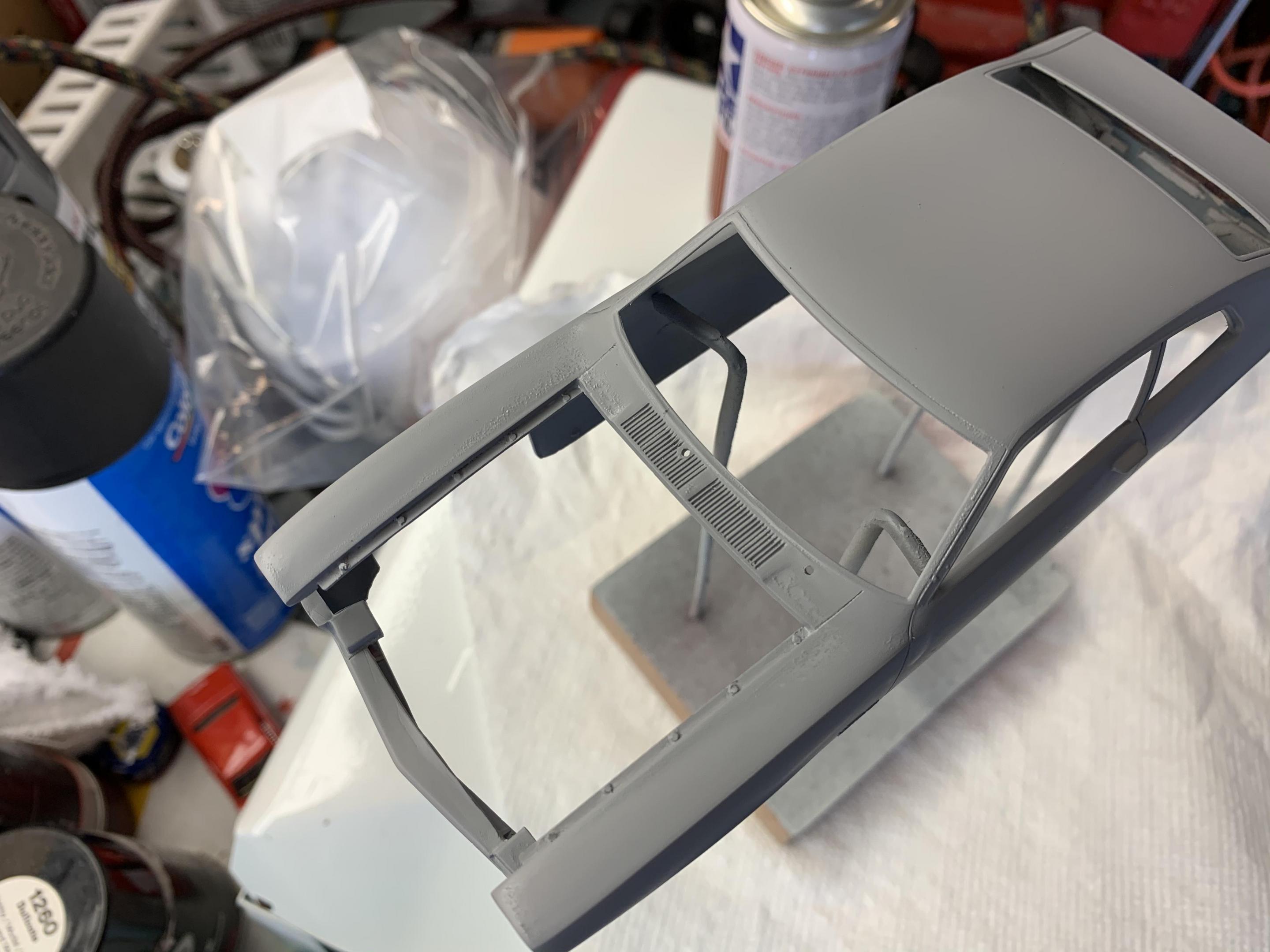 22. I thought I was on the right track with adding the fender flanges to make up the space difference in the Mustang engine bay and the opening between the fenders on the Maverick. But the flanges on the fenders looked to be about 5 inches wide in scale. I got on the internet and started looking at pictures of some Maverick’s engine bays and under hood detail. The wide flanges were not going to work so I cut them off and made new ones closer to scale. One of the issues is that with the front aprons glued the the chassis it’s impossible to get it to fit together. The fender aprons have to be installed after the chassis is installed. My thought was to make these look more accurate. There is still a gap, but not as large so I added a flange to the top of the aprons. These will sit under the fender edges when assembled, and be painted semi gloss black along with the aprons. The flanges on the fenders will be Poppy Red, and this should create an illusion that’s acceptable. I added bolt heads to the fender flanges using Plastruct styrene hex rod. I then started filling the cowl area. I try to do as much filling as I can with styrene. I‘m getting closer to paint and working on the final details.