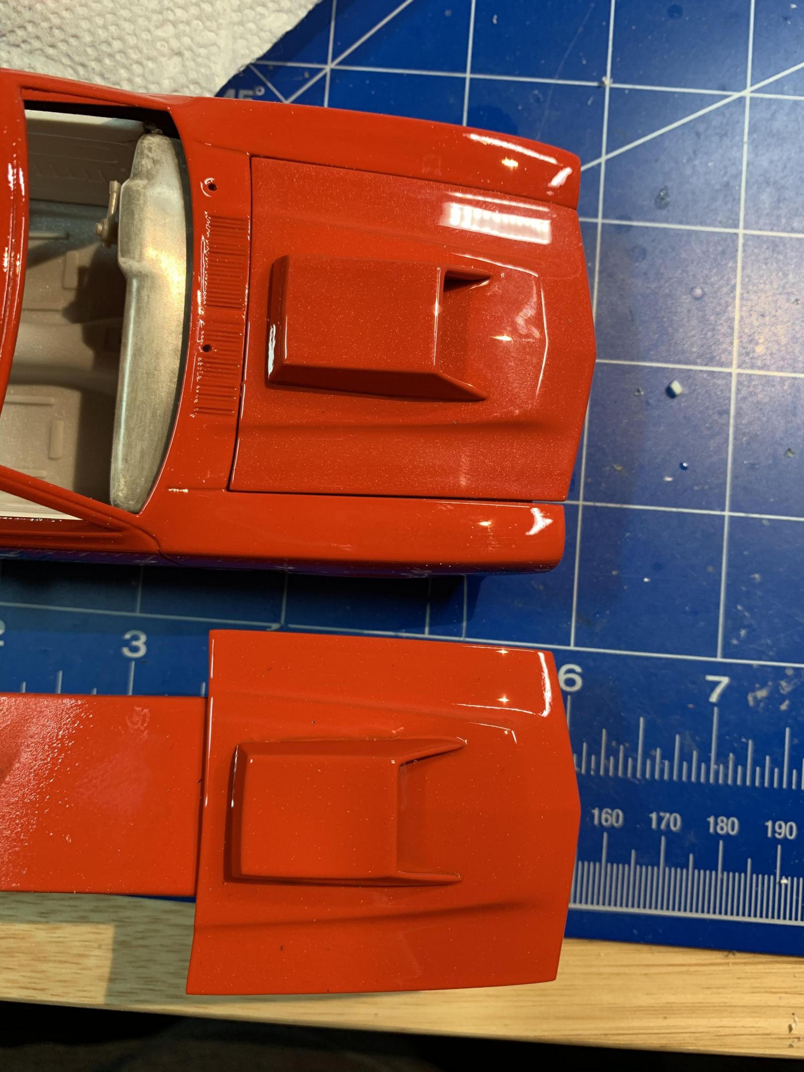 7. Ok, so here’s a new one..... I sprayed the Poppy Red with a rattle can, if you read above it didn’t spray and cover liked I had hoped. The paint did seem salvageable, the hood had what I thought was dust or dirt in it, so I lightly sanded it before the clear was sprayed. I also lightly sanded the body to smooth the red a little. I mixed my DuPont Chroma Clear. Being a painter I always spray lacquer thinner through the air brush, making sure it’s clean and spraying well. I shot the clear and set it aside to cure. When I came back to see how it’s doing the hood has metallic in it????? Not the body, just the hood???? I sprayed everything with the same paint. If you look close at the hood pics, those specks aren’t dirt, that’s the metallic sparkling...... I’ve never stripped a model with Chroma Clear applied, normally if I get it to this stage, it’s good to go, so I don’t even know if it will strip. I don’t know if I should just finish it as is or start over? Your thoughts appreciated.