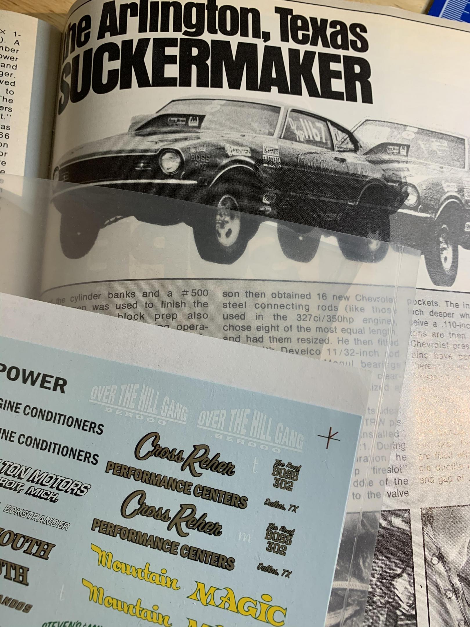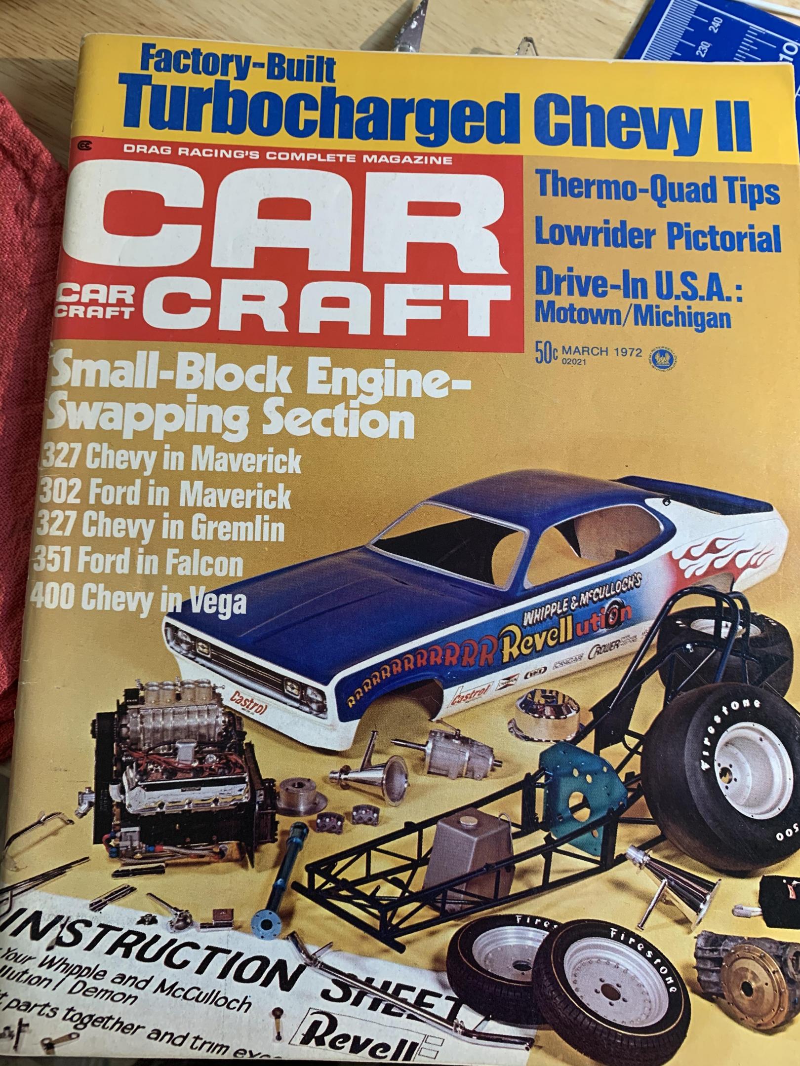 I was always amazed how the stands would empty after the Pro’s ran. Don’t get me wrong, I always enjoyed watching the between rounds thrash to get to the next round, but there was some very exciting racing going on during that time. Comp, Modified, Super Stock and even the Stock classes were great to watch. I particularly liked Modified, and I hated it when they did away with the class. These were stock bodied cars with any American engine, mostly very hi- revving small blocks 4 speed trans missions, wheel standing starts, running in the 10s. Great stuff! One of the builds on my list for some time now has been the Cross & Reher Modified Maverick. Reher is David Reher, is part of the famous Reher & Morrison pro stock fame. Bobby Cross went on after parting with David to field several of his own successful modified cars. Slixx Decals printed the decals for this car on their #08 Quarter panel Decal sheet. I remembered reading about this car and after searching through hundreds of back issued magazines, I found the Car Craft magazine that featured an article on the car. The Maverick was powered by a 302 Chevy engine, Muncie 4 speed, Chevy drive shaft, and a 12 Bolt Chevy rear axle. Back in 2017 I posted a repair I did on an EBay Maverick find where the rear wheel openings were butchered and I repaired them. I’m finally getting back to this build. I’ve collected parts from AMT 67 Mustang and the Revell Nova kits to do the build .