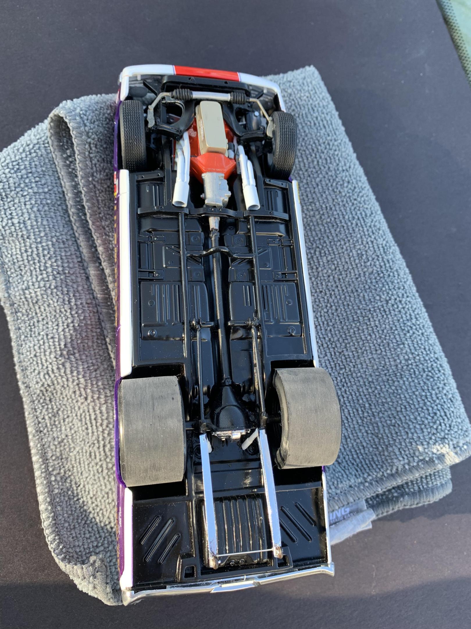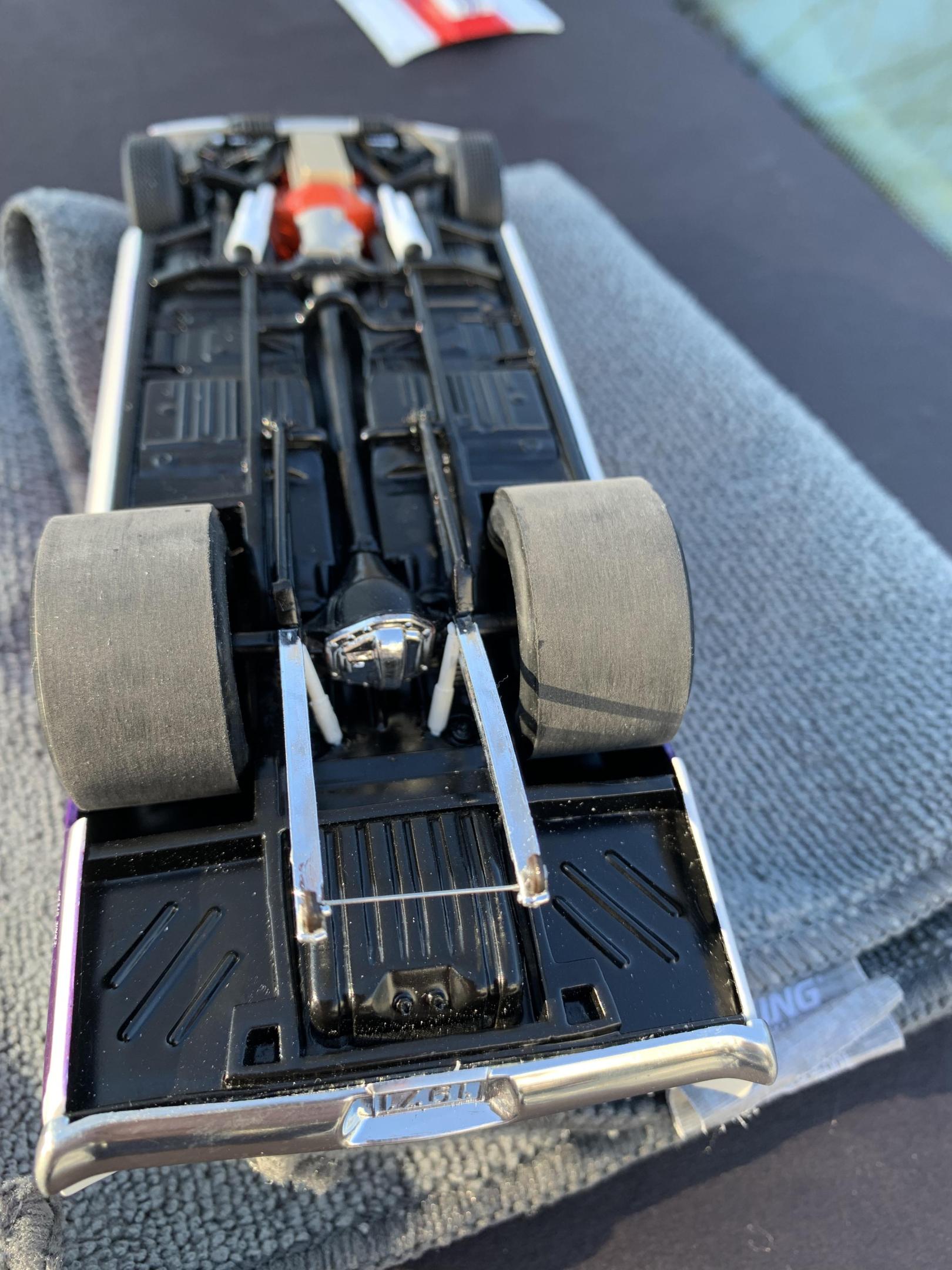 I know I already posted this but I couldn’t leave it as it was. After working on this for 11 months, and trying to rush to finish it for the ACME show, I was burnt out, and frustrated with this build and put it on the shelf. Ron Thorne commented on a couple items that were not completed or correct and that was what I needed to motivate me to make it right. So for the last three days snowed in, in Georgia, I tried to correct a few things. You may not remember but the rear wheels were resin and I almost destroyed them by stripping the Molotow Chrome off after it didn’t turn out. The 91% alcohol melted the resin, a first for me. So I replaced the rear wheels with modified parts box wheels. My first attempts at the drive shaft loops was a major fail, and I tried to make a crossmember/ drive shaft loop with no luck. This time the first attempt worked. Under the hood I’ve added the brake master cylinder with brake lines you can’t see, the inner fenders, the coil, and the dry sump oil lines. I also added the rear Shocks, the rack and pinion steering, and I added hood pins to the trunk and hood. Thanks Ron! I’m feeling much better with the results now!
