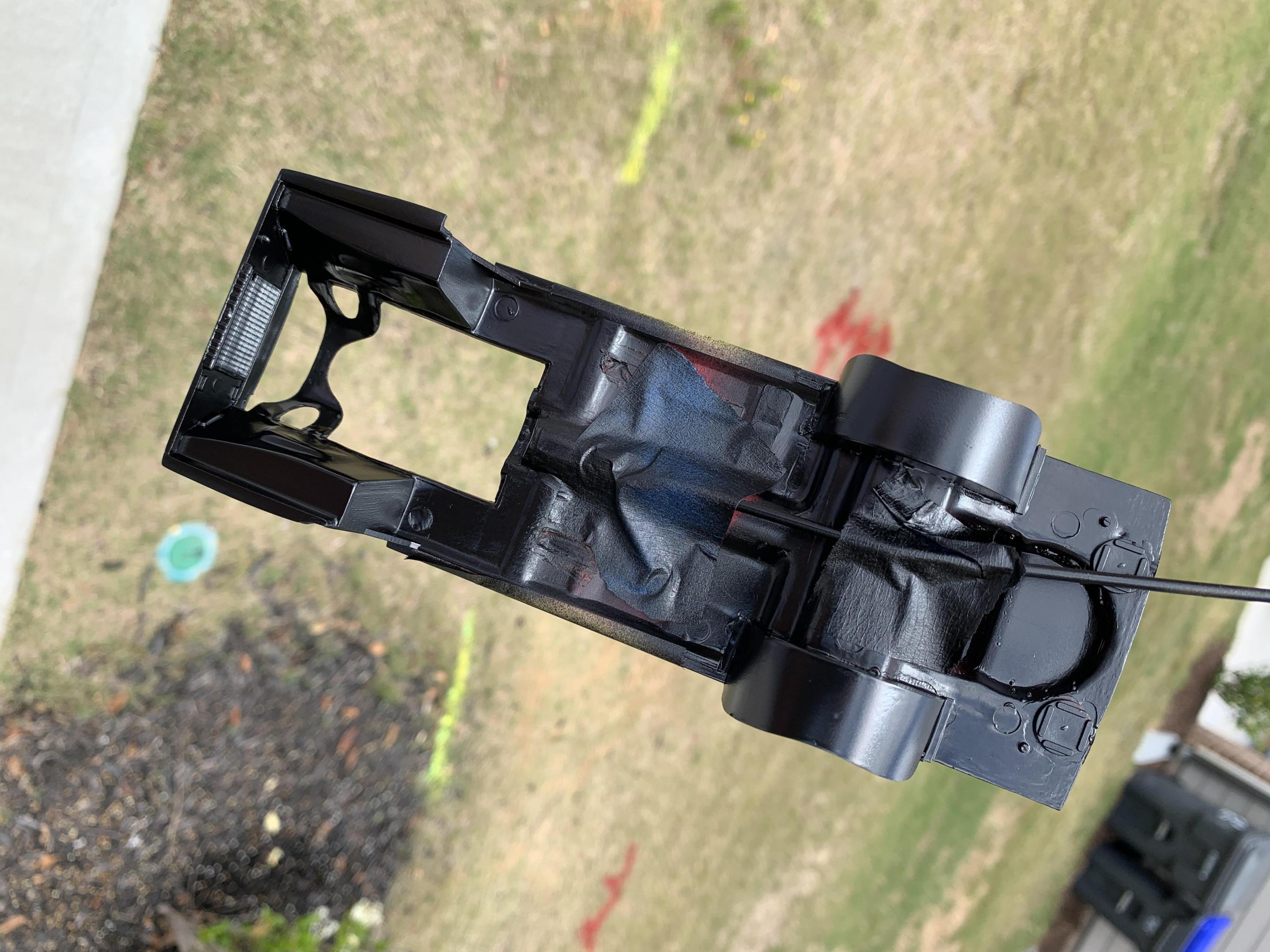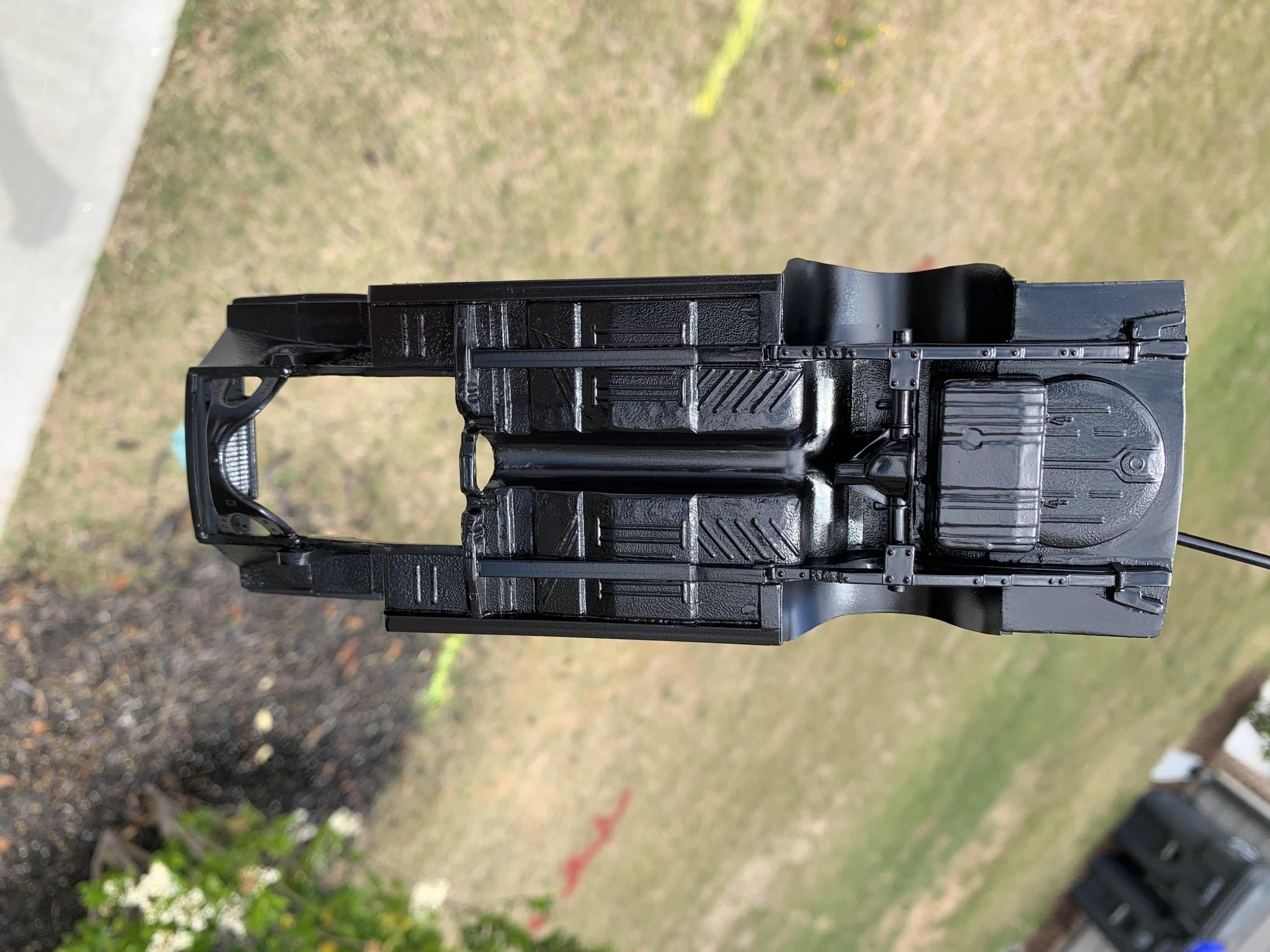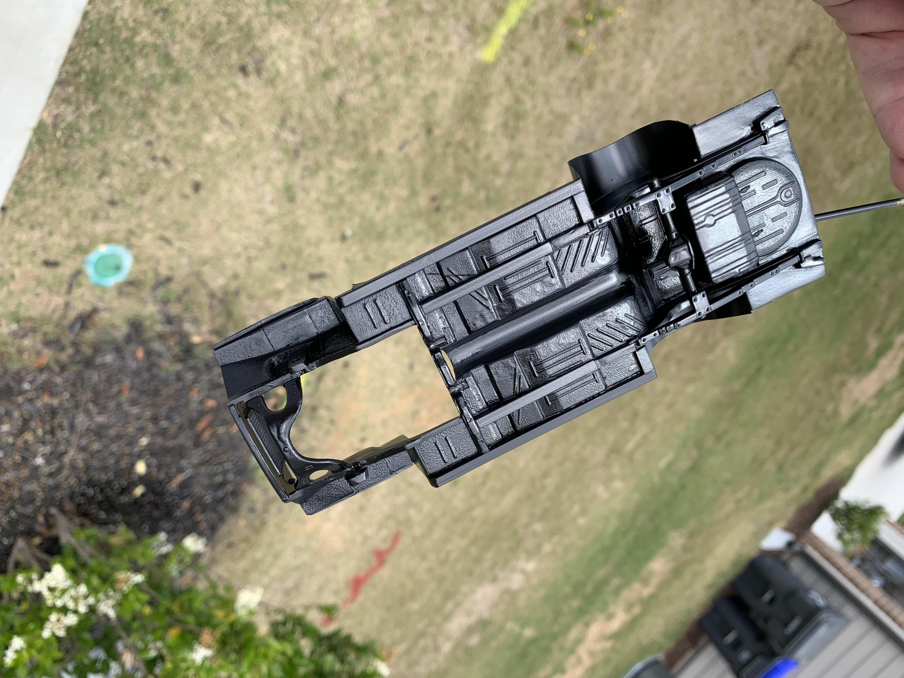 After installing the rear axle, I thought I was ready for paint and air brushed Model Master Semi Gloss Black, only to notice some sanding scratches, and will have to correct and repaint.