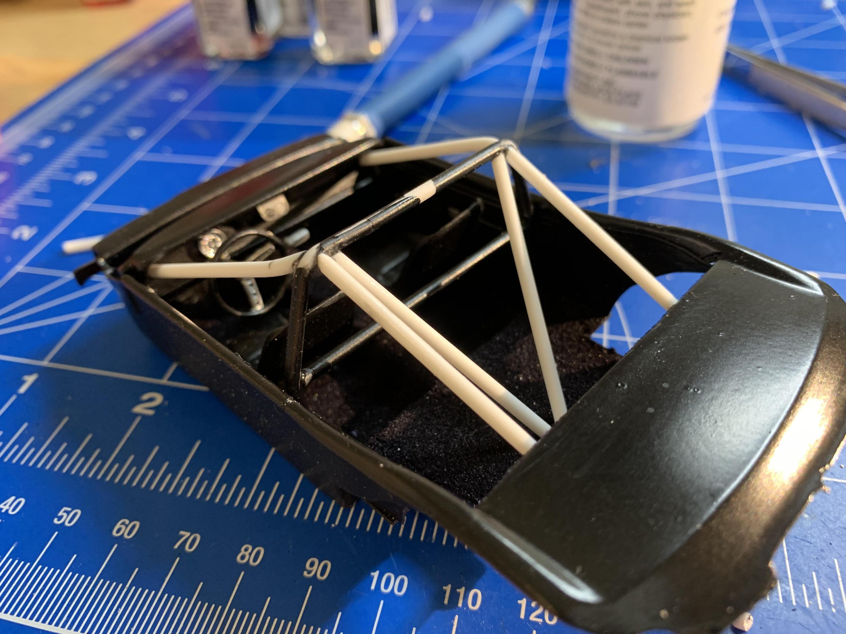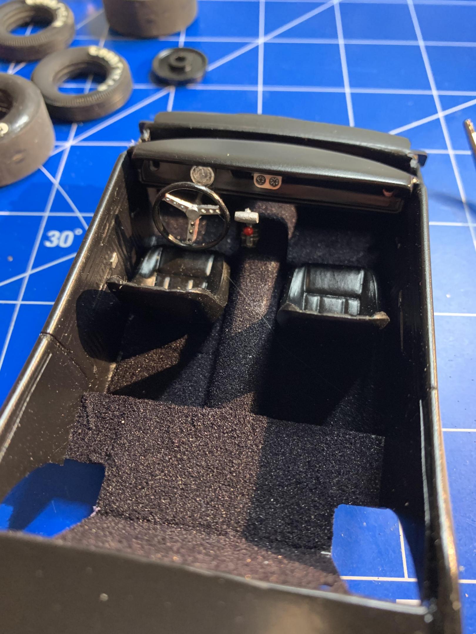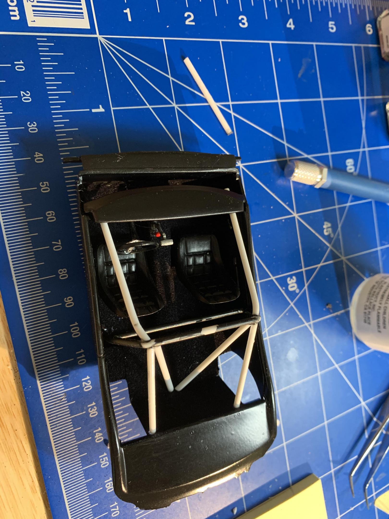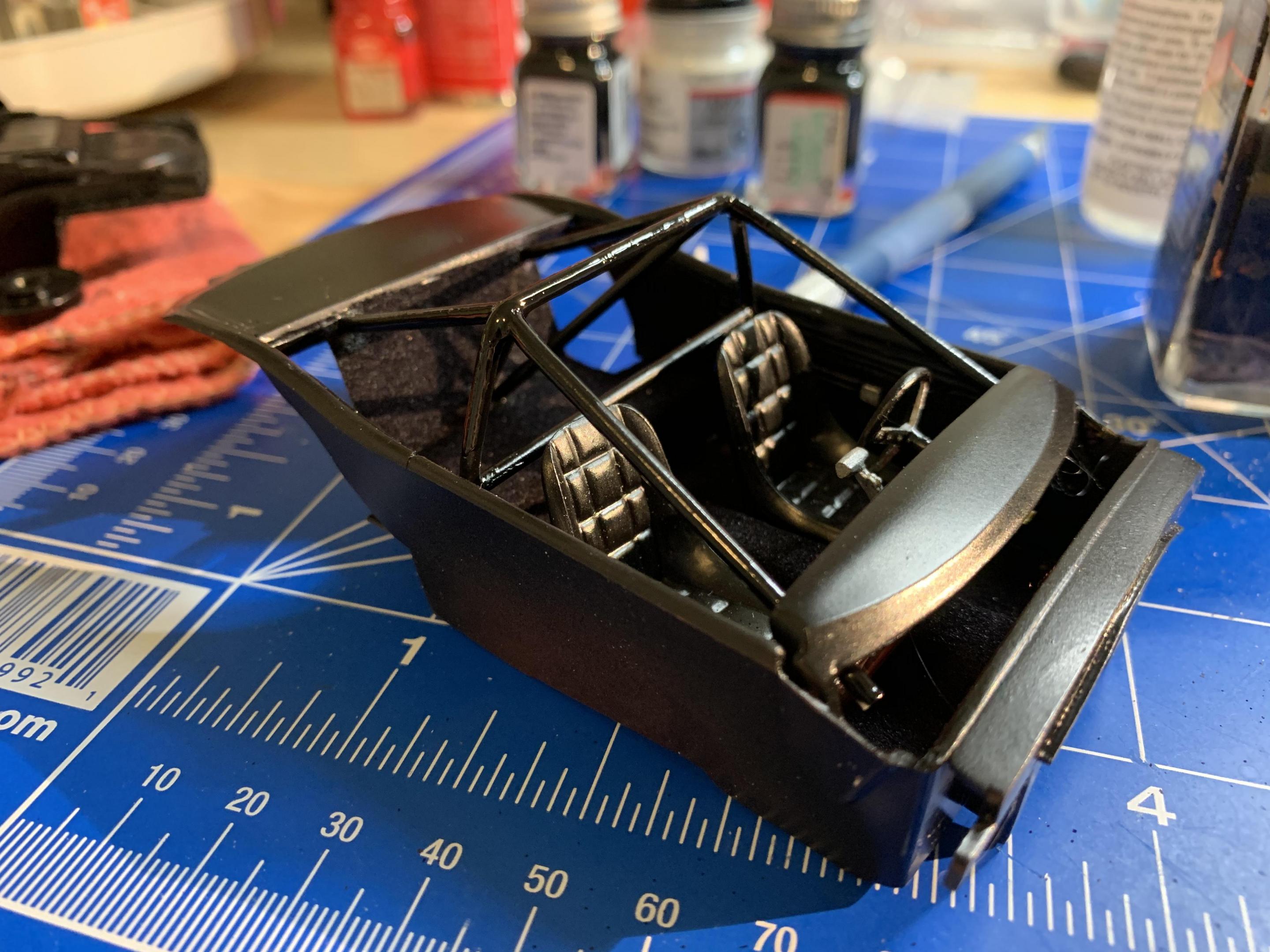 I then turned my attention to completing the interior. I had already flocked the floors. I detailed a parts box steering wheel that resembled the 1to1 car. A parts box shifter with T handle and reverse lock out is installed and the scratch built roll bar and braces. A parts box tachometer and photo etched gages. I still need seat belts and harness.