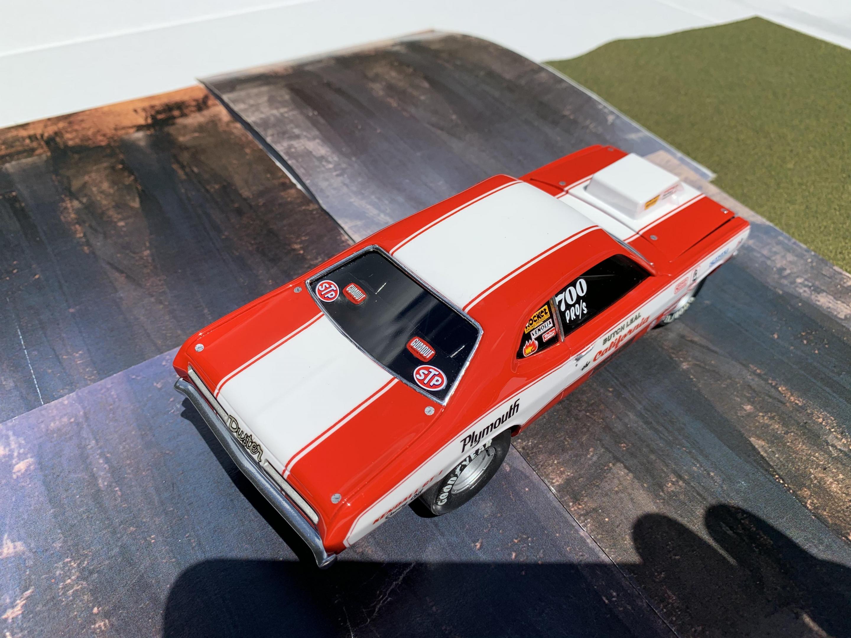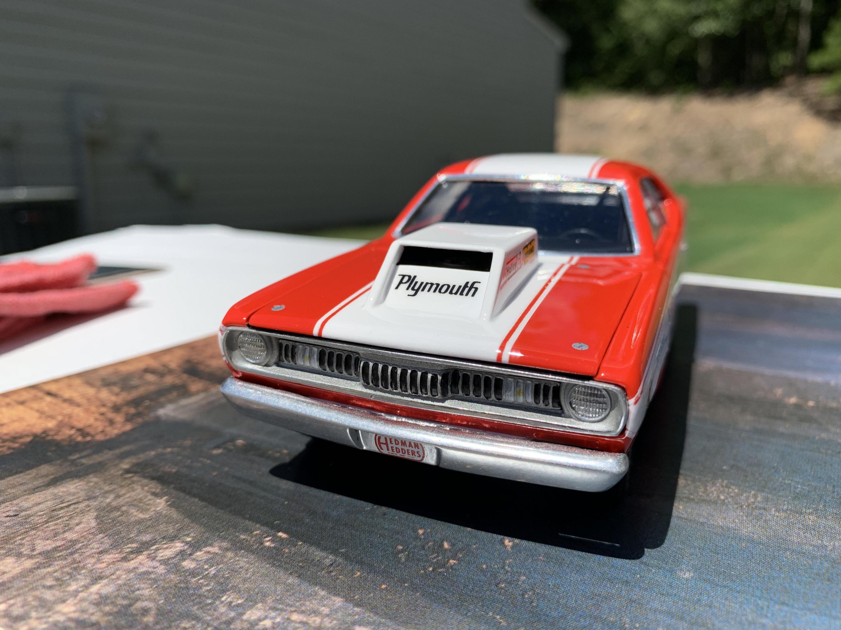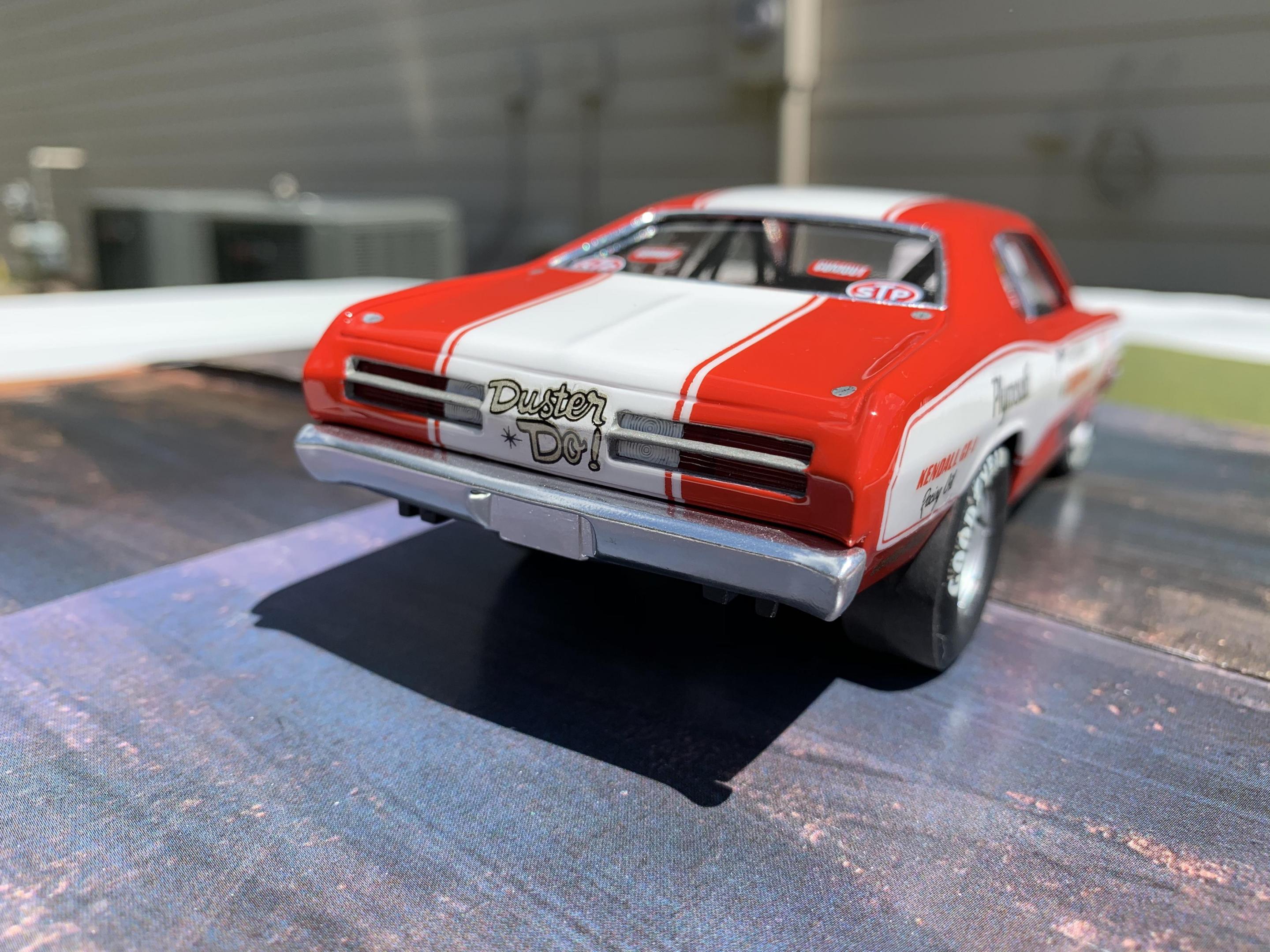 One of my Holy Grail builds here. I’m not even sure how I feel about the finished build. Usually by the time I’m close to being finished, I just want it over. I’ve been a couple months on the build and in all honesty it will be a few weeks before I will appreciate the time and work involved. Most of the research I found centered around the 71 Duster, and not the 72, so some liberties were taken in the completion of the build. The original MPC kit while so cool when it came out, left a lot to be desired. I wanted to keep the build as much as original to the kit, but I had to do major work on almost every part. If I had it to do over I would paint all the stripes, and use the Revell Hemi Dart kit for everything else. Questions, comments, and even criticism welcome.