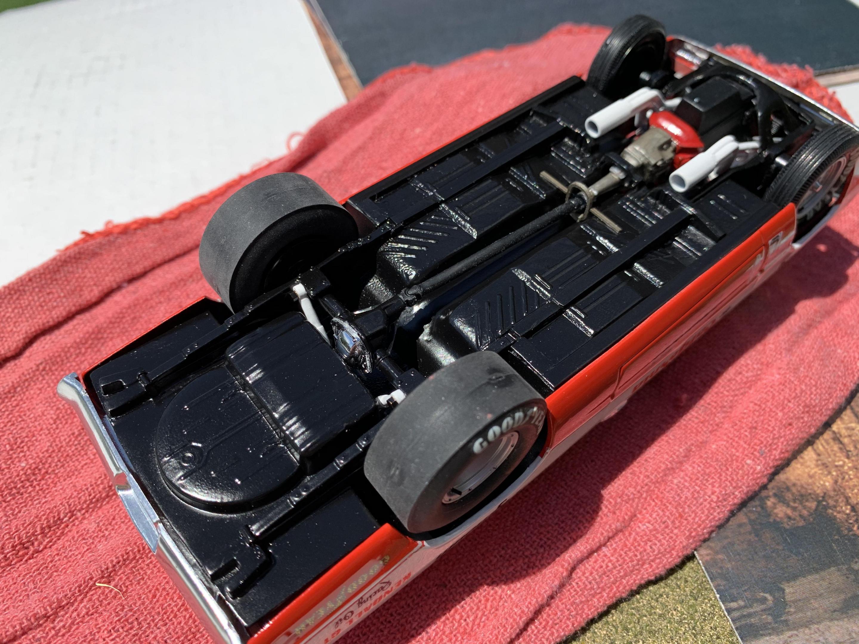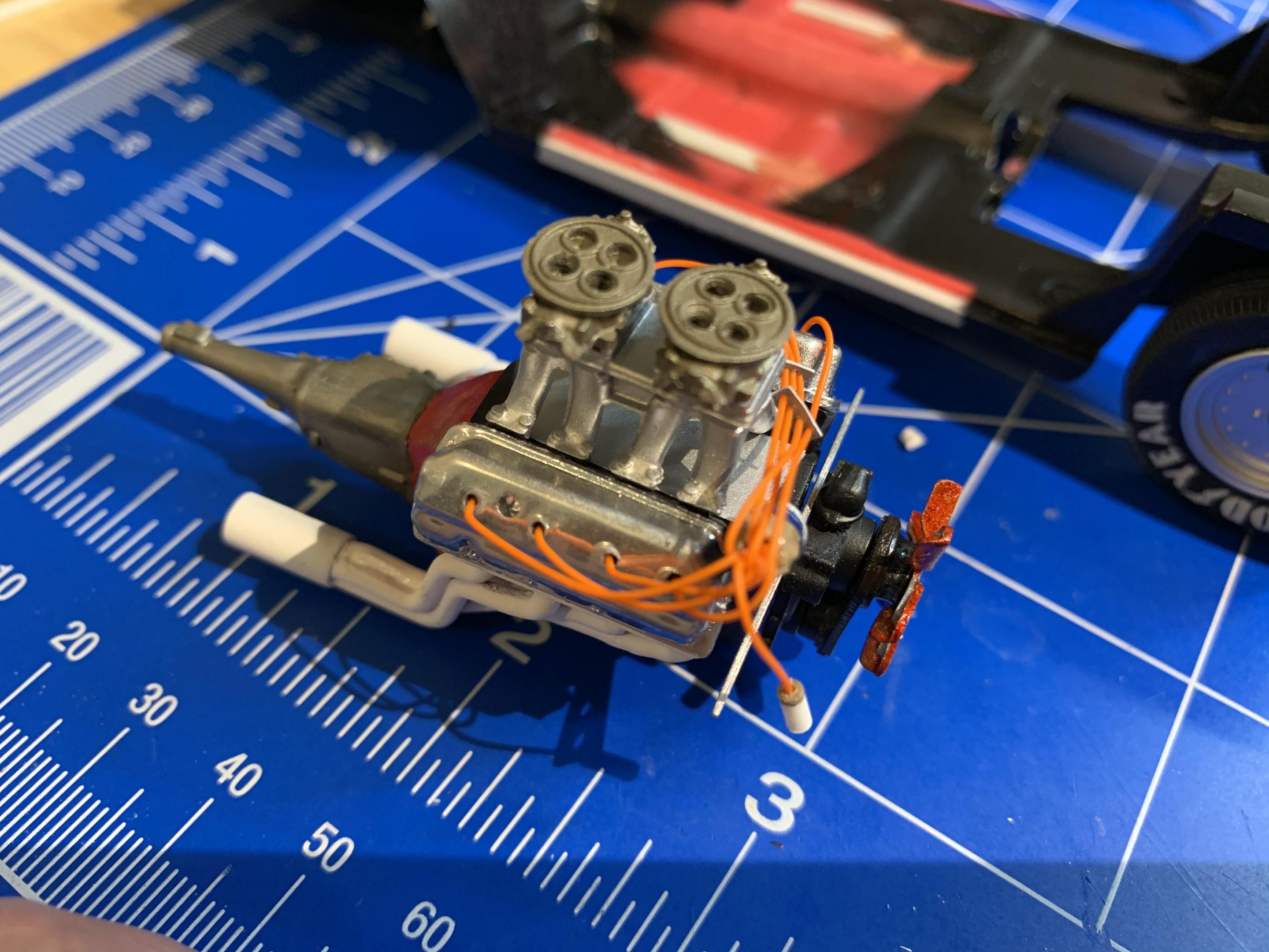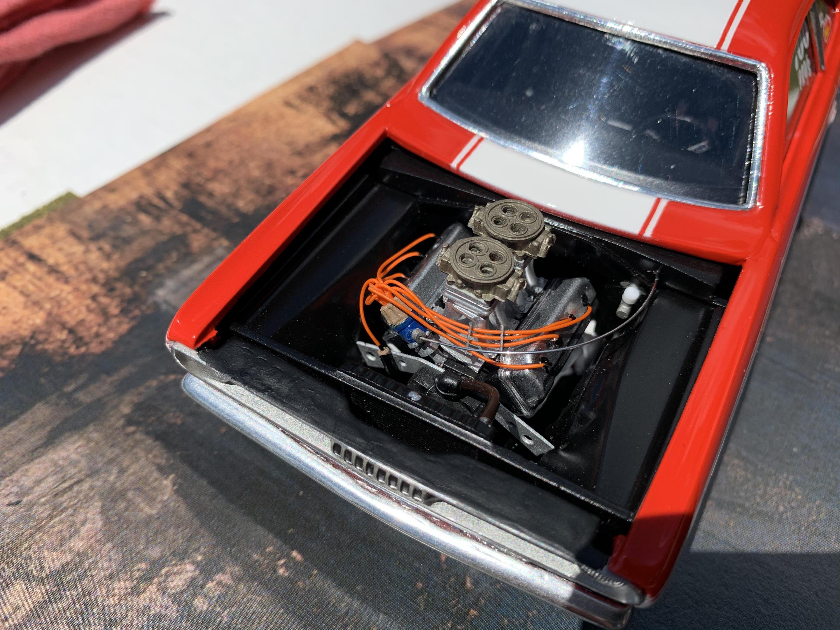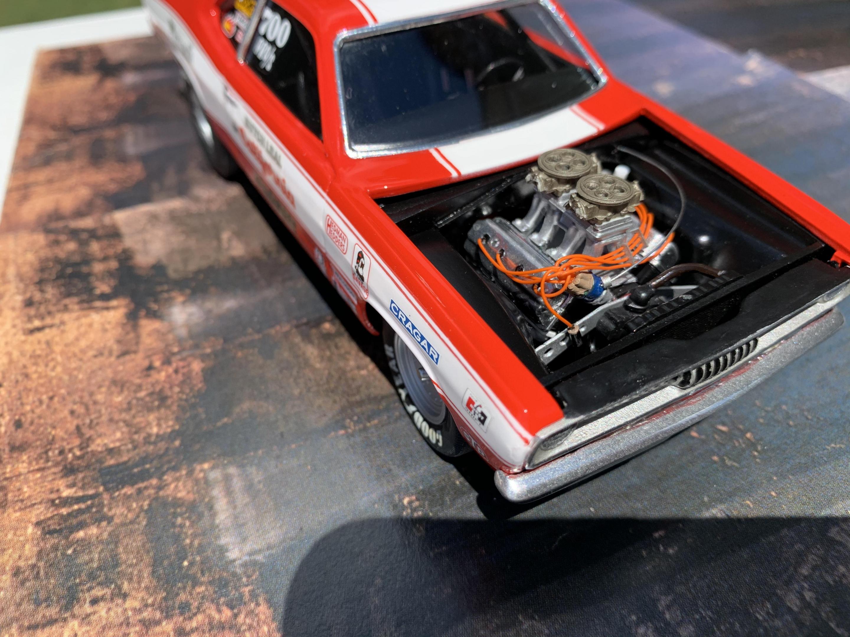 I had most all of the build complete before starting on the motor.Im still trying to use as many kit components as possible, so I cut the bell housing from the transmission, as the tail shaft was molded to the interior tunnel, and that was removed and I used the 4 speed trans from to AMT 70 Coronet kit. The kits tunnel ram was terrible so I used one from the Johan Sox & Martin Cuda kit and some parts box carburators. I did use the kits headers but added a flange to mount to the heads and K&S aluminum tubing for the collectors. I scratch built the starter, and modified the S&M distributor. I scratch built the front motor plate to resemble the real car. About all that’s left is the final assembly. I’ll post finished pics shortly.