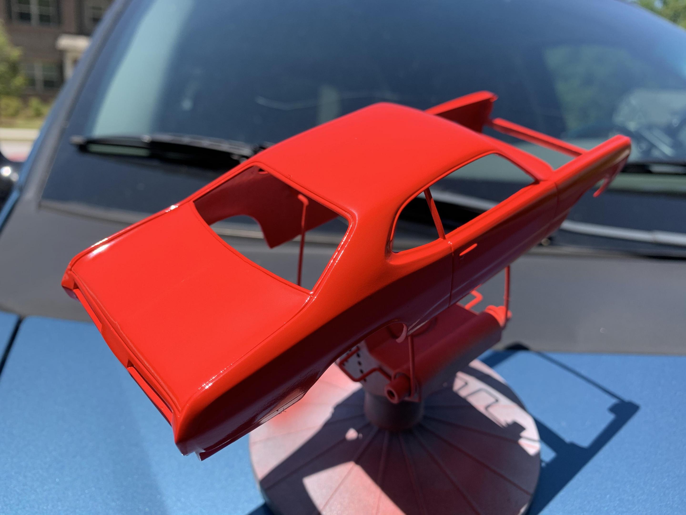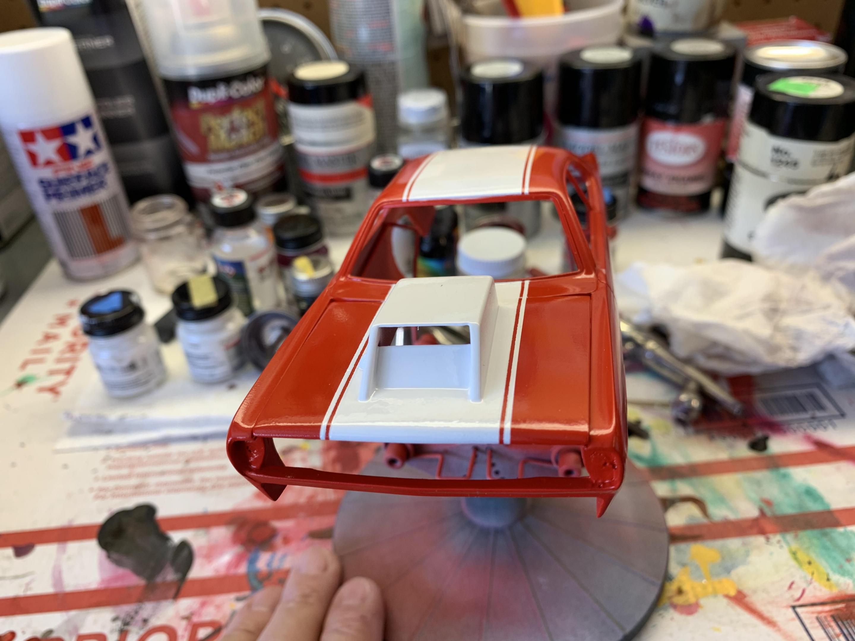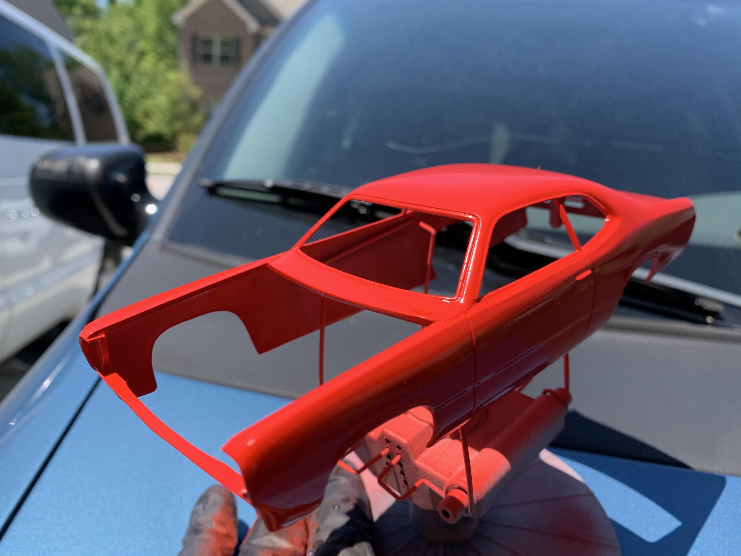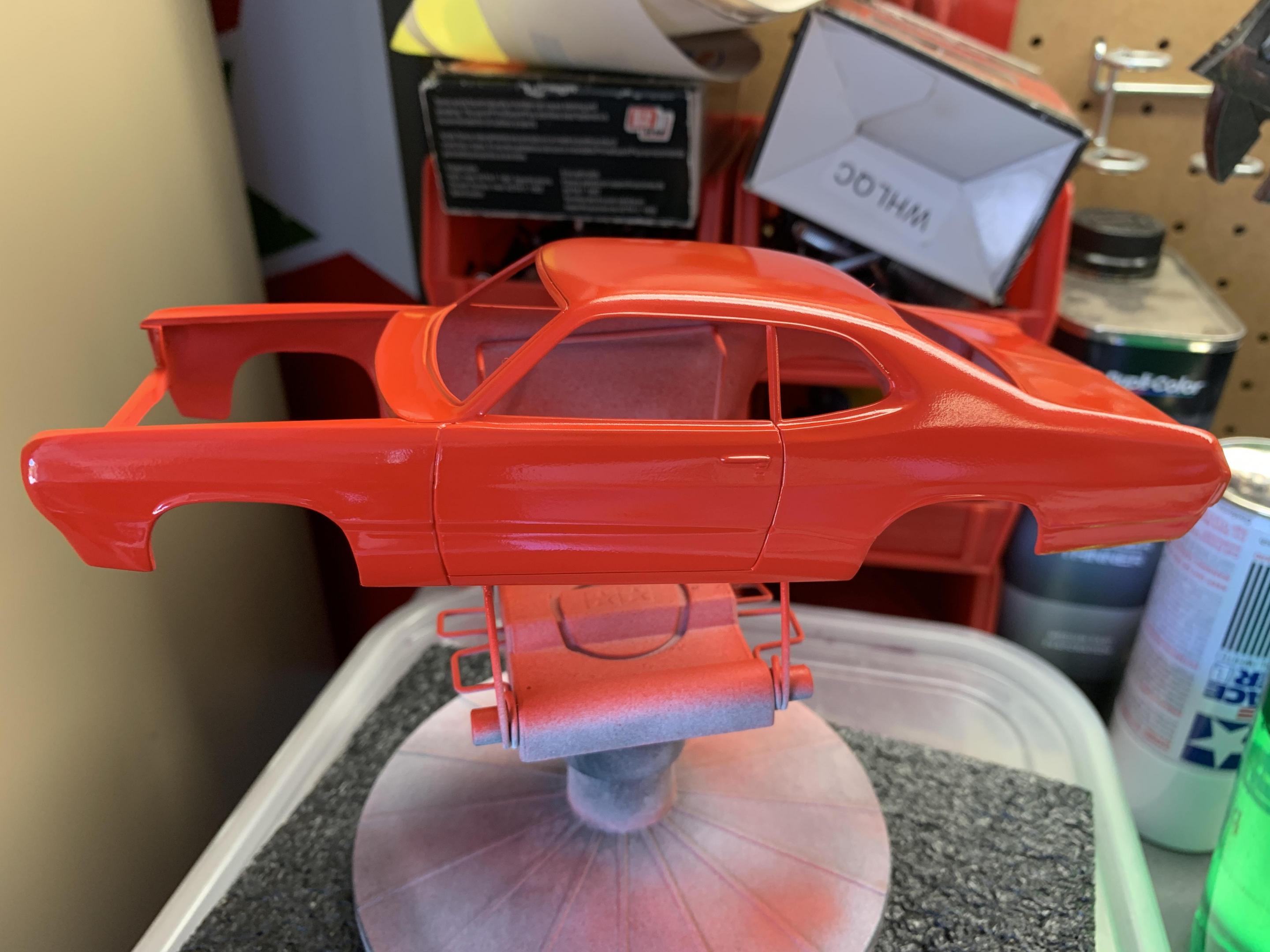 I finally got a warm day and decided to get some color on the body. Some time ago there was a post discussing the Color of the California Flash cars. I have an old Drag Racing Magazine that showed details of the 71 Butch Leal car, as at that time, this was a pretty trick car. It stated the car was painted orange. I went through my paints and decided that Model Master Chevrolet Engine Orange looked like a very good match. I will let it dry good and mask the stripes.