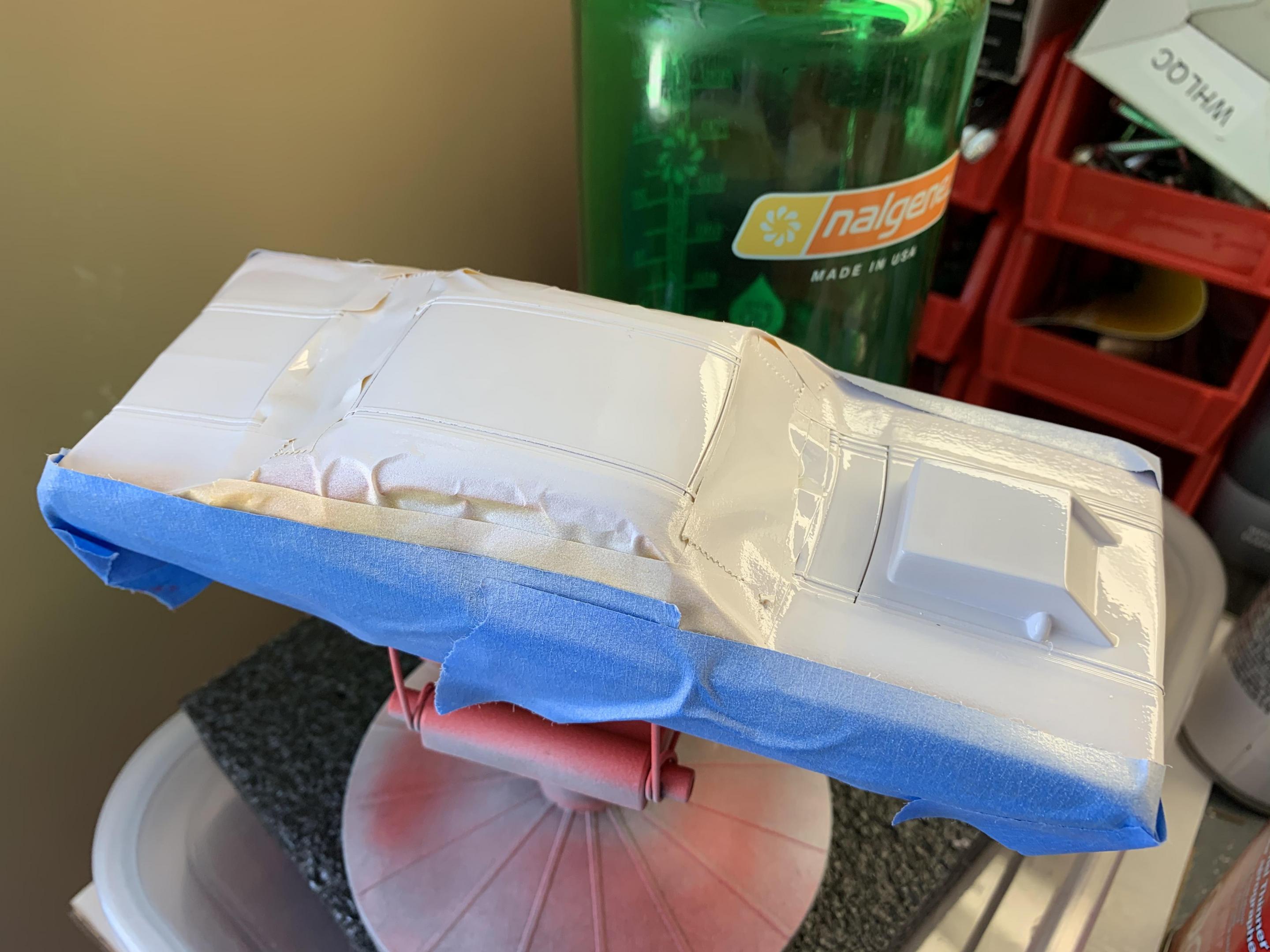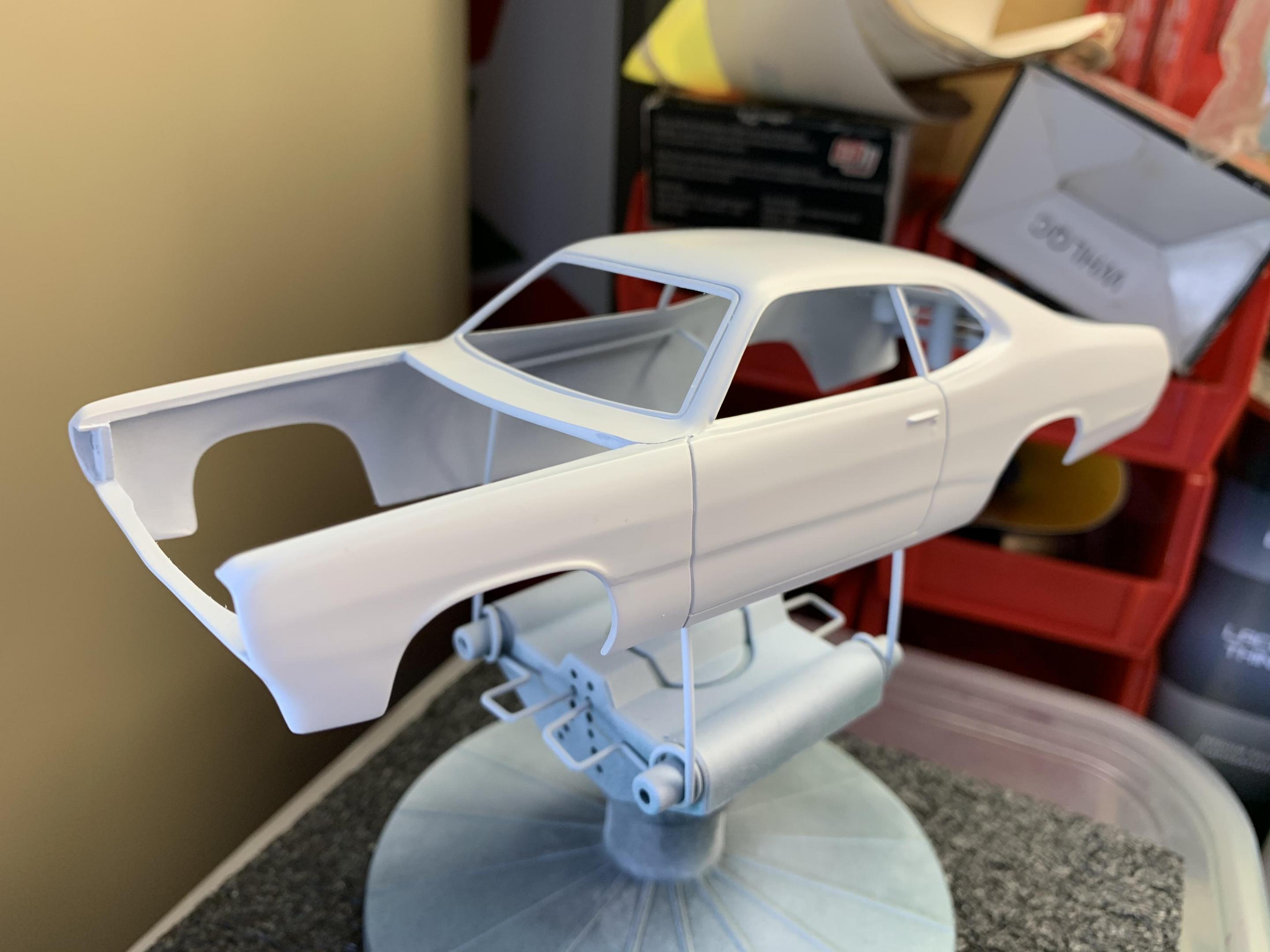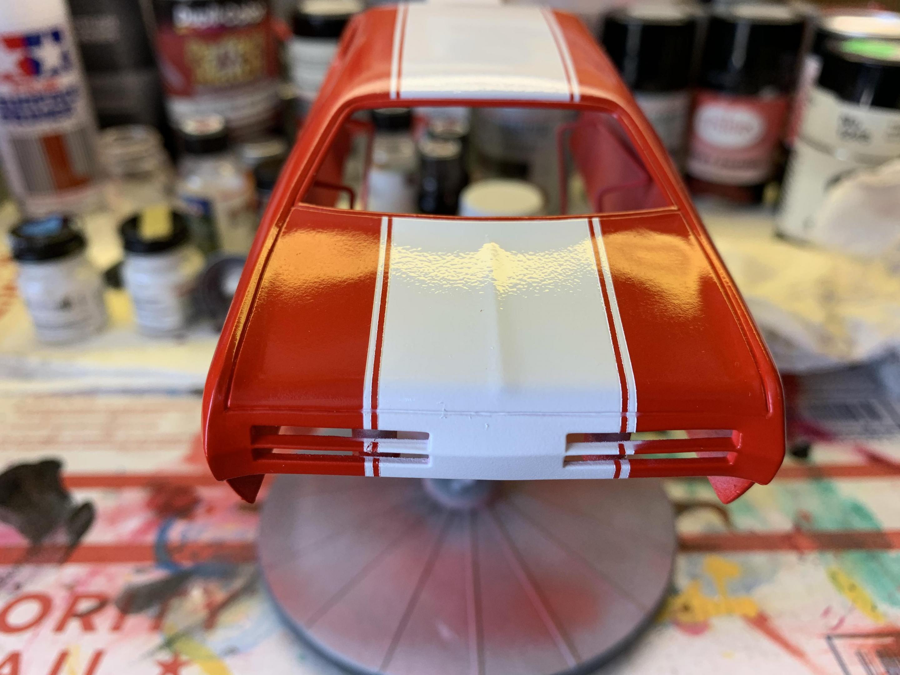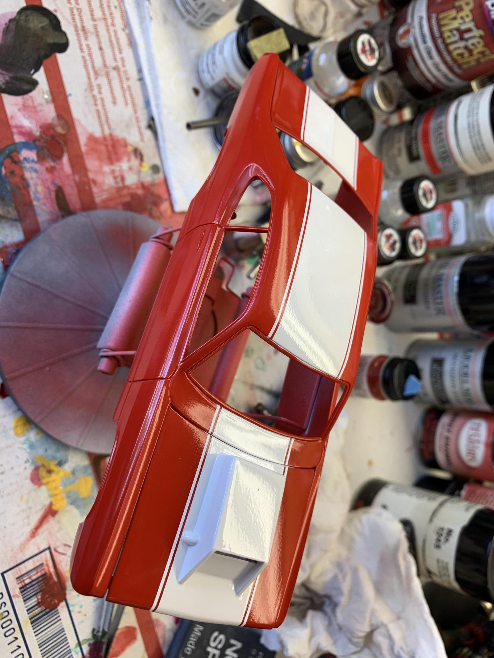 I finally got a warm day and decided to get some color on the body. Some time ago there was a post discussing the Color of the California Flash cars. I have an old Drag Racing Magazine that showed details of the 71 Butch Leal car, as at that time, this was a pretty trick car. It stated the car was painted orange. I went through my paints and decided that Model Master Chevrolet Engine Orange looked like a very good match. I will let it dry good and mask the stripes.